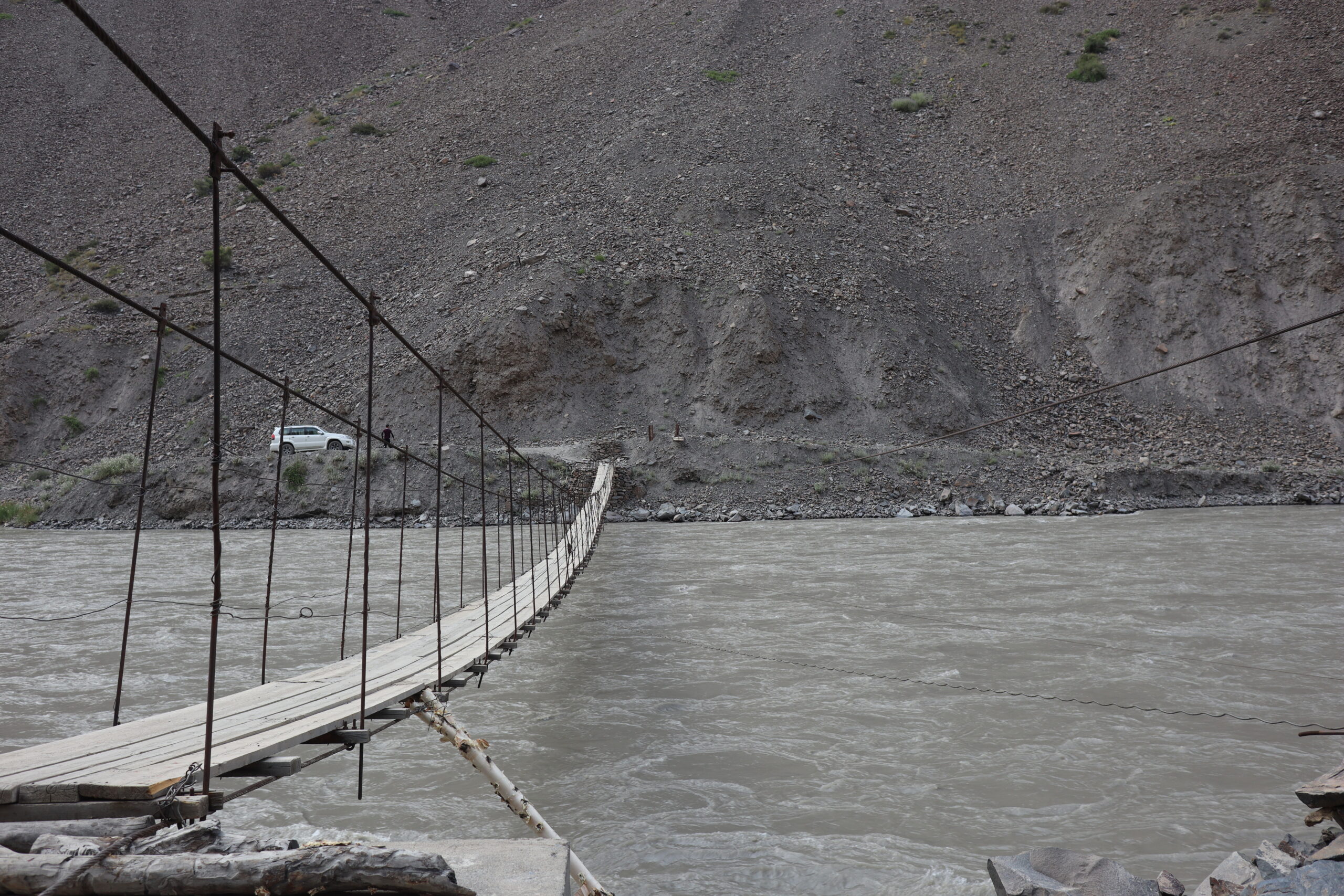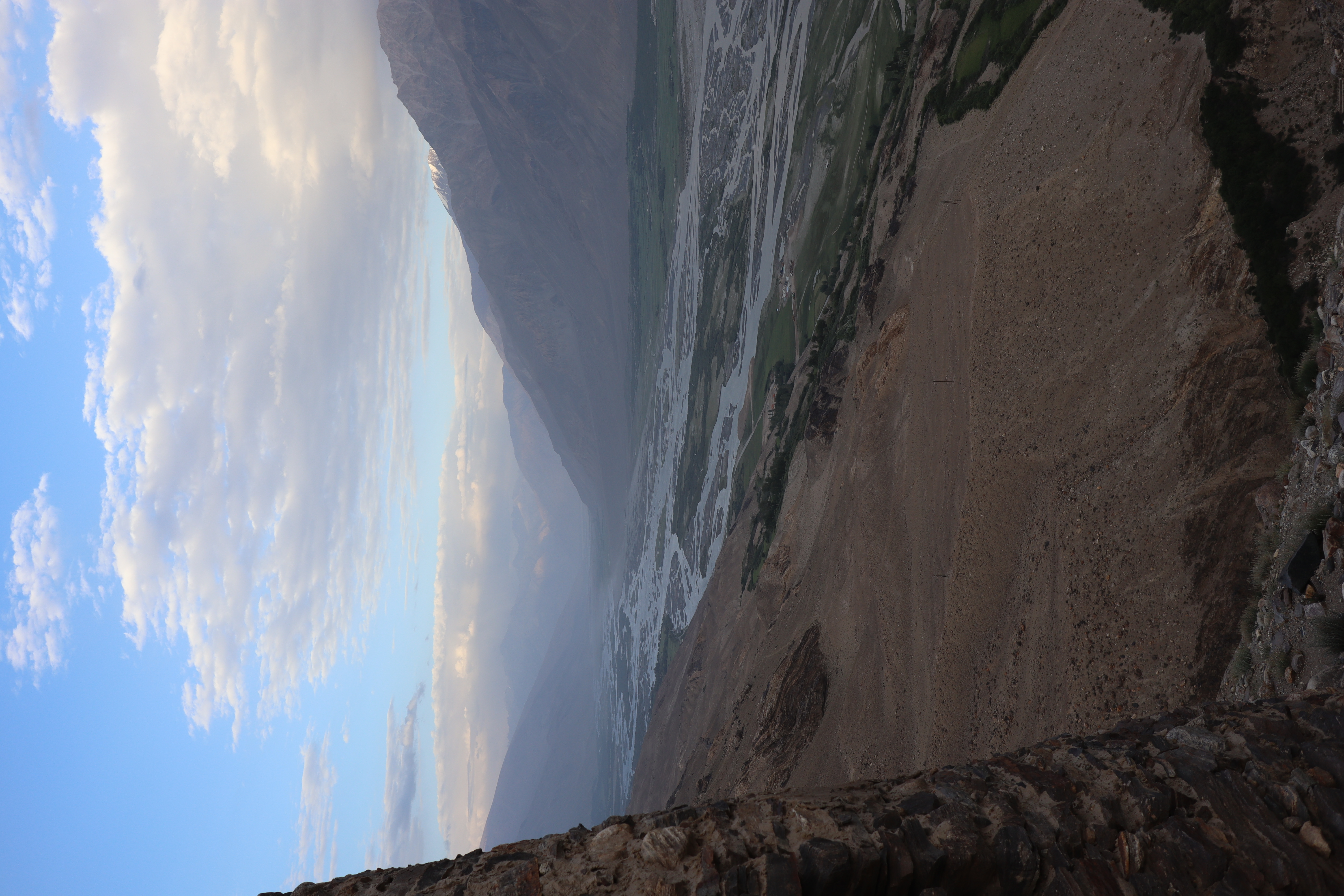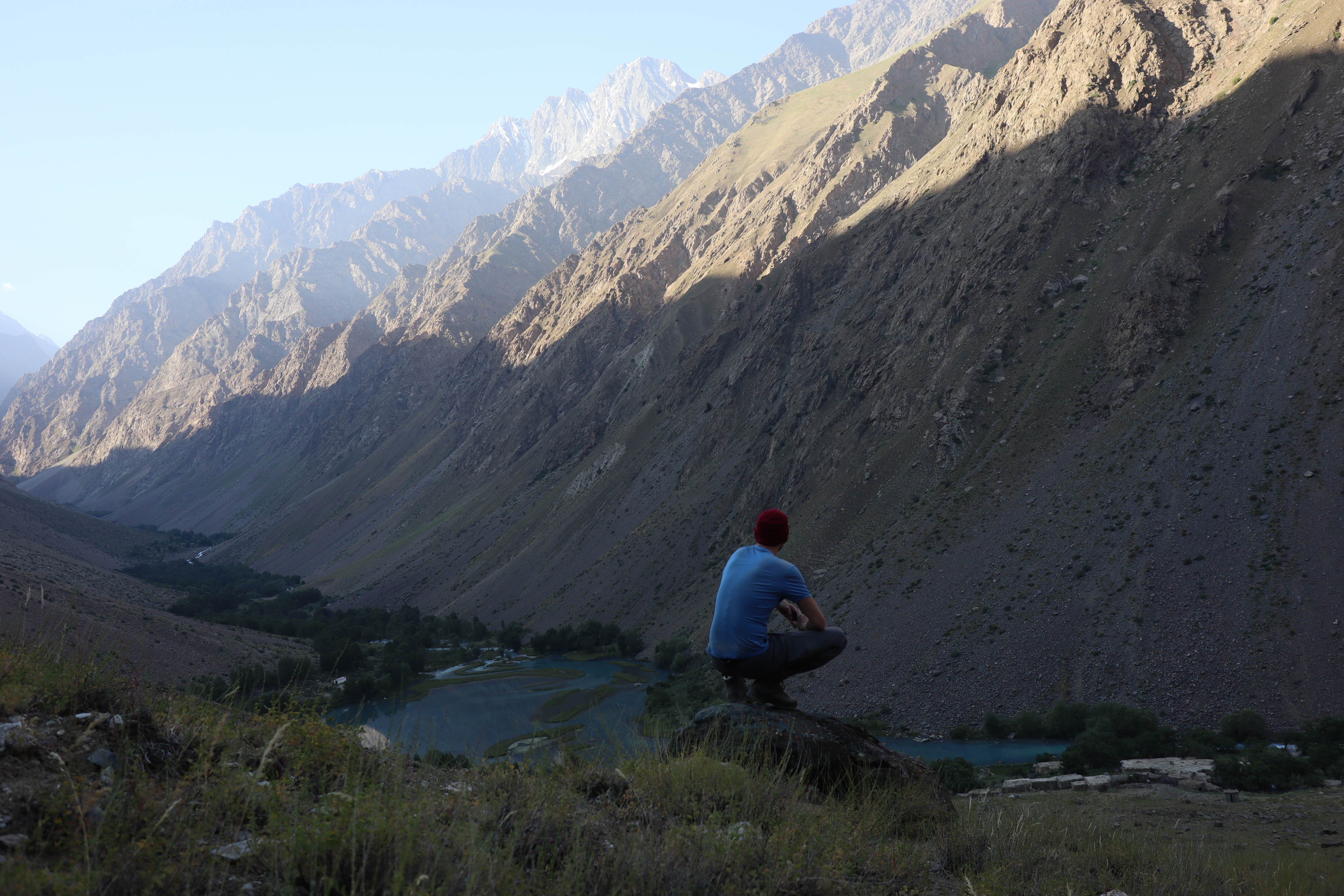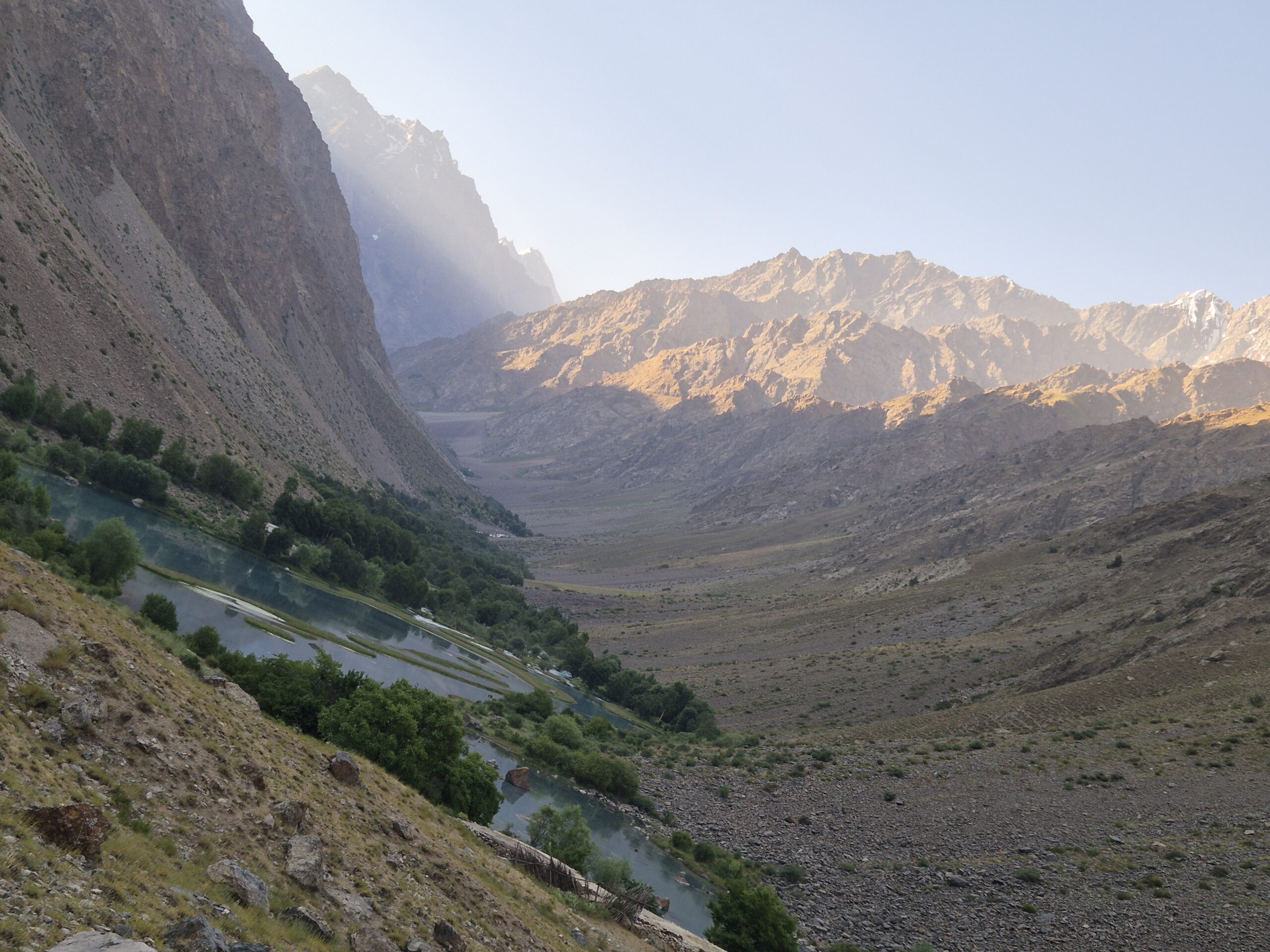 Von Kalaikhum brachen wir am Morgen des 16.07.2025 in Richtung Bartang Valley auf. Über die nächsten 200 Kilometer ging es immer weiter stetig bergauf, von 1200 auf grob 2400 Höhenmeter. Unser Ziel des zweiten Tages entlang des Pamir Highway war es, das abgelegene Dorf Jizeu zu erreichen. Die Stimmung im Auto war gut und auch unser Fahrer Nurik hatte seinen Spaß, als wir anfingen unsere Lieblingsmusik zu rotieren und die Straßen sich von Asphalt zu Schotter wandelten. Gegen Nachmittag erreichten wir eine aus Stahlseilen und Brettern gezimmerte Brücke. Dort hielt Nurik an. Nur die nötigsten Sachen wie Wasser, ein wenig zu Essen, eine Zahnbürste und die Kamera mitnehmend, machten wir uns zu viert über die wackelige Brücke und einem Flusslauf entlang, den schmalen Pfad den Talrücken hinauf, zum Dorf auf. Zwei Stunden sollte die kleine Wanderung dauern. Wir brauchten etwas länger, da Sissi an einer Lebensmittelvergiftung litt und wir einige Stopps einlegen mussten, damit sie sich regenerieren konnte. Trotz der Stopps, brach Sissi für sich das Abendteuer nach knapp einer Stunde ab und kehrte zurück zu Nurik, der nicht unweit der Brücke mit dem Auto zurückgeblieben war. Dem steinigen Pfad gen Süd-Osten in die Berge folgend, ging es nun etwas zügiger zu Dritt weiter. Den sprudelnden und reißenden Gebirgsfluss zu unserer Linken. Von allen Seiten waren wir von Steinen und Geröll umgeben, nur entlang des Flusses hatten sich Bäume und Gräser ansiedeln können. Immer weiter das Tal hinauf und schließlich dann doch durch grünere Vegetation, fürte uns der Pfad. Es dämmerte bereits, als wir Jizeu Village erreichten und herausfanden, warum es hier grüner war. Das kleine Dorf lag in der Mitte des Tals, am Rande eines klaren Sees, der türkis-blau schimmerte. Nach ein wenig Suchen fanden wir die für uns vorgesehene Unterkunft in einem aus Steinplatten gezimmerten Haus mit Flachdach. Während wir aufgefordert wurden uns auszuruhen und auf das Abendbrot zu warten, schnappte ich mir meine Kamera und erkundete das kleine tadschikische Bergdorf. Verfolgt von neugierigen Kinderblicken wurde mir plötzlich ein Volleyball zugeworfen, sodass ich die Zeit bis zur Fertigstellung des Essens damit verbrachte, den Ball den Kindern zuzuspielen. Wir hatten einen Heidenspaß und das Gelächter und Gekreische der Kinder hallte durch das Dorf. Erst als ein Erwachsener des Dorfes auftauchte und erklärte, dass das Abendbrot bereit stünde, konnte ich mich von der grinsenden und lachenden Meute loseisen. Das Essen war nichts außergewöhnliches, dennoch war ich überrascht, welche Essensvielfalt in einem so abgelegen Teil der Erde geboten wurde. Nüsse, Rosinen, Brot und eine derbe Suppe standen bereit. Trotz meiner aus Samarkand noch anhaltenden Lebensmitzelvergiftung verschlang ich alles, was ich als schmackhaft erachtete.