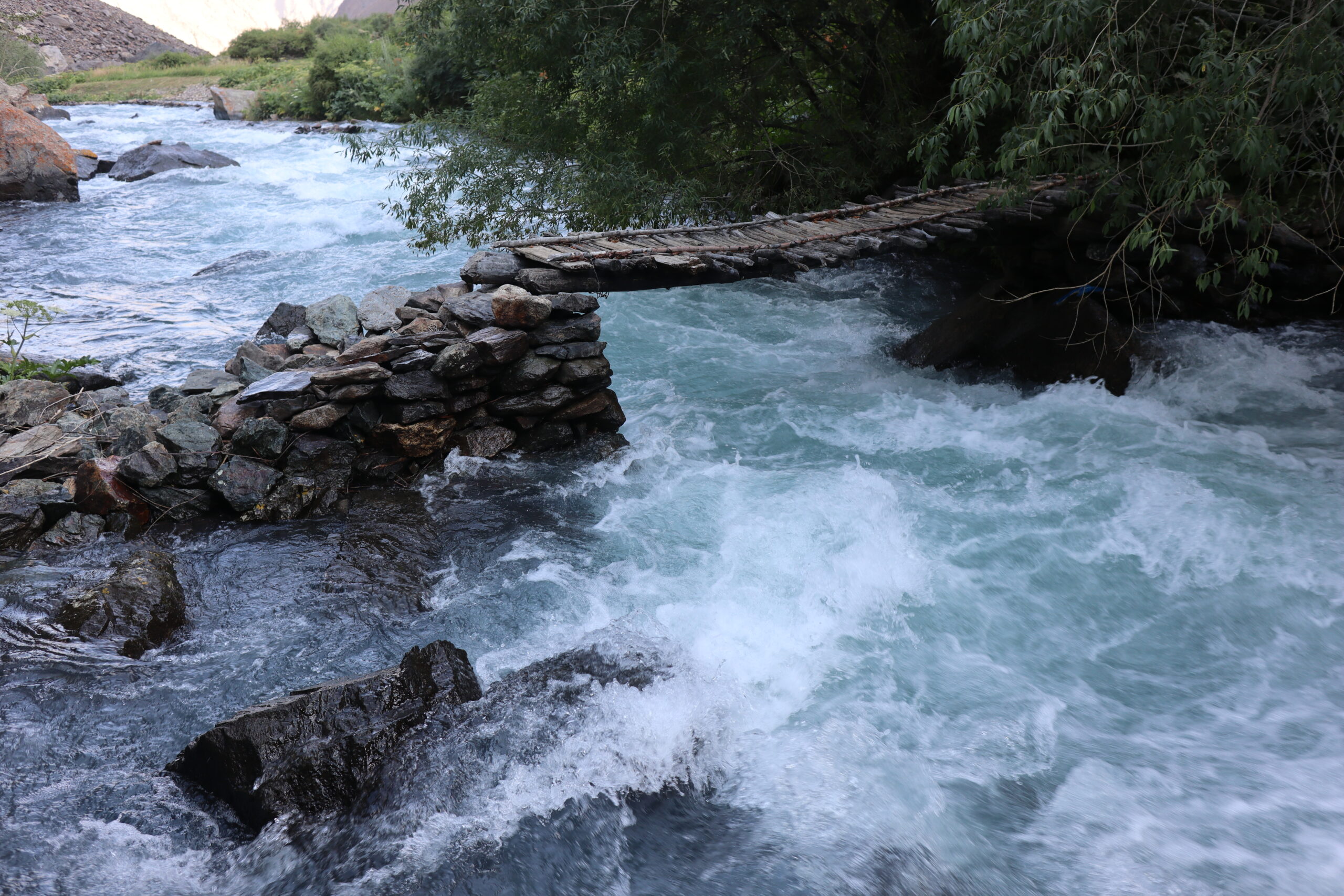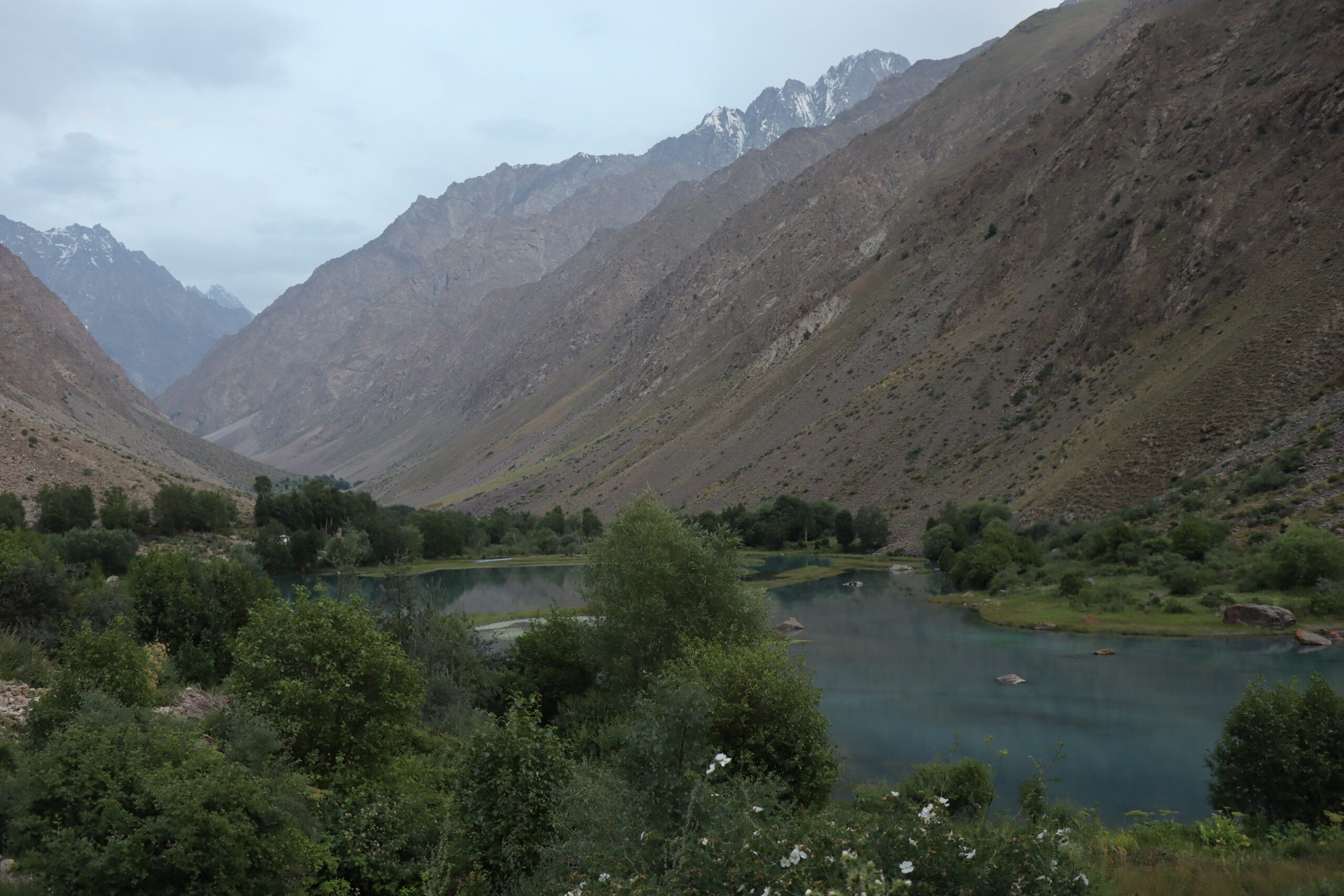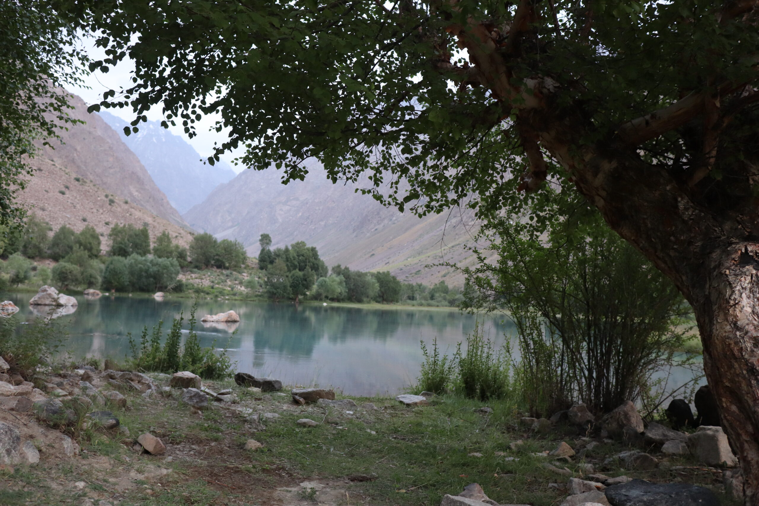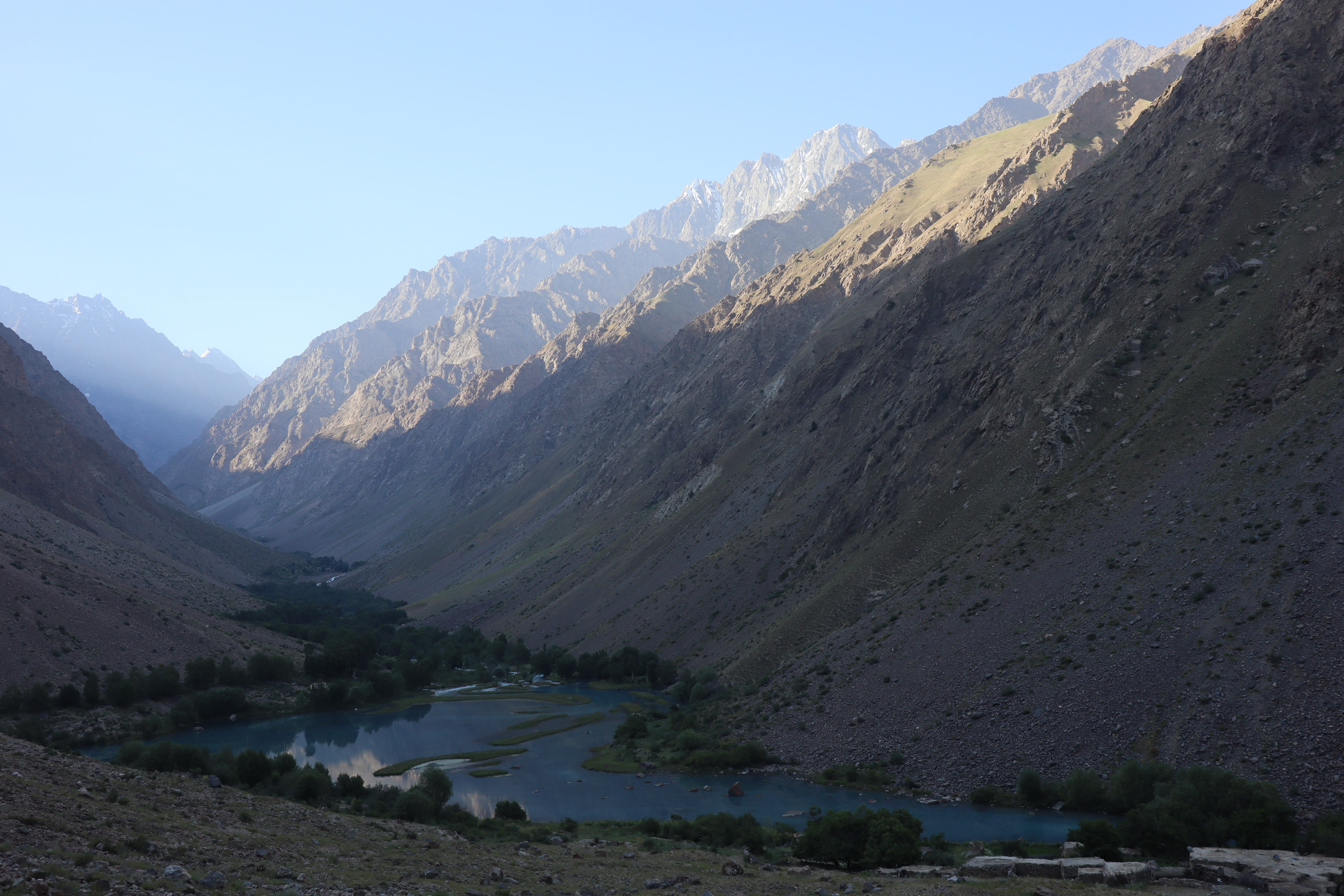 Von Kalaikhum brachen wir am Morgen des 16.07.2025 in Richtung Bartang Valley auf. Über die nächsten 200 Kilometer ging es immer weiter stetig bergauf, von 1200 auf grob 2400 Höhenmeter. Unser Ziel des zweiten Tages entlang des Pamir Highway war es, das abgelegene Dorf Jizeu zu erreichen. Die Stimmung im Auto war gut und auch unser Fahrer Nurik hatte seinen Spaß, als wir anfingen unsere Lieblingsmusik zu rotieren und die Straßen sich von Asphalt zu Schotter wandelten. Gegen Nachmittag erreichten wir eine aus Stahlseilen und Brettern gezimmerte Brücke. Dort hielt Nurik an. Nur die nötigsten Sachen wie Wasser, ein wenig zu Essen, eine Zahnbürste und die Kamera mitnehmend, machten wir uns zu viert über die wackelige Brücke und einem Flusslauf entlang, den schmalen Pfad den Talrücken hinauf, zum Dorf auf. Zwei Stunden sollte die kleine Wanderung dauern. Wir brauchten etwas länger, da Sissi an einer Lebensmittelvergiftung litt und wir einige Stopps einlegen mussten, damit sie sich regenerieren konnte. Trotz der Stopps, brach Sissi für sich das Abendteuer nach knapp einer Stunde ab und kehrte zurück zu Nurik, der nicht unweit der Brücke mit dem Auto zurückgeblieben war. Dem steinigen Pfad gen Süd-Osten in die Berge folgend, ging es nun etwas zügiger zu Dritt weiter. Den sprudelnden und reißenden Gebirgsfluss zu unserer Linken. Von allen Seiten waren wir von Steinen und Geröll umgeben, nur entlang des Flusses hatten sich Bäume und Gräser ansiedeln können. Immer weiter das Tal hinauf und schließlich dann doch durch grünere Vegetation, fürte uns der Pfad. Es dämmerte bereits, als wir Jizeu Village erreichten und herausfanden, warum es hier grüner war. Das kleine Dorf lag in der Mitte des Tals, am Rande eines klaren Sees, der türkis-blau schimmerte. Nach ein wenig Suchen fanden wir die für uns vorgesehene Unterkunft in einem aus Steinplatten gezimmerten Haus mit Flachdach. Während wir aufgefordert wurden uns auszuruhen und auf das Abendbrot zu warten, schnappte ich mir meine Kamera und erkundete das kleine tadschikische Bergdorf. Verfolgt von neugierigen Kinderblicken wurde mir plötzlich ein Volleyball zugeworfen, sodass ich die Zeit bis zur Fertigstellung des Essens damit verbrachte, den Ball den Kindern zuzuspielen. Wir hatten einen Heidenspaß und das Gelächter und Gekreische der Kinder hallte durch das Dorf. Erst als ein Erwachsener des Dorfes auftauchte und erklärte, dass das Abendbrot bereit stünde, konnte ich mich von der grinsenden und lachenden Meute loseisen. Das Essen war nichts außergewöhnliches, dennoch war ich überrascht, welche Essensvielfalt in einem so abgelegen Teil der Erde geboten wurde. Nüsse, Rosinen, Brot und eine derbe Suppe standen bereit. Trotz meiner aus Samarkand noch anhaltenden Lebensmitzelvergiftung verschlang ich alles, was ich als schmackhaft erachtete.