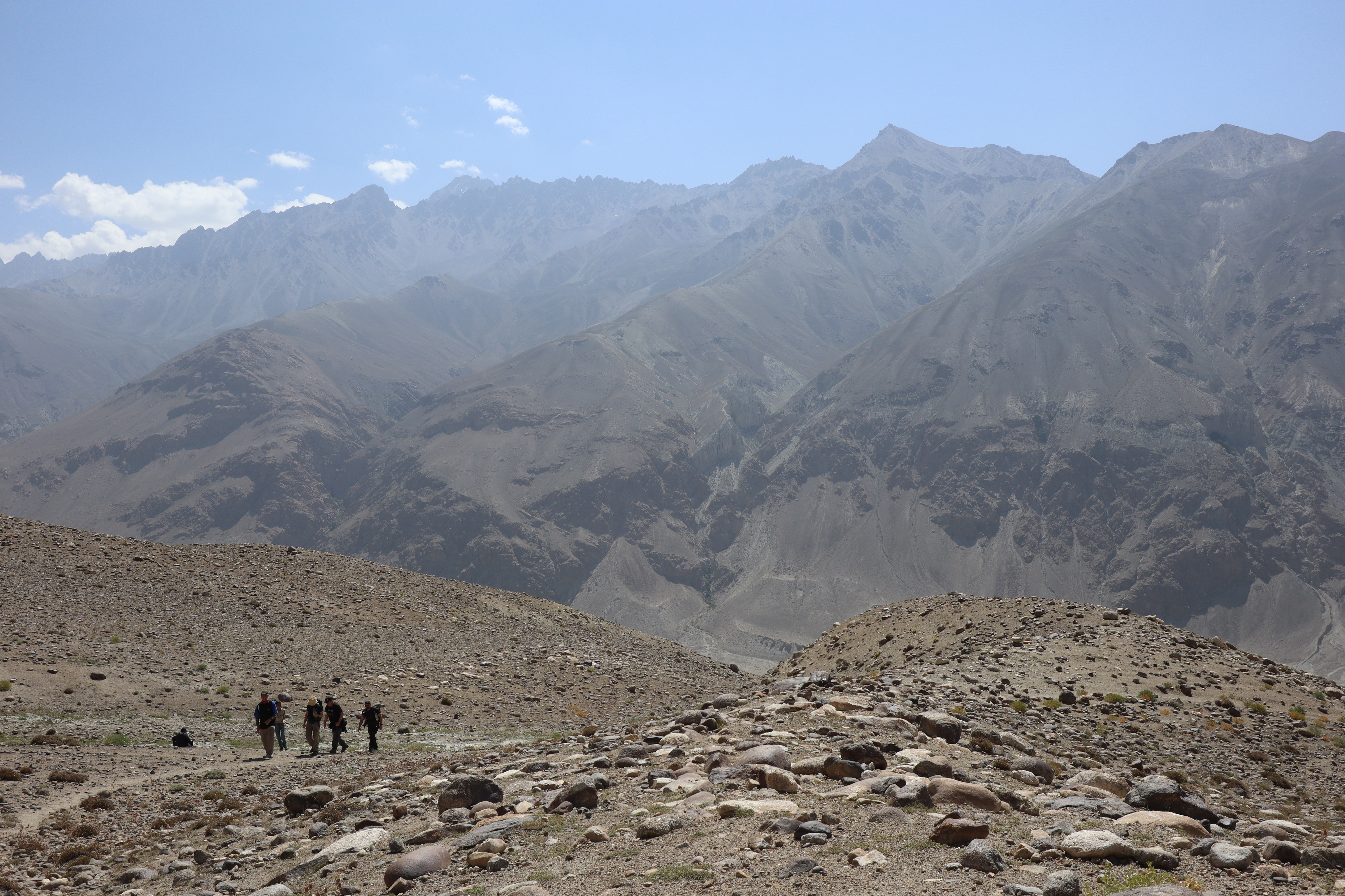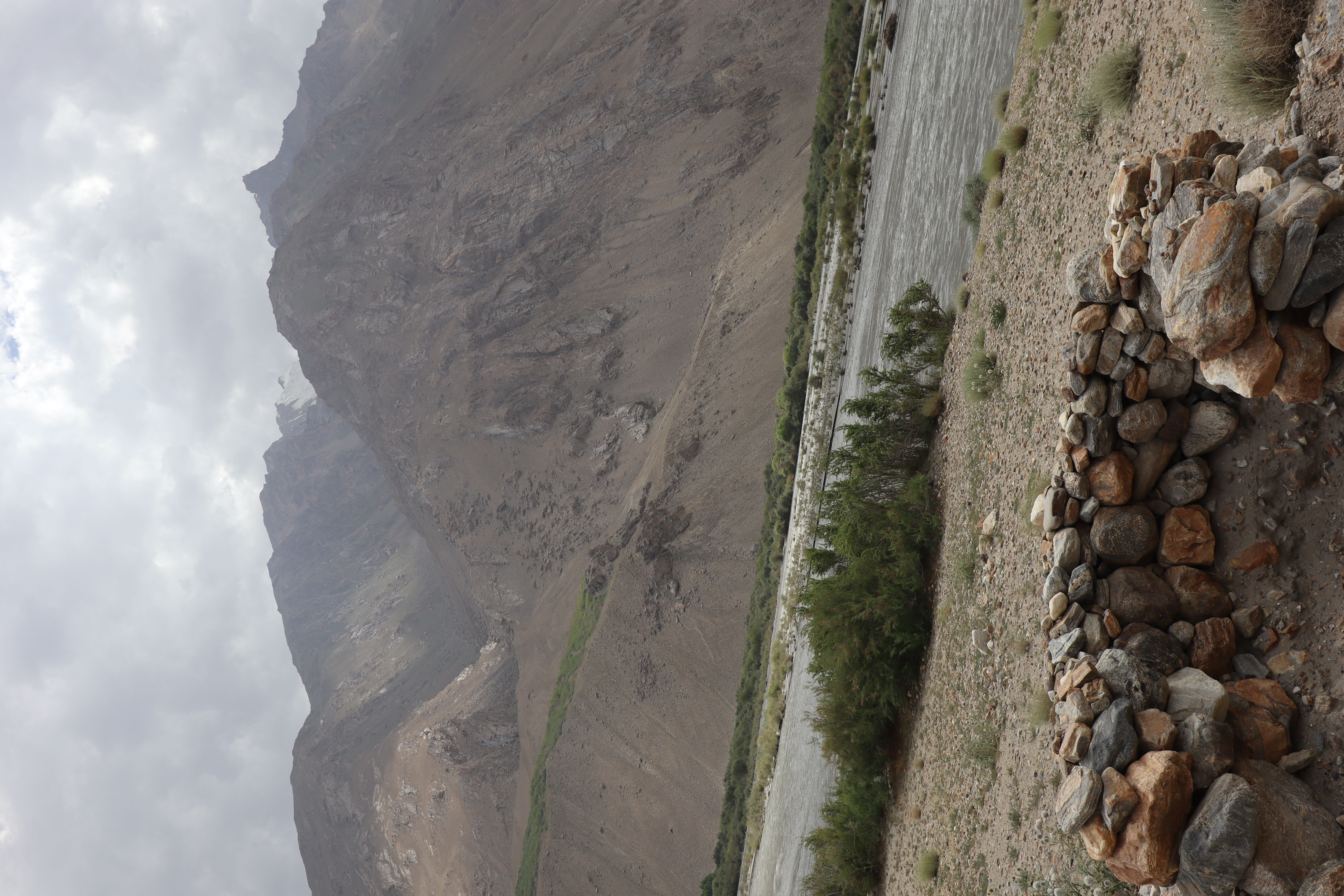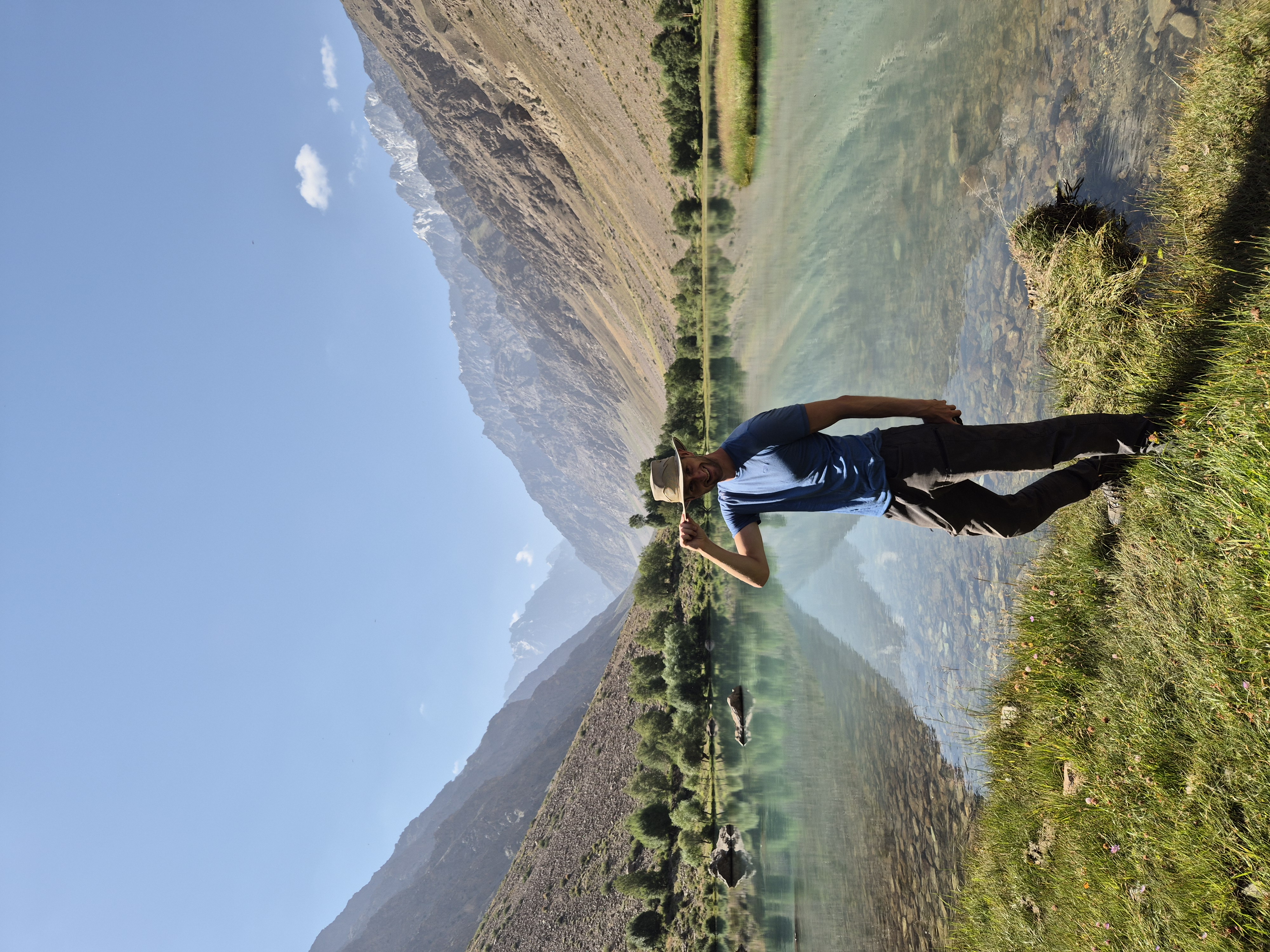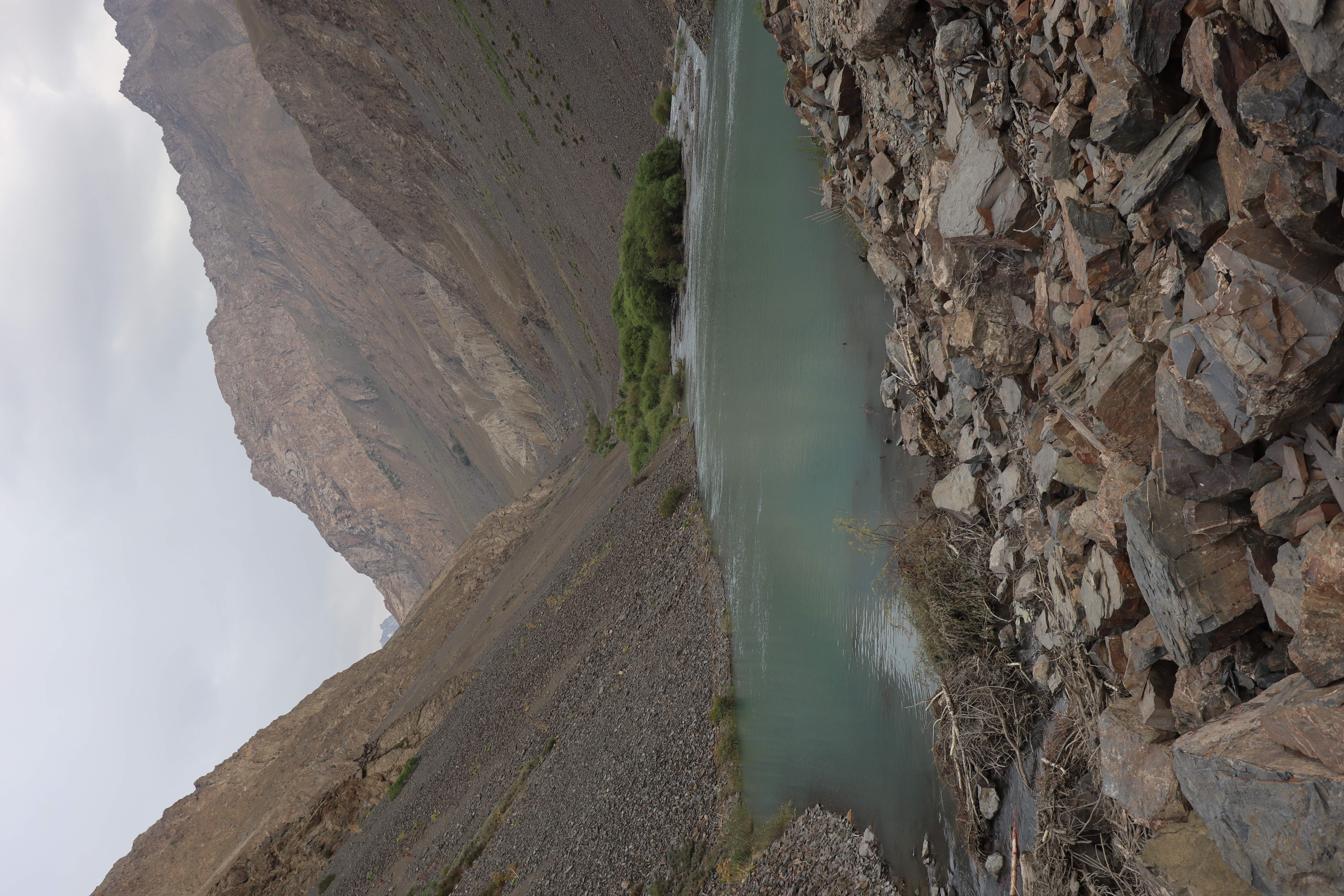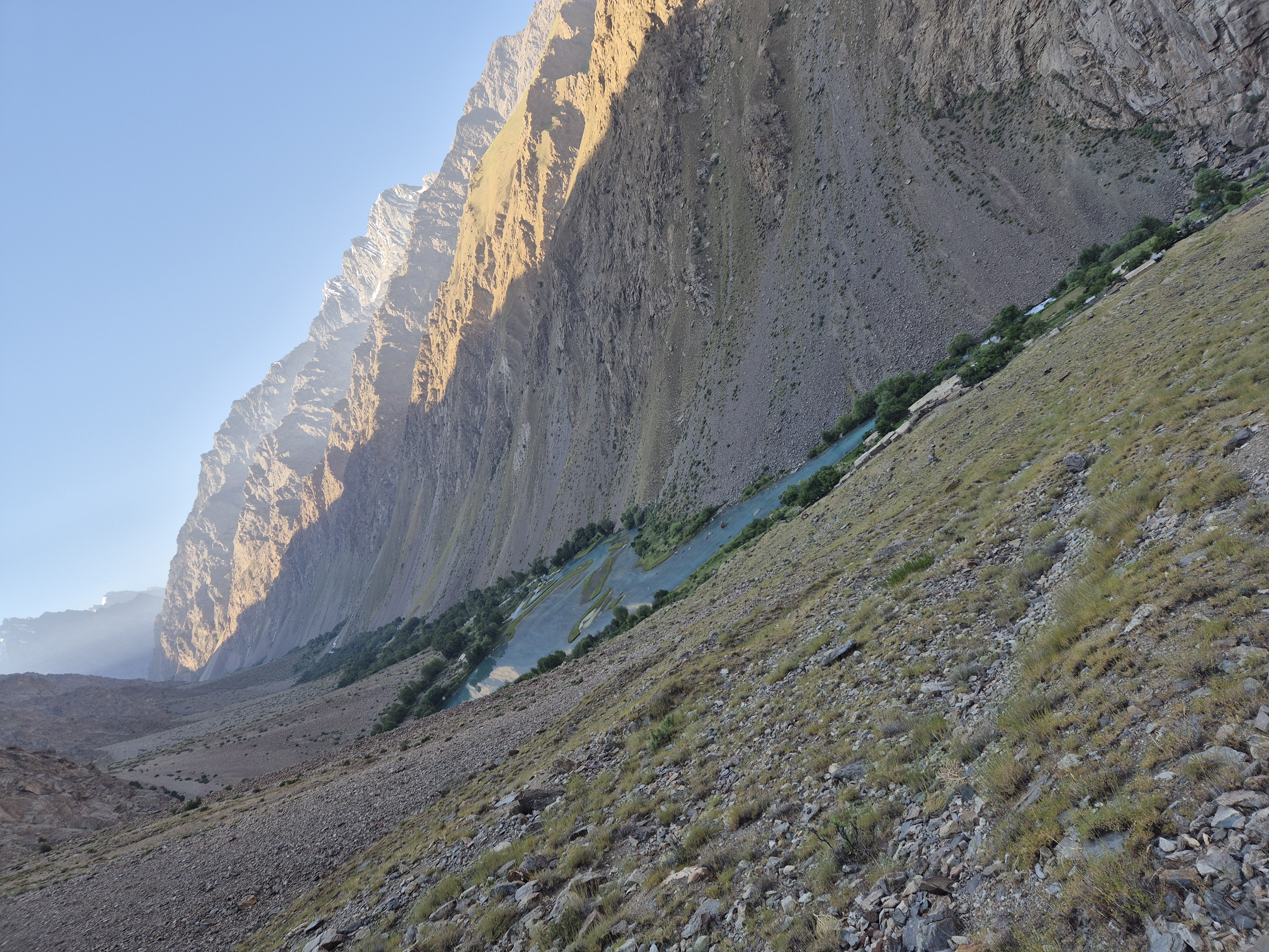 Von Kalaikhum brachen wir am Morgen des 16.07.2025 in Richtung Bartang Valley auf. Über die nächsten 200 Kilometer ging es immer weiter stetig bergauf, von 1200 auf grob 2400 Höhenmeter. Unser Ziel des zweiten Tages entlang des Pamir Highway war es, das abgelegene Dorf Jizeu zu erreichen. Die Stimmung im Auto war gut und auch unser Fahrer Nurik hatte seinen Spaß, als wir anfingen unsere Lieblingsmusik zu rotieren und die Straßen sich von Asphalt zu Schotter wandelten. Gegen Nachmittag erreichten wir eine aus Stahlseilen und Brettern gezimmerte Brücke. Dort hielt Nurik an. Nur die nötigsten Sachen wie Wasser, ein wenig zu Essen, eine Zahnbürste und die Kamera mitnehmend, machten wir uns zu viert über die wackelige Brücke und einem Flusslauf entlang, den schmalen Pfad den Talrücken hinauf, zum Dorf auf. Zwei Stunden sollte die kleine Wanderung dauern. Wir brauchten etwas länger, da Sissi an einer Lebensmittelvergiftung litt und wir einige Stopps einlegen mussten, damit sie sich regenerieren konnte. Trotz der Stopps, brach Sissi für sich das Abendteuer nach knapp einer Stunde ab und kehrte zurück zu Nurik, der nicht unweit der Brücke mit dem Auto zurückgeblieben war. Dem steinigen Pfad gen Süd-Osten in die Berge folgend, ging es nun etwas zügiger zu Dritt weiter. Den sprudelnden und reißenden Gebirgsfluss zu unserer Linken. Von allen Seiten waren wir von Steinen und Geröll umgeben, nur entlang des Flusses hatten sich Bäume und Gräser ansiedeln können. Immer weiter das Tal hinauf und schließlich dann doch durch grünere Vegetation, fürte uns der Pfad. Es dämmerte bereits, als wir Jizeu Village erreichten und herausfanden, warum es hier grüner war. Das kleine Dorf lag in der Mitte des Tals, am Rande eines klaren Sees, der türkis-blau schimmerte. Nach ein wenig Suchen fanden wir die für uns vorgesehene Unterkunft in einem aus Steinplatten gezimmerten Haus mit Flachdach. Während wir aufgefordert wurden uns auszuruhen und auf das Abendbrot zu warten, schnappte ich mir meine Kamera und erkundete das kleine tadschikische Bergdorf. Verfolgt von neugierigen Kinderblicken wurde mir plötzlich ein Volleyball zugeworfen, sodass ich die Zeit bis zur Fertigstellung des Essens damit verbrachte, den Ball den Kindern zuzuspielen. Wir hatten einen Heidenspaß und das Gelächter und Gekreische der Kinder hallte durch das Dorf. Erst als ein Erwachsener des Dorfes auftauchte und erklärte, dass das Abendbrot bereit stünde, konnte ich mich von der grinsenden und lachenden Meute loseisen. Das Essen war nichts außergewöhnliches, dennoch war ich überrascht, welche Essensvielfalt in einem so abgelegen Teil der Erde geboten wurde. Nüsse, Rosinen, Brot und eine derbe Suppe standen bereit. Trotz meiner aus Samarkand noch anhaltenden Lebensmitzelvergiftung verschlang ich alles, was ich als schmackhaft erachtete.