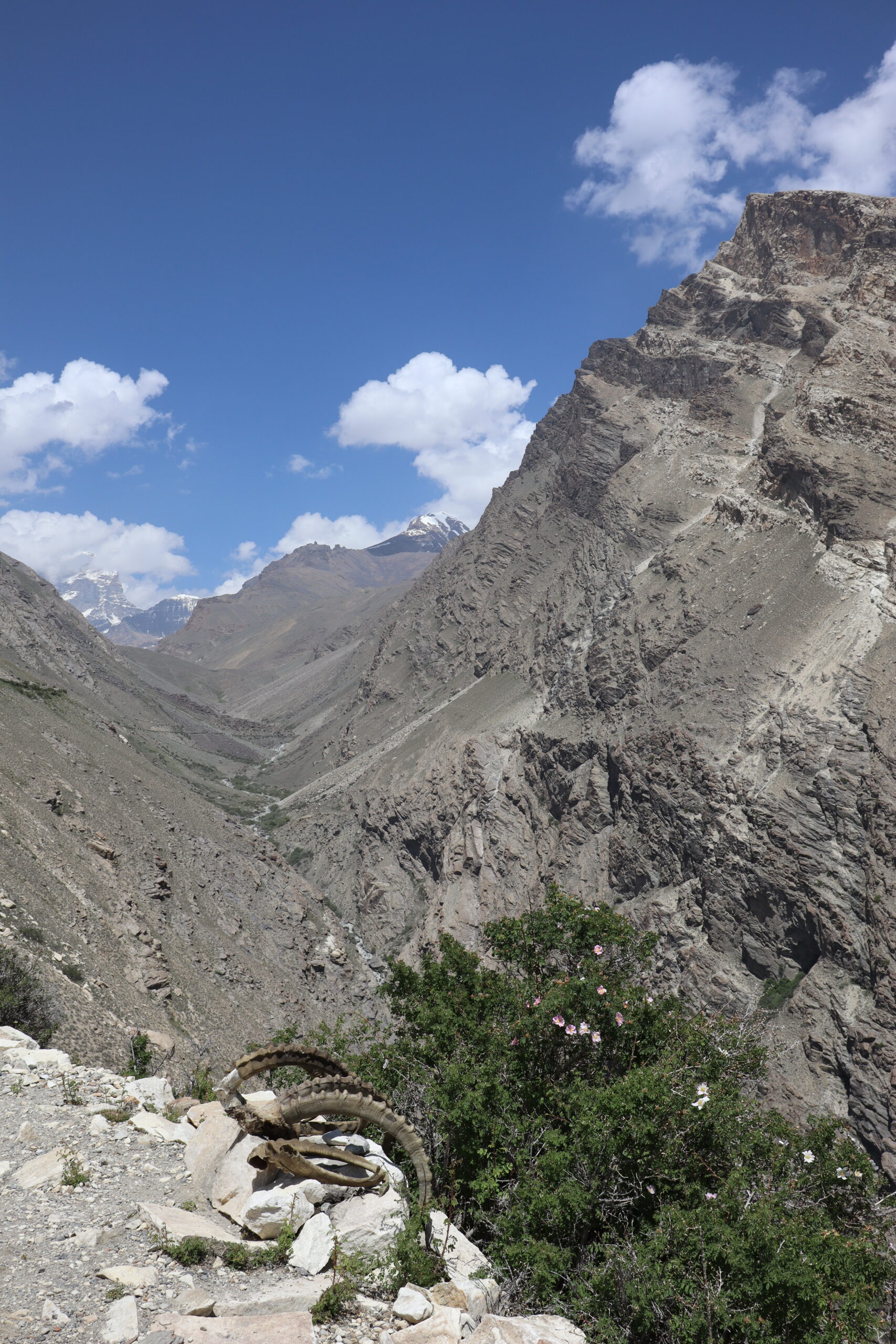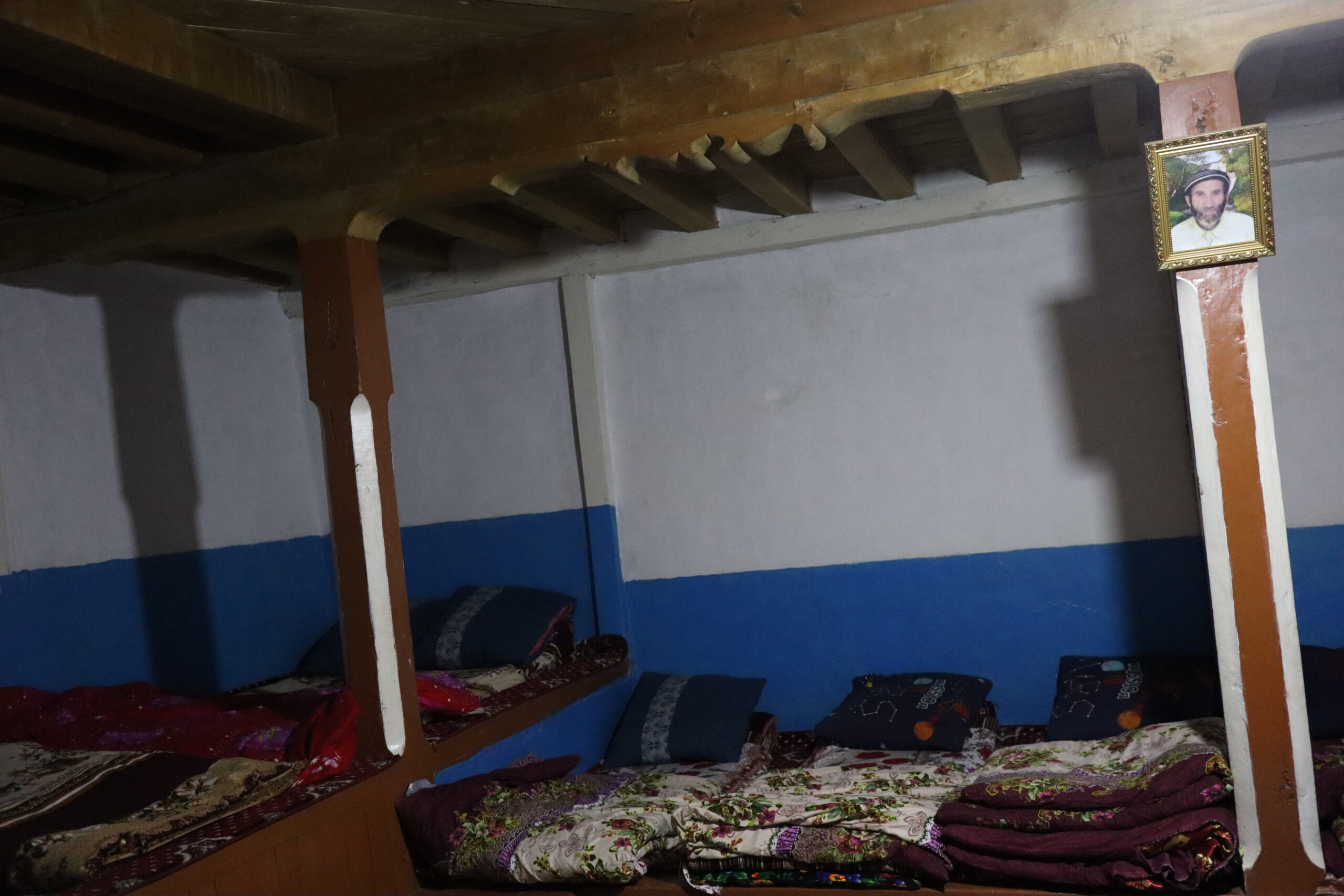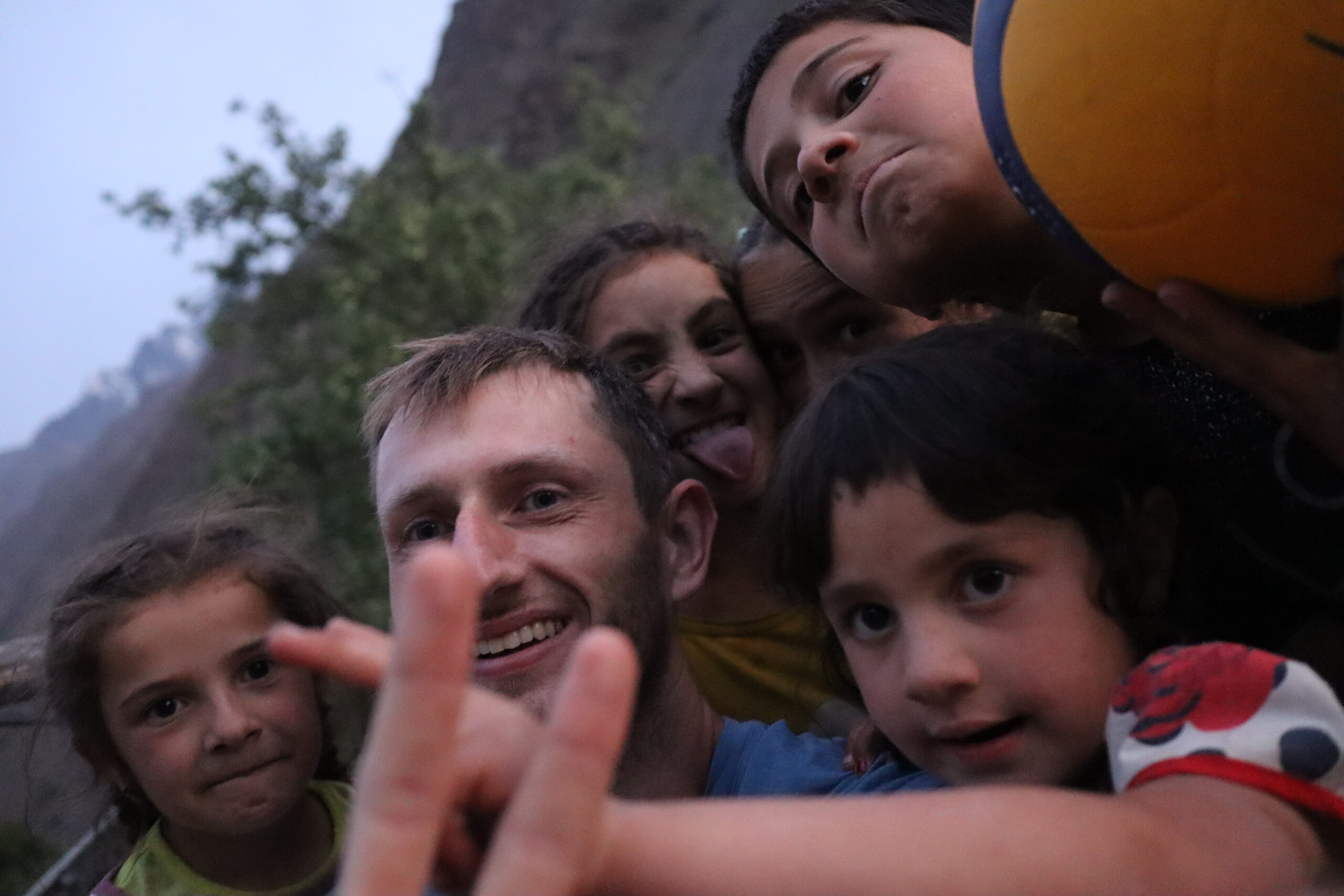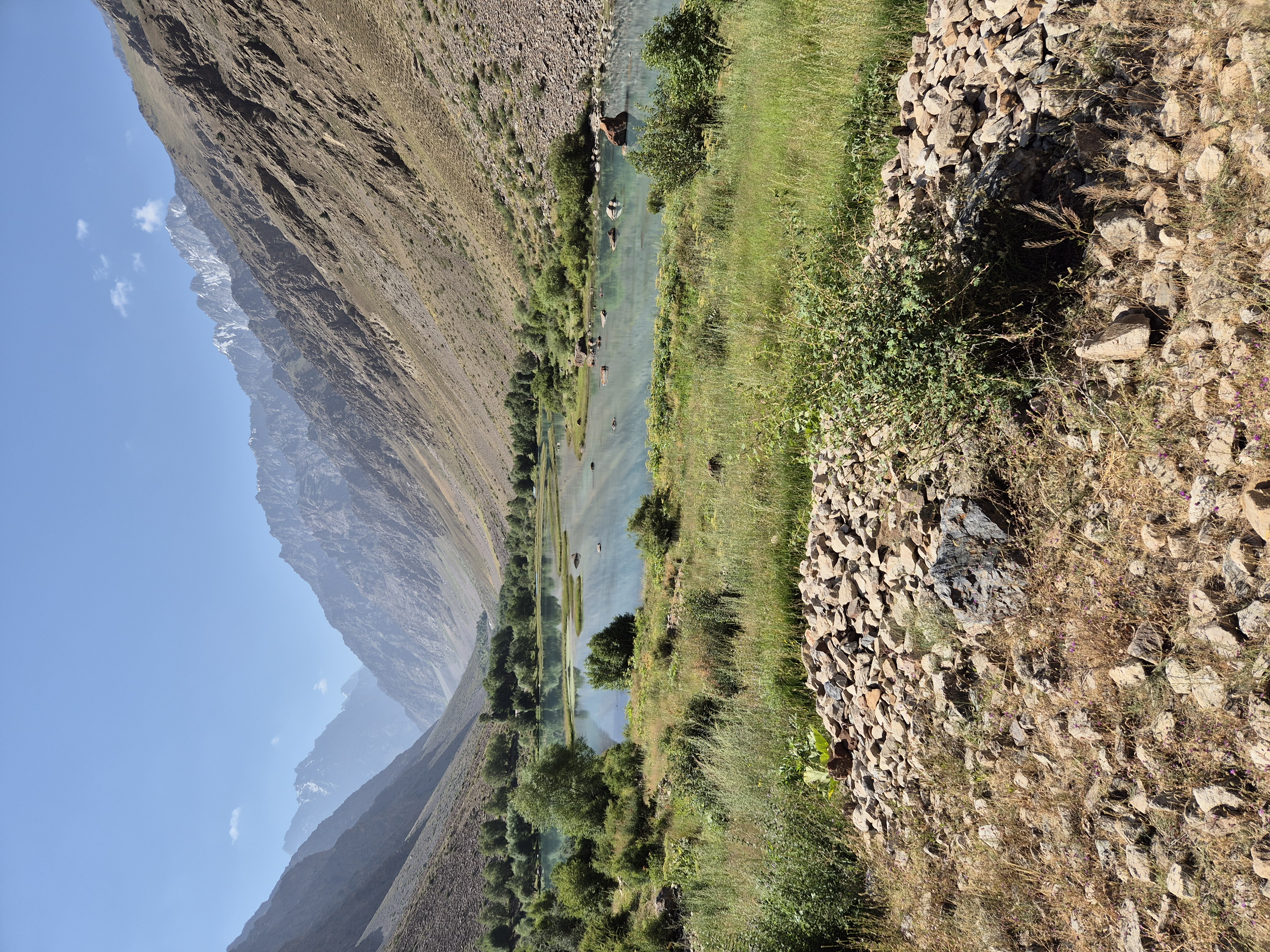 Von Kalaikhum brachen wir am Morgen des 16.07.2025 in Richtung Bartang Valley auf. Über die nächsten 200 Kilometer ging es immer weiter stetig bergauf, von 1200 auf grob 2400 Höhenmeter. Unser Ziel des zweiten Tages entlang des Pamir Highway war es, das abgelegene Dorf Jizeu zu erreichen. Die Stimmung im Auto war gut und auch unser Fahrer Nurik hatte seinen Spaß, als wir anfingen unsere Lieblingsmusik zu rotieren und die Straßen sich von Asphalt zu Schotter wandelten. Gegen Nachmittag erreichten wir eine aus Stahlseilen und Brettern gezimmerte Brücke. Dort hielt Nurik an. Nur die nötigsten Sachen wie Wasser, ein wenig zu Essen, eine Zahnbürste und die Kamera mitnehmend, machten wir uns zu viert über die wackelige Brücke und einem Flusslauf entlang, den schmalen Pfad den Talrücken hinauf, zum Dorf auf. Zwei Stunden sollte die kleine Wanderung dauern. Wir brauchten etwas länger, da Sissi an einer Lebensmittelvergiftung litt und wir einige Stopps einlegen mussten, damit sie sich regenerieren konnte. Trotz der Stopps, brach Sissi für sich das Abendteuer nach knapp einer Stunde ab und kehrte zurück zu Nurik, der nicht unweit der Brücke mit dem Auto zurückgeblieben war. Dem steinigen Pfad gen Süd-Osten in die Berge folgend, ging es nun etwas zügiger zu Dritt weiter. Den sprudelnden und reißenden Gebirgsfluss zu unserer Linken. Von allen Seiten waren wir von Steinen und Geröll umgeben, nur entlang des Flusses hatten sich Bäume und Gräser ansiedeln können. Immer weiter das Tal hinauf und schließlich dann doch durch grünere Vegetation, fürte uns der Pfad. Es dämmerte bereits, als wir Jizeu Village erreichten und herausfanden, warum es hier grüner war. Das kleine Dorf lag in der Mitte des Tals, am Rande eines klaren Sees, der türkis-blau schimmerte. Nach ein wenig Suchen fanden wir die für uns vorgesehene Unterkunft in einem aus Steinplatten gezimmerten Haus mit Flachdach. Während wir aufgefordert wurden uns auszuruhen und auf das Abendbrot zu warten, schnappte ich mir meine Kamera und erkundete das kleine tadschikische Bergdorf. Verfolgt von neugierigen Kinderblicken wurde mir plötzlich ein Volleyball zugeworfen, sodass ich die Zeit bis zur Fertigstellung des Essens damit verbrachte, den Ball den Kindern zuzuspielen. Wir hatten einen Heidenspaß und das Gelächter und Gekreische der Kinder hallte durch das Dorf. Erst als ein Erwachsener des Dorfes auftauchte und erklärte, dass das Abendbrot bereit stünde, konnte ich mich von der grinsenden und lachenden Meute loseisen. Das Essen war nichts außergewöhnliches, dennoch war ich überrascht, welche Essensvielfalt in einem so abgelegen Teil der Erde geboten wurde. Nüsse, Rosinen, Brot und eine derbe Suppe standen bereit. Trotz meiner aus Samarkand noch anhaltenden Lebensmitzelvergiftung verschlang ich alles, was ich als schmackhaft erachtete.