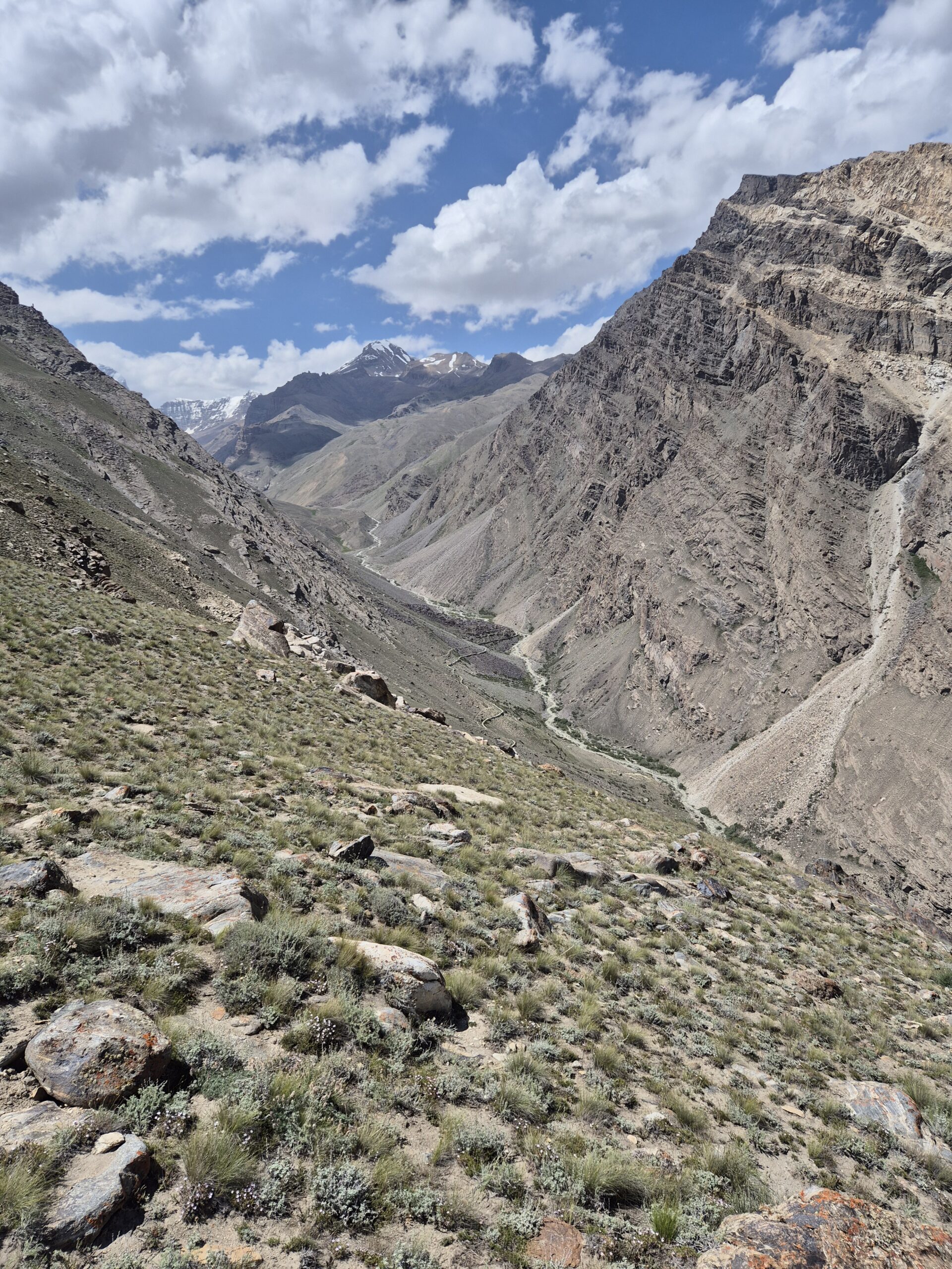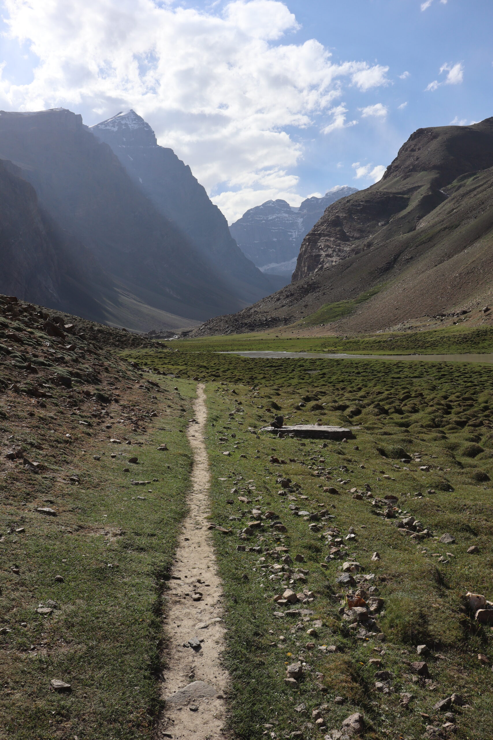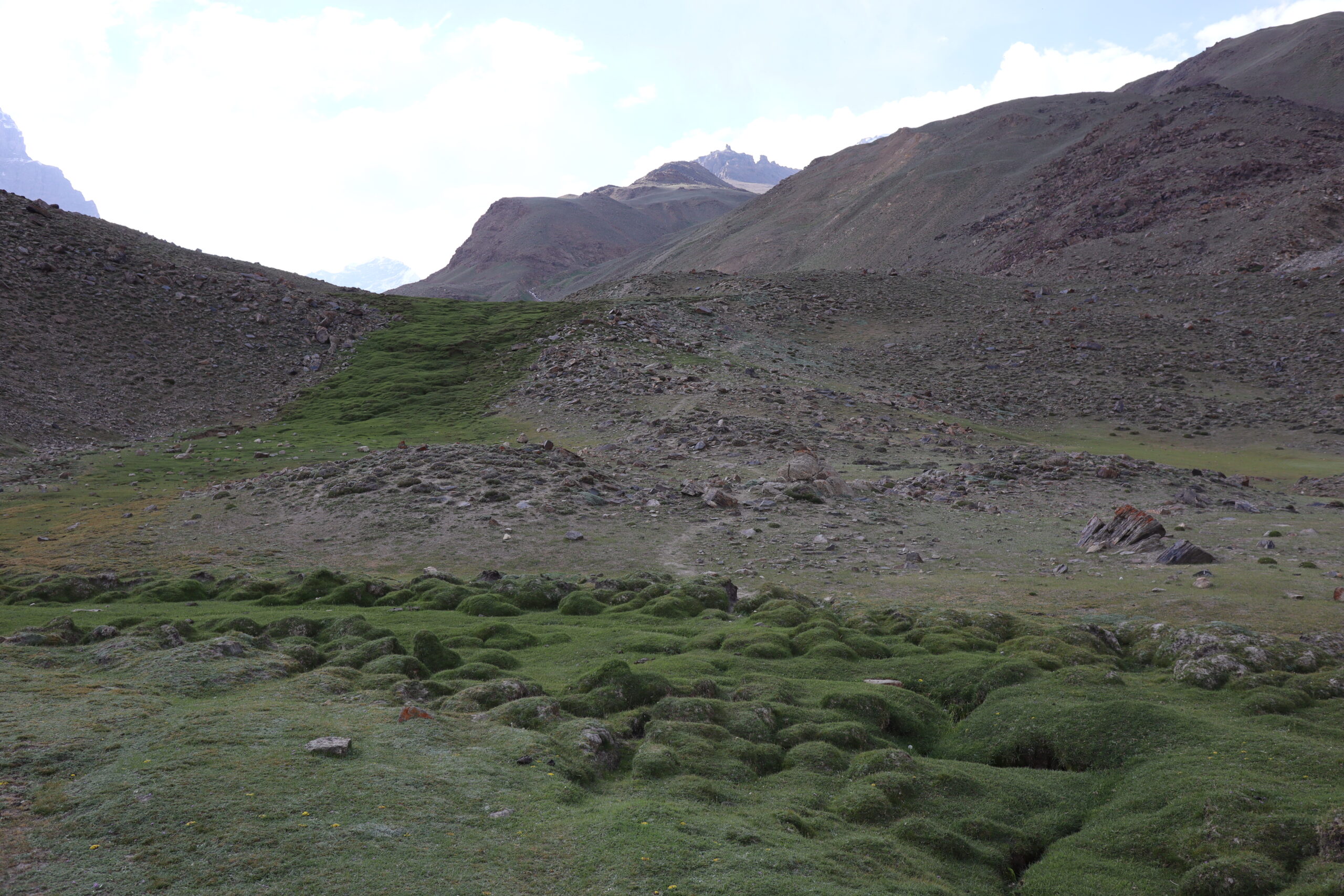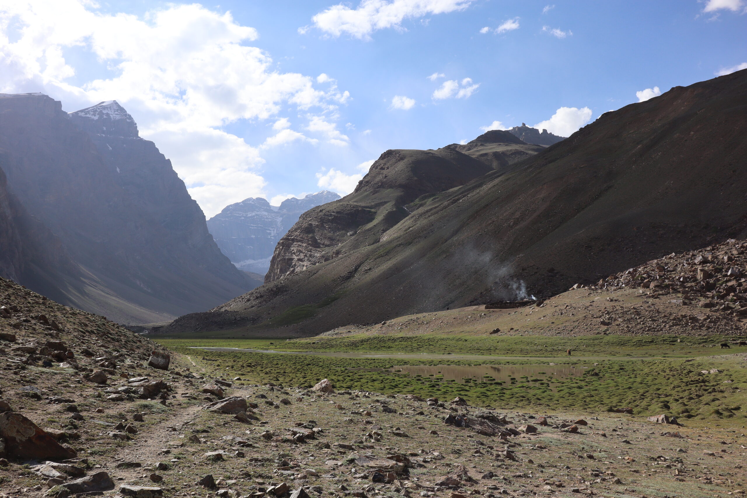 Von Kalaikhum brachen wir am Morgen des 16.07.2025 in Richtung Bartang Valley auf. Über die nächsten 200 Kilometer ging es immer weiter stetig bergauf, von 1200 auf grob 2400 Höhenmeter. Unser Ziel des zweiten Tages entlang des Pamir Highway war es, das abgelegene Dorf Jizeu zu erreichen. Die Stimmung im Auto war gut und auch unser Fahrer Nurik hatte seinen Spaß, als wir anfingen unsere Lieblingsmusik zu rotieren und die Straßen sich von Asphalt zu Schotter wandelten. Gegen Nachmittag erreichten wir eine aus Stahlseilen und Brettern gezimmerte Brücke. Dort hielt Nurik an. Nur die nötigsten Sachen wie Wasser, ein wenig zu Essen, eine Zahnbürste und die Kamera mitnehmend, machten wir uns zu viert über die wackelige Brücke und einem Flusslauf entlang, den schmalen Pfad den Talrücken hinauf, zum Dorf auf. Zwei Stunden sollte die kleine Wanderung dauern. Wir brauchten etwas länger, da Sissi an einer Lebensmittelvergiftung litt und wir einige Stopps einlegen mussten, damit sie sich regenerieren konnte. Trotz der Stopps, brach Sissi für sich das Abendteuer nach knapp einer Stunde ab und kehrte zurück zu Nurik, der nicht unweit der Brücke mit dem Auto zurückgeblieben war. Dem steinigen Pfad gen Süd-Osten in die Berge folgend, ging es nun etwas zügiger zu Dritt weiter. Den sprudelnden und reißenden Gebirgsfluss zu unserer Linken. Von allen Seiten waren wir von Steinen und Geröll umgeben, nur entlang des Flusses hatten sich Bäume und Gräser ansiedeln können. Immer weiter das Tal hinauf und schließlich dann doch durch grünere Vegetation, fürte uns der Pfad. Es dämmerte bereits, als wir Jizeu Village erreichten und herausfanden, warum es hier grüner war. Das kleine Dorf lag in der Mitte des Tals, am Rande eines klaren Sees, der türkis-blau schimmerte. Nach ein wenig Suchen fanden wir die für uns vorgesehene Unterkunft in einem aus Steinplatten gezimmerten Haus mit Flachdach. Während wir aufgefordert wurden uns auszuruhen und auf das Abendbrot zu warten, schnappte ich mir meine Kamera und erkundete das kleine tadschikische Bergdorf. Verfolgt von neugierigen Kinderblicken wurde mir plötzlich ein Volleyball zugeworfen, sodass ich die Zeit bis zur Fertigstellung des Essens damit verbrachte, den Ball den Kindern zuzuspielen. Wir hatten einen Heidenspaß und das Gelächter und Gekreische der Kinder hallte durch das Dorf. Erst als ein Erwachsener des Dorfes auftauchte und erklärte, dass das Abendbrot bereit stünde, konnte ich mich von der grinsenden und lachenden Meute loseisen. Das Essen war nichts außergewöhnliches, dennoch war ich überrascht, welche Essensvielfalt in einem so abgelegen Teil der Erde geboten wurde. Nüsse, Rosinen, Brot und eine derbe Suppe standen bereit. Trotz meiner aus Samarkand noch anhaltenden Lebensmitzelvergiftung verschlang ich alles, was ich als schmackhaft erachtete.
