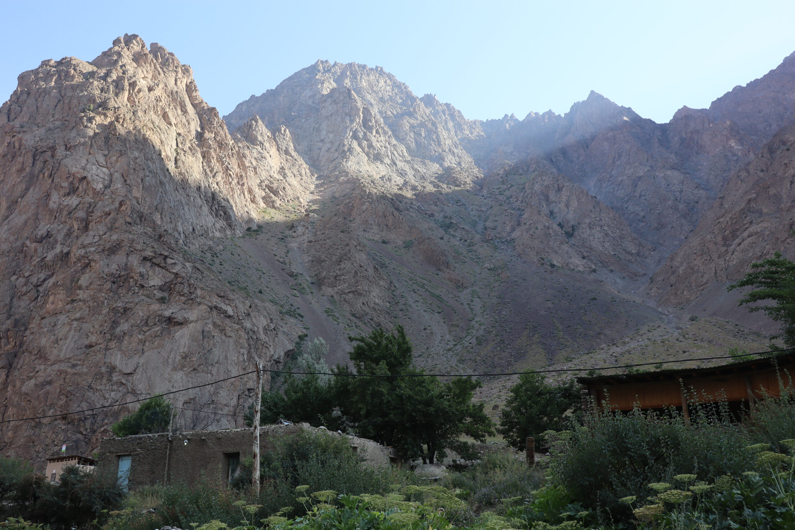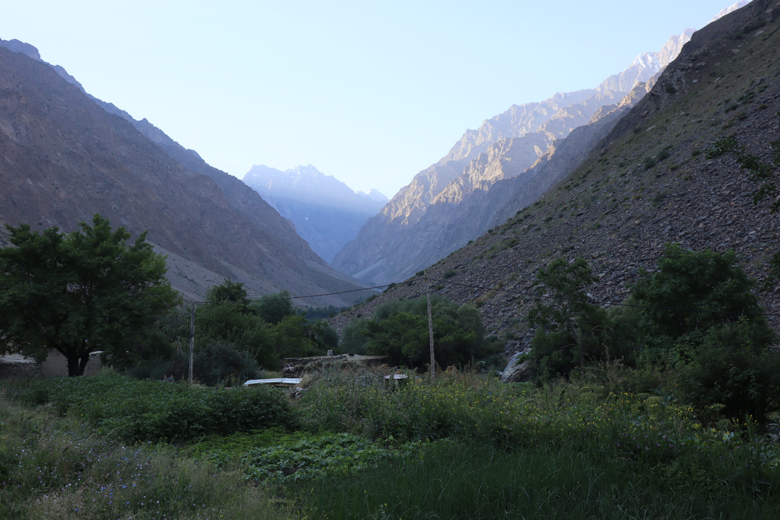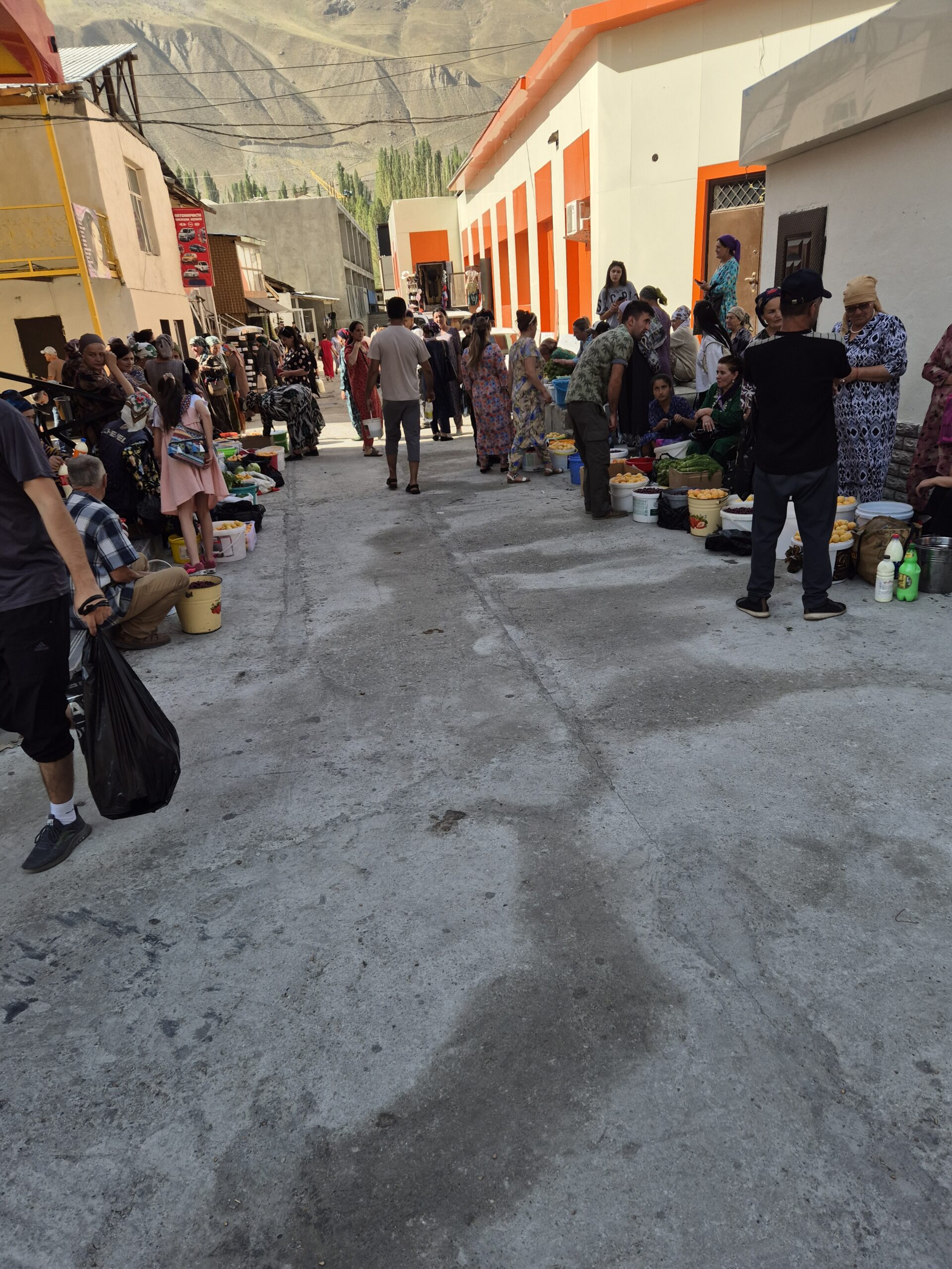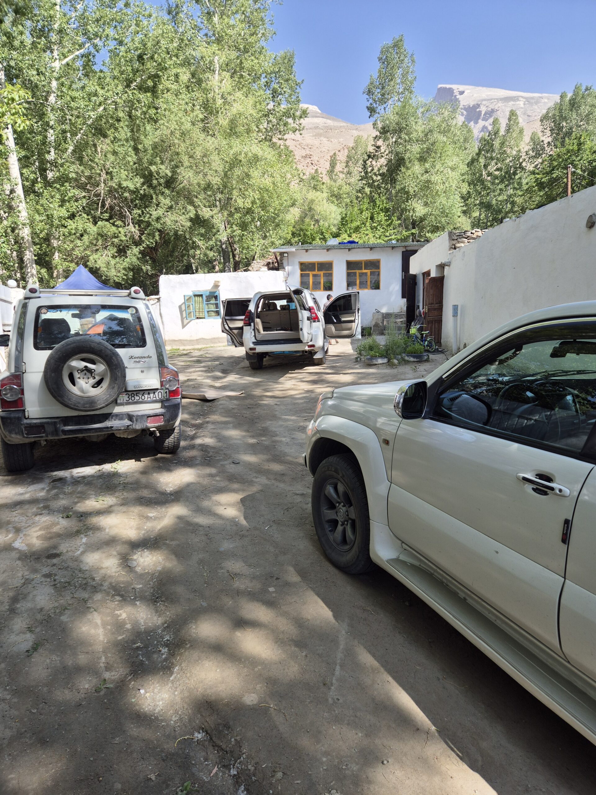 Am Morgen des 17.07.2025 wachte ich früh auf, waren wir ja bereits erschöpft kurz nach Einbruch der Dunkelheit am Vortag in unsere Bettlager geklettert. Es war kurz nach sechs Uhr am frühen Morgen, als ich die Unterkunft verließ und die nördliche Talwand emporstieg, um den Blick auf das Dorf Jizeu und die umliegenden Berge bei Sonnenaufgang zu genießen. Wie ein Schwamm sog ich die wundervollen Momente in mich auf und erkundete die Umgebung um Jizeu bevor ich zwei Stunden später zum Frühstück ins Bergdorf zurückkehrte. Der anschließende Abstieg zurück zur Brücke und zu unserem Fahrer Nurik verlief zügig und ohne Probleme. Kurz bevor Jennifer, Jonny und ich die Brücke erreichten trafen wir auf Sissi, die am Rand des Flusses hockte, kurz davor ins erfrischende, kühle Nass zu springen. Schnell taten wir es Sissi gleich, entledigten uns unserer Kleider und wuschen den Schweiß durch einen gezielten Sprung ins eiskalte Wasser ab. Man konnte nur einige Sekunden im Wasser bleiben, bevor sich alles zusammenzog und der Körper vor kälte schmerzend rebellierte. Von Sissi erfuhren wir, dass sie es am Vortag sicher zurückgeschafft und mit Nurik in einem anderen nicht weit entfernten Dorf die Nacht verbracht hatte. Wieder angezogen, erfrischt und zurück im Landcruiser, ging es zu fünft in Richtung Khorog, die wohl größte Siedlung, auf unserem Weg nach Osch in Kirgistan. Neben Sissi litt auch Jonathan mittlerweile an einer Lebensmittelvergiftung und wenn man meine von Samarkand mit dazu zählte, waren wir zu Dritt in unserem Elend. Nur Nurik und Jennifer hatte es noch nicht erwischt. Nurik kam aus Tadschikistan und war das Essen gewohnt, während Jennifer bisher mit Argusaugen darauf aufgepasst hatte, was sie zu sich nahm. So entschieden wir als Kollektiv den Tag in Khorog ruhig ausklingen zu lassen. Die Unterkunft, die wir in Khorog anfuhren, war ein absolut geeigneter Platz für unser Vorhaben. Das große und weiträumige Haus lag etwas außerhalb der Stadt, es gab andere Reisende, mit denen man sich austauschen konnte und Obstbäume mit reifen Früchten im überschuss, die einfach gepflück und gegessen werden konnten. Die Kinder der Hostelbesitzer waren Feuer und Flamme uns den Garten und das gesamte Gelände rund um das Haus zu zeigen. Natürlich umfasste die Rundtour das ausgiebige Naschen von Aprikosen, Pfirsichen, Mirabellen, Kirschen und Äpfeln, das Streicheln des Hundes, das Scheuchen der Hühner, das Begutachten der Kühe und das Füttern des Pferdes. Zum Abendbrot gab es dann eine äußerst leckere vegetarische Suppe – wir hatten beschlossen uns von nun an, falls möglich, fleischlos zu ernähren. Zum krönenden Abschluss spielten wir noch eine Runde Karten unter einem orientalisch anmutenden Baldachin, bevor wir uns müde zurückzogen und schlafen gingen.
