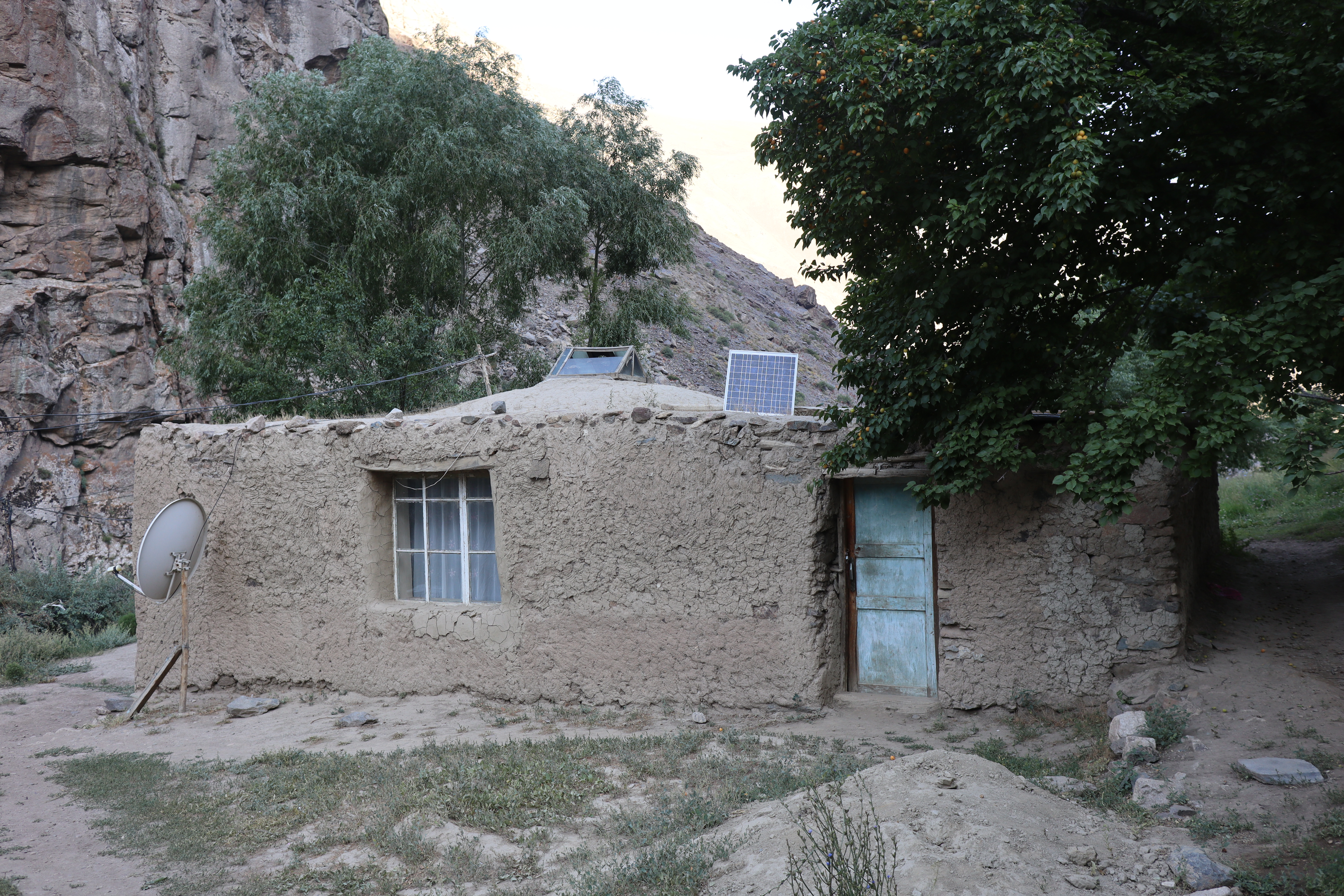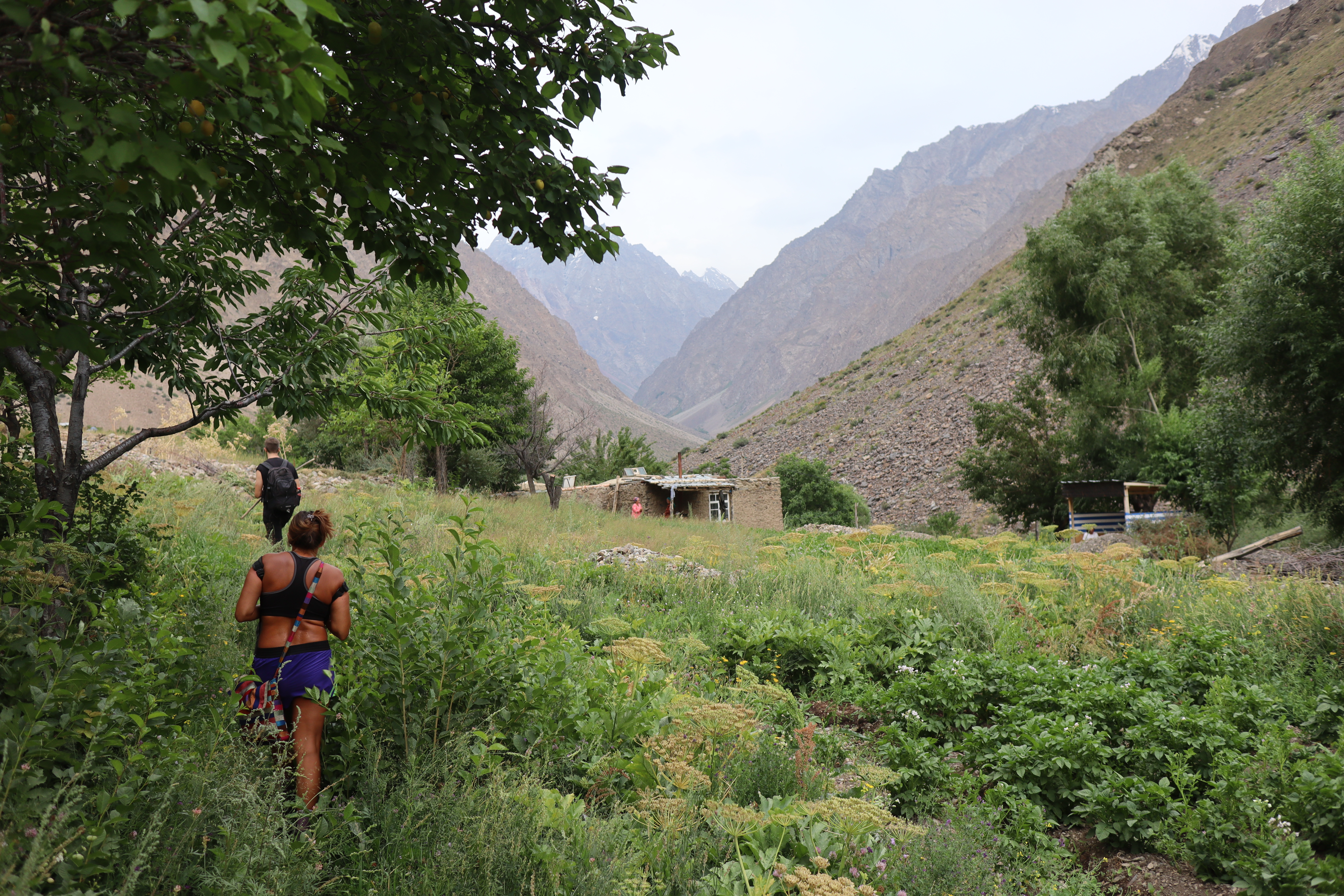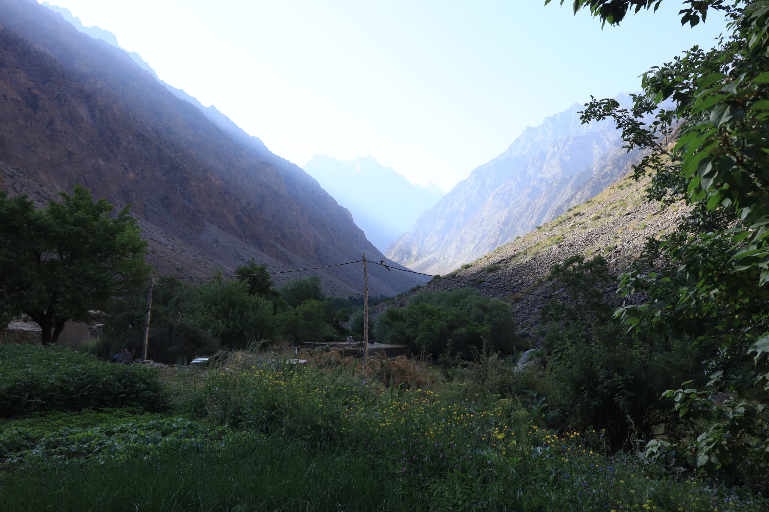 Am Morgen des 17.07.2025 wachte ich früh auf, waren wir ja bereits erschöpft kurz nach Einbruch der Dunkelheit am Vortag in unsere Bettlager geklettert. Es war kurz nach sechs Uhr am frühen Morgen, als ich die Unterkunft verließ und die nördliche Talwand emporstieg, um den Blick auf das Dorf Jizeu und die umliegenden Berge bei Sonnenaufgang zu genießen. Wie ein Schwamm sog ich die wundervollen Momente in mich auf und erkundete die Umgebung um Jizeu bevor ich zwei Stunden später zum Frühstück ins Bergdorf zurückkehrte. Der anschließende Abstieg zurück zur Brücke und zu unserem Fahrer Nurik verlief zügig und ohne Probleme. Kurz bevor Jennifer, Jonny und ich die Brücke erreichten trafen wir auf Sissi, die am Rand des Flusses hockte, kurz davor ins erfrischende, kühle Nass zu springen. Schnell taten wir es Sissi gleich, entledigten uns unserer Kleider und wuschen den Schweiß durch einen gezielten Sprung ins eiskalte Wasser ab. Man konnte nur einige Sekunden im Wasser bleiben, bevor sich alles zusammenzog und der Körper vor kälte schmerzend rebellierte. Von Sissi erfuhren wir, dass sie es am Vortag sicher zurückgeschafft und mit Nurik in einem anderen nicht weit entfernten Dorf die Nacht verbracht hatte. Wieder angezogen, erfrischt und zurück im Landcruiser, ging es zu fünft in Richtung Khorog, die wohl größte Siedlung, auf unserem Weg nach Osch in Kirgistan. Neben Sissi litt auch Jonathan mittlerweile an einer Lebensmittelvergiftung und wenn man meine von Samarkand mit dazu zählte, waren wir zu Dritt in unserem Elend. Nur Nurik und Jennifer hatte es noch nicht erwischt. Nurik kam aus Tadschikistan und war das Essen gewohnt, während Jennifer bisher mit Argusaugen darauf aufgepasst hatte, was sie zu sich nahm. So entschieden wir als Kollektiv den Tag in Khorog ruhig ausklingen zu lassen. Die Unterkunft, die wir in Khorog anfuhren, war ein absolut geeigneter Platz für unser Vorhaben. Das große und weiträumige Haus lag etwas außerhalb der Stadt, es gab andere Reisende, mit denen man sich austauschen konnte und Obstbäume mit reifen Früchten im überschuss, die einfach gepflück und gegessen werden konnten. Die Kinder der Hostelbesitzer waren Feuer und Flamme uns den Garten und das gesamte Gelände rund um das Haus zu zeigen. Natürlich umfasste die Rundtour das ausgiebige Naschen von Aprikosen, Pfirsichen, Mirabellen, Kirschen und Äpfeln, das Streicheln des Hundes, das Scheuchen der Hühner, das Begutachten der Kühe und das Füttern des Pferdes. Zum Abendbrot gab es dann eine äußerst leckere vegetarische Suppe – wir hatten beschlossen uns von nun an, falls möglich, fleischlos zu ernähren. Zum krönenden Abschluss spielten wir noch eine Runde Karten unter einem orientalisch anmutenden Baldachin, bevor wir uns müde zurückzogen und schlafen gingen.