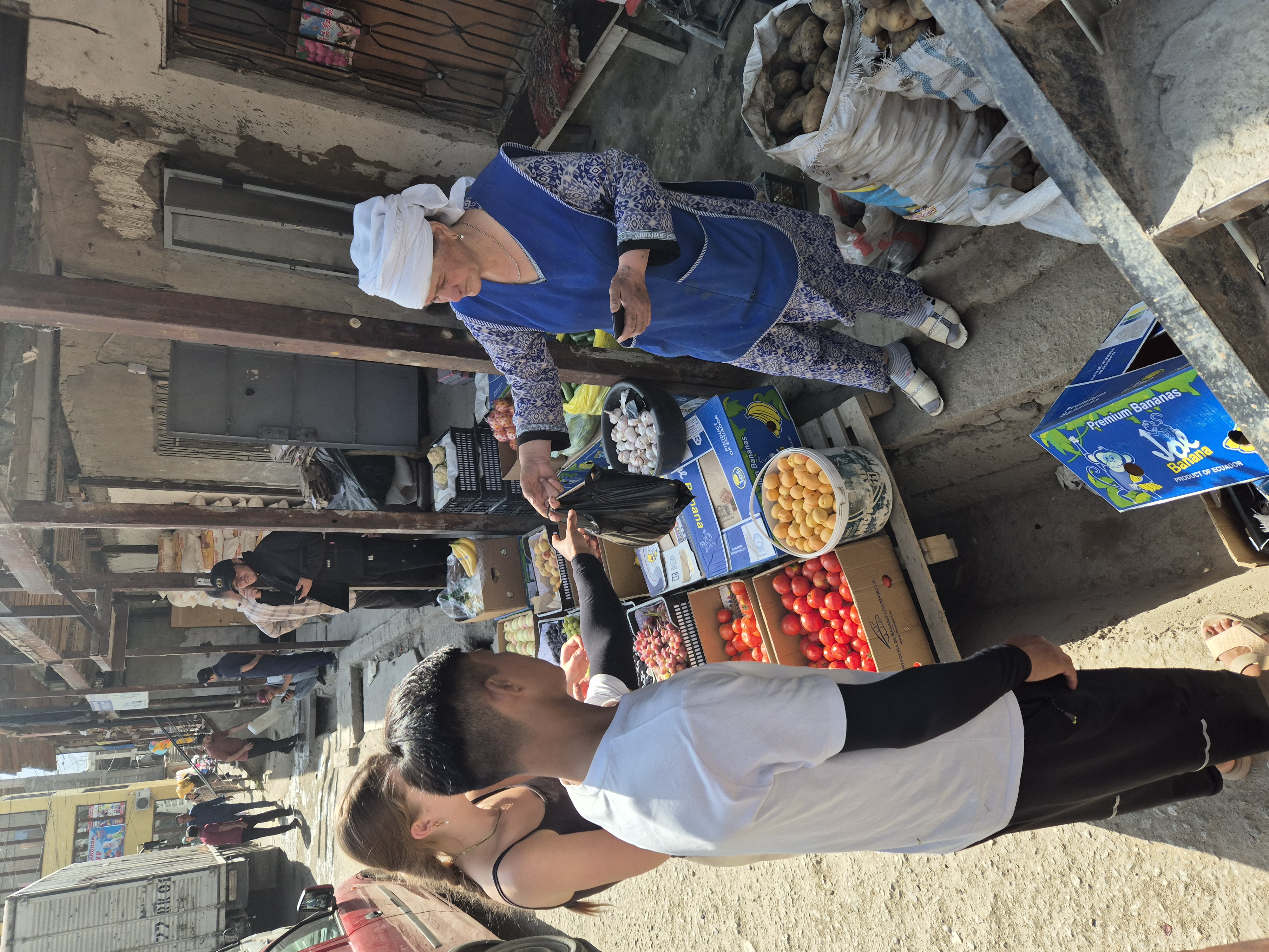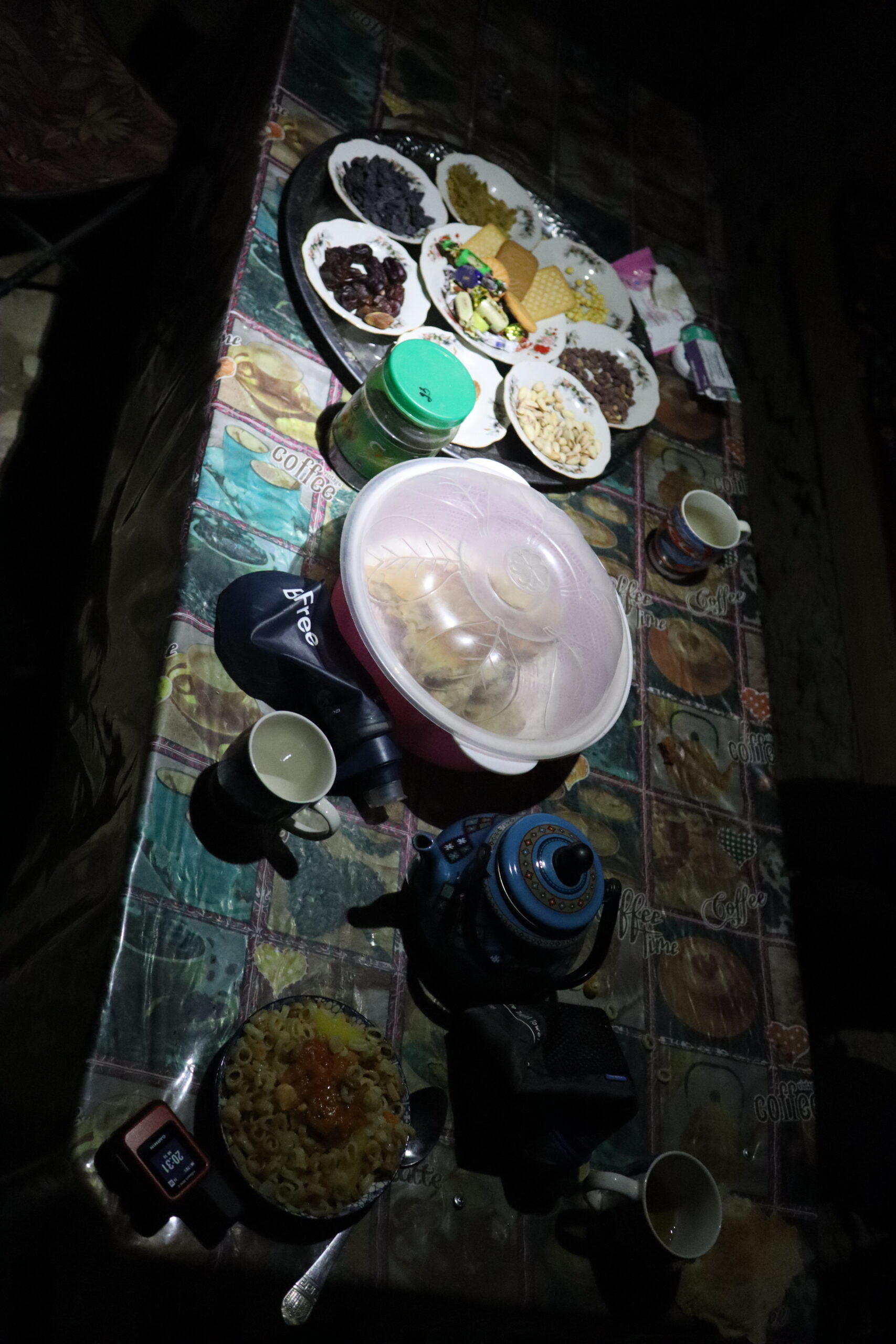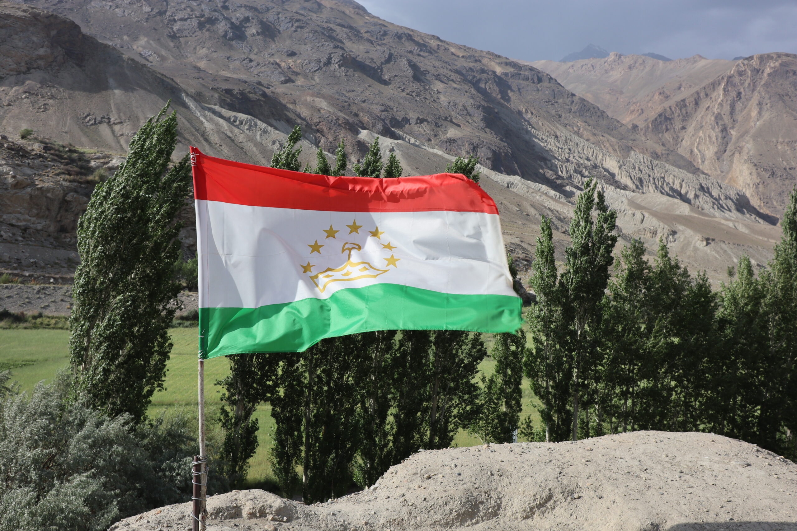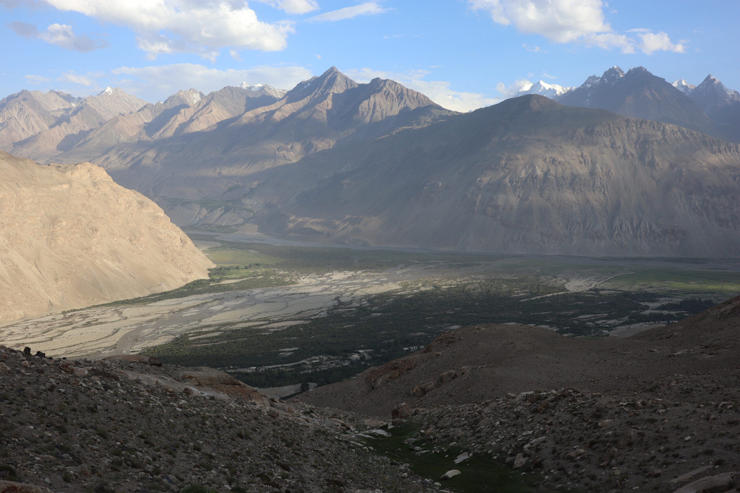 Am Morgen des 17.07.2025 wachte ich früh auf, waren wir ja bereits erschöpft kurz nach Einbruch der Dunkelheit am Vortag in unsere Bettlager geklettert. Es war kurz nach sechs Uhr am frühen Morgen, als ich die Unterkunft verließ und die nördliche Talwand emporstieg, um den Blick auf das Dorf Jizeu und die umliegenden Berge bei Sonnenaufgang zu genießen. Wie ein Schwamm sog ich die wundervollen Momente in mich auf und erkundete die Umgebung um Jizeu bevor ich zwei Stunden später zum Frühstück ins Bergdorf zurückkehrte. Der anschließende Abstieg zurück zur Brücke und zu unserem Fahrer Nurik verlief zügig und ohne Probleme. Kurz bevor Jennifer, Jonny und ich die Brücke erreichten trafen wir auf Sissi, die am Rand des Flusses hockte, kurz davor ins erfrischende, kühle Nass zu springen. Schnell taten wir es Sissi gleich, entledigten uns unserer Kleider und wuschen den Schweiß durch einen gezielten Sprung ins eiskalte Wasser ab. Man konnte nur einige Sekunden im Wasser bleiben, bevor sich alles zusammenzog und der Körper vor kälte schmerzend rebellierte. Von Sissi erfuhren wir, dass sie es am Vortag sicher zurückgeschafft und mit Nurik in einem anderen nicht weit entfernten Dorf die Nacht verbracht hatte. Wieder angezogen, erfrischt und zurück im Landcruiser, ging es zu fünft in Richtung Khorog, die wohl größte Siedlung, auf unserem Weg nach Osch in Kirgistan. Neben Sissi litt auch Jonathan mittlerweile an einer Lebensmittelvergiftung und wenn man meine von Samarkand mit dazu zählte, waren wir zu Dritt in unserem Elend. Nur Nurik und Jennifer hatte es noch nicht erwischt. Nurik kam aus Tadschikistan und war das Essen gewohnt, während Jennifer bisher mit Argusaugen darauf aufgepasst hatte, was sie zu sich nahm. So entschieden wir als Kollektiv den Tag in Khorog ruhig ausklingen zu lassen. Die Unterkunft, die wir in Khorog anfuhren, war ein absolut geeigneter Platz für unser Vorhaben. Das große und weiträumige Haus lag etwas außerhalb der Stadt, es gab andere Reisende, mit denen man sich austauschen konnte und Obstbäume mit reifen Früchten im überschuss, die einfach gepflück und gegessen werden konnten. Die Kinder der Hostelbesitzer waren Feuer und Flamme uns den Garten und das gesamte Gelände rund um das Haus zu zeigen. Natürlich umfasste die Rundtour das ausgiebige Naschen von Aprikosen, Pfirsichen, Mirabellen, Kirschen und Äpfeln, das Streicheln des Hundes, das Scheuchen der Hühner, das Begutachten der Kühe und das Füttern des Pferdes. Zum Abendbrot gab es dann eine äußerst leckere vegetarische Suppe – wir hatten beschlossen uns von nun an, falls möglich, fleischlos zu ernähren. Zum krönenden Abschluss spielten wir noch eine Runde Karten unter einem orientalisch anmutenden Baldachin, bevor wir uns müde zurückzogen und schlafen gingen.