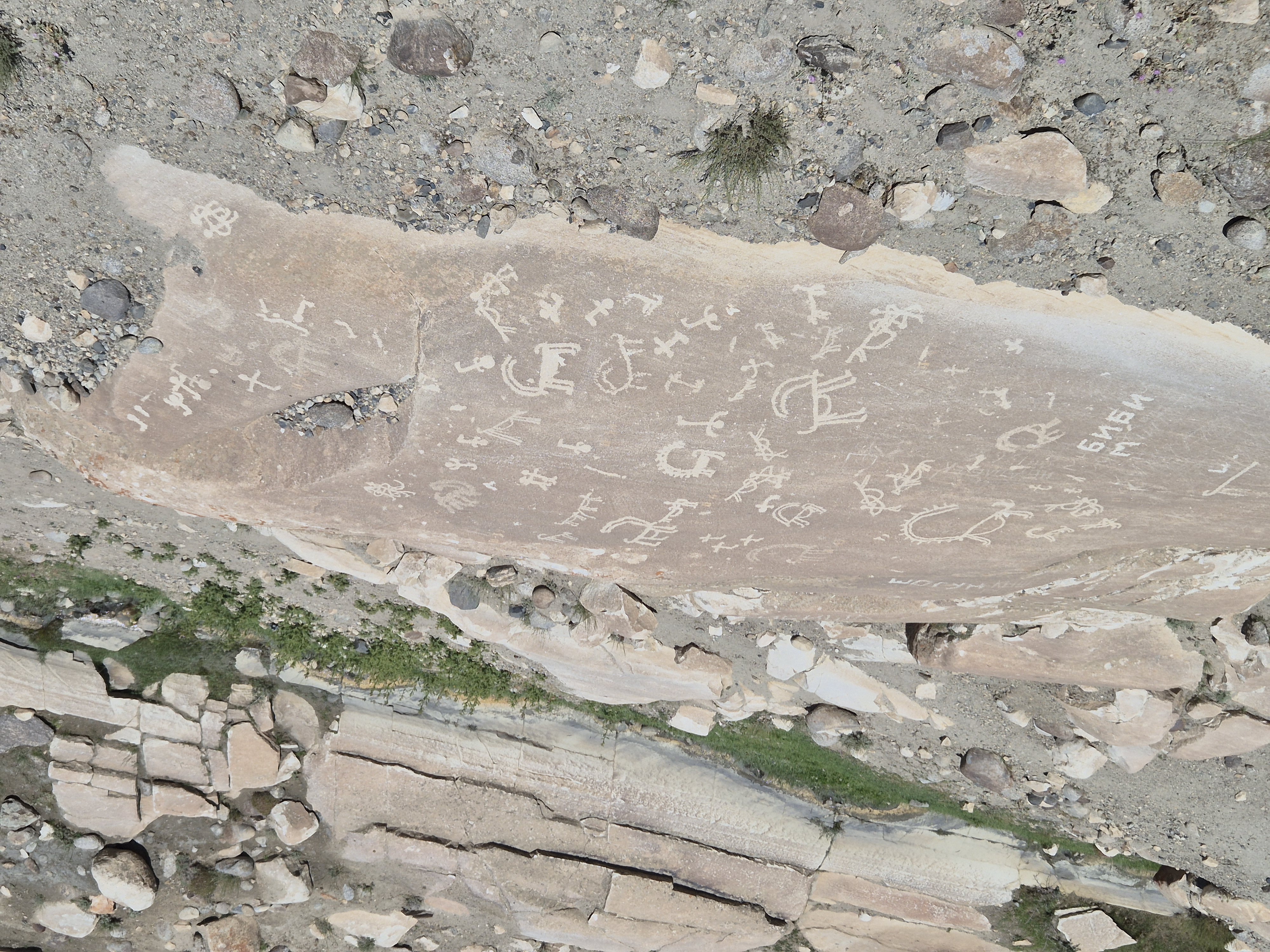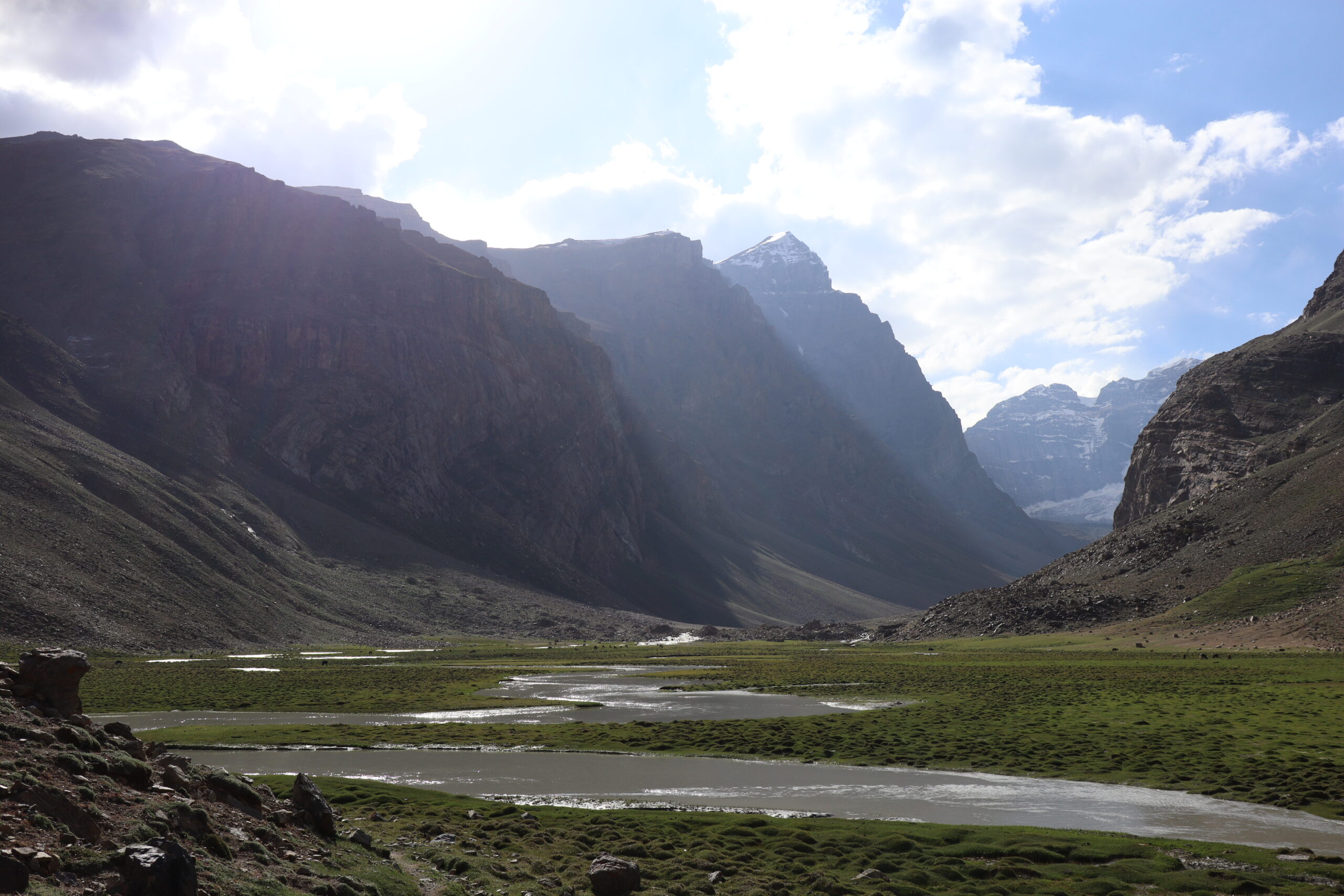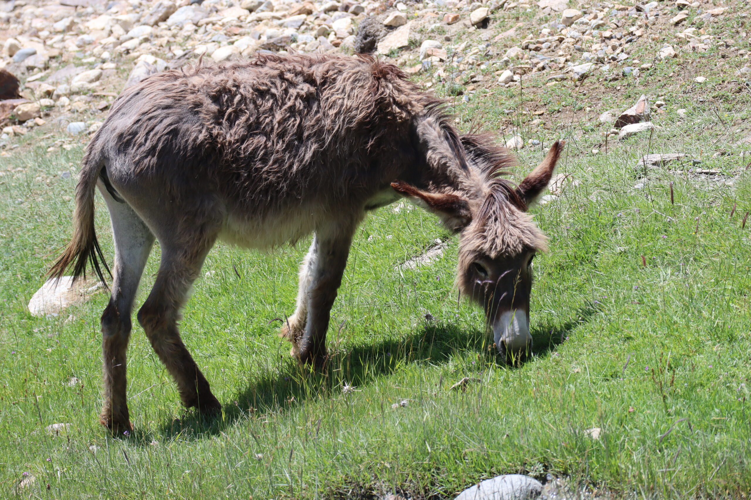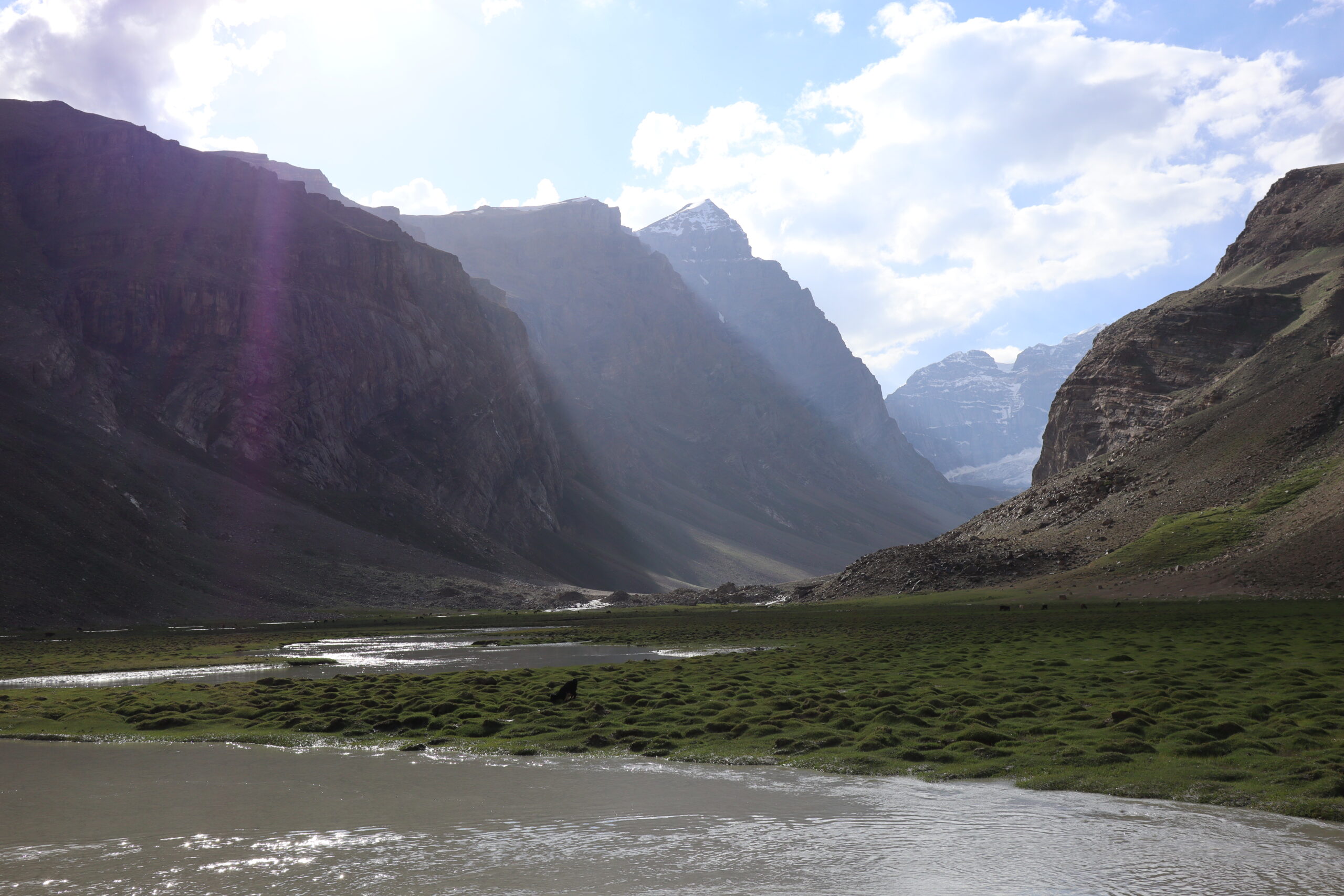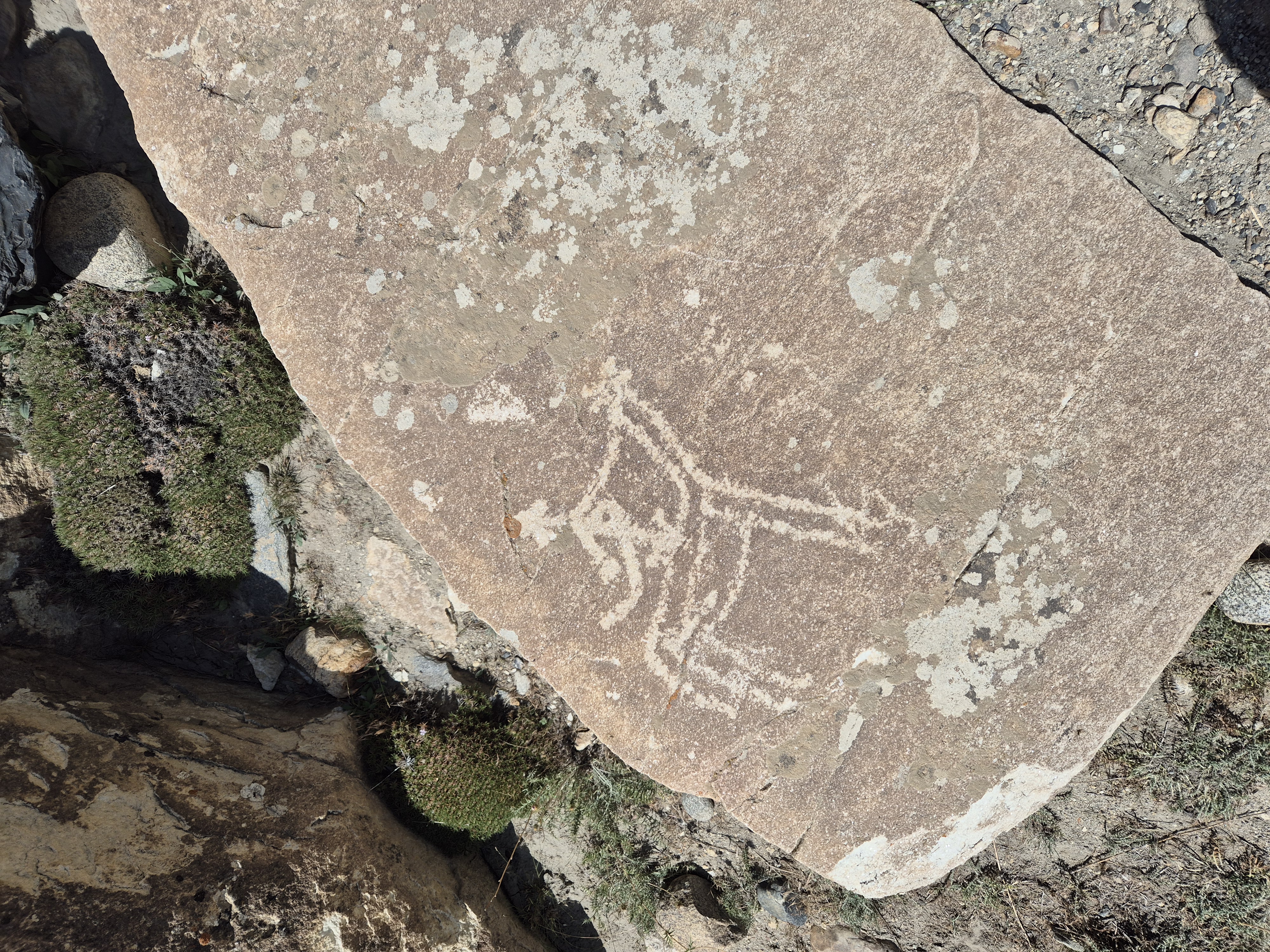 Wie geplant begannt der 19.07.2025 früh. Kurz nach Sonnenaufgang schälten wir uns aus unseren Betten und bereiteten uns auf den Aufstieg vor. Jonny ging es immer noch sehr schlecht und würde den Tag im Homestay verbringen. Tatsächchlich wurden wir vom Unterkunftsbetreiber kurz vor Wanderungsbeginn noch gebeten, doch bitte in eine andere Unterkunft zu wechseln, da unser kleines Räumchen für den Abend für eine andere Gruppe gebucht worden war. Durch dieses Missverständnis verloren wir kostbare Zeit am Morgen. Ein wenig verwirrt kamen wir der Aufforderung nach und fanden ein paar Kilometer weiter eine gemütliche Unterkunft für die bevorstehende Nacht. Dann ging es los. Ich hatte mir von Jonny seinen kleinen Rucksack ausgeliehen und nahm nur Kamera, Hut, Mütze, ein paar Snacks und genüged Wasser mit. Mit zwei kleinen Wasserflaschen in jeder Hand, die wir noch zusätzlich erstanden hatten, fuhr uns Nurik bis zum Trailstart, von wo es dann zu Fuß den Berg hinauf zu kraxeln galt. Zu dritt starteten wir den Aufstieg. Da auch Sissi womoglich noch an der Lebensmittelvergiftung litt, war sie etwas langsamer den Bergrücken hinauf unterwegs als Jennifer und ich. Zuerst versuchte ich auf Sissis Tempo zu achten, doch fiel sie immer weiter zurück. Schließlich beschlossen Jennifer und ich unser Tempo zu halten und verloren Sissi bald aus den Augen. Sissi hatte jedoch als Einzige von uns die heutige Wandertour auf ihrem Handy gespeichert und so orientierten wir uns bald einfach nur noch am schmalen Pfad, der vor uns lag. Sissi war hart im Nehmen und wir waren sicher, sie würde den Weg auch ohne uns finden. Außerdem waren wir nicht allein. Auch andere Wanderer waren an diesem Morgen zu den Meadows am Fuße des Engels Pik aufgebrochen. Der Aufstieg war steil und anstrengend. Die Sonne brannte von oben herab und ich war froh meinen Hut mit der großen Krempe auf dem Kopf zu wissen, der mich vor der gröbsten Sonneneinstrahlung schütze. Wir passierten jahrtausende alte Petroglyphen, wovon einige zu modern und hell auf dunklem Stein glänzten, als dass sie wirklich mehrere tausend Jahre alt sein könnten. Ich vermutete ein Streich der lokalen Bevölkerung oder der Touristen. Wir kamen and Eseln vorbei, die an einem kleinen Bachlauf tranken und beobachteten Adler, die nicht weit über uns ihre Kreise zogen. Gegen Mittag erreichten wir eine Weggabelung. Da wir nicht wussten wo der Weg zum Engels Pik entlang führte, keine Beschilderung zu finden war und ebenso keine Personen in der Nähe, die man hätte fragen können, entschieden Jenniffer und ich, einfach die am nächsten gelegene Bergkuppe zu erklimmen, dort zu rasten und von der Erhöhung wieder den Rückweg ins Tal in Angriff zu nehmen – gesagt, getan. In etwa eine Stunde später standen wir an der angepeilten Stelle und schauten ins Tal hinab. Die Aussicht auf das weitläufige Tal und die anliegenden Bergzüge genießend rasteten wir auf exakt 4000 Metern Höhe. Von der Stelle aus an der wir standen, konnte man auf drei Länder gleichzeitig schauen. Afghanistan lag schräg zur Rechten hinter dem ausgedehnten Flusstal in süd-westlicher Richtung. Pakistan lag etwas weiter zur linken Seite, einen Gebirgszug weiter, in Rchtung Süd-Osten. Wir selbst standen in Tadschikistan. Der Anblick war atemberaubend schön und schroff. Lange konnten wir allerdings nicht rasten, da ein stetig-kühler Wind wehte und uns bald auskühlte. So kraxelten wir die Bergkuppe wieder hinab bis zu der Stelle, an der wir nicht weiter gewusst hatten. Dort trafen wir dieses mal tatsächlich auf andere Wanderer, von denen wir erfuhren, dass wir zum Engels Pik rechts, anstatt links hätten abbiegen müssen. Während Jennifer entschied den Abstieg weiter fortzusetzen, beschloss ich die Route bis zu den grünen, saftigen Hügeln des Engels Pik wie geplant weiter zu verfolgen. Dies bedeutete zusätzliche zehn bis fünfzehn Kilometer für mich. Aber ich würde mich nicht lumpen lassen. Nun ganz auf mich allein gestellt, schlug ich ein scharfes Tempo an, denn es war bereits spät. Auf halbem Wege zu den Meadows kam mir Sissi in Begleitung zweier Franzosen entgegen, auf die wir bereits in Khorog getroffen waren. Kurz tauschten wir uns aus, dann ging es fluchs weiter. Langsam aber sicher machten sich die Muskeln in meinen Beinen bemerkbar. Ich hatte nur noch wenig Wasser und ich musste mit dieser Recource haushalten. Kurz vor 18:00 Uhr erreichte ich die Hochebene mit Blick auf den Engels Pik. Leider war es zu spät, um noch bis zum See selbst vorzudringen, was weitere Kilometer bedeutet hätte. Außerdem war ich vom vorherigen Aufstieg mit Jennifer zur Bergkuppe mehr erschöpft, als ich mir eingestehen wollte. Ausgepowert und kraftlos suchte ich mir eine Stelle wo ich verschnaufen konnte und bewunderte das Lichtspiel auf dem Bergfluss, der die letzten Sonnenstrahlen des Tages einfing. Ich war froh es doch noch bis hierhin geschafft zu haben. Fluchs zückte ich meine Kamera und schoss ein paar Bilder, bevor ich sie wieder wegsteckte und den Moment genoss. Fast ganz alleine befand ich mich in einer abgelegenen Bergregion in Tadschikistan. Nur ein paar Kühe und Ziegen grasten am Fluss, die alsbald von zwei Hirten in Richtung See getrieben wurden. Während die Sonne langsam hinter den Bergen verschwand, wurde es schnell deutlich kühler. Bis zu dem Platz an dem ich nun Rast gemacht hatte, war ich knapp neun Stunden unterwegs gewesen. Nun galt es die gesamte Strecke bis ins Tal wieder zurück zu wandern. Gott sei Dank werden beim Aufstieg und beim Abstieg unterschiedliche Muskelgruppen in den Beinen angesprochen und so sprintete ich innerhalb von zwei Stunden bis zurück zum Startpunkt. Dort wartete bereits Nurik auf mich, mit dem ich zusammen zurück zur Unterkunft fuhr. Nun völlig ausgelaugt freute ich mich aufs hoffentlich reichhaltige Abendessen, nach welchem ich auf einen erholsamen Schlaf hoffte.