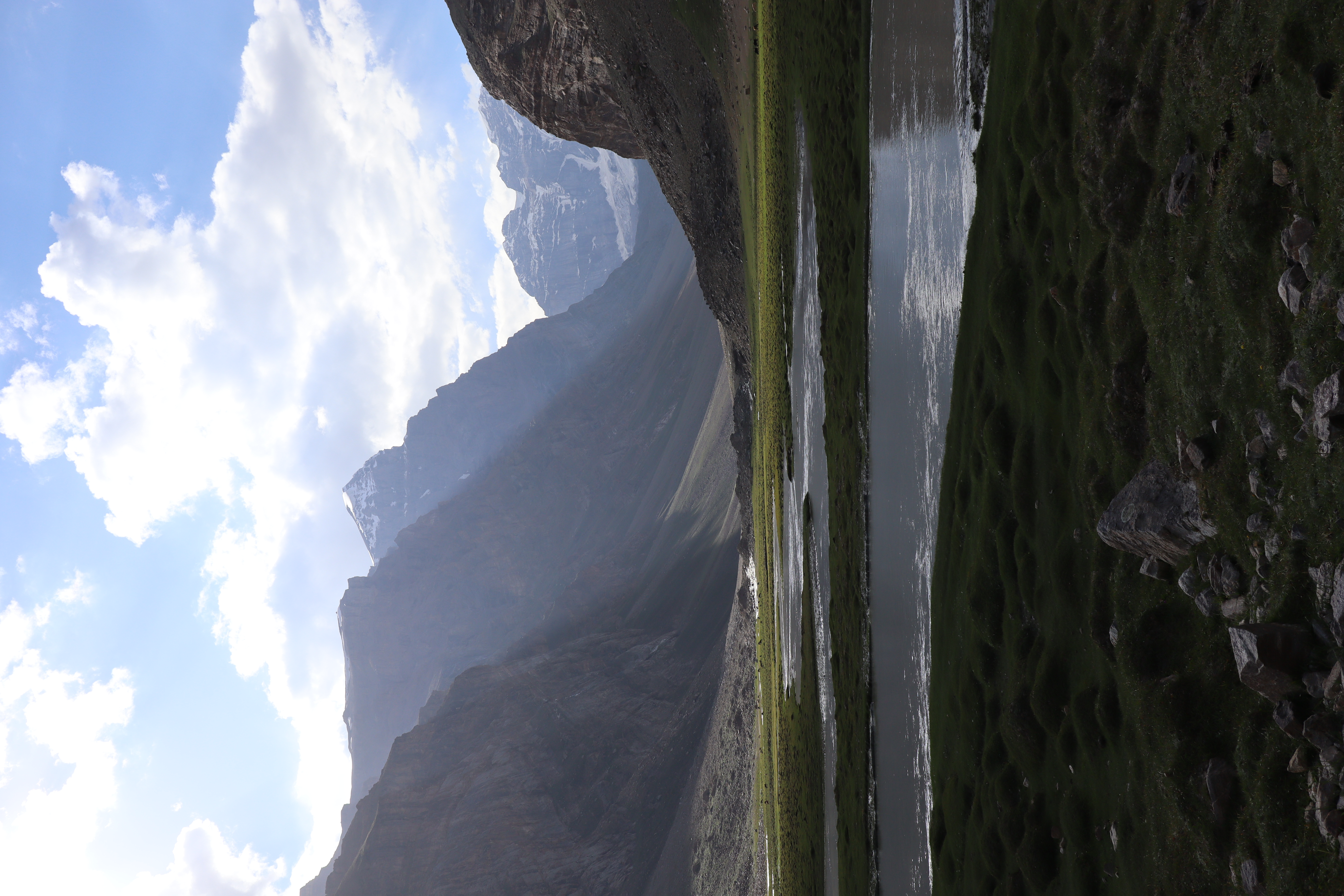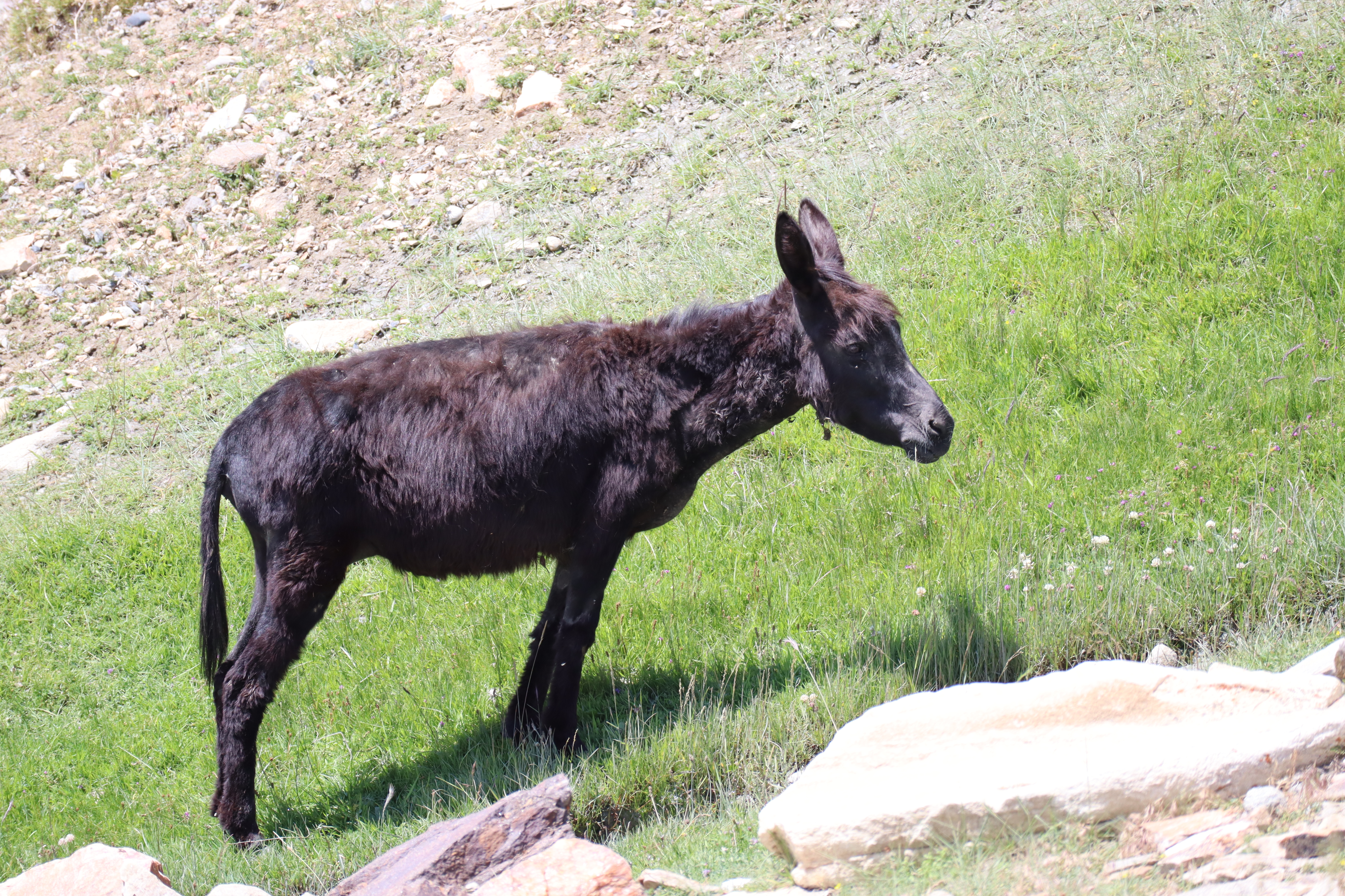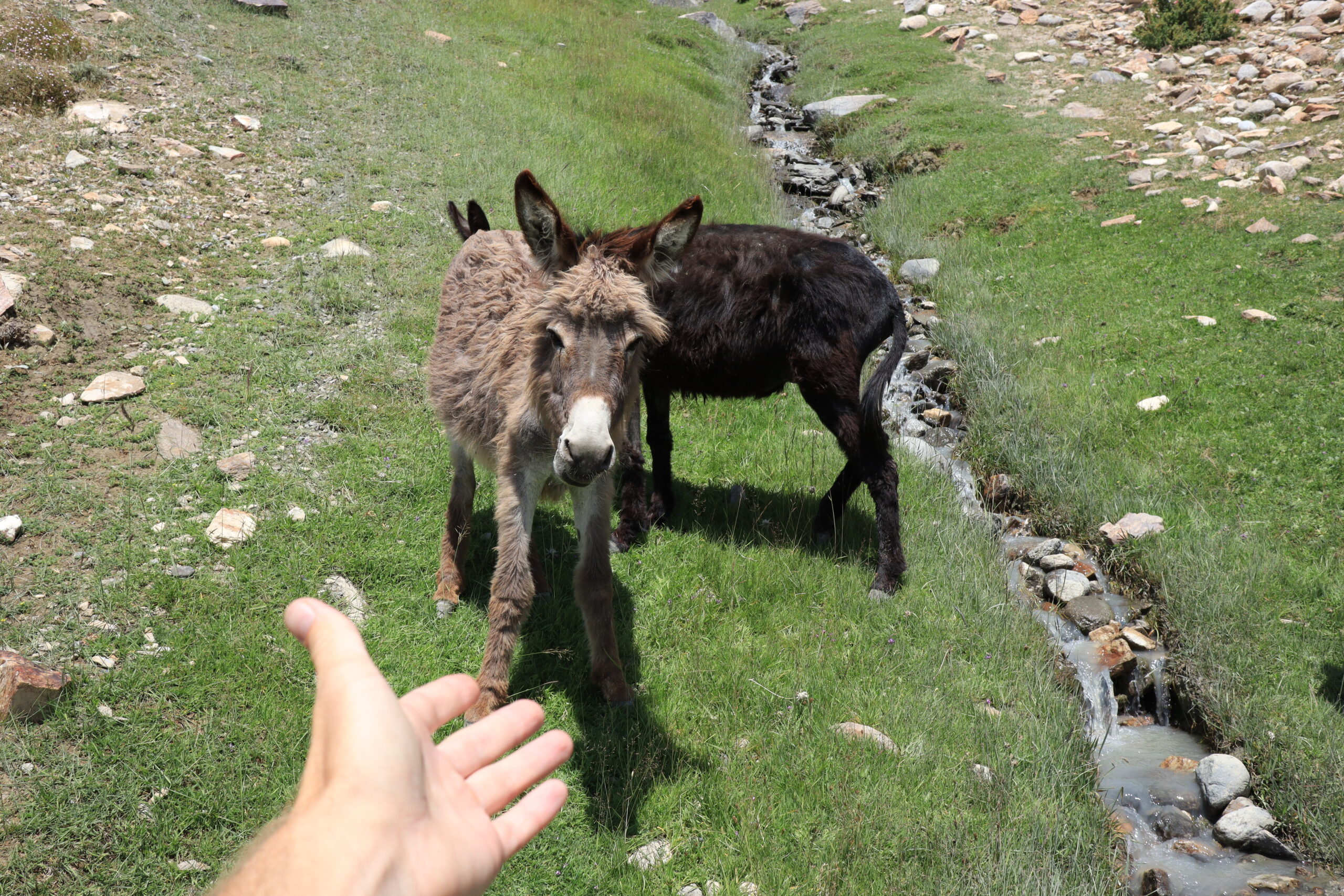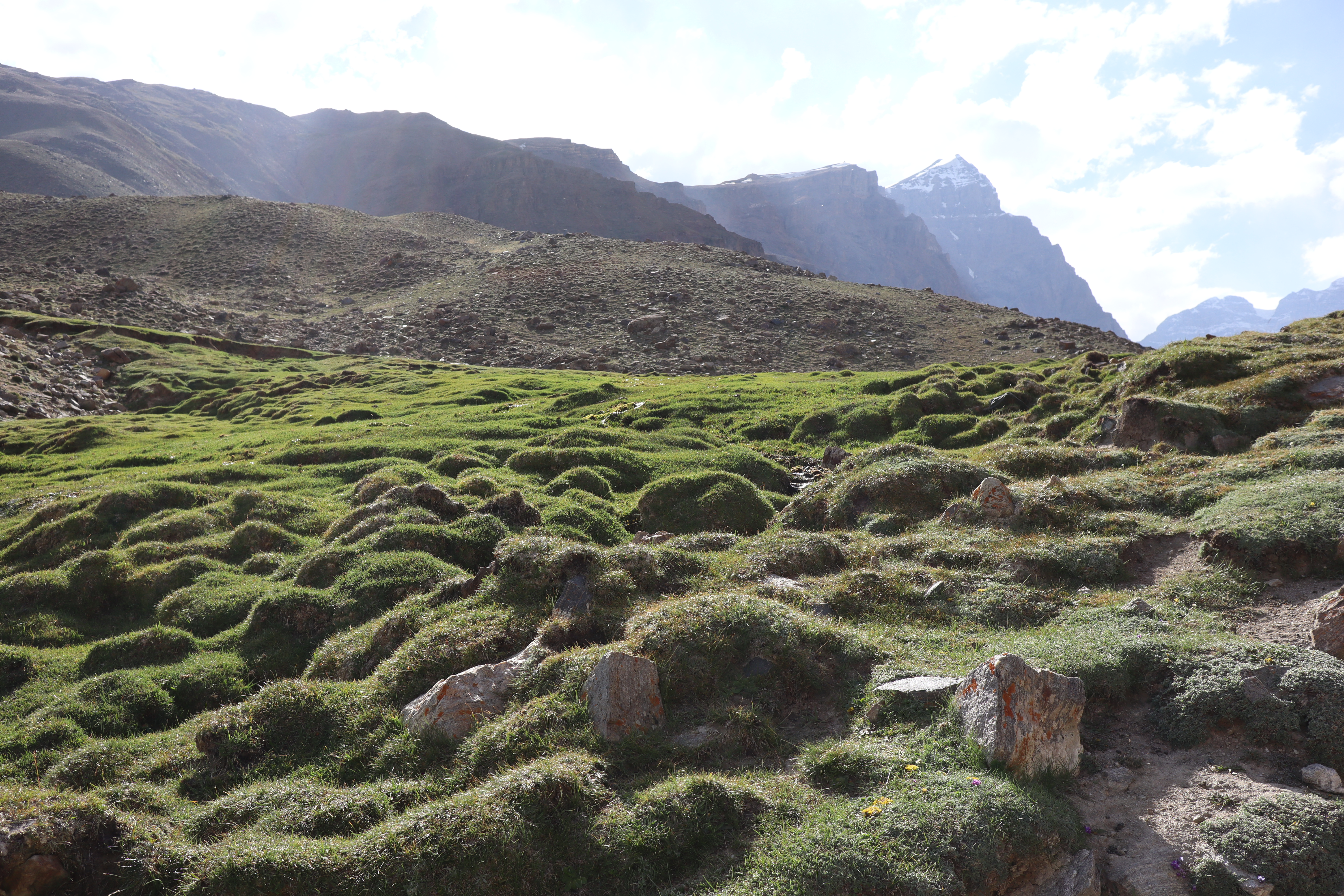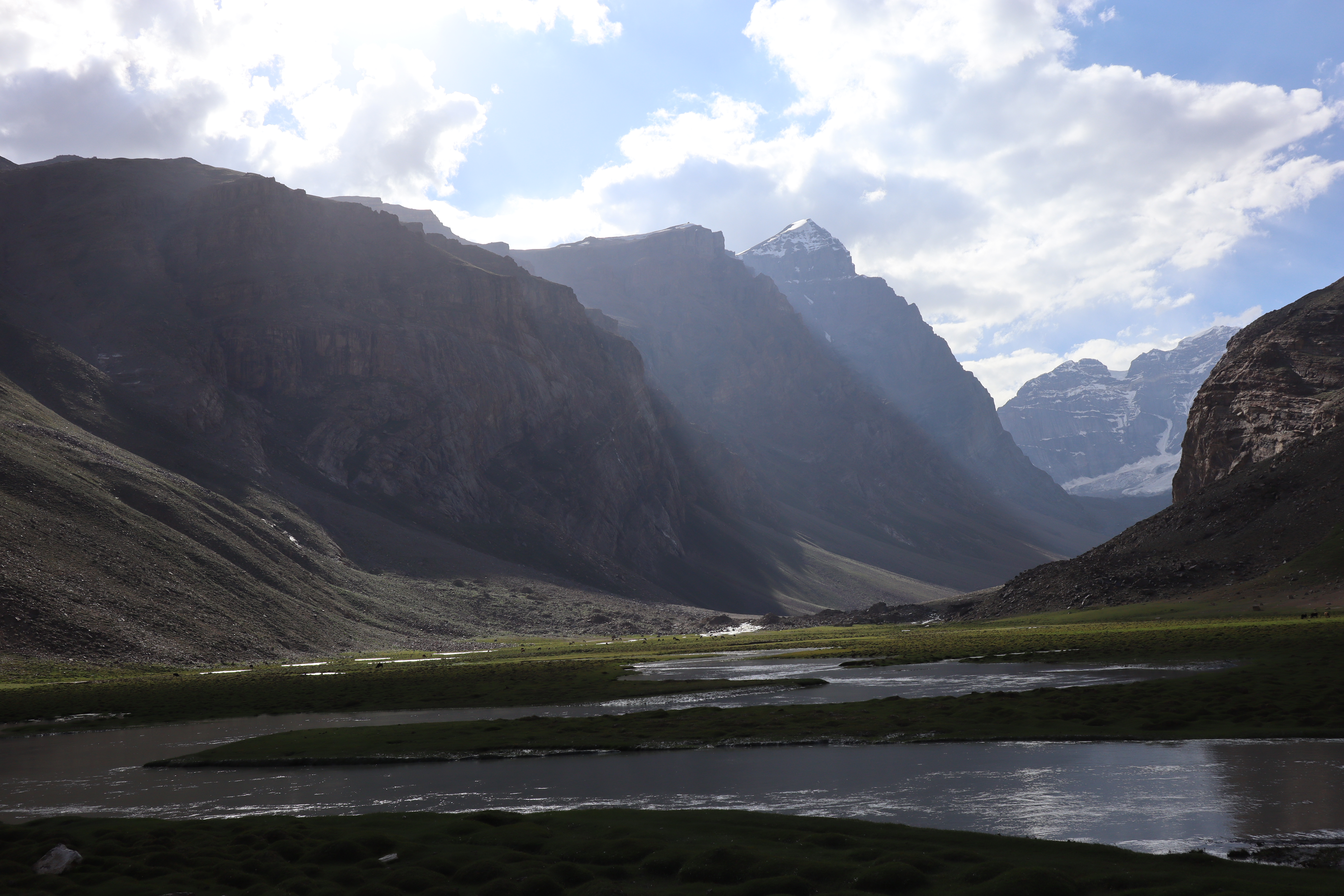Wie geplant begannt der 19.07.2025 früh. Kurz nach Sonnenaufgang schälten wir uns aus unseren Betten und bereiteten uns auf den Aufstieg vor. Jonny ging es immer noch sehr schlecht und würde den Tag im Homestay verbringen. Tatsächchlich wurden wir vom Unterkunftsbetreiber kurz vor Wanderungsbeginn noch gebeten, doch bitte in eine andere Unterkunft zu wechseln, da unser kleines Räumchen für den Abend für eine andere Gruppe gebucht worden war. Durch dieses Missverständnis verloren wir kostbare Zeit am Morgen. Ein wenig verwirrt kamen wir der Aufforderung nach und fanden ein paar Kilometer weiter eine gemütliche Unterkunft für die bevorstehende Nacht. Dann ging es los. Ich hatte mir von Jonny seinen kleinen Rucksack ausgeliehen und nahm nur Kamera, Hut, Mütze, ein paar Snacks und genüged Wasser mit. Mit zwei kleinen Wasserflaschen in jeder Hand, die wir noch zusätzlich erstanden hatten, fuhr uns Nurik bis zum Trailstart, von wo es dann zu Fuß den Berg hinauf zu kraxeln galt. Zu dritt starteten wir den Aufstieg. Da auch Sissi womoglich noch an der Lebensmittelvergiftung litt, war sie etwas langsamer den Bergrücken hinauf unterwegs als Jennifer und ich. Zuerst versuchte ich auf Sissis Tempo zu achten, doch fiel sie immer weiter zurück. Schließlich beschlossen Jennifer und ich unser Tempo zu halten und verloren Sissi bald aus den Augen. Sissi hatte jedoch als Einzige von uns die heutige Wandertour auf ihrem Handy gespeichert und so orientierten wir uns bald einfach nur noch am schmalen Pfad, der vor uns lag. Sissi war hart im Nehmen und wir waren sicher, sie würde den Weg auch ohne uns finden. Außerdem waren wir nicht allein. Auch andere Wanderer waren an diesem Morgen zu den Meadows am Fuße des Engels Pik aufgebrochen. Der Aufstieg war steil und anstrengend. Die Sonne brannte von oben herab und ich war froh meinen Hut mit der großen Krempe auf dem Kopf zu wissen, der mich vor der gröbsten Sonneneinstrahlung schütze. Wir passierten jahrtausende alte Petroglyphen, wovon einige zu modern und hell auf dunklem Stein glänzten, als dass sie wirklich mehrere tausend Jahre alt sein könnten. Ich vermutete ein Streich der lokalen Bevölkerung oder der Touristen. Wir kamen and Eseln vorbei, die an einem kleinen Bachlauf tranken und beobachteten Adler, die nicht weit über uns ihre Kreise zogen. Gegen Mittag erreichten wir eine Weggabelung. Da wir nicht wussten wo der Weg zum Engels Pik entlang führte, keine Beschilderung zu finden war und ebenso keine Personen in der Nähe, die man hätte fragen können, entschieden Jenniffer und ich, einfach die am nächsten gelegene Bergkuppe zu erklimmen, dort zu rasten und von der Erhöhung wieder den Rückweg ins Tal in Angriff zu nehmen – gesagt, getan. In etwa eine Stunde später standen wir an der angepeilten Stelle und schauten ins Tal hinab. Die Aussicht auf das weitläufige Tal und die anliegenden Bergzüge genießend rasteten wir auf exakt 4000 Metern Höhe. Von der Stelle aus an der wir standen, konnte man auf drei Länder gleichzeitig schauen. Afghanistan lag schräg zur Rechten hinter dem ausgedehnten Flusstal in süd-westlicher Richtung. Pakistan lag etwas weiter zur linken Seite, einen Gebirgszug weiter, in Rchtung Süd-Osten. Wir selbst standen in Tadschikistan. Der Anblick war atemberaubend schön und schroff. Lange konnten wir allerdings nicht rasten, da ein stetig-kühler Wind wehte und uns bald auskühlte. So kraxelten wir die Bergkuppe wieder hinab bis zu der Stelle, an der wir nicht weiter gewusst hatten. Dort trafen wir dieses mal tatsächlich auf andere Wanderer, von denen wir erfuhren, dass wir zum Engels Pik rechts, anstatt links hätten abbiegen müssen. Während Jennifer entschied den Abstieg weiter fortzusetzen, beschloss ich die Route bis zu den grünen, saftigen Hügeln des Engels Pik wie geplant weiter zu verfolgen. Dies bedeutete zusätzliche zehn bis fünfzehn Kilometer für mich. Aber ich würde mich nicht lumpen lassen. Nun ganz auf mich allein gestellt, schlug ich ein scharfes Tempo an, denn es war bereits spät. Auf halbem Wege zu den Meadows kam mir Sissi in Begleitung zweier Franzosen entgegen, auf die wir bereits in Khorog getroffen waren. Kurz tauschten wir uns aus, dann ging es fluchs weiter. Langsam aber sicher machten sich die Muskeln in meinen Beinen bemerkbar. Ich hatte nur noch wenig Wasser und ich musste mit dieser Recource haushalten. Kurz vor 18:00 Uhr erreichte ich die Hochebene mit Blick auf den Engels Pik. Leider war es zu spät, um noch bis zum See selbst vorzudringen, was weitere Kilometer bedeutet hätte. Außerdem war ich vom vorherigen Aufstieg mit Jennifer zur Bergkuppe mehr erschöpft, als ich mir eingestehen wollte. Ausgepowert und kraftlos suchte ich mir eine Stelle wo ich verschnaufen konnte und bewunderte das Lichtspiel auf dem Bergfluss, der die letzten Sonnenstrahlen des Tages einfing. Ich war froh es doch noch bis hierhin geschafft zu haben. Fluchs zückte ich meine Kamera und schoss ein paar Bilder, bevor ich sie wieder wegsteckte und den Moment genoss. Fast ganz alleine befand ich mich in einer abgelegenen Bergregion in Tadschikistan. Nur ein paar Kühe und Ziegen grasten am Fluss, die alsbald von zwei Hirten in Richtung See getrieben wurden. Während die Sonne langsam hinter den Bergen verschwand, wurde es schnell deutlich kühler. Bis zu dem Platz an dem ich nun Rast gemacht hatte, war ich knapp neun Stunden unterwegs gewesen. Nun galt es die gesamte Strecke bis ins Tal wieder zurück zu wandern. Gott sei Dank werden beim Aufstieg und beim Abstieg unterschiedliche Muskelgruppen in den Beinen angesprochen und so sprintete ich innerhalb von zwei Stunden bis zurück zum Startpunkt. Dort wartete bereits Nurik auf mich, mit dem ich zusammen zurück zur Unterkunft fuhr. Nun völlig ausgelaugt freute ich mich aufs hoffentlich reichhaltige Abendessen, nach welchem ich auf einen erholsamen Schlaf hoffte.