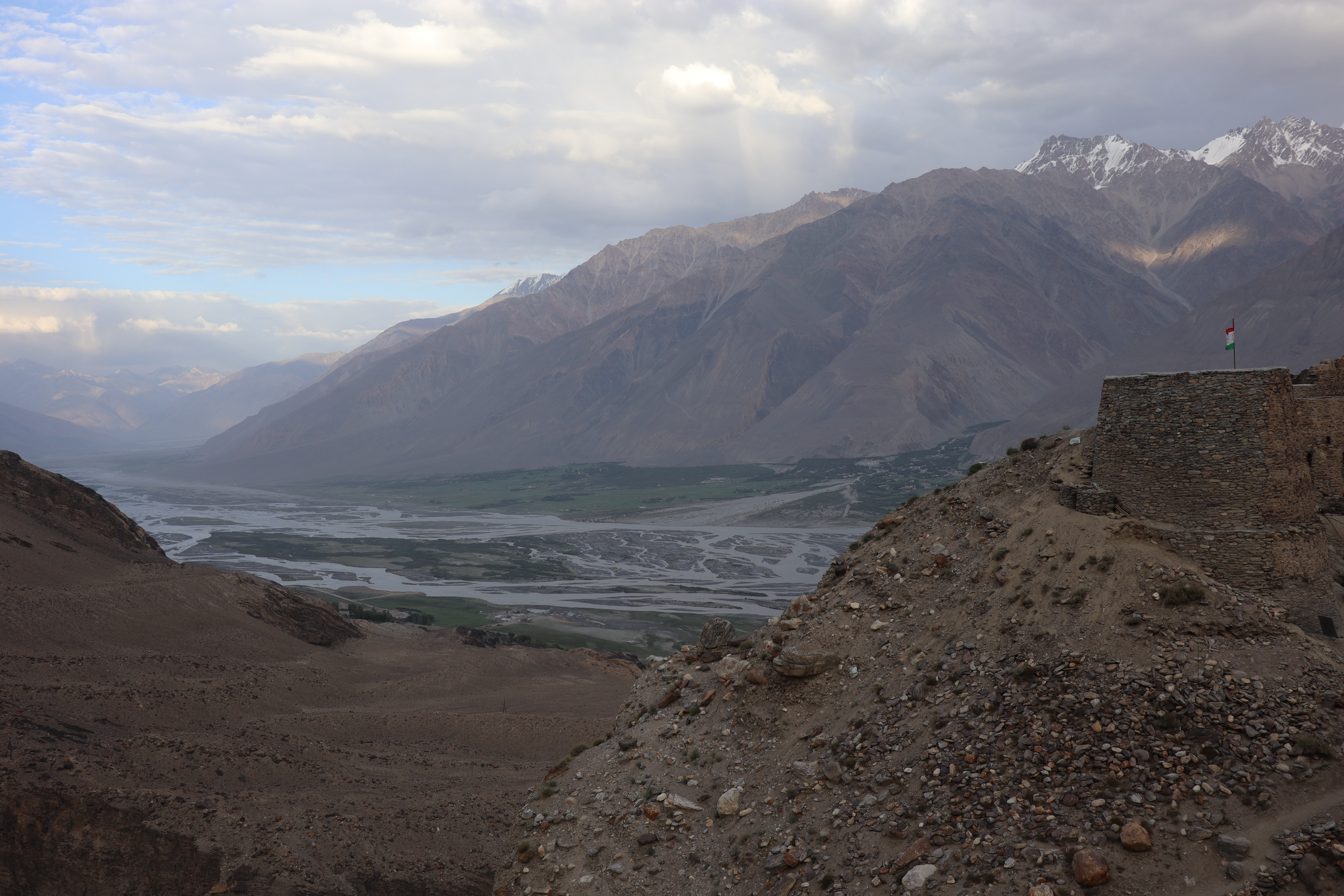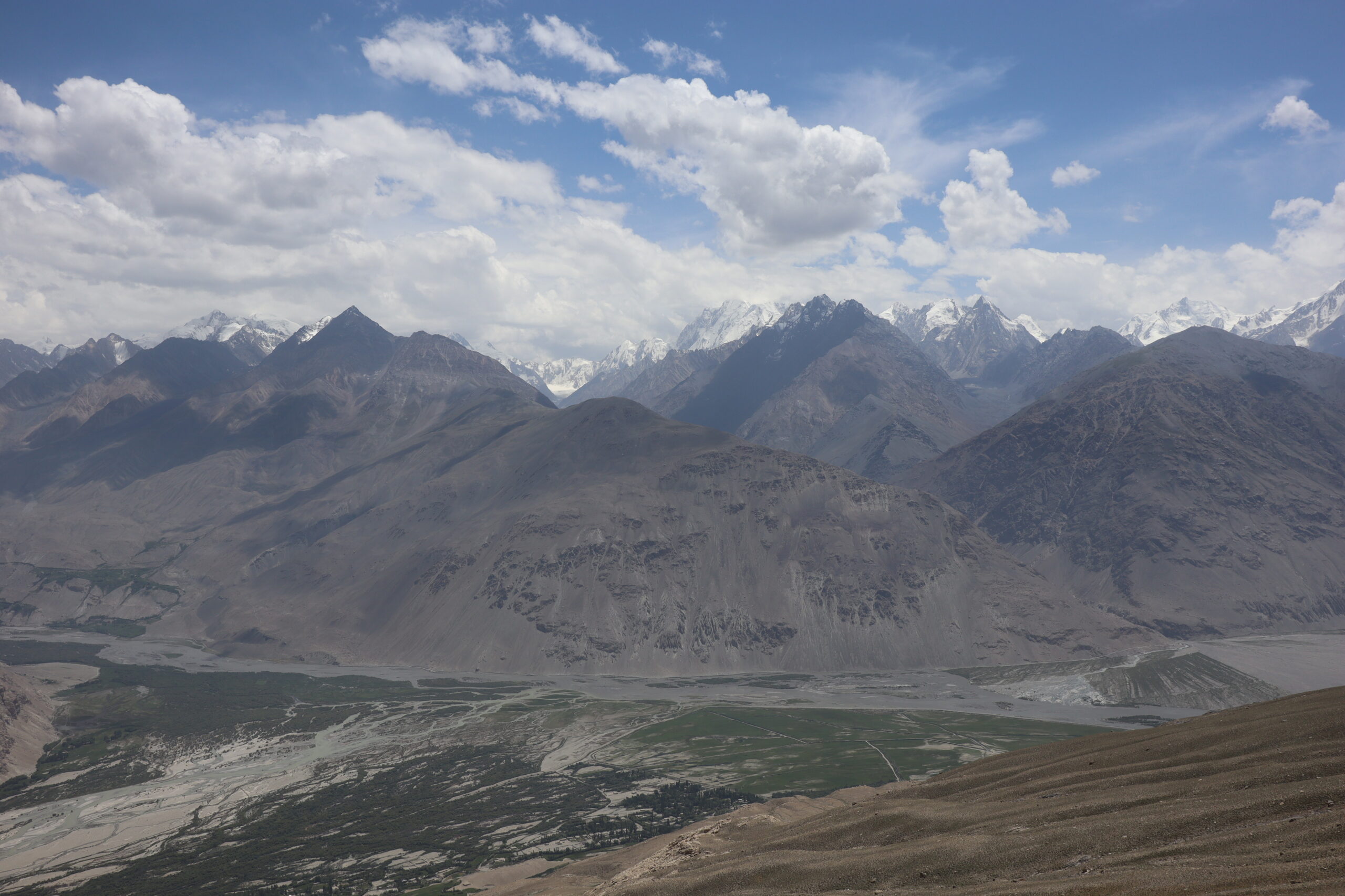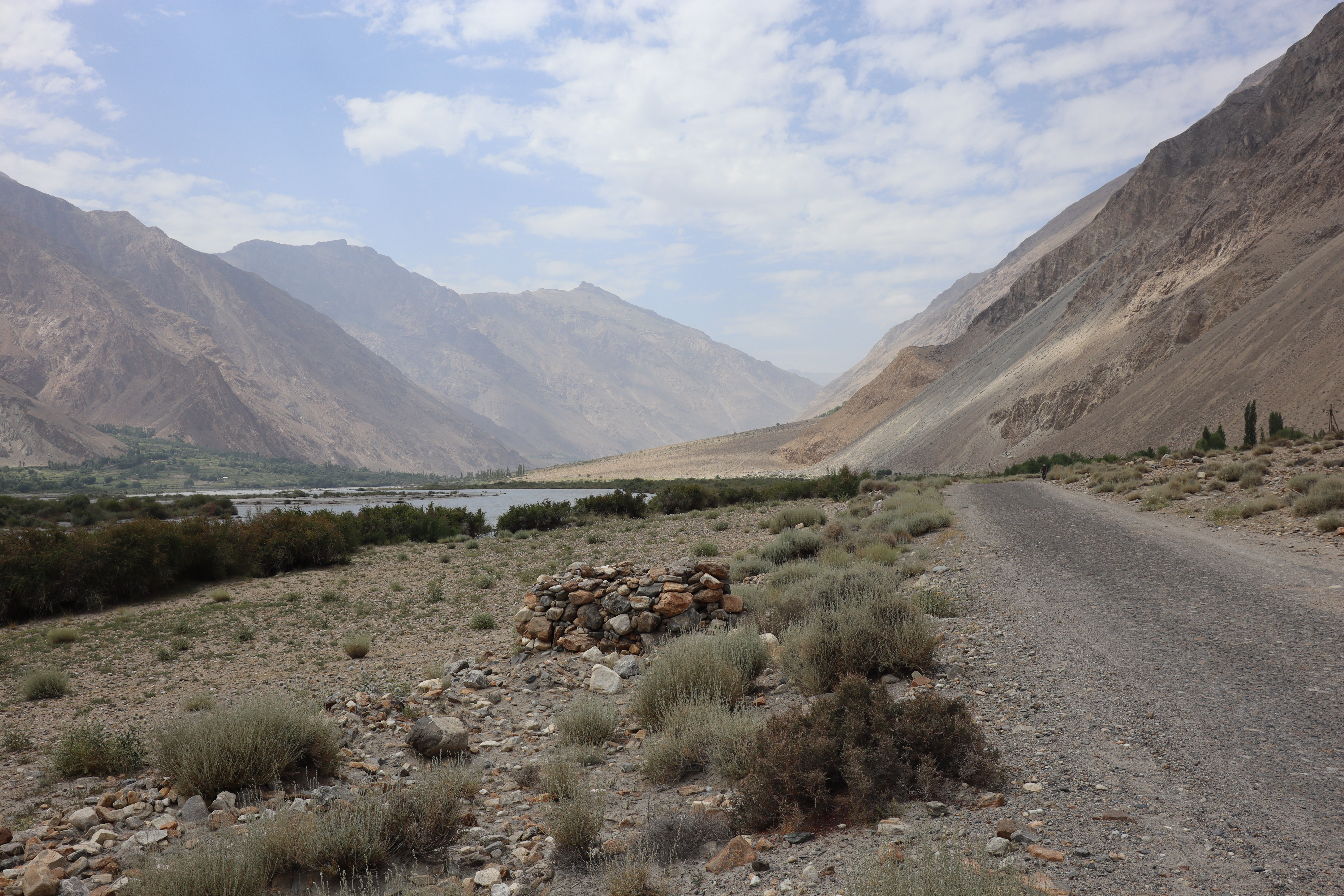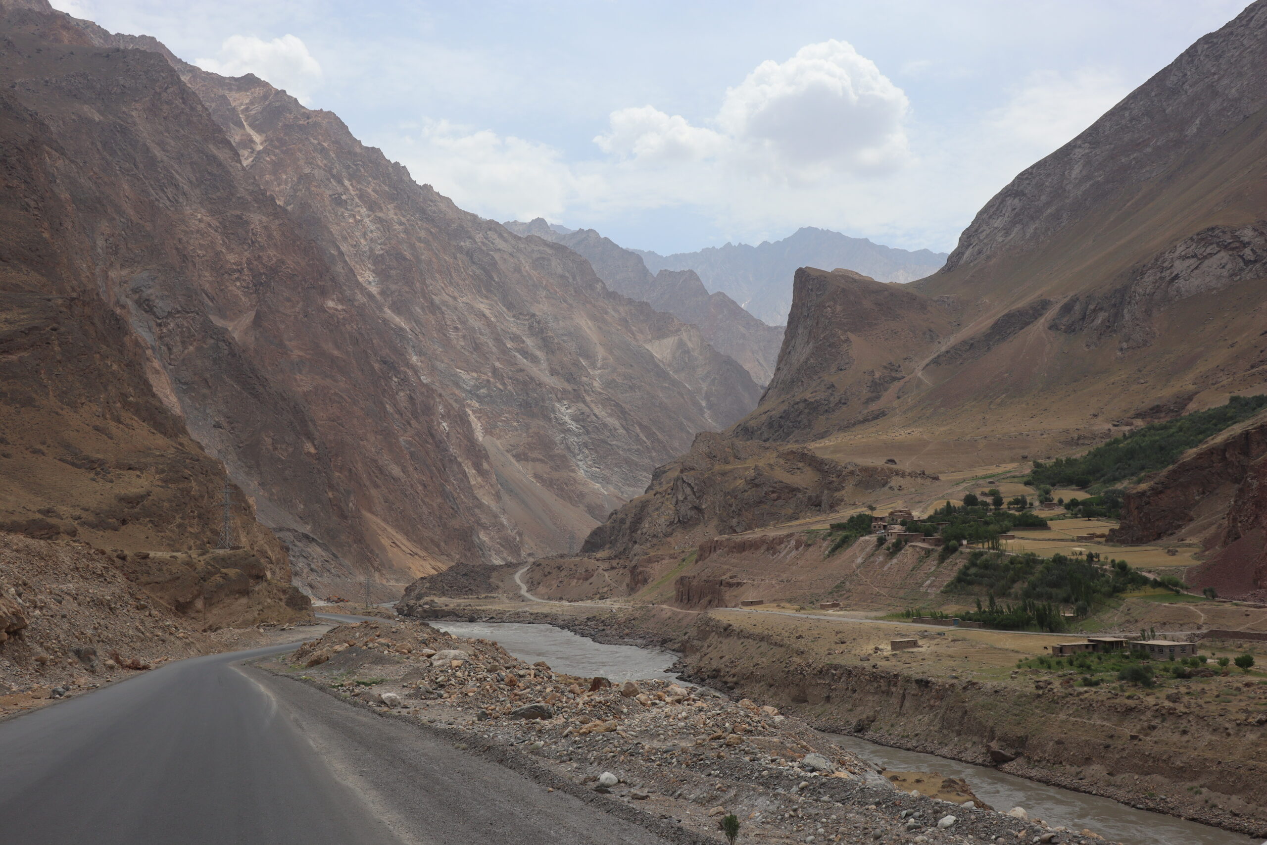 Der Morgen des 18.07.2025 startete mit einem Besuch im Krankenhaus. Jonathan hatte die Lebensmittelvergiftung über die Nacht hart getroffen und nun fieberte er und brauchte dringend Hilfe. Auf der Suche nach einem Arzt und Arznei fuhren wir nach dem Frühstück mit Jonny ins Krankenhaus und erneuerten gleichzeitig auf dem Markt unseren Vorrat an Bananen. Bananen hatten sich als äußerst hilfreich erwiesen, wenn es um Individuen ging, die an einer Lebensmittelvergiftung litten. Sie waren nahrhaft, leicht verträglich und stopften. Nachdem Jonny sein Antibiotikum erhalten hatte, setzten wir unsere Reise fort. Anstatt jedoch wie die meisten Reisenden dem Pamir Highway durch das Innere des Landes zu folgen, verließen wir die zentral gelegenen Bergemassive Tadschikistans und schlugen eine andere, südlichere Richtung ein. Auf der nördlichen Seite des Flusses Panj oder auch Pandsch steuerten wir den Wakhan Korridor an und folgen dem Panj immer weiter Flussaufwärts. Der Fluss bildete die natürliche Grenze zwischen Afghanistan und Tadschikistan und wir trafen auf viele Militärpatroullien und wurden häufig angehalten und kontrolliert. Die Mitglieder des Militärs waren häufig sehr jung und wenn sie mit ihrer AK-47, dem Maschinengewehr oder ihrer Sniperrifle am Fluss entlangschritten konnte man die Anspannung zwischen den zwei Ländern spüren. Wenn nicht patroulliert wurde, wurde an einem Abwehrzaun am Fluss oder an Schutzwällen aus Stein gearbeitet. Nur langsam kamen wir auf der schlecht befestigten Schotterstraße voran, während links und rechts von uns mächtige Berge zum Himmel empor ragten. Manchmal konnten wir auf der afghanischen Seite ein Bauerndorf mit emsigen Menschen ausmachen und manchmal eine Ansiedlung von Gerätschaften und kleinen Hütten, die dem Goldschürfen gewidmet waren. Wir hatten gehört, dass das Schürfen von Gold im Interesse der Taliban lag, um ihren Einfluss im Land Afghanistan zu festigen. Über einhundert Kilometer folgten wir mit dem Geländewagen der Straße dem Fluss entlang, kamen an zwei alten Burgen aus dem zwölften Jahrhundert vorbei – Ishkashim und Yamchun Fortress – und bewunderten die atemberaubende, sich vor uns stetig wandelnde, fast außerirdisch anmutende Landschaft. Zum Abschluss des Tages besuchten wir die Bibi Fatima Hot Springs. Die Sonne war bereits hinter den Bergen verschwunden und es wurde langsam dunkel. Dies hielt uns aber nicht davon ab, in die heißen Quellen einzutauchen und den Staub des Tages abzuwaschen und einen Moment der Ruhe zu genießen, in dem man nicht im Wagen hin und her geschleudert wurde. Im Schutze der Nacht erreichten wir das Dorf Langer auf 2900 Metern, verschlangen eine leckere Gemüsesuppe mit Brot und gingen danach recht zügig zu Bett, denn die anstehende Wanderung am fünften Tag der Pamir Highwaytour würde anstrengend werden.