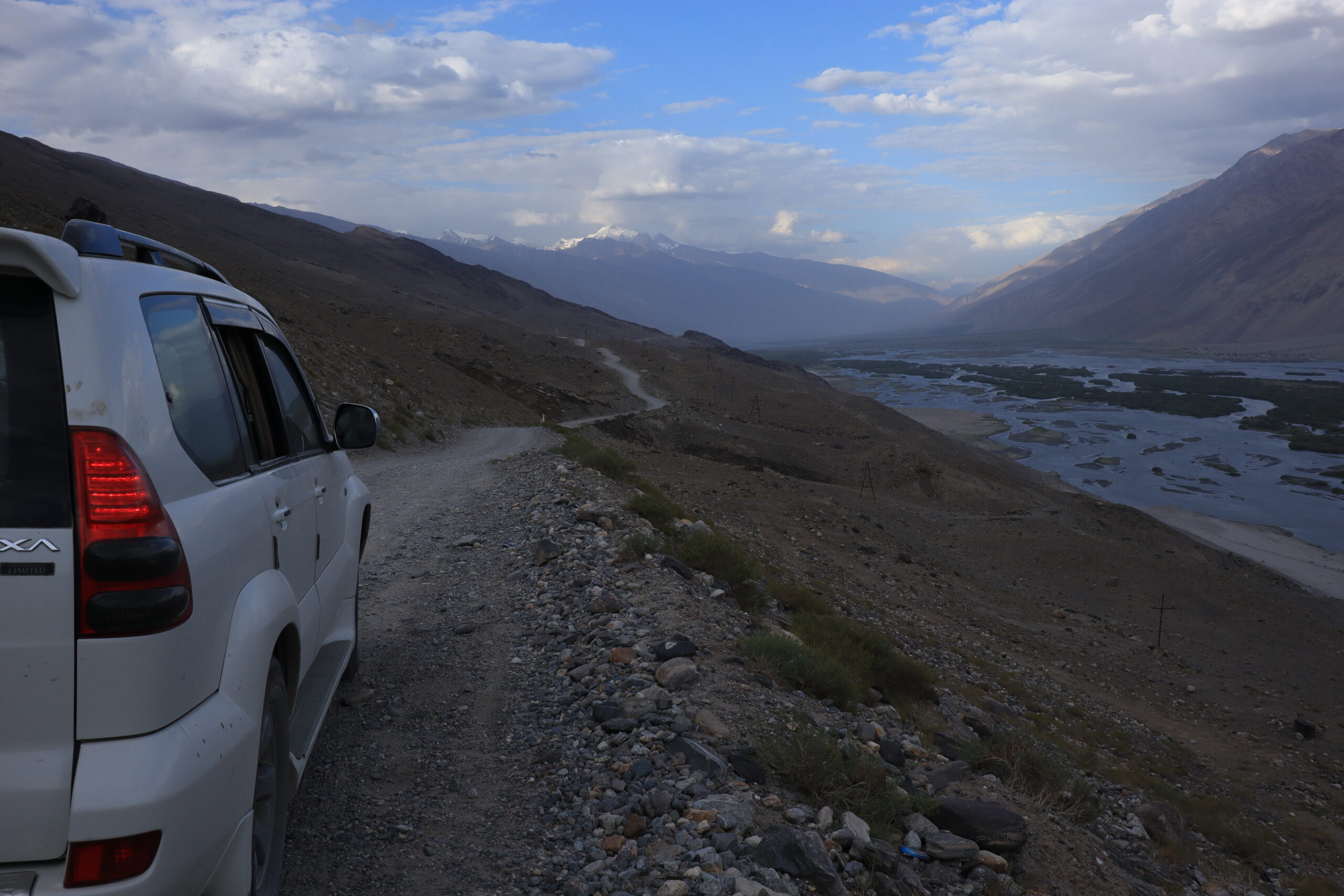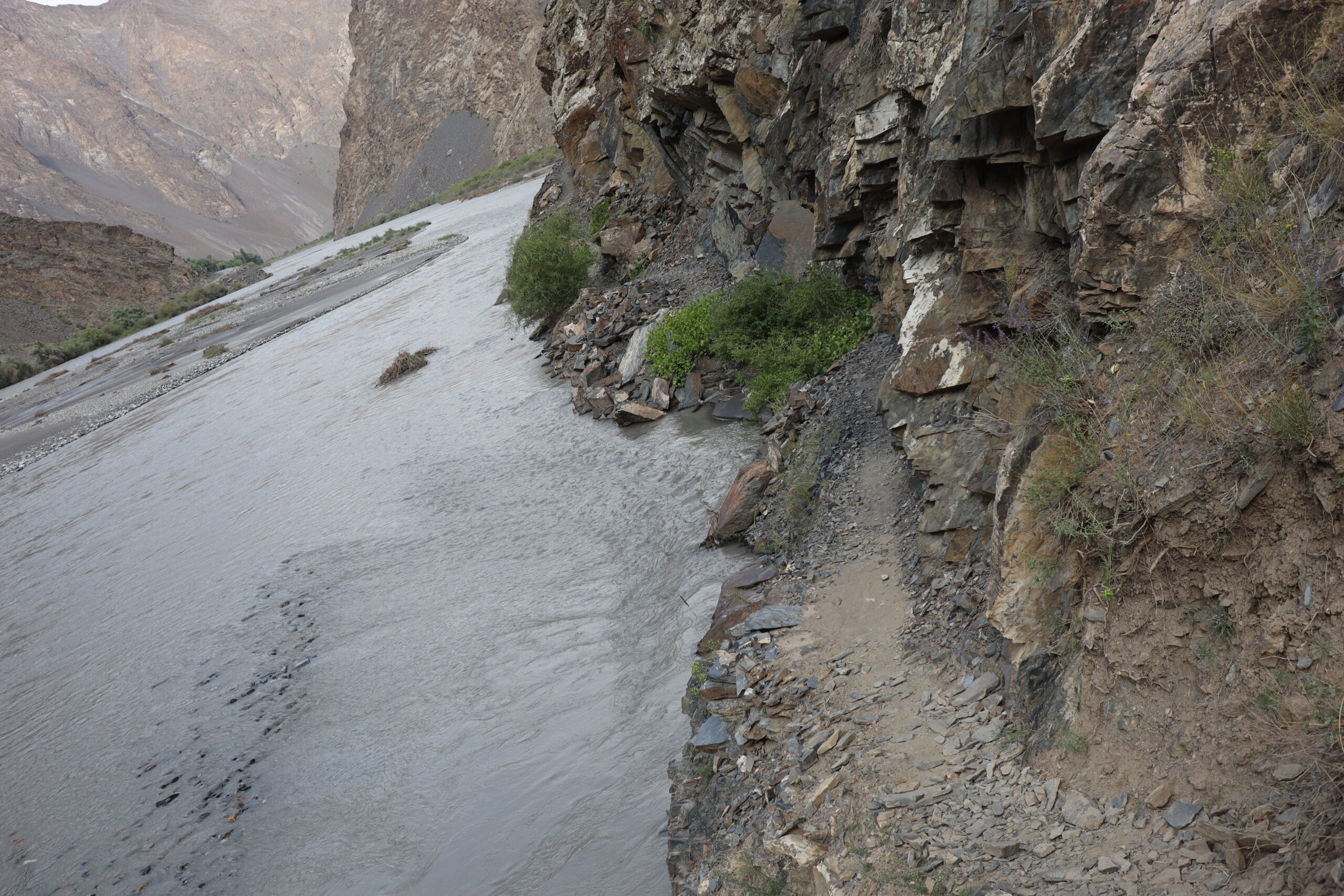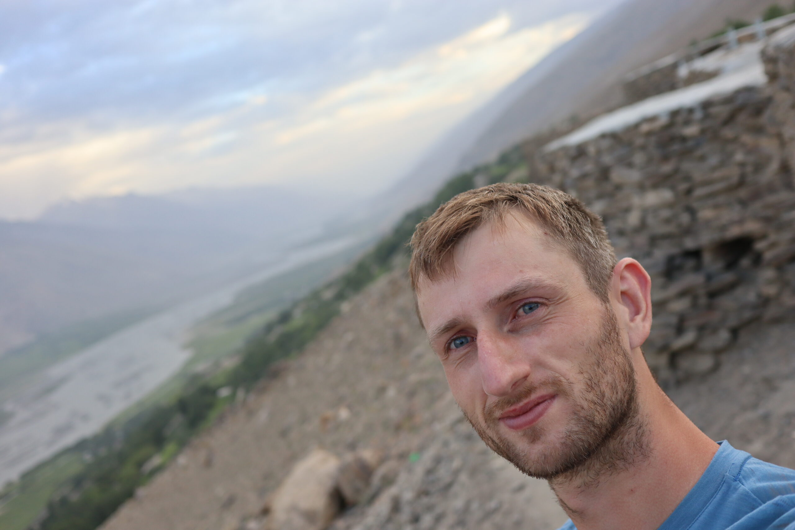 Der Morgen des 18.07.2025 startete mit einem Besuch im Krankenhaus. Jonathan hatte die Lebensmittelvergiftung über die Nacht hart getroffen und nun fieberte er und brauchte dringend Hilfe. Auf der Suche nach einem Arzt und Arznei fuhren wir nach dem Frühstück mit Jonny ins Krankenhaus und erneuerten gleichzeitig auf dem Markt unseren Vorrat an Bananen. Bananen hatten sich als äußerst hilfreich erwiesen, wenn es um Individuen ging, die an einer Lebensmittelvergiftung litten. Sie waren nahrhaft, leicht verträglich und stopften. Nachdem Jonny sein Antibiotikum erhalten hatte, setzten wir unsere Reise fort. Anstatt jedoch wie die meisten Reisenden dem Pamir Highway durch das Innere des Landes zu folgen, verließen wir die zentral gelegenen Bergemassive Tadschikistans und schlugen eine andere, südlichere Richtung ein. Auf der nördlichen Seite des Flusses Panj oder auch Pandsch steuerten wir den Wakhan Korridor an und folgen dem Panj immer weiter Flussaufwärts. Der Fluss bildete die natürliche Grenze zwischen Afghanistan und Tadschikistan und wir trafen auf viele Militärpatroullien und wurden häufig angehalten und kontrolliert. Die Mitglieder des Militärs waren häufig sehr jung und wenn sie mit ihrer AK-47, dem Maschinengewehr oder ihrer Sniperrifle am Fluss entlangschritten konnte man die Anspannung zwischen den zwei Ländern spüren. Wenn nicht patroulliert wurde, wurde an einem Abwehrzaun am Fluss oder an Schutzwällen aus Stein gearbeitet. Nur langsam kamen wir auf der schlecht befestigten Schotterstraße voran, während links und rechts von uns mächtige Berge zum Himmel empor ragten. Manchmal konnten wir auf der afghanischen Seite ein Bauerndorf mit emsigen Menschen ausmachen und manchmal eine Ansiedlung von Gerätschaften und kleinen Hütten, die dem Goldschürfen gewidmet waren. Wir hatten gehört, dass das Schürfen von Gold im Interesse der Taliban lag, um ihren Einfluss im Land Afghanistan zu festigen. Über einhundert Kilometer folgten wir mit dem Geländewagen der Straße dem Fluss entlang, kamen an zwei alten Burgen aus dem zwölften Jahrhundert vorbei – Ishkashim und Yamchun Fortress – und bewunderten die atemberaubende, sich vor uns stetig wandelnde, fast außerirdisch anmutende Landschaft. Zum Abschluss des Tages besuchten wir die Bibi Fatima Hot Springs. Die Sonne war bereits hinter den Bergen verschwunden und es wurde langsam dunkel. Dies hielt uns aber nicht davon ab, in die heißen Quellen einzutauchen und den Staub des Tages abzuwaschen und einen Moment der Ruhe zu genießen, in dem man nicht im Wagen hin und her geschleudert wurde. Im Schutze der Nacht erreichten wir das Dorf Langer auf 2900 Metern, verschlangen eine leckere Gemüsesuppe mit Brot und gingen danach recht zügig zu Bett, denn die anstehende Wanderung am fünften Tag der Pamir Highwaytour würde anstrengend werden.