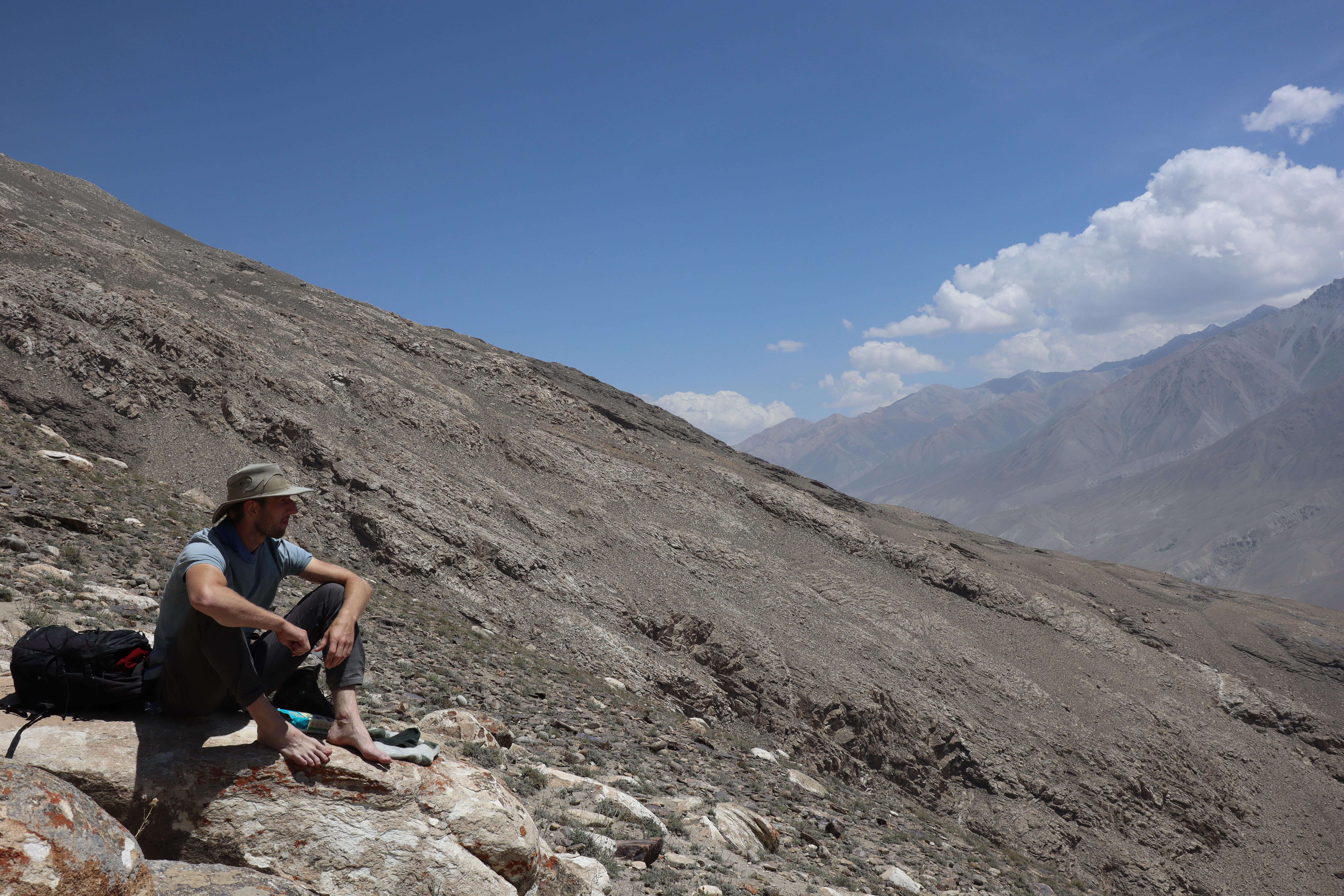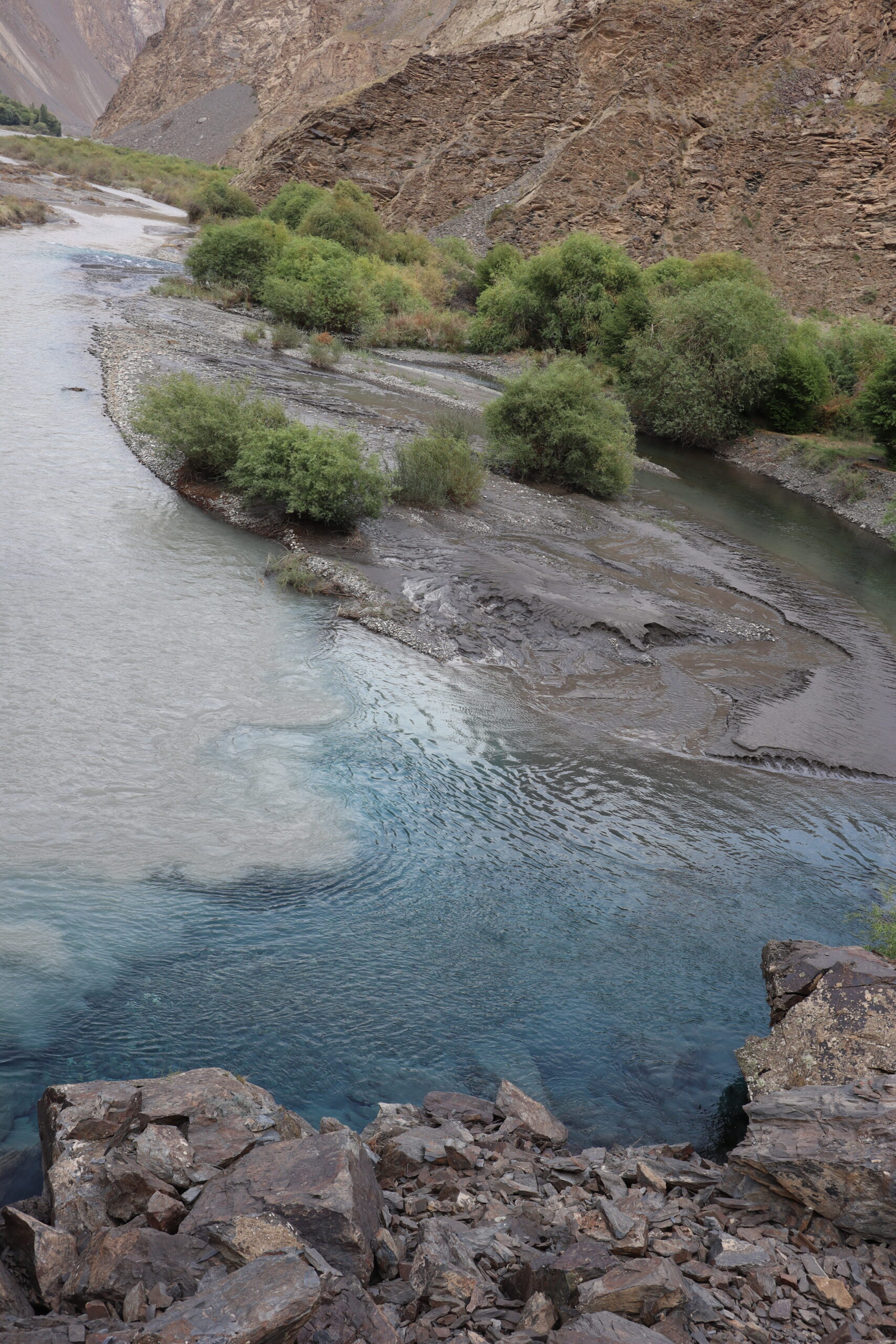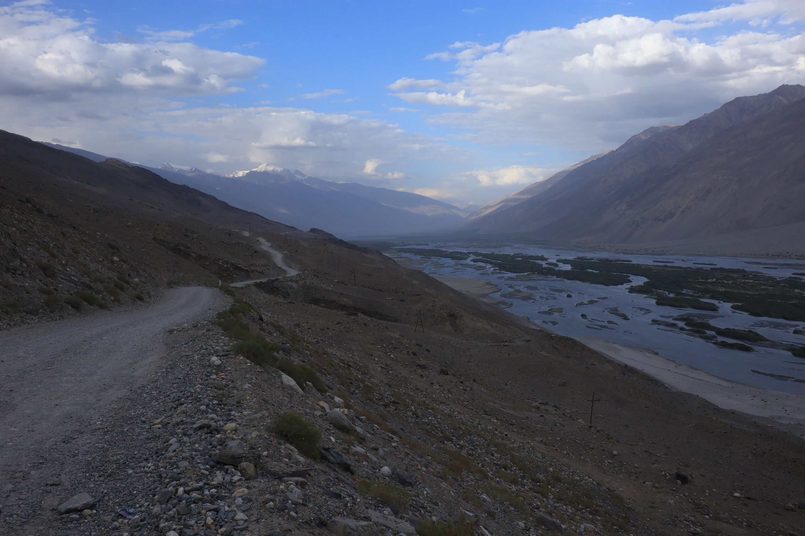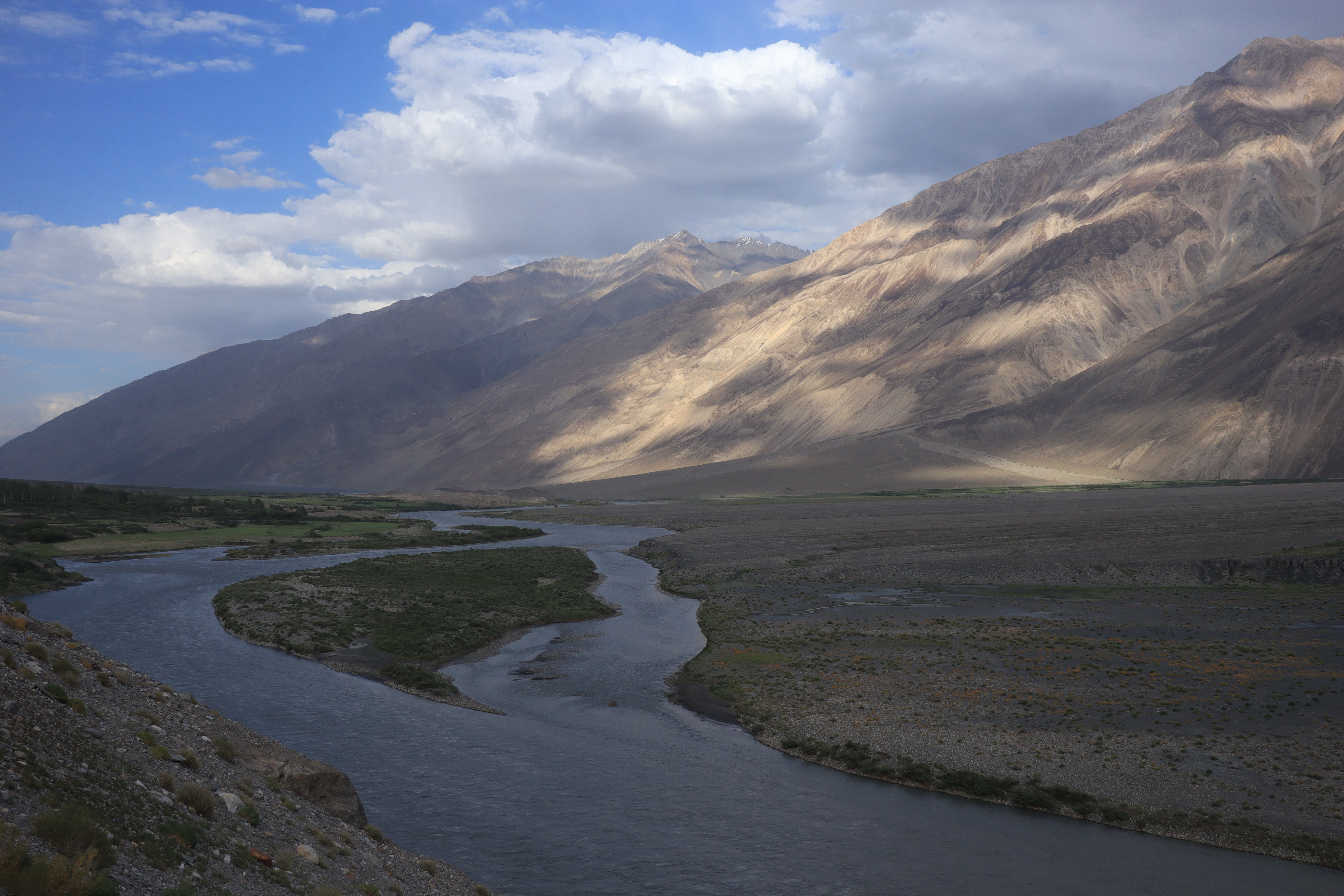 Der Morgen des 18.07.2025 startete mit einem Besuch im Krankenhaus. Jonathan hatte die Lebensmittelvergiftung über die Nacht hart getroffen und nun fieberte er und brauchte dringend Hilfe. Auf der Suche nach einem Arzt und Arznei fuhren wir nach dem Frühstück mit Jonny ins Krankenhaus und erneuerten gleichzeitig auf dem Markt unseren Vorrat an Bananen. Bananen hatten sich als äußerst hilfreich erwiesen, wenn es um Individuen ging, die an einer Lebensmittelvergiftung litten. Sie waren nahrhaft, leicht verträglich und stopften. Nachdem Jonny sein Antibiotikum erhalten hatte, setzten wir unsere Reise fort. Anstatt jedoch wie die meisten Reisenden dem Pamir Highway durch das Innere des Landes zu folgen, verließen wir die zentral gelegenen Bergemassive Tadschikistans und schlugen eine andere, südlichere Richtung ein. Auf der nördlichen Seite des Flusses Panj oder auch Pandsch steuerten wir den Wakhan Korridor an und folgen dem Panj immer weiter Flussaufwärts. Der Fluss bildete die natürliche Grenze zwischen Afghanistan und Tadschikistan und wir trafen auf viele Militärpatroullien und wurden häufig angehalten und kontrolliert. Die Mitglieder des Militärs waren häufig sehr jung und wenn sie mit ihrer AK-47, dem Maschinengewehr oder ihrer Sniperrifle am Fluss entlangschritten konnte man die Anspannung zwischen den zwei Ländern spüren. Wenn nicht patroulliert wurde, wurde an einem Abwehrzaun am Fluss oder an Schutzwällen aus Stein gearbeitet. Nur langsam kamen wir auf der schlecht befestigten Schotterstraße voran, während links und rechts von uns mächtige Berge zum Himmel empor ragten. Manchmal konnten wir auf der afghanischen Seite ein Bauerndorf mit emsigen Menschen ausmachen und manchmal eine Ansiedlung von Gerätschaften und kleinen Hütten, die dem Goldschürfen gewidmet waren. Wir hatten gehört, dass das Schürfen von Gold im Interesse der Taliban lag, um ihren Einfluss im Land Afghanistan zu festigen. Über einhundert Kilometer folgten wir mit dem Geländewagen der Straße dem Fluss entlang, kamen an zwei alten Burgen aus dem zwölften Jahrhundert vorbei – Ishkashim und Yamchun Fortress – und bewunderten die atemberaubende, sich vor uns stetig wandelnde, fast außerirdisch anmutende Landschaft. Zum Abschluss des Tages besuchten wir die Bibi Fatima Hot Springs. Die Sonne war bereits hinter den Bergen verschwunden und es wurde langsam dunkel. Dies hielt uns aber nicht davon ab, in die heißen Quellen einzutauchen und den Staub des Tages abzuwaschen und einen Moment der Ruhe zu genießen, in dem man nicht im Wagen hin und her geschleudert wurde. Im Schutze der Nacht erreichten wir das Dorf Langer auf 2900 Metern, verschlangen eine leckere Gemüsesuppe mit Brot und gingen danach recht zügig zu Bett, denn die anstehende Wanderung am fünften Tag der Pamir Highwaytour würde anstrengend werden.