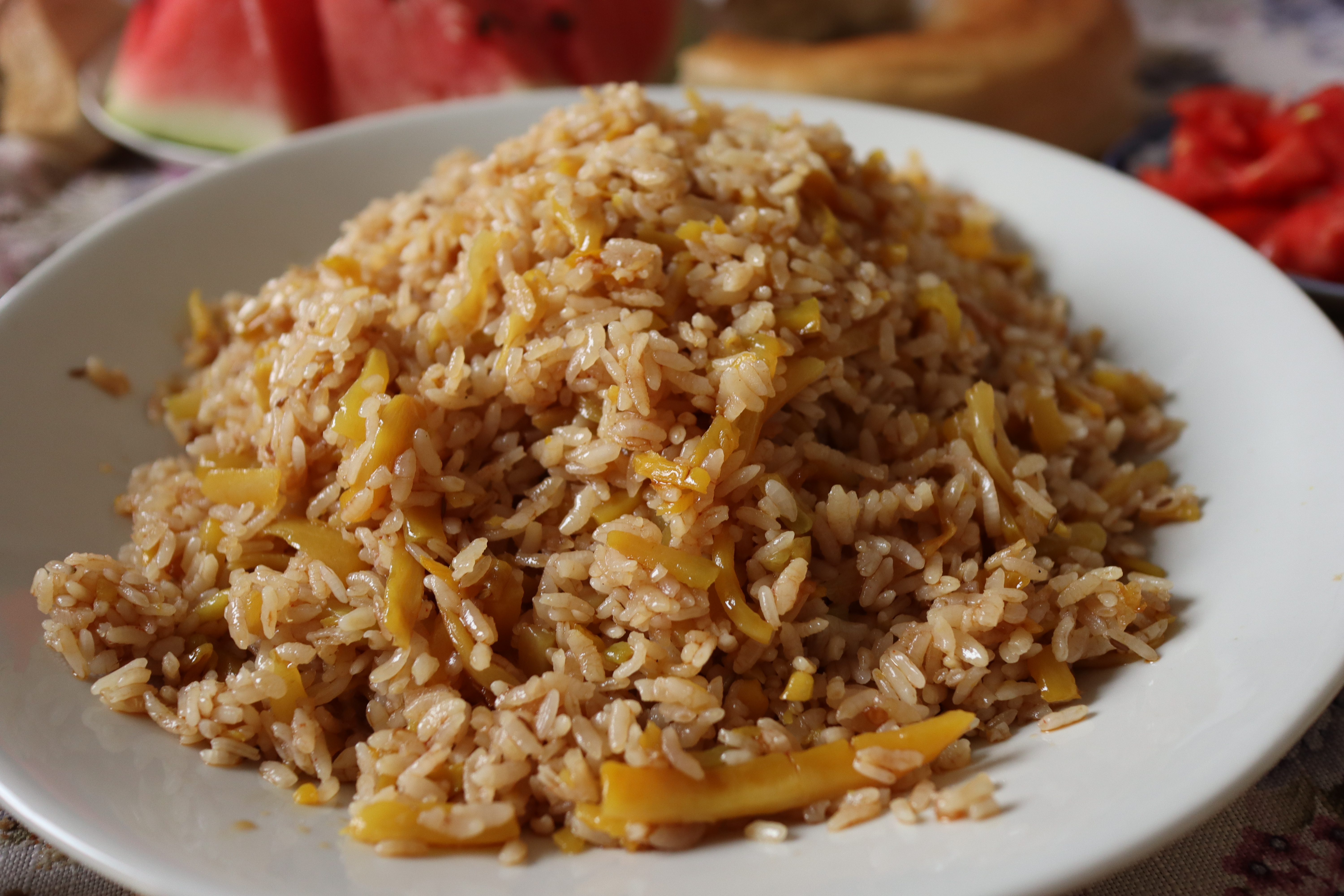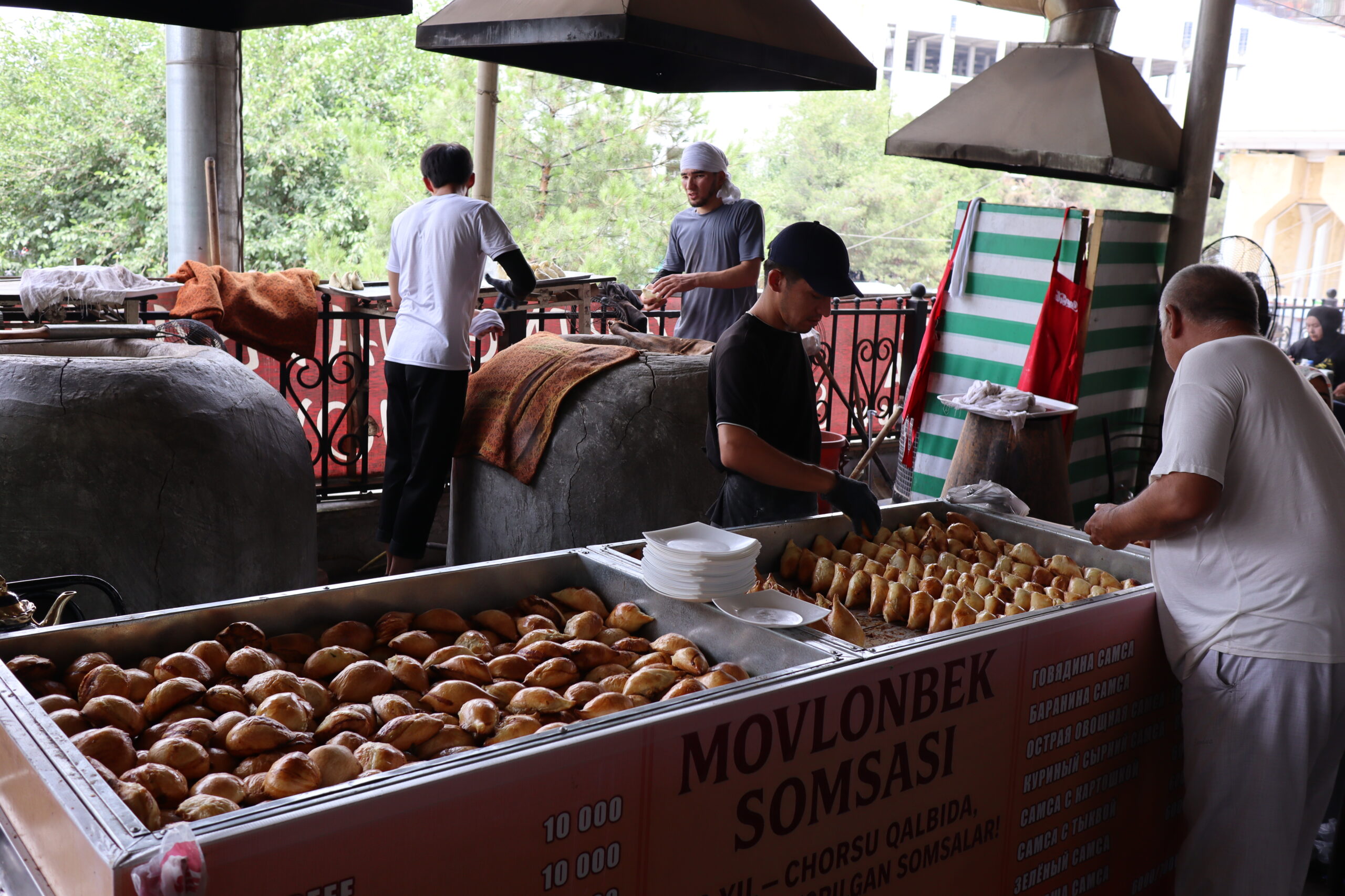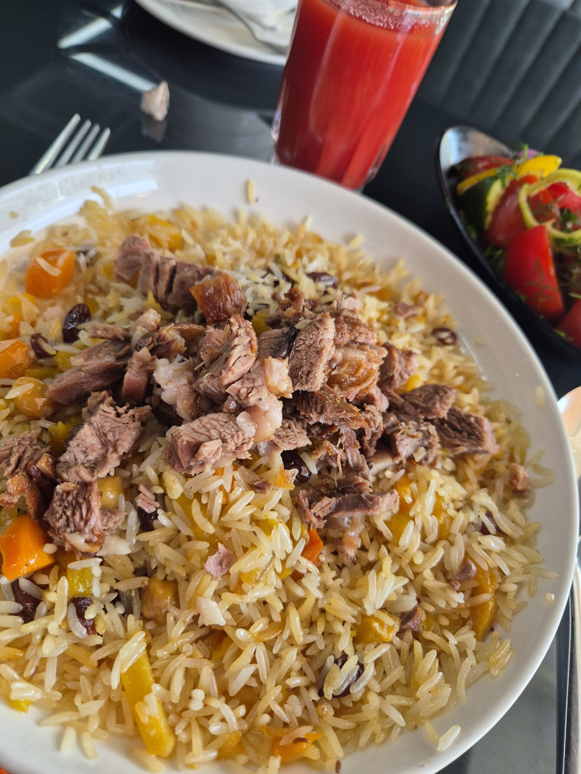 Als ich am Abend des 08.07.2025 zu Artem in die Wohnung zurückkehrte, fragte er mich, ob ich mich denn bereits registriert habe. „Wie registriert?“ fragte ich plötzlich hellwach zurück. Artem erzählte mir, dass sich jeder Reisende innerhalb von 72 Stunden nach dem Grenzübertritt nach Usbekistan registrieren musste und dass es extrem hohe Strafen gab, wenn man die Registrierung vergaß oder absichtlich unterließ. Der Staat wollte wissen wo sich die Menschen im Land aufhielten. Die einfachste Methode, so Atrem, sei es einfach ein Hostel zu buchen. Das Hostel war verpflichtet die Registrierung zu übernehmen. So machte ich mich am Morgen des 09.07.2025 auf die Suche nach einem Hostel, um mich nach bereits über zwei Tagen in Usbekistan noch rechtzeitig registrieren zu lassen und so möglichen Problemen aus dem Weg zu gehen. Die Intention bis zu 10000 Euro zu verlieren, weil ich nicht gewusst hatte, dass man sich im Land registrieren musste, lag mir fern. Auf dem Weg zum Hostel fiel mir das erste mal so richtig die hohe Präsenz der Polizei und des Militärs in der Stadt auf. In einem Abstand von grob hundert Metern stand ein Mann neben dem Anderen in Uniform and der Straße, an einen Baum gelehnt, im Schatten hockend oder im Gespräch mit einem Kollegen oder Zivilisten. Auch ich wurde zwei mal angehalten und gefragt, wo es denn hin ginge. Glücklicherweise war der Registrierungsprozess im Hostel kein großes Problem und war schnell über die Bühne. Zum Mittagessen versuchte ich das erste mal Plov – auch unter den Synonymen Pilaw, Pilaf, Pilav, Pilau oder Palau bekannt. Plov ist ein traditionelles sehr lockeres, orientalisches Reisgericht. Der langkörnige Reis wird mit Zwiebeln, Gemüse nach Wahl und einer gut gewürzten Brühe angerichtet und gelegentlich mit ein paar zusätzlichen Fleischstückchen serviert. Das Plov, das ich serviert bekam war allerdings sehr ölig. Erst in Samarkand sollte ich wirklich gutes Plov zu schmecken bekommen.