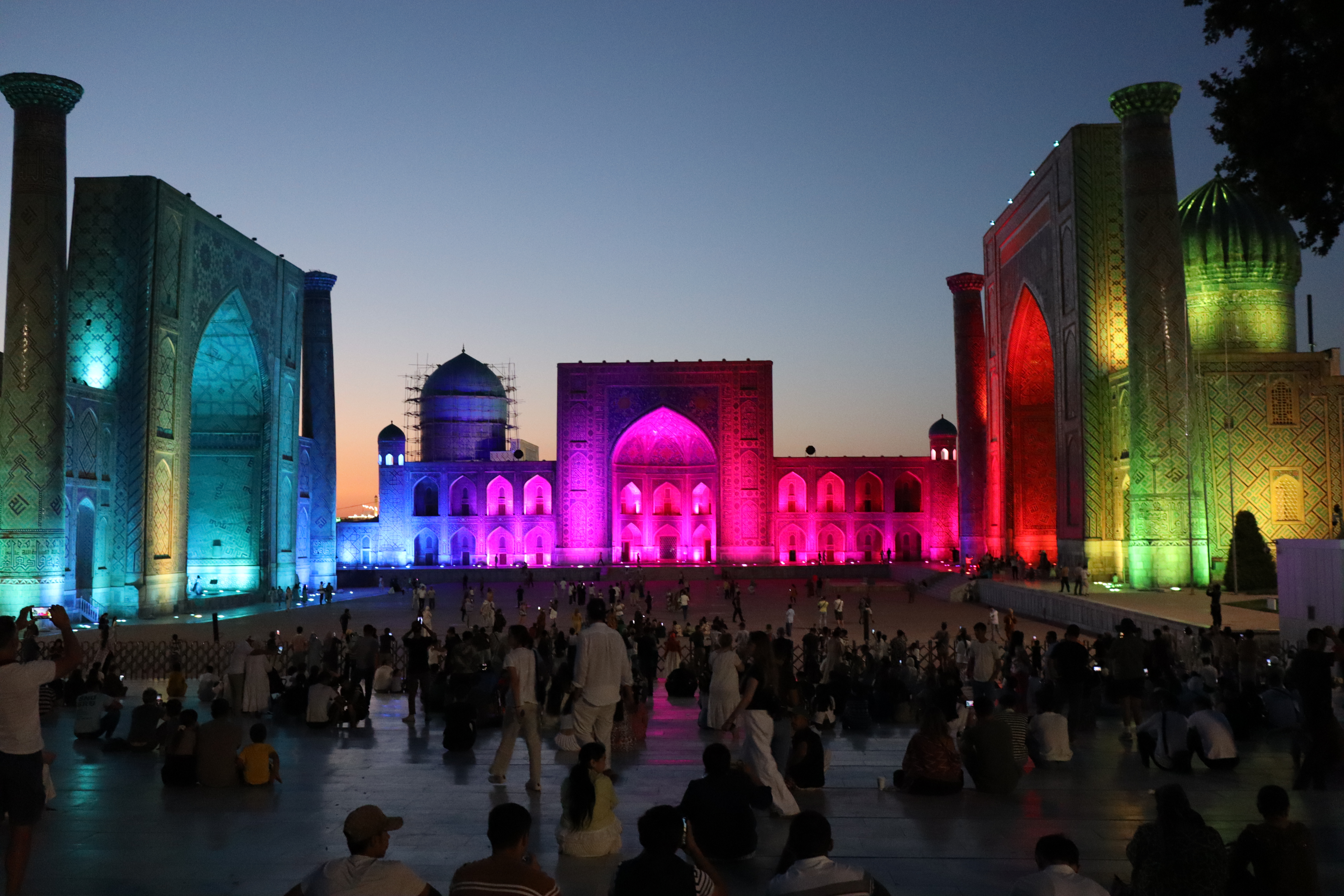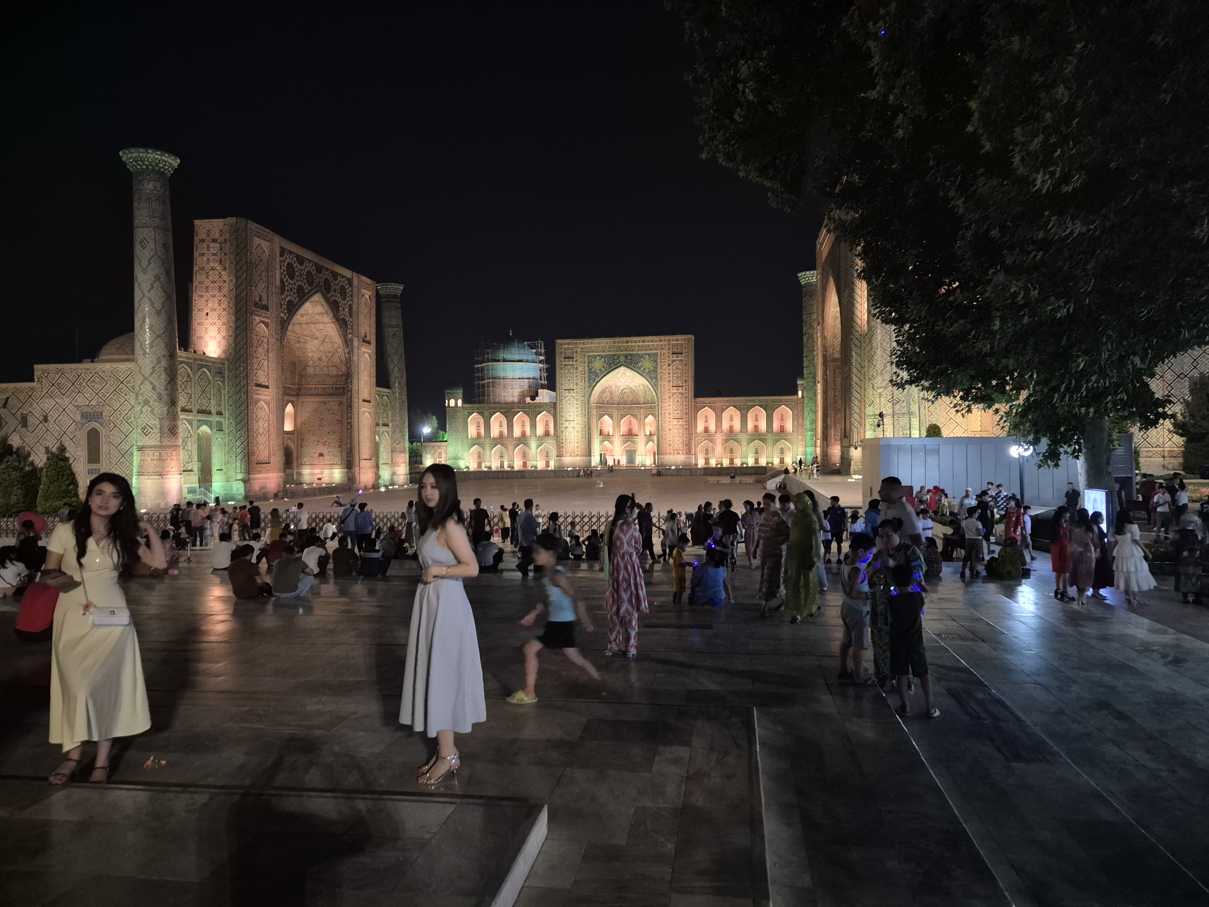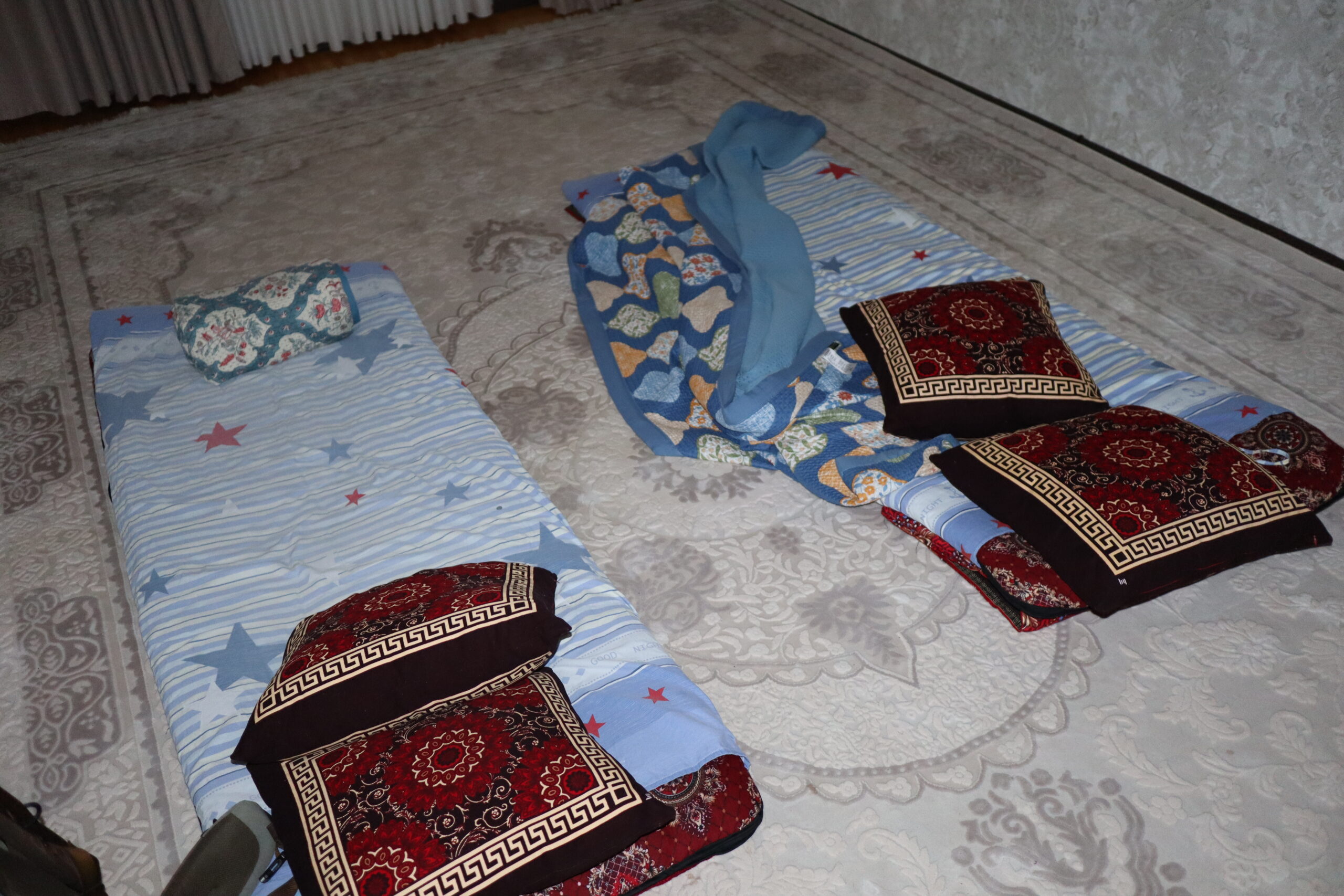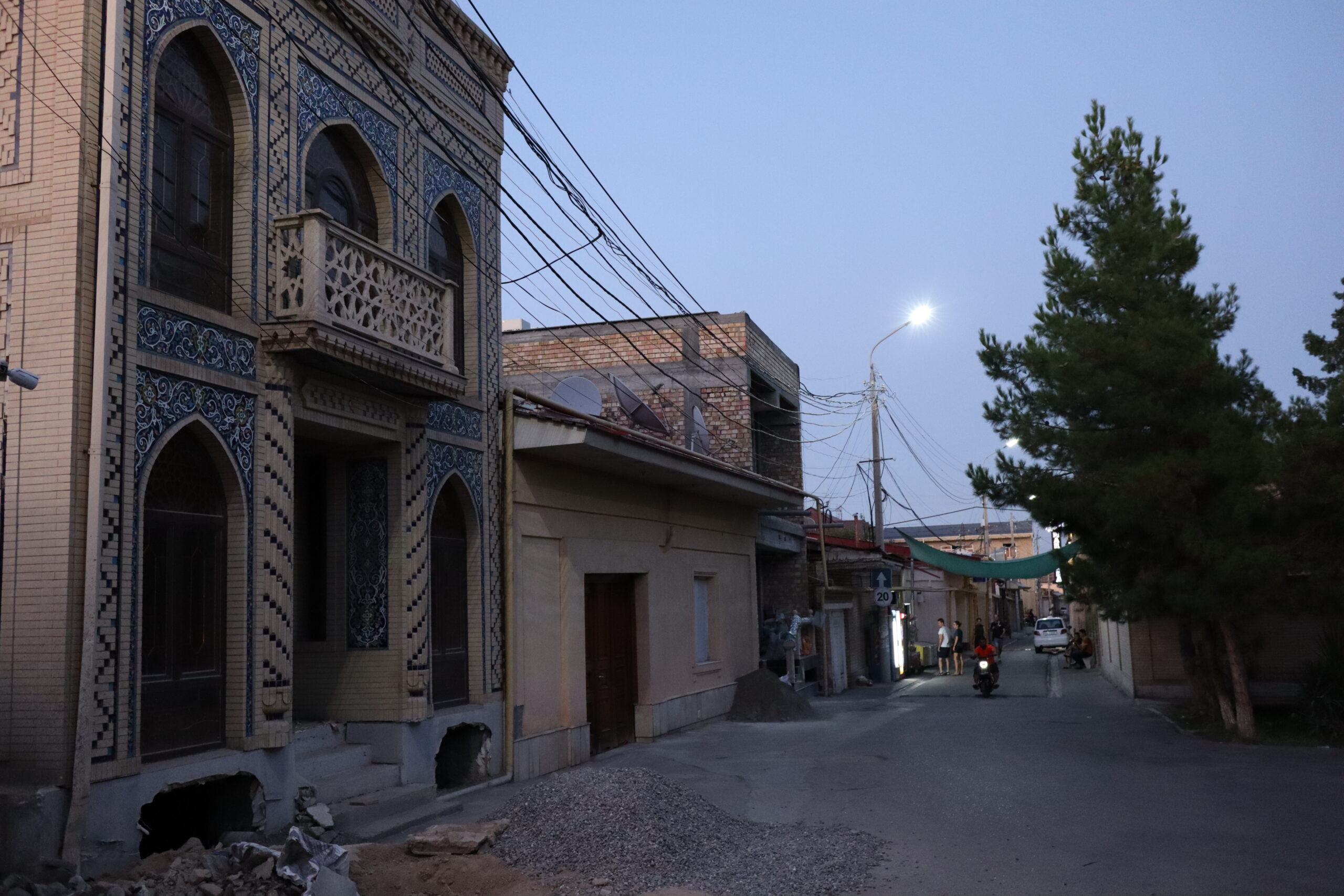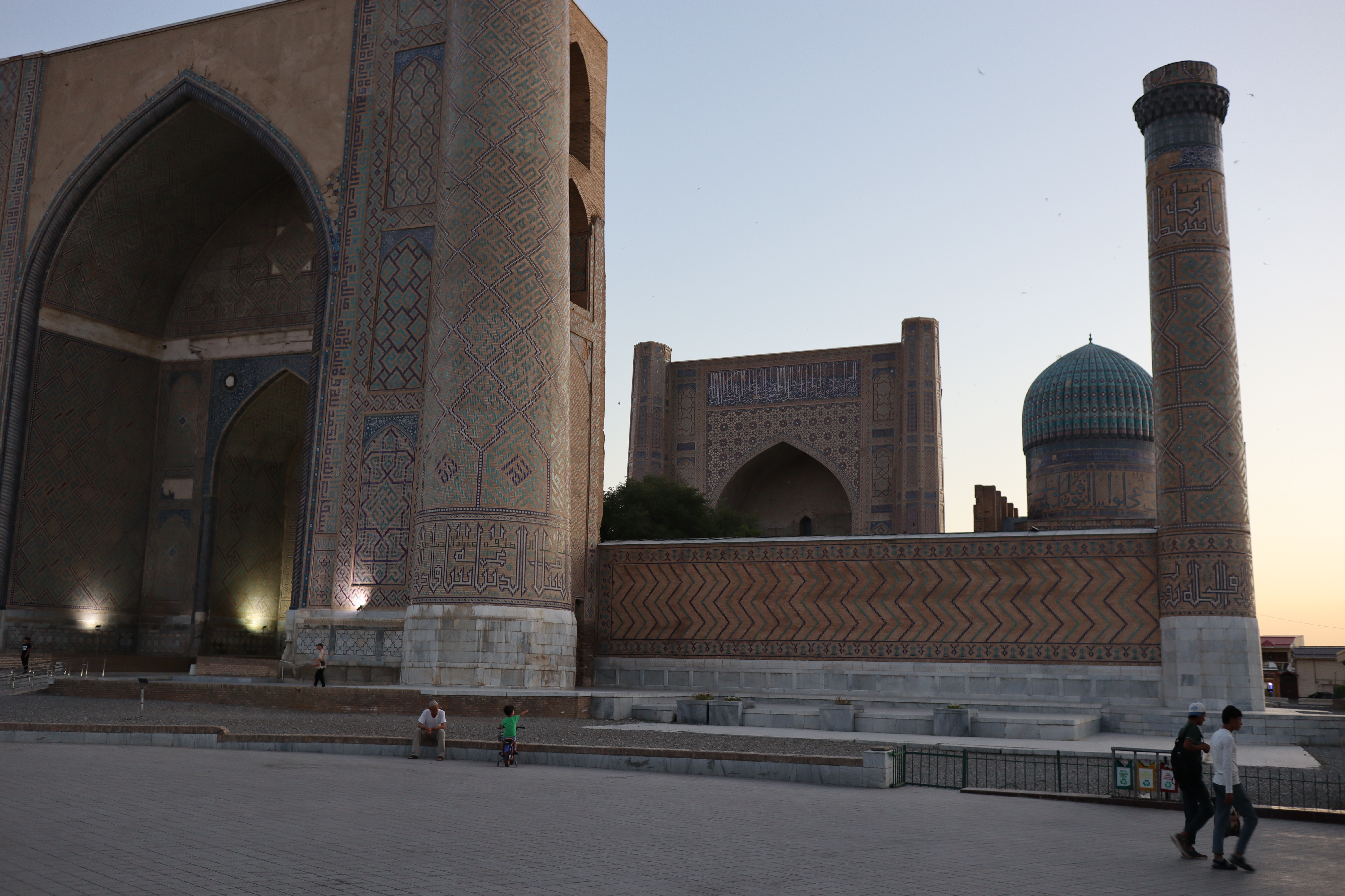 Am Folgetag, dem 11.07.2025, genoss ich das morgentliche, im Hostelpreis eingeschlossene, leckere Frühstück, ließ alle meine Habseligkeiten im Hostel zurück und machte mich auf, Samarkand eingehender zu erforschen. Angefangen bei Ulug-Begs Observatorium und dem Siyob Bazaar über die Bibi-Khanum Moschee bis hin zur Hauptattraktion Samarkands, dem Registan Square mit seinen drei beeindruckenden Madrasas (islamischen Hochschulen) ließ ich die Stadt auf mich wirken. Die Madrasas und Moscheen Samarkands waren wirklich beeindruckend. Feine, in der Sonne bläulich leuchtende Mosaike, waren ein besonders herausstechendes Merkmal in der historischen Architektur. Als sich der Tag dem Ende zuneigte und die Sonne dem Mond Platz gemacht hatte, füllte sich der Registan Square und das wirkliche Leben begann. Über den Tag war es einfach zu warm und nur die Reisenden mit ihren Wasserflaschen setzten sich der gnadenlosen Sonne aus, während die Einheimischen im Schatten hockten und auf den erlösenden Sonnenuntergang warteten. Die meisten Touristen hatten sich verzogen und waren durch usbekische Familien mit ihren Kindern ersetzt worden, die überall lachend herum rannten. Und alle waren sie hier, um die anstehende Lightshow zu genießen und sich dabei zu sozialisieren. Bald waren die Treppen des großen Platzes gefüllt und ein Lichterspektakel begann sich an den Wänden der Madrasas abzuspielen. Mit mehreren starken Beamern wurde eine Geschichte an die Wände projeziert und visuell vorgetragen. Die Erzählung handelte von der reichen Vergangenheit Samarkands und dem Erbe der Stadt, als Knotenpunkt der Seidenstraße. Die Lightshow war beindruckend, doch endete so schnell, wie sie begonnen hatte. Und ich wurde langsam unruhig. Eigentlich war ich zur Show mit Diyorbek verabredet gewesen, bei dem ich heute übernachten wollte, doch war er bis zu diesem Moment nicht aufgetaucht. Während ich so in Gedanken wartend auf den Stufen Registans saß, wurde ich von einer jungen Frau auf gutem English angesprochen. Bald gesellte sich ihr jüngerer Bruder dazu, und wir unterhielten uns fast über eine Stunde auf Englisch. Der Name des Mädchens war Farangiz und ihr Bruder hieß Asilbek. Beide waren mit ihren Eltern, Vater Akbar und Mutter Dilafruz zum Registan Platz gekommen, um die Show zu sehen und ihr Englisch zu verbessern. Dies erreichten sie indem sie auf Reisende zugingen – von ihren Eltern vorgeschickt, die nicht viel weiter saßen – und diese in ein freundliches Gespräch verwickelten. Wie es schien war das Los diesen Abend auf mich gefallen und so spielte ich mit und unterhielt mich mit ihnen. Die Themen variierten stark, doch das machte nichts aus, solange die Sprache geübt werden konnte. Mitten im Gespräch bekam ich eine Nachricht von Diyorbek. Er war in einen Autounfall verwickelt worden und jetzt im Krankenhaus zum Checkup. Er war ok, würde mich aber an diesem Tag nicht mehr hosten können. Ich schilderte Farangiz und Asilbek meine Lage. Kurze Zeit später saß ich mit der ganzen Familie in ihrem Chevrolet auf dem Weg zu ihnen nach Hause. Akbar und Dilafruz hatten mich eingeladen, eine Win-win Situation: Ihre Kinder bekamen die Möglichkeit ihr Englisch weiter an mir zu üben und zu verbessern und ich erhielt im Gegenzug eine äußerst spontane Übernachtungsgelegenheit. So kam es, dass ich in Samarkand in das tägliche Leben einer usbekischen Familie eintauchen durfte. Wie mittlerweile gewohnt, wurde eine auf dem Boden des Wohnzimmers ausgerollte Kurpatscha (dicke Wolldecke) zu meinem Nachtlager, wo ich zusammen mit Asilbek übernachtete. Es war Wochenende und so konnten alle Familienmitglieder ausschlafen.
