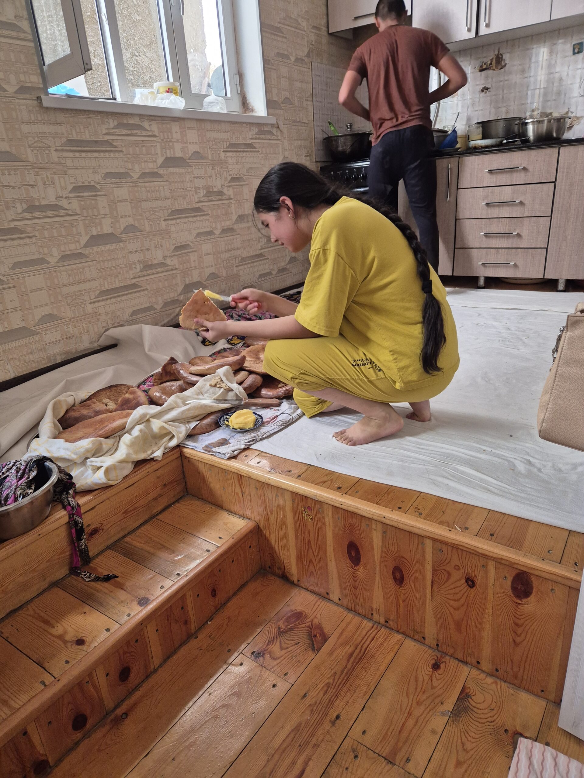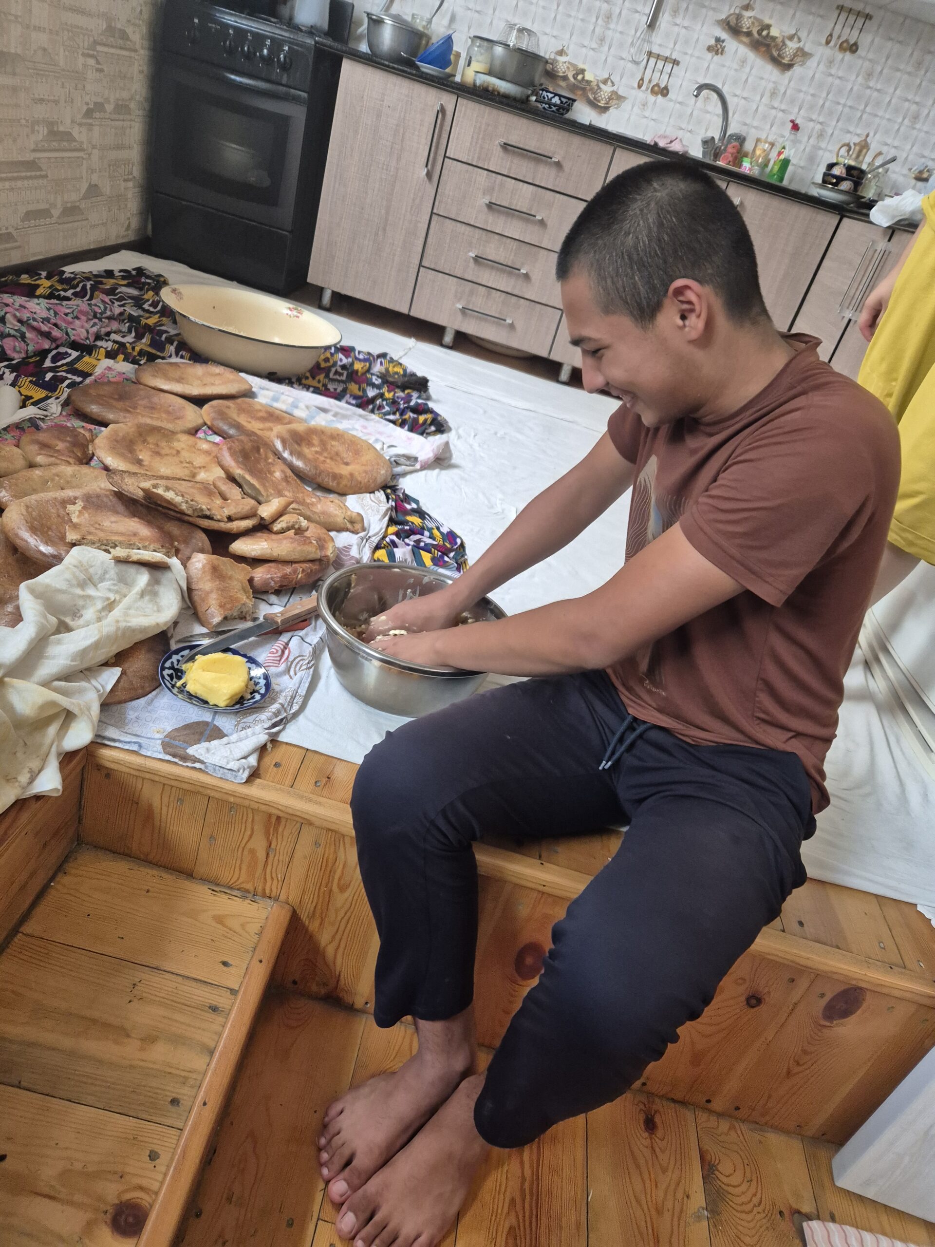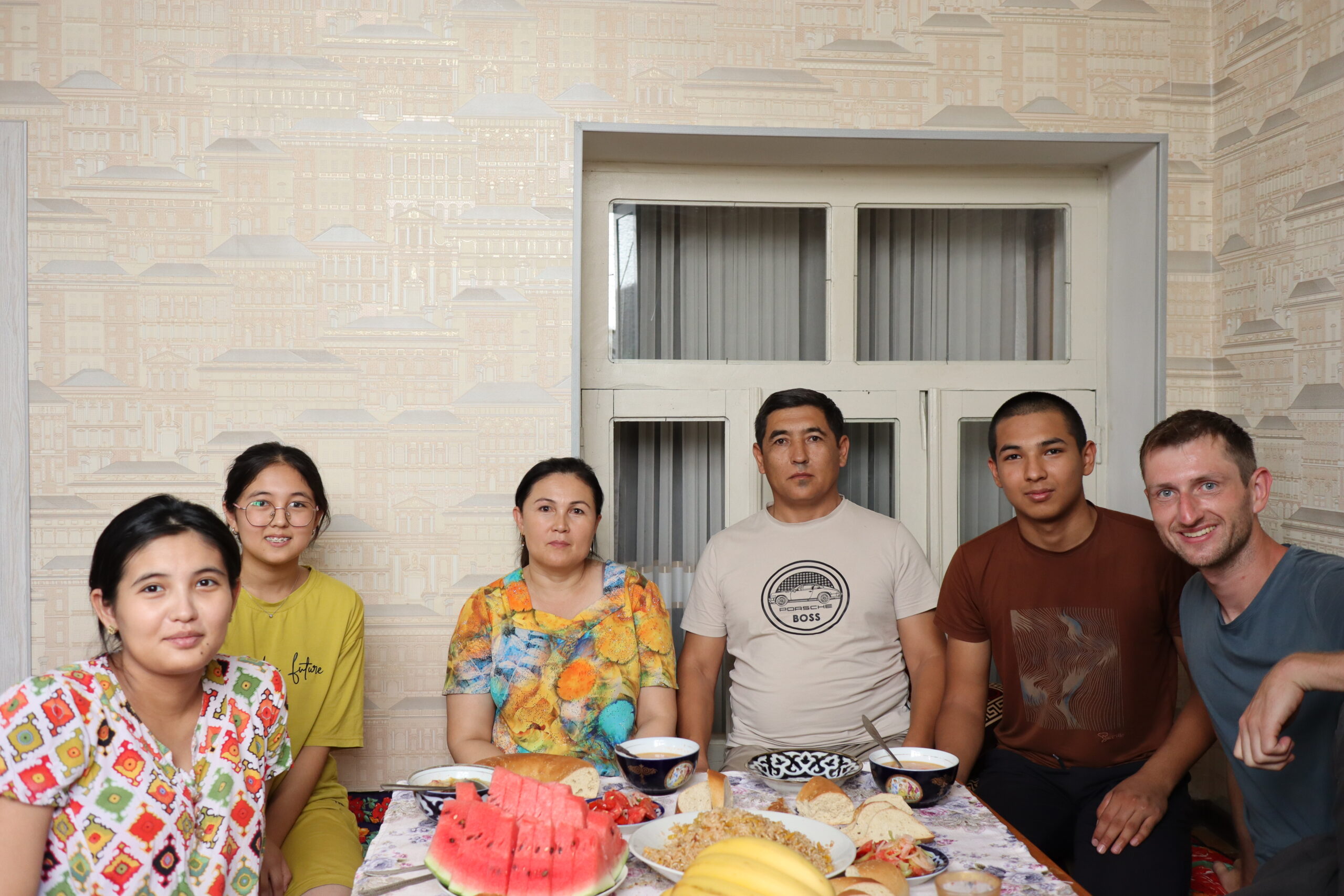 Auf diese Weise startete der 12.07.2025 geruhsam. Zum Frühstück gab es eine art Milchsuppe mit Brot und natürlich eine menge Trockenfrüchte, Wassermelone und Tee, der immer wieder nachgeschenkt wurde. Die Atmosphäre am Tisch war ausgelassen und freundlich und ich fühlte mich sehr wohl. Über den Vormittag und frühen Nachmittag lief ich mit Asilbek durch Samarkand, während ich mich mit Ihm so gut es ging in Englisch unterhielt. Farangiz hingegen kam nicht mit, sie schien andere Pflichten zu haben. Mir war aufgefallen, dass Farangiz für den Haushalt verantwortlich zu sein schien: Sie kochte, deckte den Tisch und räumte ihn nach der Mahlzeit auch wieder ab. Gelegentlich half ihr Bruder oder ihre Mutter, aber hauptsächlich sah ich Farangiz in der Küche. Asilbek hingegen hatte Geld von seinem Vater zugesteckt bekommen und zahlte damit jegliche anfallenden Kosten auf unserer Exkursion durch die Stadt. Penibel achtete er darauf, dass es mir gut ging. Ein Gast der Familie zu sein, schien zu bedeuten, dass alle Kosten während dieser Zeit für mich übernommen wurden. So versuchte ich die großen, teuren Attraktionen während des Ausflugs zu meiden und begnügte mich mit Wasser und einem Eis. Dennoch hatten wir Spaß und genossen den Tag. Pünktlich zum Essen kamen Asilbek und ich wieder nach Hause. Es gab köstliches Plov, Manti und Ğilak-Shorva. Alle saßen um den üppig gedeckten Tisch mit den Speisen und langten zu. Auch Ruxshona, Farangiz‘ und Asilbeks ältere, schwangere Schwester war zu Besuch gekommen und es schien viele wichtige Dinge zu geben über die sich angeregt unterhalten wurde. Auf diese Weise verging der 12.07.2025, bevor ich mich am nächsten Tag in Richtung Tadschikistan auf machte.