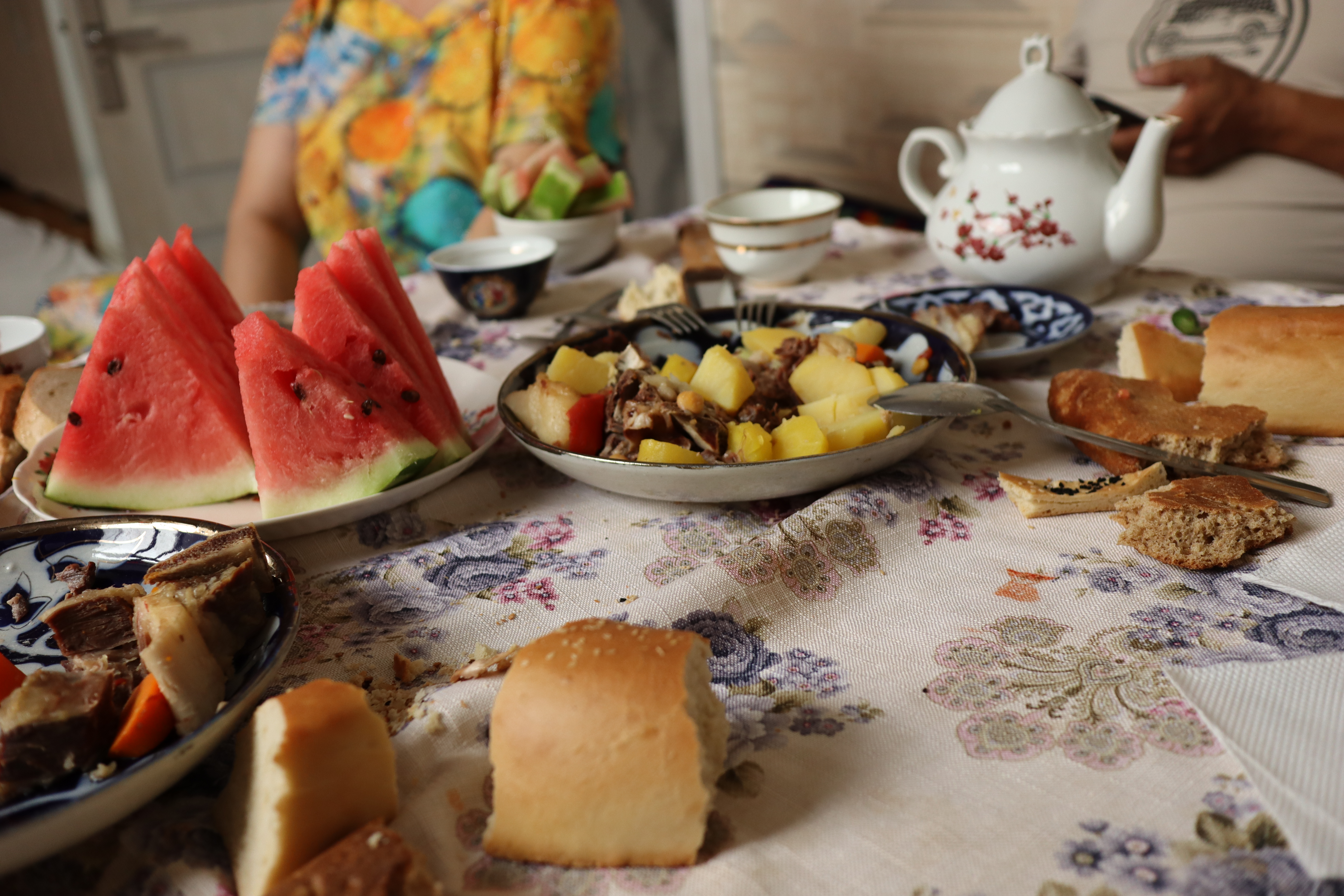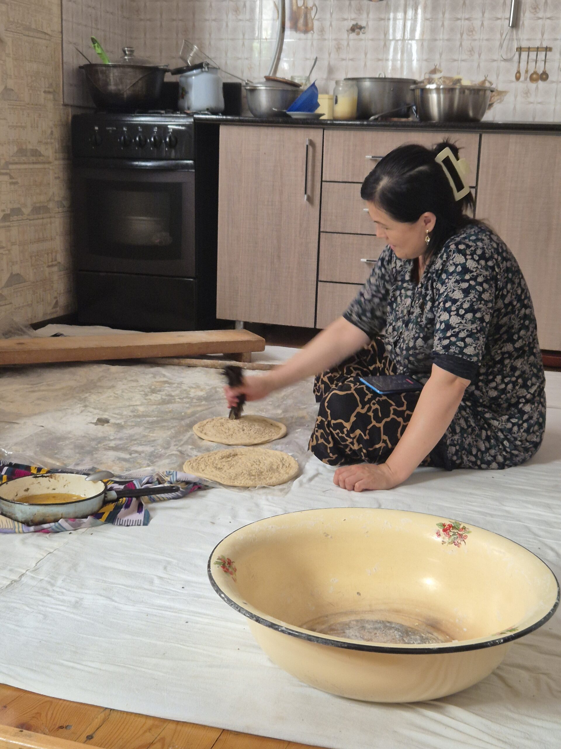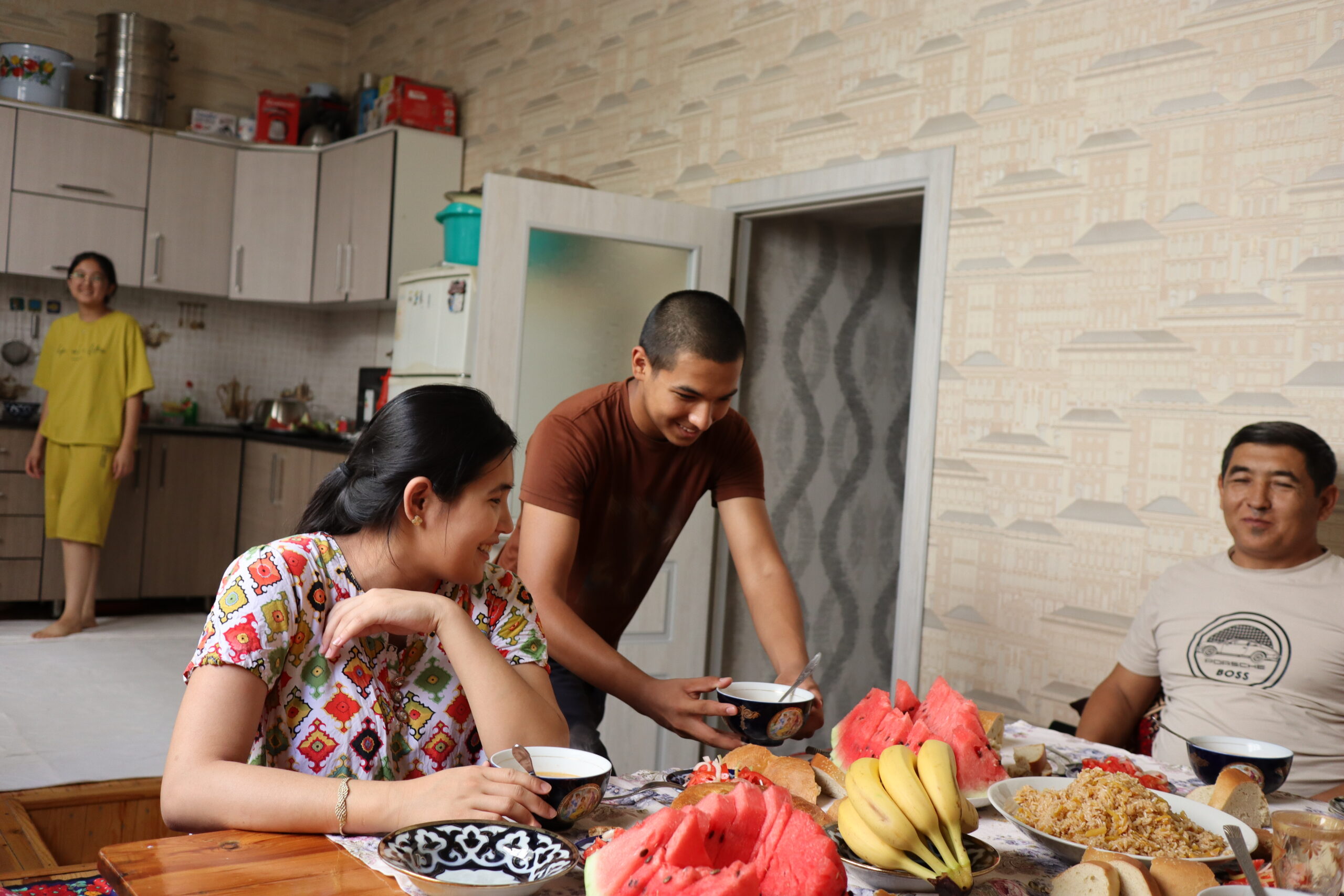 Auf diese Weise startete der 12.07.2025 geruhsam. Zum Frühstück gab es eine art Milchsuppe mit Brot und natürlich eine menge Trockenfrüchte, Wassermelone und Tee, der immer wieder nachgeschenkt wurde. Die Atmosphäre am Tisch war ausgelassen und freundlich und ich fühlte mich sehr wohl. Über den Vormittag und frühen Nachmittag lief ich mit Asilbek durch Samarkand, während ich mich mit Ihm so gut es ging in Englisch unterhielt. Farangiz hingegen kam nicht mit, sie schien andere Pflichten zu haben. Mir war aufgefallen, dass Farangiz für den Haushalt verantwortlich zu sein schien: Sie kochte, deckte den Tisch und räumte ihn nach der Mahlzeit auch wieder ab. Gelegentlich half ihr Bruder oder ihre Mutter, aber hauptsächlich sah ich Farangiz in der Küche. Asilbek hingegen hatte Geld von seinem Vater zugesteckt bekommen und zahlte damit jegliche anfallenden Kosten auf unserer Exkursion durch die Stadt. Penibel achtete er darauf, dass es mir gut ging. Ein Gast der Familie zu sein, schien zu bedeuten, dass alle Kosten während dieser Zeit für mich übernommen wurden. So versuchte ich die großen, teuren Attraktionen während des Ausflugs zu meiden und begnügte mich mit Wasser und einem Eis. Dennoch hatten wir Spaß und genossen den Tag. Pünktlich zum Essen kamen Asilbek und ich wieder nach Hause. Es gab köstliches Plov, Manti und Ğilak-Shorva. Alle saßen um den üppig gedeckten Tisch mit den Speisen und langten zu. Auch Ruxshona, Farangiz‘ und Asilbeks ältere, schwangere Schwester war zu Besuch gekommen und es schien viele wichtige Dinge zu geben über die sich angeregt unterhalten wurde. Auf diese Weise verging der 12.07.2025, bevor ich mich am nächsten Tag in Richtung Tadschikistan auf machte.