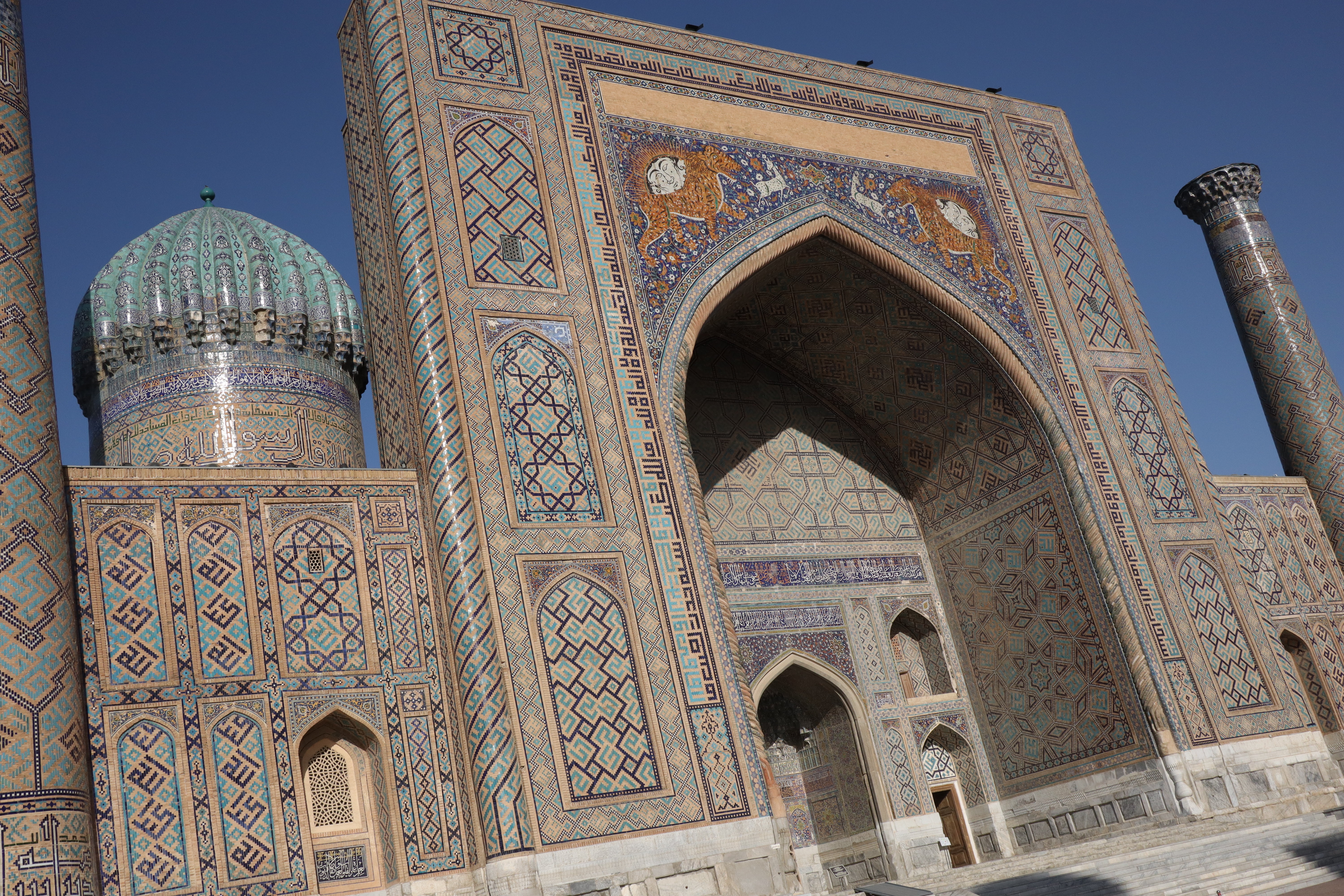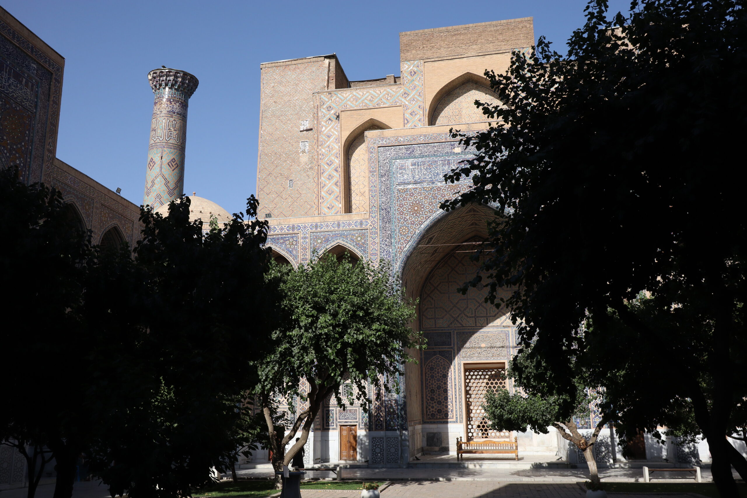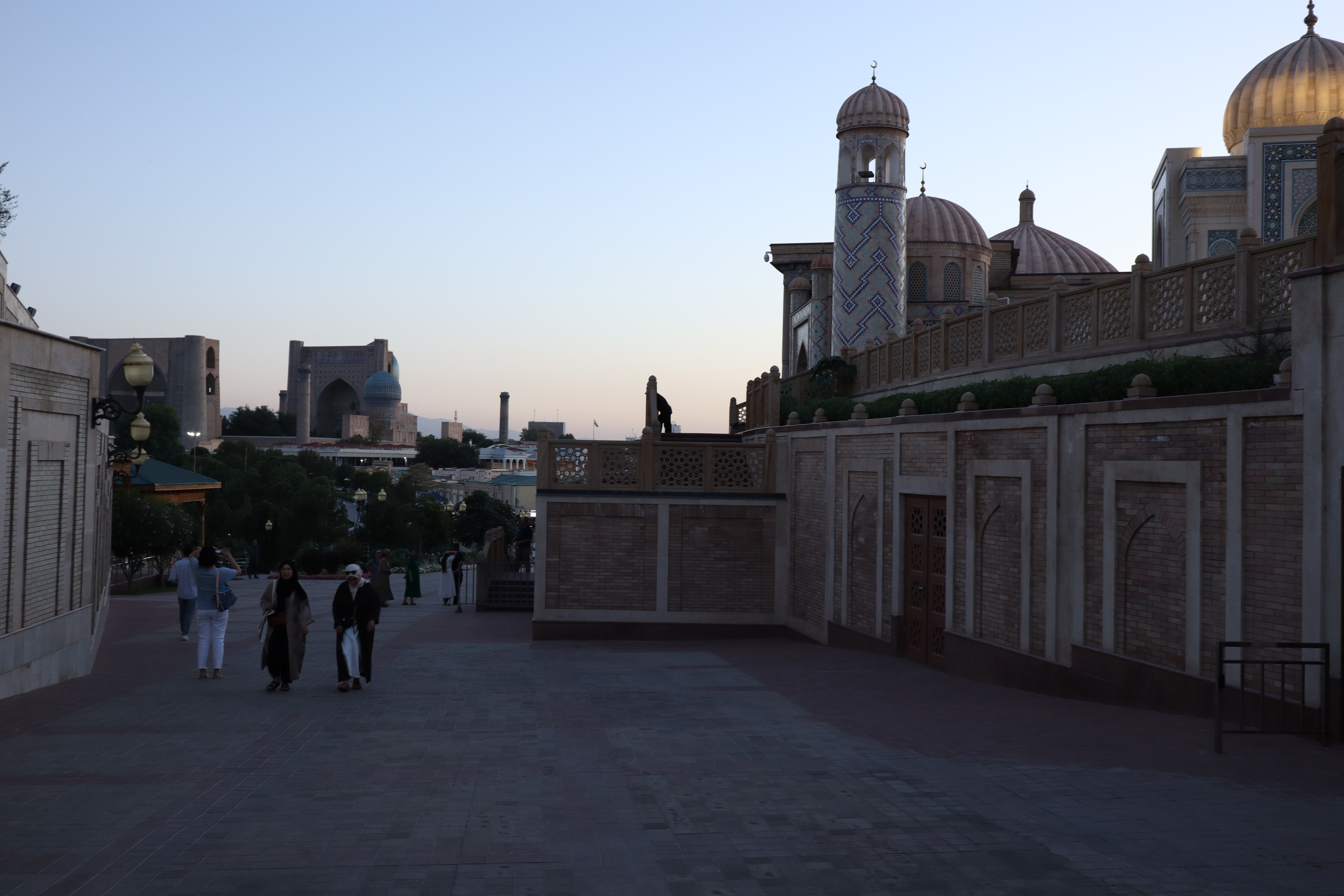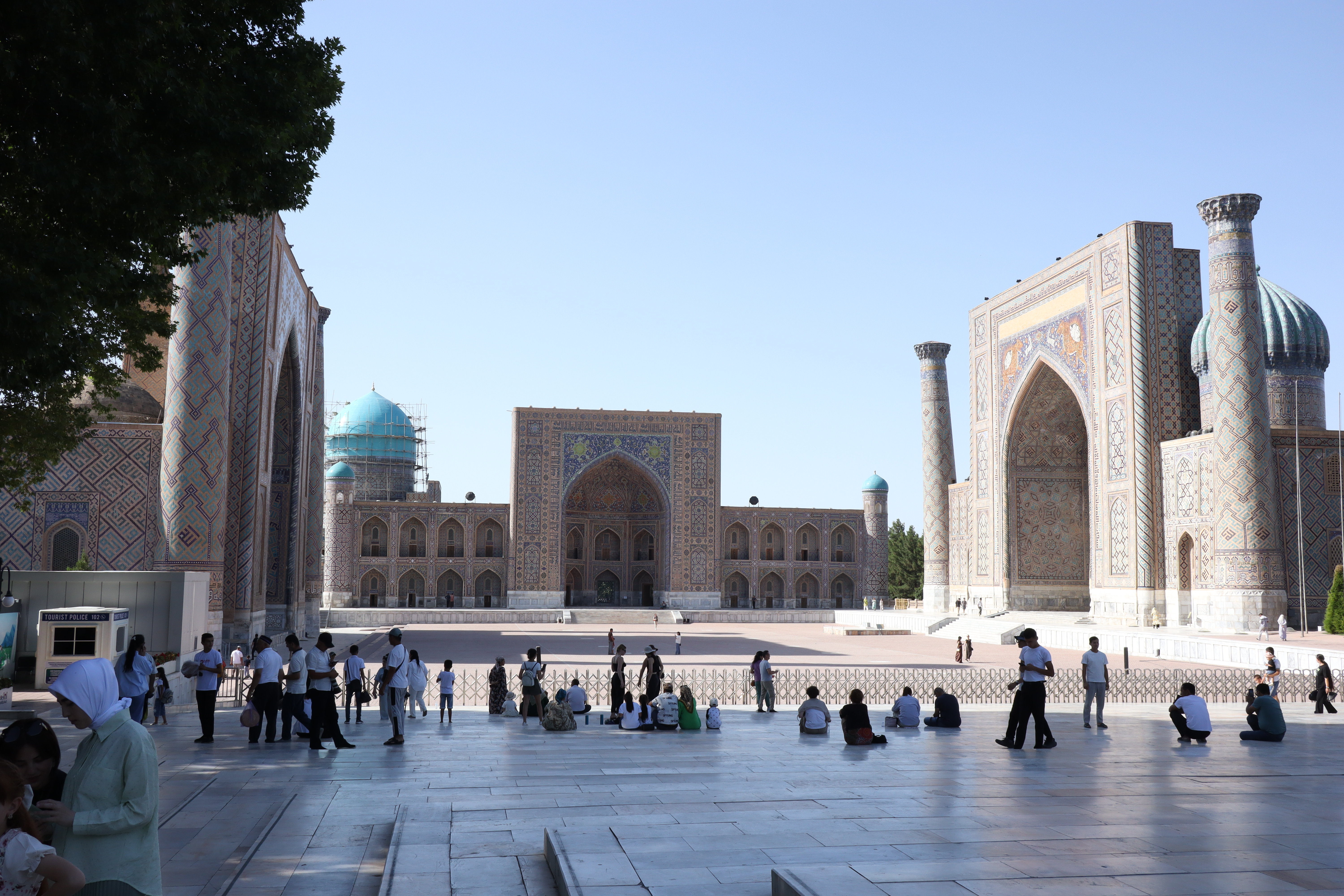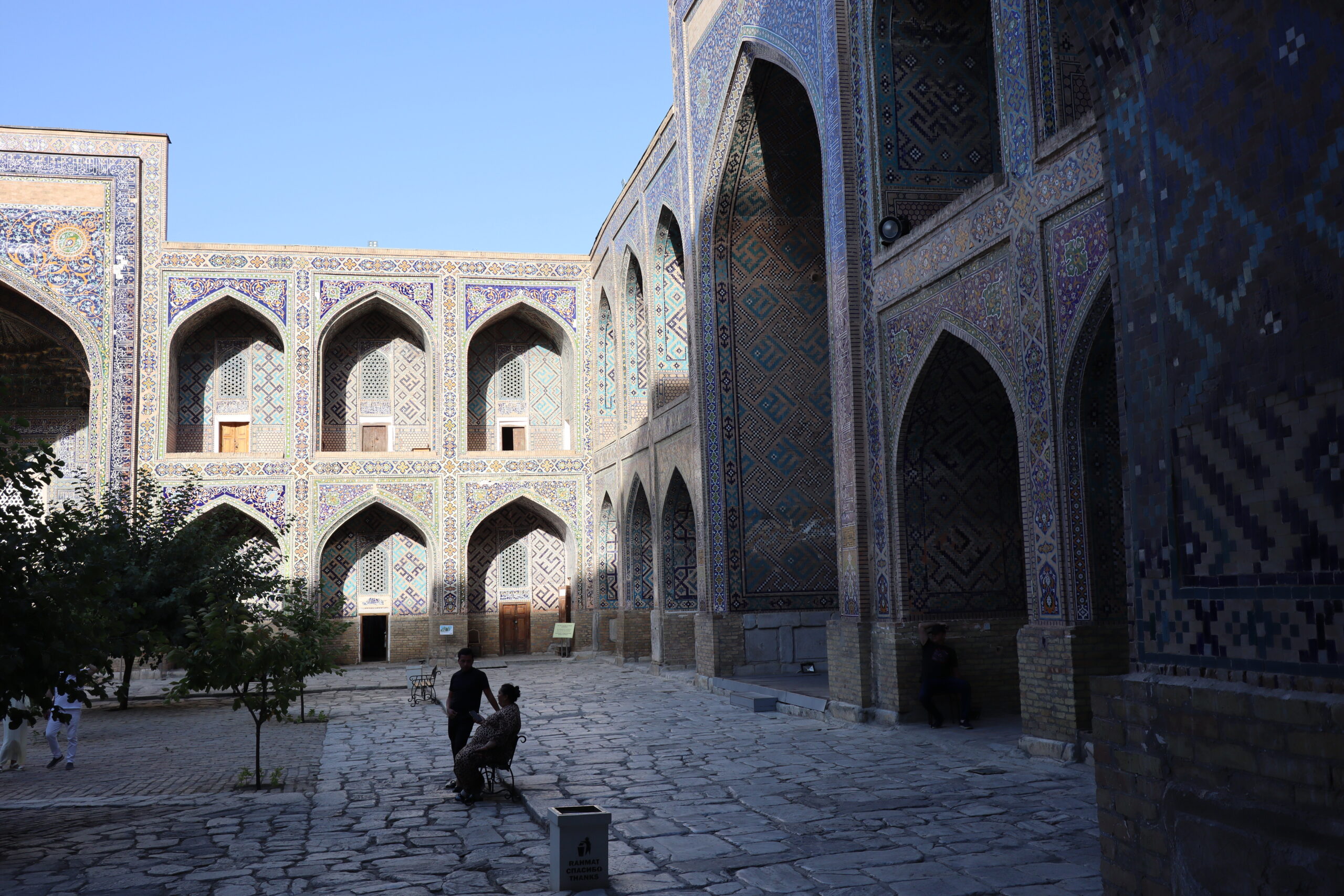 Am Morgen des 10.07.2025 verließ ich Taschkent. Abermals musste ich mich beim Verlassen der Stadt durch eine Horde verzweifelter Taxifahrer kämpfen. Doch auch dieses mal blieb ich stark und meinen Prinzipien treu. Außerhalb der Stadt, als die Taxifahrer weniger wurden und der Verkehr nunmehr geordnet in eine Richtung floss, wagte ich es, meine Hand und meinen Daumen wieder auszustrecken. Drei mal wurde ich verschwitzt an diesem heißen und sonnigen Sommertag aufgesammelt, bis ich Samarkand erreichte. Zusammen mit dem ersten Fahrer trank ich zwischendurch am Straßenrand eine Schale erfrischenden Ayran – den besten Ayran, den ich bis dato kosten durfte – während der dritte Fahrer die letzten 200 Kilometer so aggressiv und dicht auffuhr, dass ich froh war, als ich in Samarkand endlich aussteigen konnte. Aufgrund der aggressiven und schnellen Fahrweise erreichte ich Samarkand jedoch bereits am späten Nachmittag – früher als erwartet – und hatte noch genügend Zeit die Stadt ein wenig zu erkunden, bevor ich mich auf die Suche nach einer Übernachtungsmöglichkeit machen musste. Mein erster Eindruck von Samarkand war: Diese Stadt ist reich und touristisch. Während Taschkent als Haupstadt Usbekistans das Land regierte schien Samarkand das Vorzeigejuwel des Landes zu sein. Wie ein Magnet zog es die Touristen an. Es gab weite, moderne, bei Nacht beleuchtete Straßen zu bestaunen, große Parks und natürlich die vielbesuchten Moscheen und Mausoleen. Als ehemaliger Knotenpunkt der Seidenstraße strotzte die Stadt nur so in ihrem historischen Erbe. Dies wurde natürlich ausgenutzt und die Preise für die Sehenswürdigkeiten waren entsprechend hoch – im Schnitt fünf mal so hoch, wie für die lokale Bevölkerung. Damit die Touristen jedoch nicht ganz ausgenommen wurden, gab es eine Tourist-Police, bei der man sich melden konnte, wenn man doch den Verdacht hatte, übers Ohr gehauen worden zu sein. Nachdem ich zu Fuß den historischen Stadtkern Samarkands erreicht und mich fürs erste grob satt gesehen hatte, checkte ich vorsorglich in ein Hostel ein, um mich in Samarkand zu registrieren.