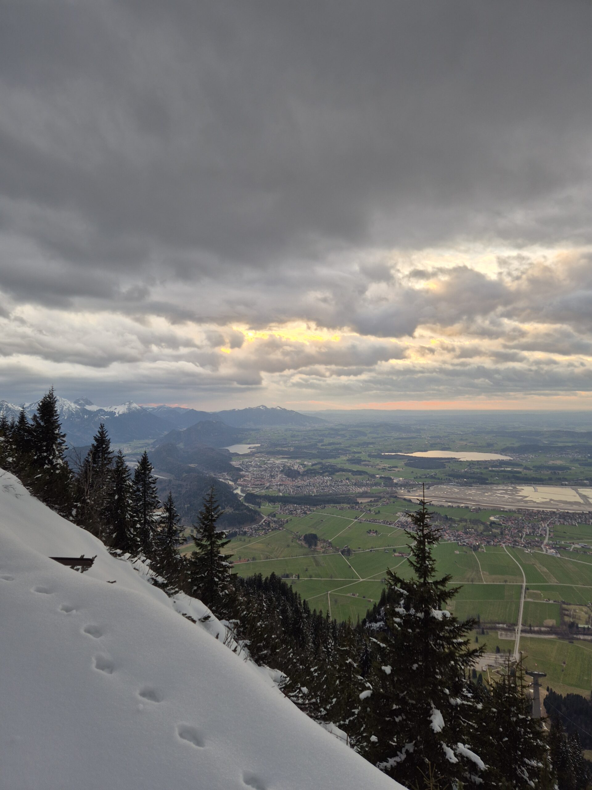 Also übernachtete ich an der Tegelhütte und machte mich um 06:30 Uhr am Morgen des 31.03.2025 auf den schnellsten Rückweg den Berg hinunter. Dabei mied ich den überschütteten Marienweg und folgte dem Engelstieg ins Tal. Gerade rechtzeitig, da es heftig zu schneien begann. Je tiefer ich kam, desto nasser wurde der Schnee, bis er sich in Regen verwandelte und auch der Schnee am Berg verschwand. Keine drei Stunden später war ich wieder in Füssen und mit Bus und Bahn auf dem Weg nach Garmisch-Partenkirchen.