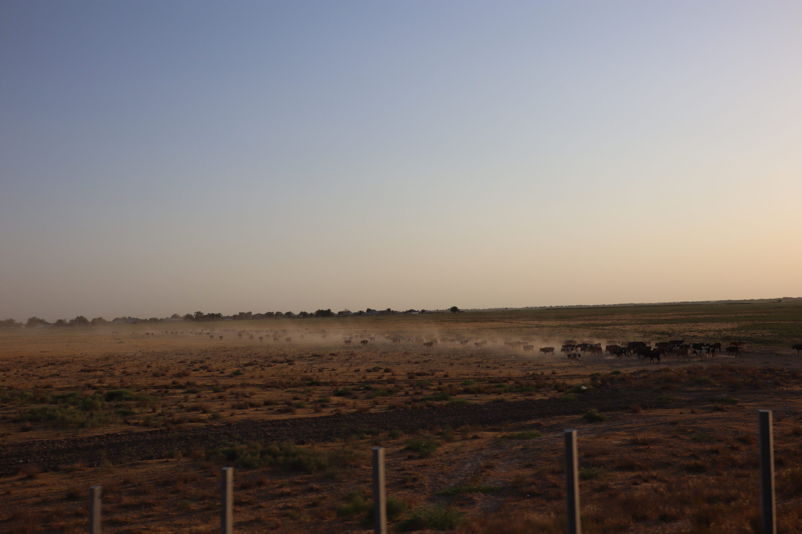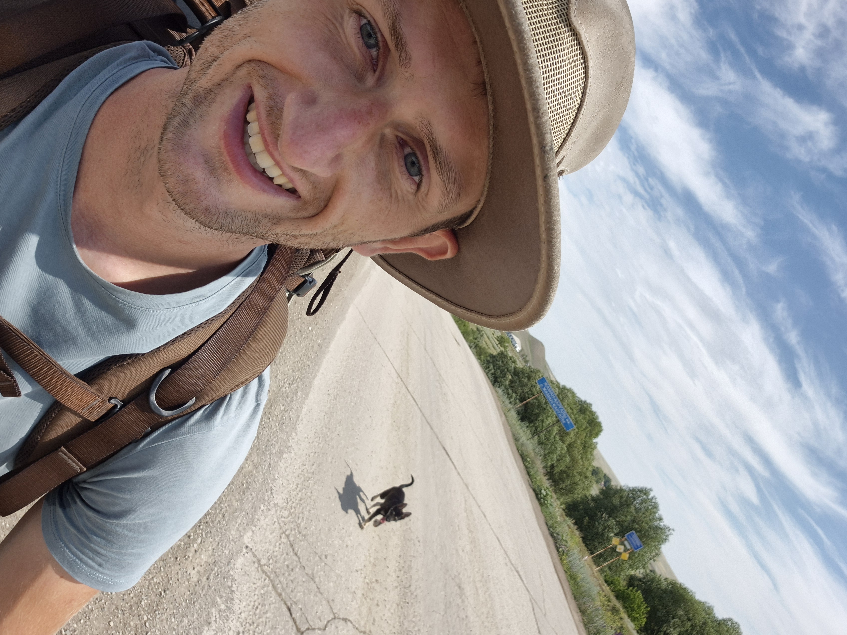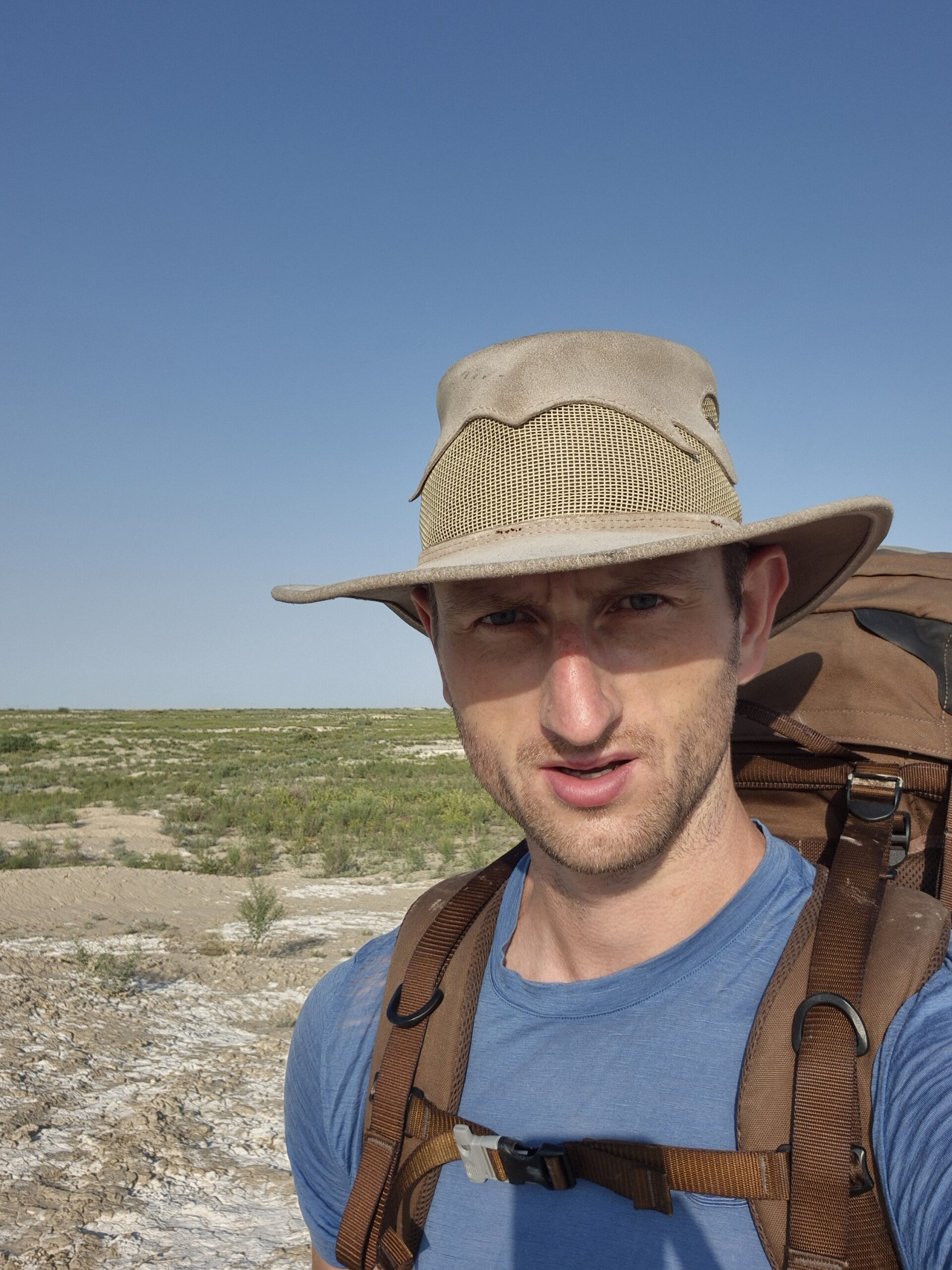 Auch am Morgen des 02.07.2025 wurde ich von einem jauchzenden Alamat geweckt, bevor es leckeres Frühstück gab. Die Trockenfrüchte schmeckten besonders gut. Dann war es Zeit wieder aufzubrechen. Herzlich verabschiedete ich mich in Krasnosel’skoe von allen Familienmitgliedern die ich finden konnte und brach auf. Auf dem Weg zu Fuß zur großen Straße, wurde ich von einem kleinen Hundewelpen angefreundet, der mir mehrere Kilometer bis zur Straße auf Schritt und Tritt folgte. Er beschützte mich vor vorbeifahrenden Autos und blieb eng an meiner Seite. Kurzzeitig überlegte ich ersthaft, ob ich ihn nich einfach mitnehmen sollte, doch die Komplikationen, die diese Entscheidung mit sich führen würde wären schwerwiegend. Besonders die vielen Grenzüberschreitungen wären ein Problem. Schweren herzens trampte ich ohne ihn weiter. In der Nähe des Dorfes würde es ihm besser ergehen als an meiner Seite, so hoffte ich. Zwei Autostops später erreichte ich das Dorf Bögetsay, durch das sich der Fluss Or schlängelte. Dort lud mich mein angelbegeisterter Fahrer zu einem kleinen Abstecher abseits des Dorfes zu einem Teich ein, der Abkühlung versprach. Wilde Pferde grasten am Ufer als wir in den See sprangen. Wieder zurück an der Straße trampte ich weiter nach Qarabutaq und wandte mich gen Süden. Über die letzten Tage hatte sich immer mehr herauskristallisiert, dass ich Taschkent und Samarkand besuchen wollte. Die Straße, die in Qarabutaq nach Süden abbog, führte über Qysyslorda und Türkystan nach Schymkent. Von dort war es nicht mehr weit bis nach Usbekistan. Die Route in den Süden bedeutete jedoch auch, das über eintausend Kilometer Steppe zu überwinden und zu bewältigen waren.
