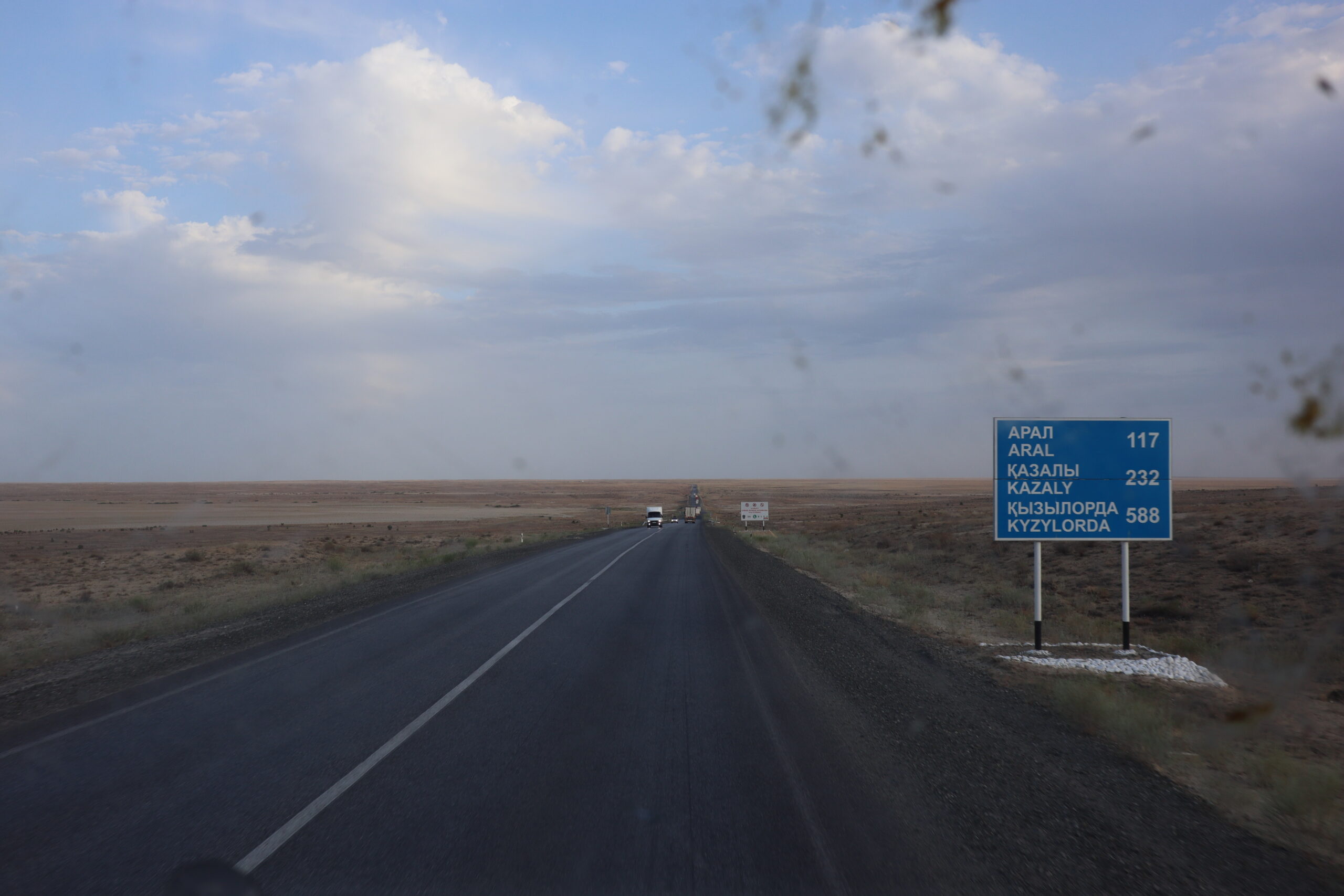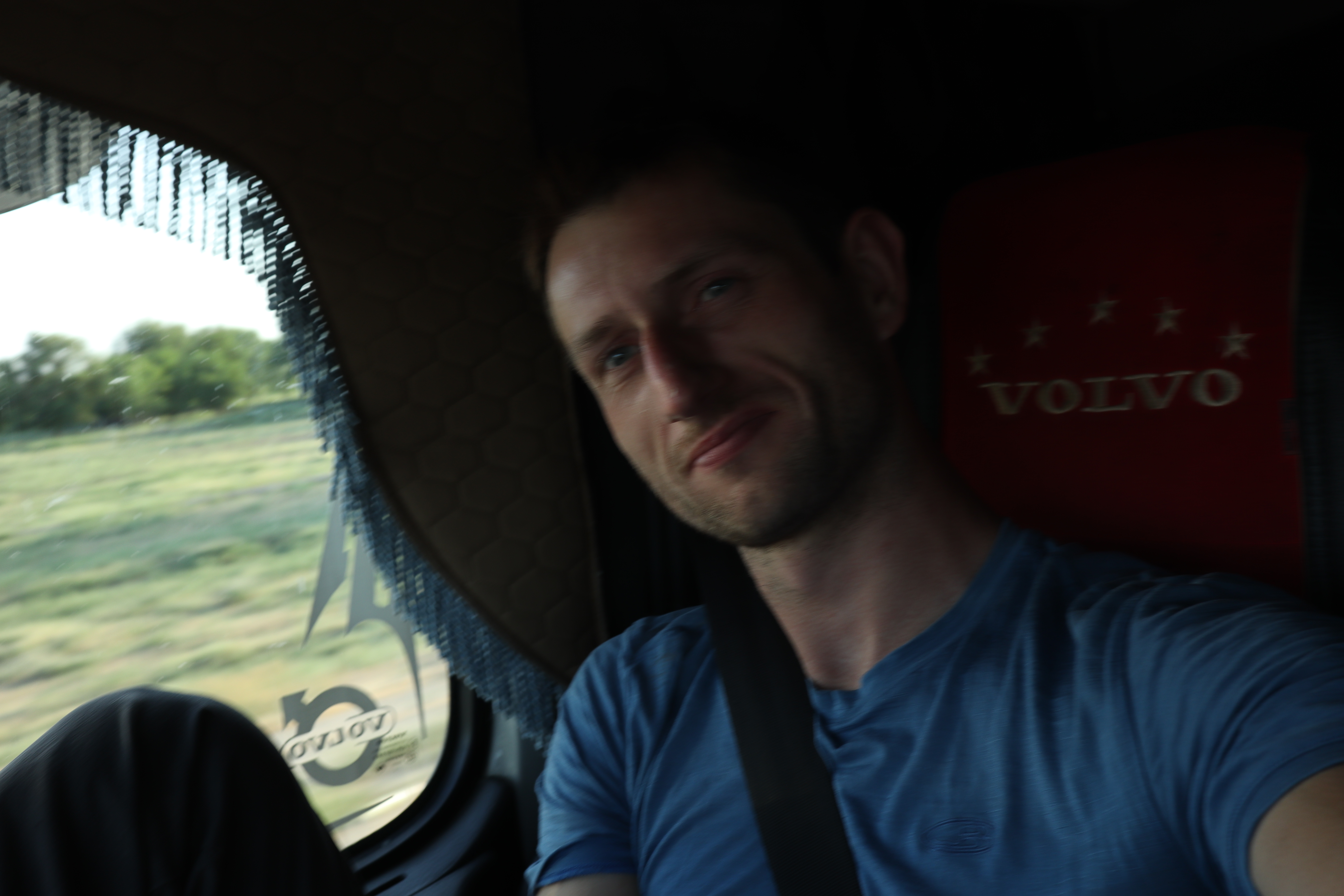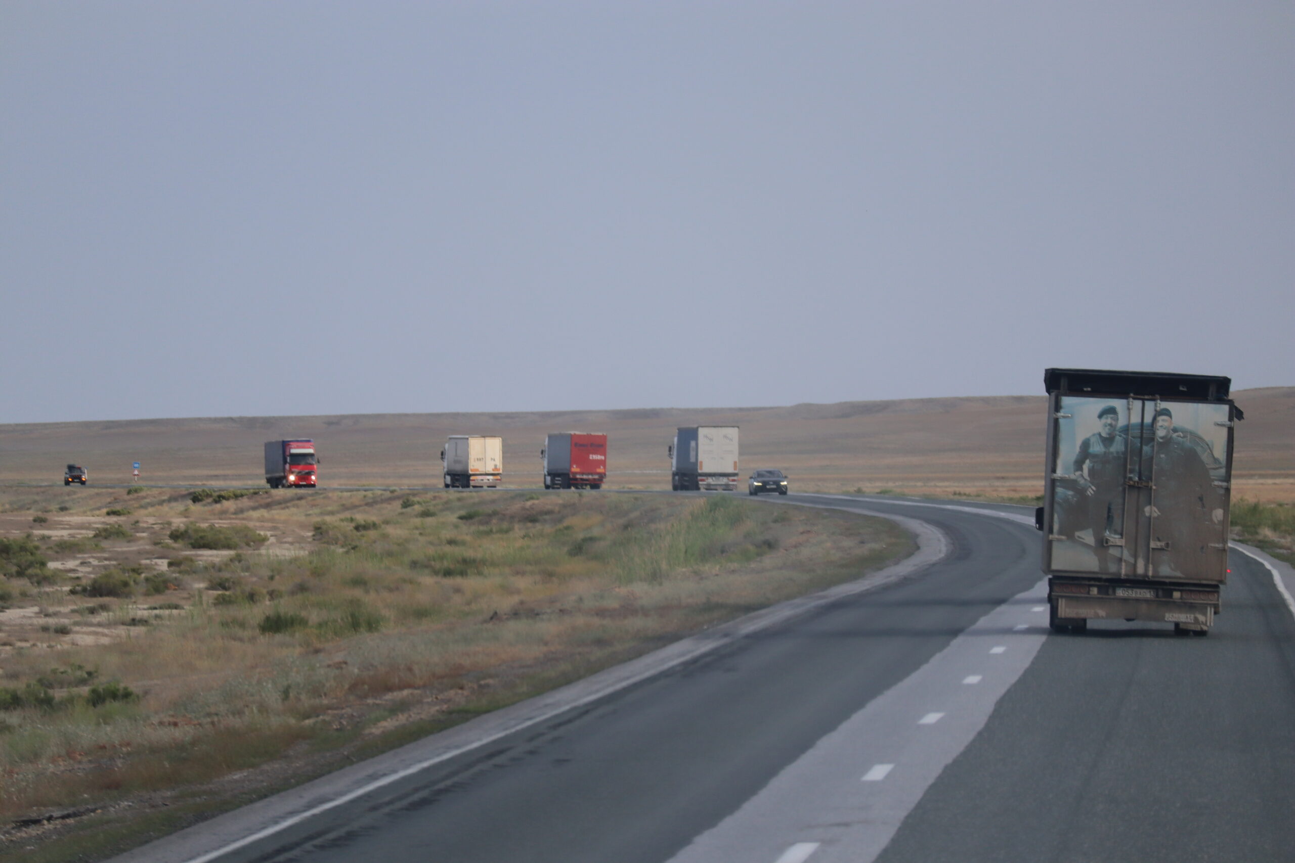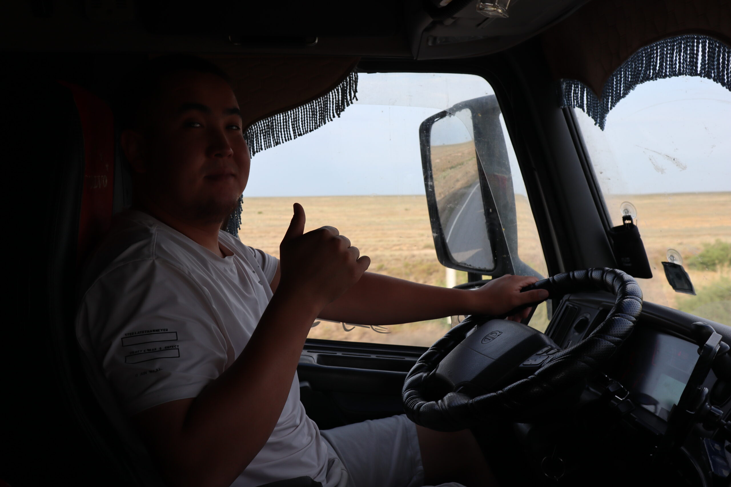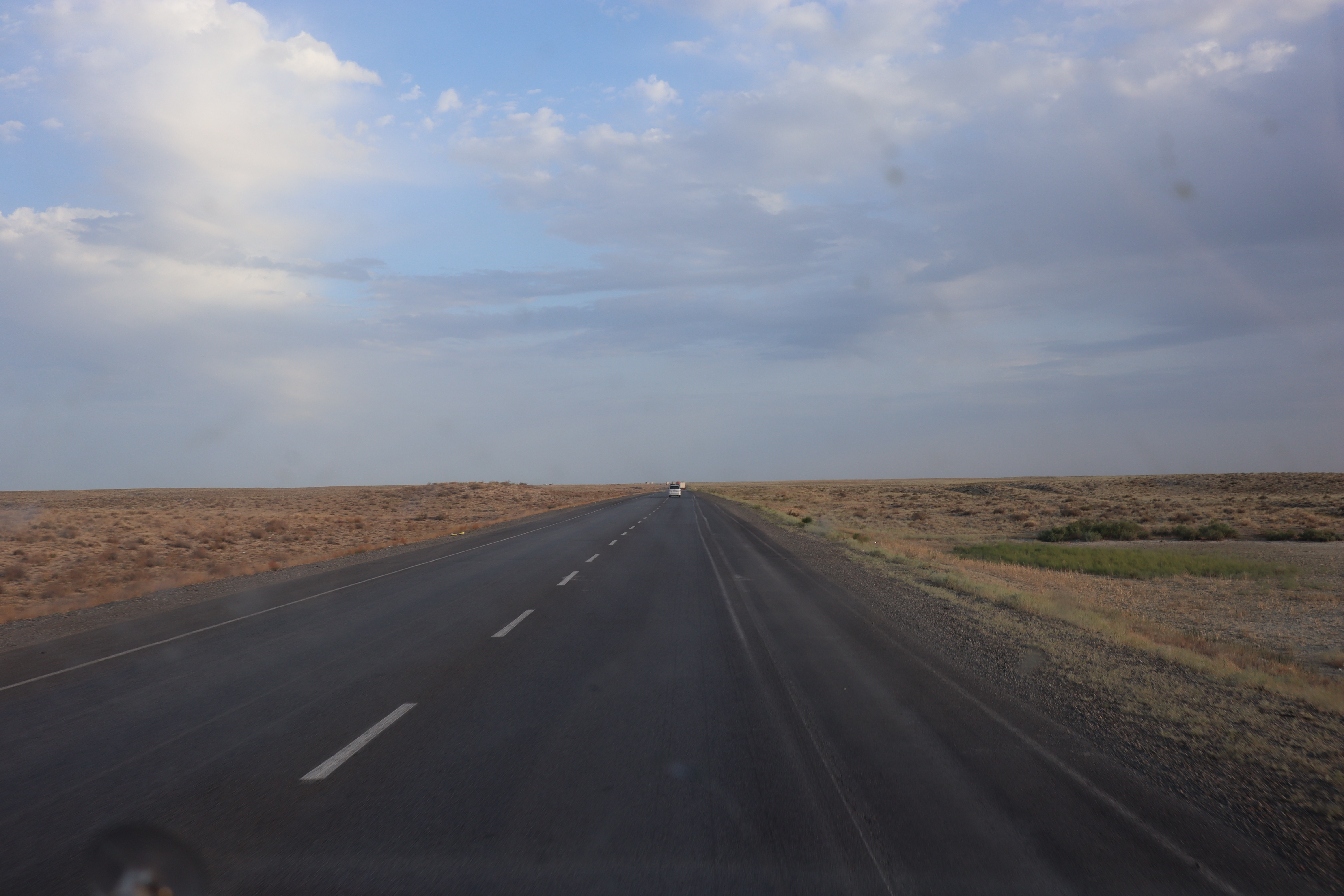 Ich war noch nicht lange an der Straße gen Süden entlanggewandert, als hinter mir ein lautes Hupen erklang. Ich drehte mich um und sah wie ein junger LKW-Fahrer im Fahrerhaus die Hand fragend nach Süden ausstreckte. Ich streckte ebenfalls meine Hand in Richtung Süden aus und der LKW hielt Staub aufwirbelnd an. Während der Lastwagenfahrer den LKW auf Sicherheitsmängel prüfte, hiefte ich meinen Rucksack ins Fahrerhaus und stieg ein. Ulan transportierte Autos und war auf dem Weg nach Hause nach Bischkek, das in Kirgistan liegt. Auf seinem Weg nach Bischkek würde Ulan auch Schymkent passieren und so willigte er ein, mich bis dorthin mitzunehmen. Den restlichen und darauffolgenden Tag verbrachte ich so mit Ulan im Fahrerhaus des Lastwagens. Die endlose Steppe erstreckte sich weit in alle Himmelsrichtungen und regionale Musik aber auch gelegentlich ein deutscher Titel dröhnten aus Ulans Radio. Als es dunkel wurde unterhielten wir uns per Dolmetscher. So konnten wir uns recht effizient unterhalten, zusammen lachen und Missverständnisse aus der Welt räumen, wenn es welche gab. Gelegentlich passierten wir mit dem LKW kleine Kamelherden, die am Straßenrand grasten, oder kleine Dörfer bzw. Raststätten, wo wir Wasser und Samsa (gefüllte Teigtaschen) kauften, um unseren Durst und Hunger zu stillen. Gegen Abend des ersten Tages mit Ulan traf den Lastwagen urplötzlich ein Schwarm großer Heuschrecken. Dumpf zeplatzten sie an der Windschutzscheibe und tropften als gelbe Masse die Scheibe hinunter, dass Ulan bald anhalten musste, um die Scheibe zu reinigen. Fast 900 Kilometer trampte ich an diesem Tag von Krasnosel’skoe bis nach Zhosali, wo Ulan nach über zwölf Stunden Fahrt, um zwei Uhr Nachts, endlich hielt und wir uns schlafen legten. Ulan schlief in der Schlafkabine seines Lastwagens und ich baute mein Zelt gegenüber dem Rastplatz, auf der flachen Ebene Kasachstans auf. Die Mücken waren dreist und bissig und ich musste meinen langärmeligen Wollpullover anziehen, um nicht noch mehr zerstochen zu werden. Das bedeutete aber auch, dass ich in kürzester Zeit komplett durchgeschwitzt war. Denn obwohl die Sonne schon längst untergegangen war und in weniger als vier Stunden wieder aufgehen würde, war es immer noch über deißig Grad Celsius heiß.