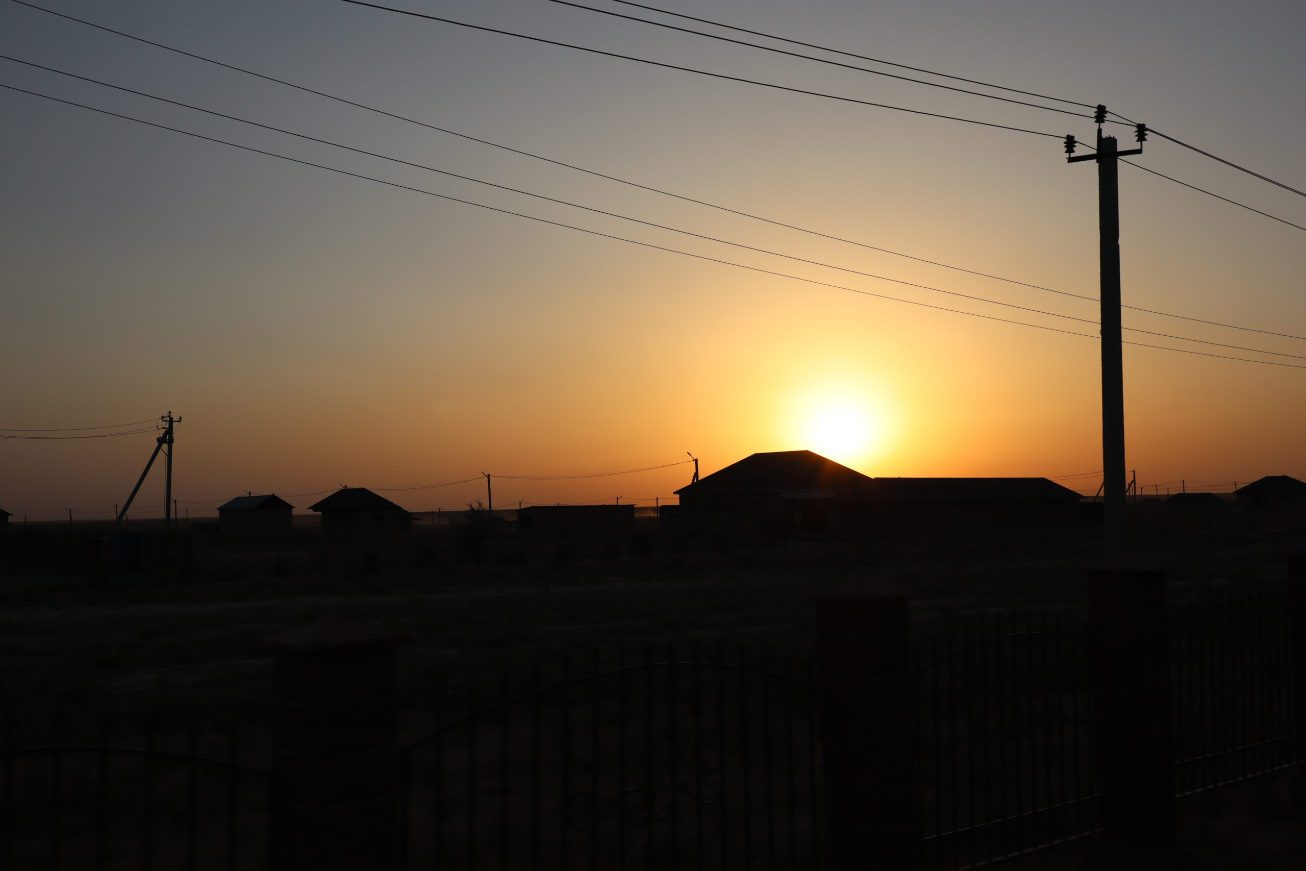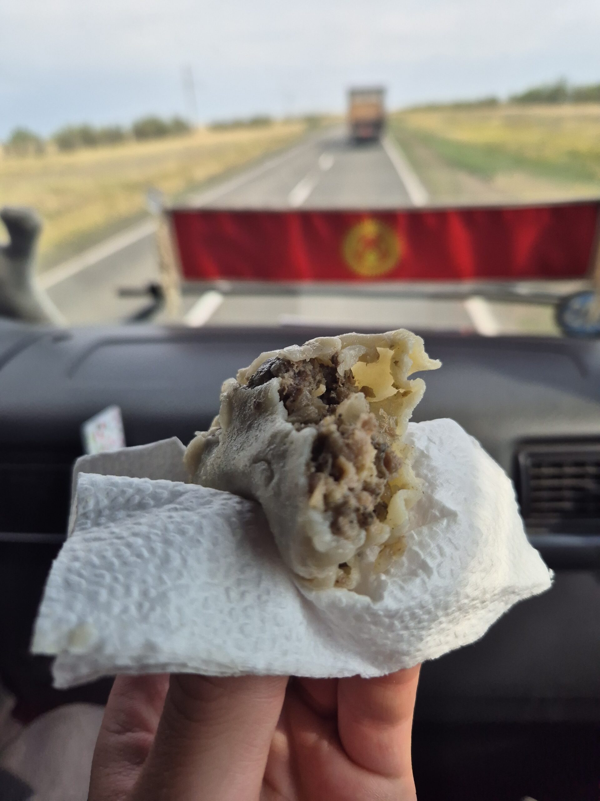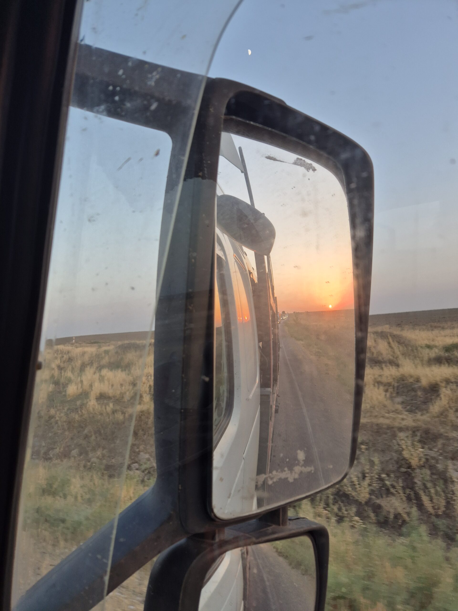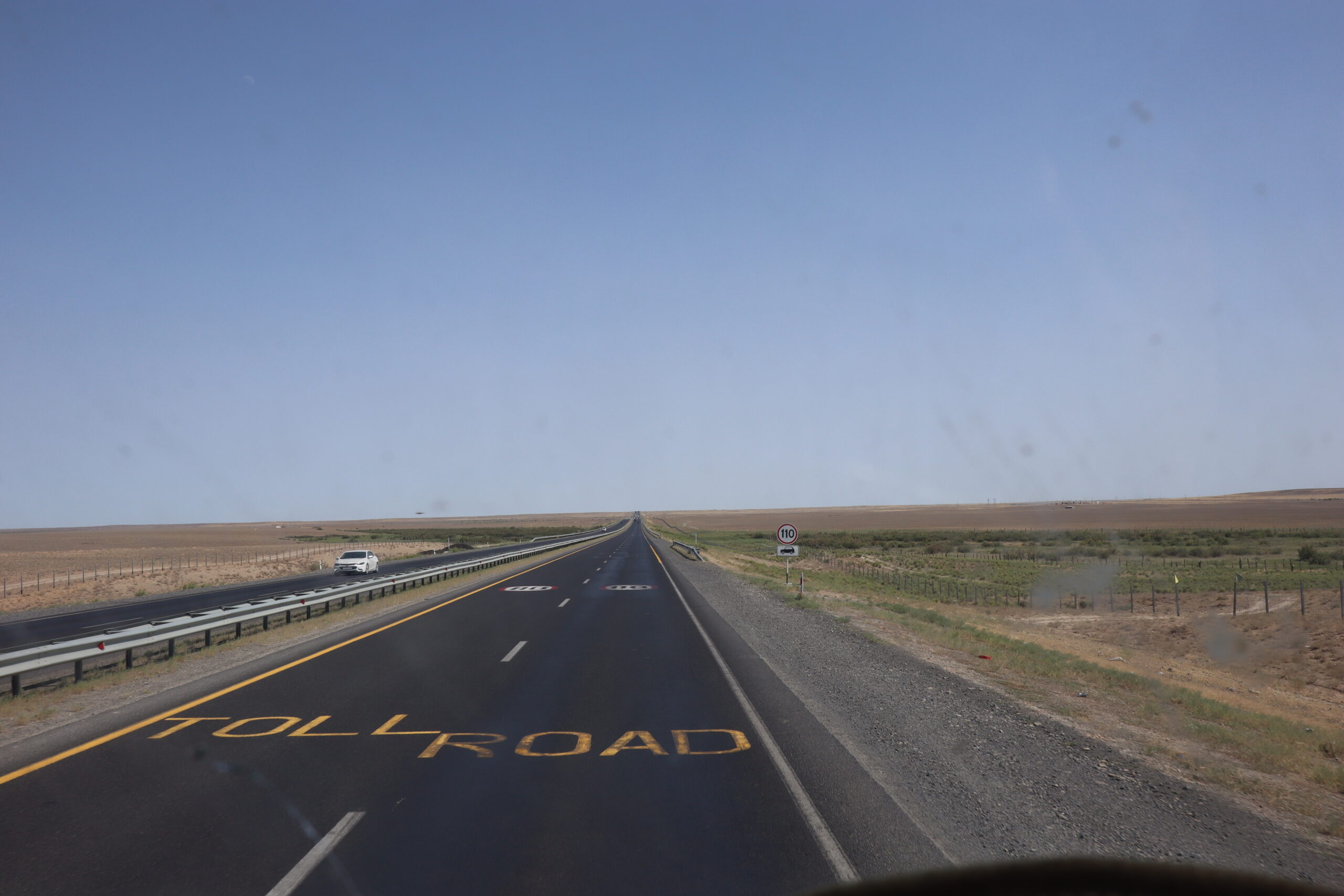 Ich war noch nicht lange an der Straße gen Süden entlanggewandert, als hinter mir ein lautes Hupen erklang. Ich drehte mich um und sah wie ein junger LKW-Fahrer im Fahrerhaus die Hand fragend nach Süden ausstreckte. Ich streckte ebenfalls meine Hand in Richtung Süden aus und der LKW hielt Staub aufwirbelnd an. Während der Lastwagenfahrer den LKW auf Sicherheitsmängel prüfte, hiefte ich meinen Rucksack ins Fahrerhaus und stieg ein. Ulan transportierte Autos und war auf dem Weg nach Hause nach Bischkek, das in Kirgistan liegt. Auf seinem Weg nach Bischkek würde Ulan auch Schymkent passieren und so willigte er ein, mich bis dorthin mitzunehmen. Den restlichen und darauffolgenden Tag verbrachte ich so mit Ulan im Fahrerhaus des Lastwagens. Die endlose Steppe erstreckte sich weit in alle Himmelsrichtungen und regionale Musik aber auch gelegentlich ein deutscher Titel dröhnten aus Ulans Radio. Als es dunkel wurde unterhielten wir uns per Dolmetscher. So konnten wir uns recht effizient unterhalten, zusammen lachen und Missverständnisse aus der Welt räumen, wenn es welche gab. Gelegentlich passierten wir mit dem LKW kleine Kamelherden, die am Straßenrand grasten, oder kleine Dörfer bzw. Raststätten, wo wir Wasser und Samsa (gefüllte Teigtaschen) kauften, um unseren Durst und Hunger zu stillen. Gegen Abend des ersten Tages mit Ulan traf den Lastwagen urplötzlich ein Schwarm großer Heuschrecken. Dumpf zeplatzten sie an der Windschutzscheibe und tropften als gelbe Masse die Scheibe hinunter, dass Ulan bald anhalten musste, um die Scheibe zu reinigen. Fast 900 Kilometer trampte ich an diesem Tag von Krasnosel’skoe bis nach Zhosali, wo Ulan nach über zwölf Stunden Fahrt, um zwei Uhr Nachts, endlich hielt und wir uns schlafen legten. Ulan schlief in der Schlafkabine seines Lastwagens und ich baute mein Zelt gegenüber dem Rastplatz, auf der flachen Ebene Kasachstans auf. Die Mücken waren dreist und bissig und ich musste meinen langärmeligen Wollpullover anziehen, um nicht noch mehr zerstochen zu werden. Das bedeutete aber auch, dass ich in kürzester Zeit komplett durchgeschwitzt war. Denn obwohl die Sonne schon längst untergegangen war und in weniger als vier Stunden wieder aufgehen würde, war es immer noch über deißig Grad Celsius heiß.