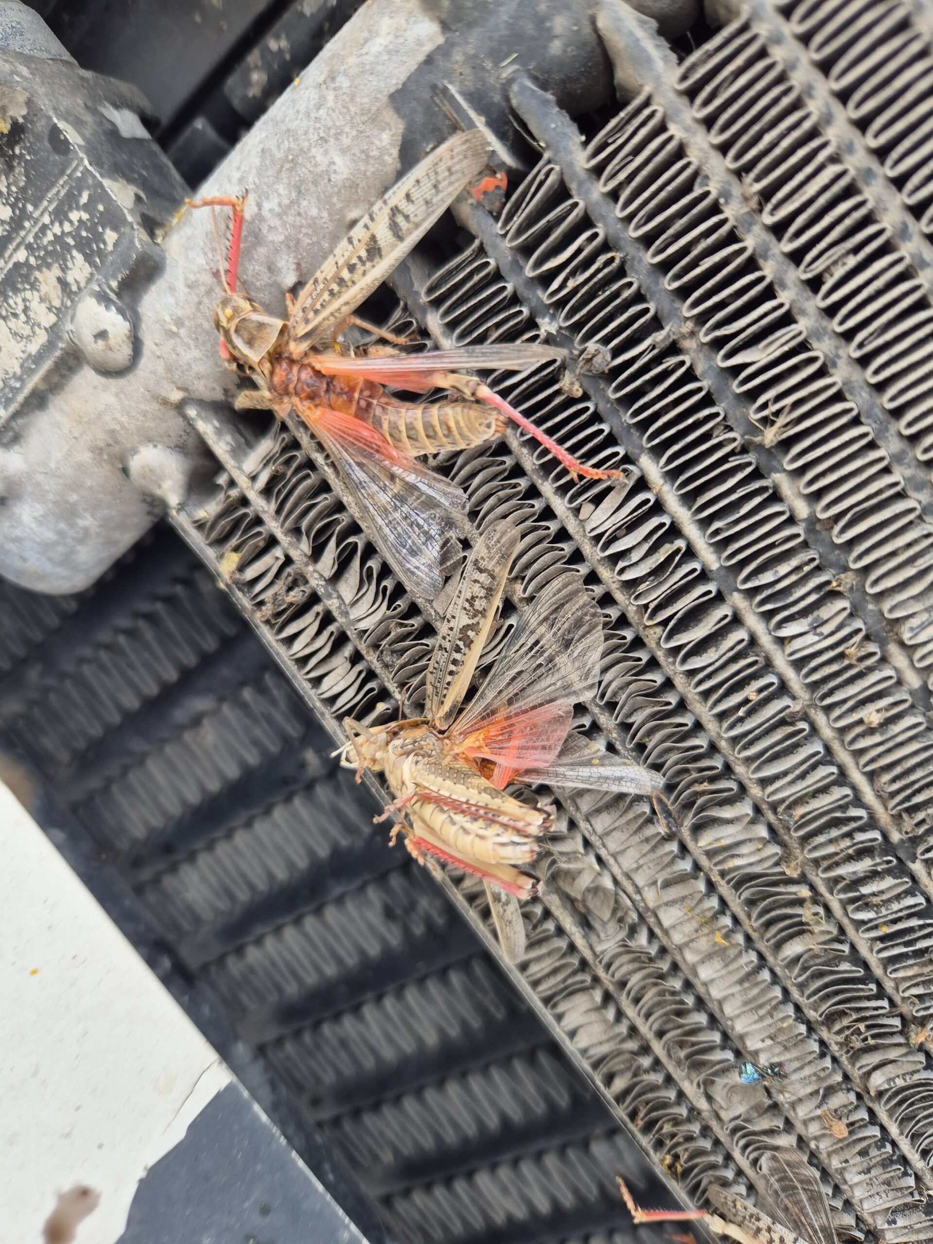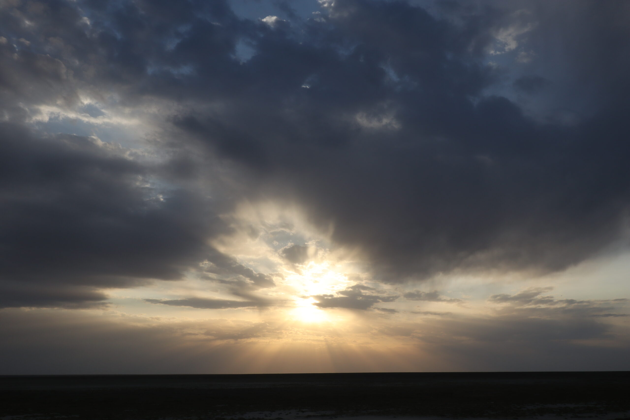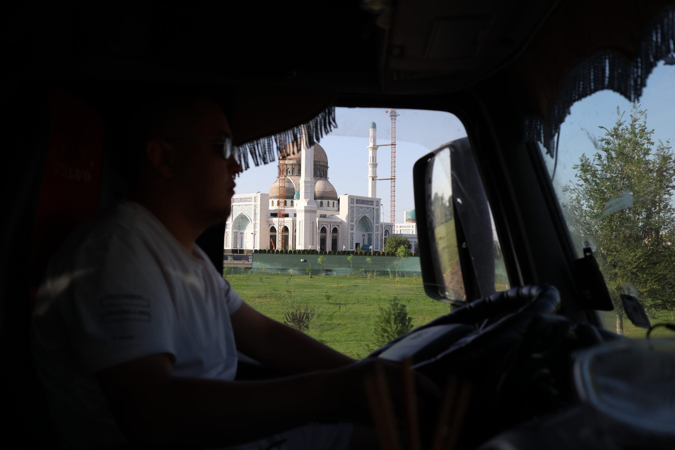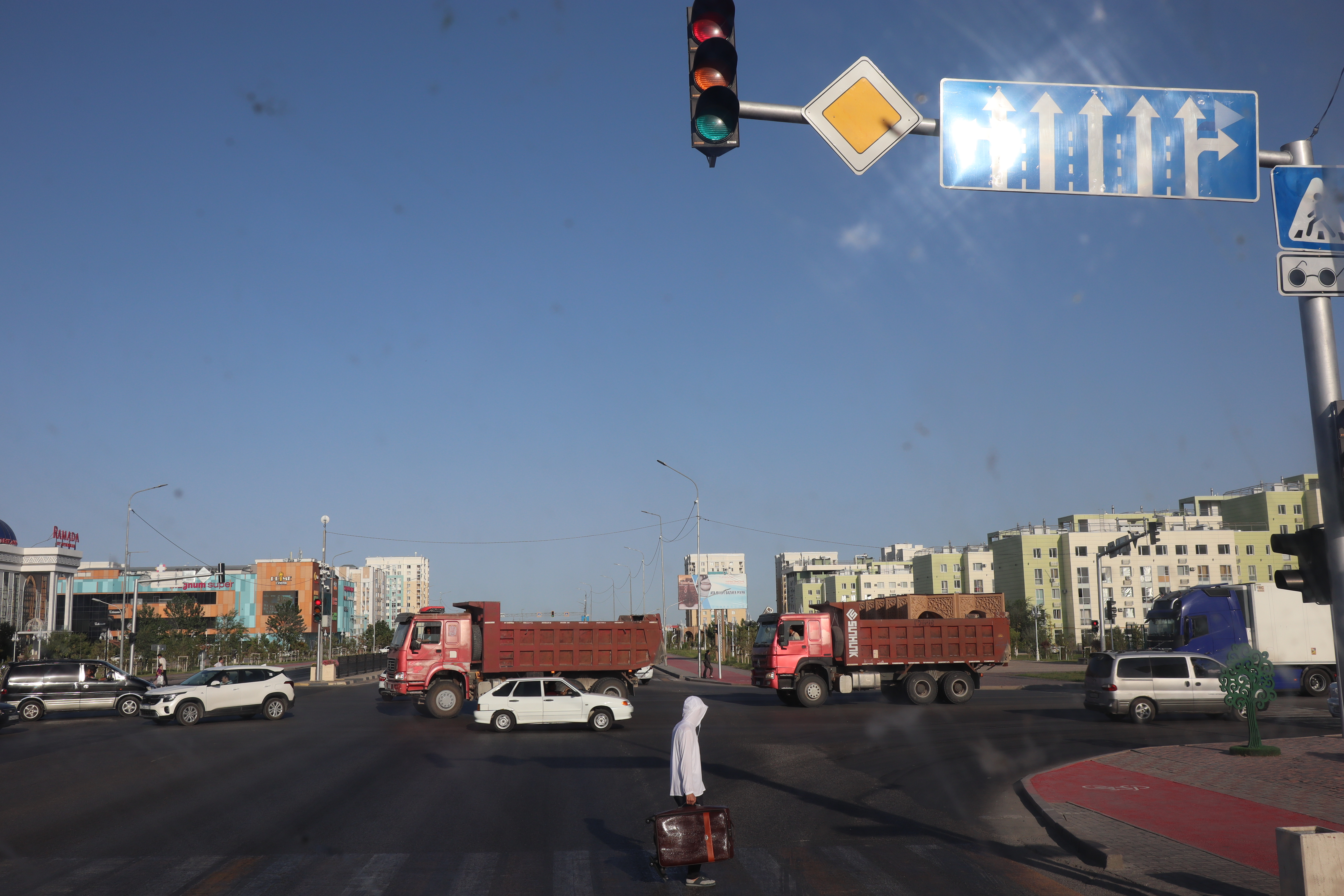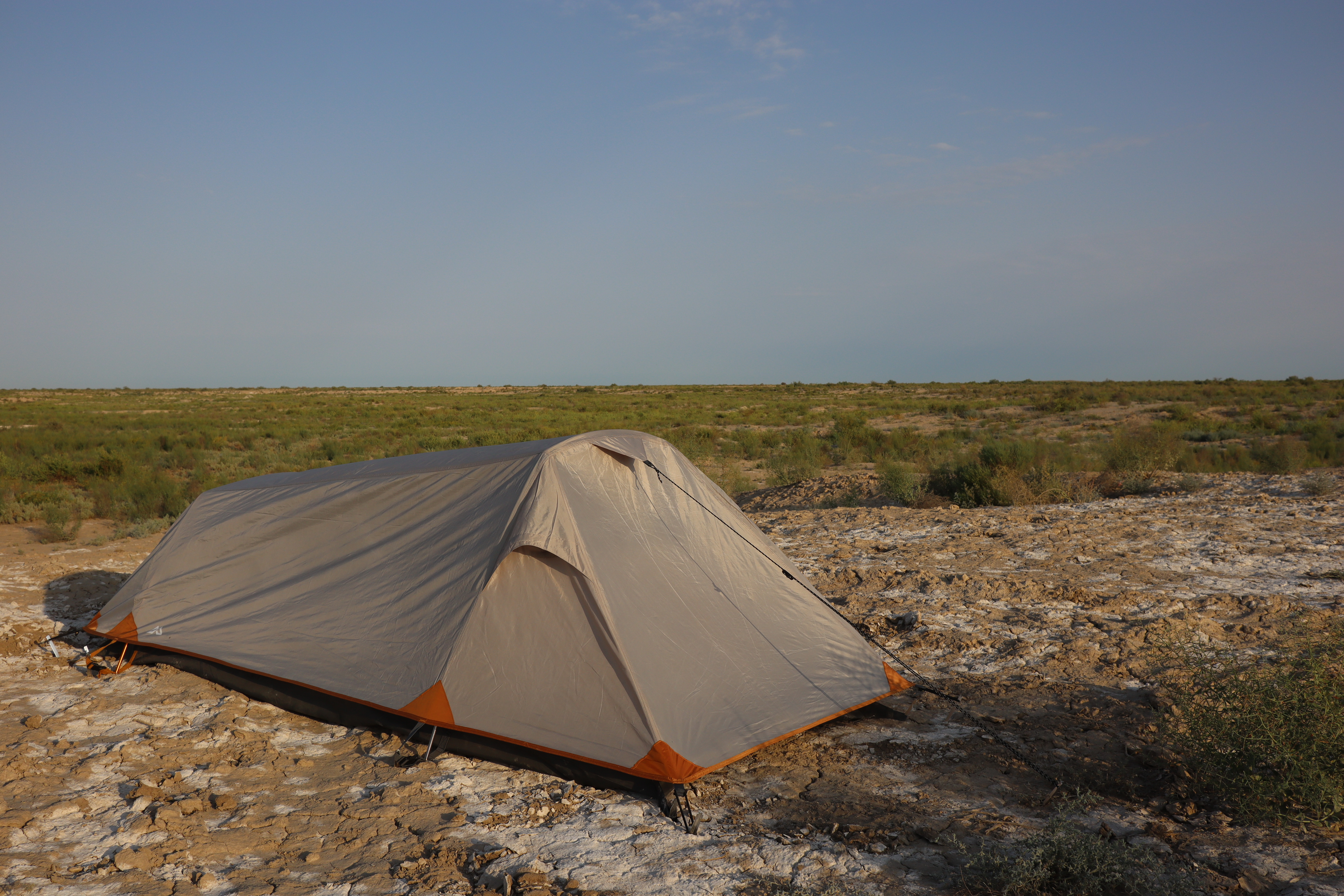 Ich war noch nicht lange an der Straße gen Süden entlanggewandert, als hinter mir ein lautes Hupen erklang. Ich drehte mich um und sah wie ein junger LKW-Fahrer im Fahrerhaus die Hand fragend nach Süden ausstreckte. Ich streckte ebenfalls meine Hand in Richtung Süden aus und der LKW hielt Staub aufwirbelnd an. Während der Lastwagenfahrer den LKW auf Sicherheitsmängel prüfte, hiefte ich meinen Rucksack ins Fahrerhaus und stieg ein. Ulan transportierte Autos und war auf dem Weg nach Hause nach Bischkek, das in Kirgistan liegt. Auf seinem Weg nach Bischkek würde Ulan auch Schymkent passieren und so willigte er ein, mich bis dorthin mitzunehmen. Den restlichen und darauffolgenden Tag verbrachte ich so mit Ulan im Fahrerhaus des Lastwagens. Die endlose Steppe erstreckte sich weit in alle Himmelsrichtungen und regionale Musik aber auch gelegentlich ein deutscher Titel dröhnten aus Ulans Radio. Als es dunkel wurde unterhielten wir uns per Dolmetscher. So konnten wir uns recht effizient unterhalten, zusammen lachen und Missverständnisse aus der Welt räumen, wenn es welche gab. Gelegentlich passierten wir mit dem LKW kleine Kamelherden, die am Straßenrand grasten, oder kleine Dörfer bzw. Raststätten, wo wir Wasser und Samsa (gefüllte Teigtaschen) kauften, um unseren Durst und Hunger zu stillen. Gegen Abend des ersten Tages mit Ulan traf den Lastwagen urplötzlich ein Schwarm großer Heuschrecken. Dumpf zeplatzten sie an der Windschutzscheibe und tropften als gelbe Masse die Scheibe hinunter, dass Ulan bald anhalten musste, um die Scheibe zu reinigen. Fast 900 Kilometer trampte ich an diesem Tag von Krasnosel’skoe bis nach Zhosali, wo Ulan nach über zwölf Stunden Fahrt, um zwei Uhr Nachts, endlich hielt und wir uns schlafen legten. Ulan schlief in der Schlafkabine seines Lastwagens und ich baute mein Zelt gegenüber dem Rastplatz, auf der flachen Ebene Kasachstans auf. Die Mücken waren dreist und bissig und ich musste meinen langärmeligen Wollpullover anziehen, um nicht noch mehr zerstochen zu werden. Das bedeutete aber auch, dass ich in kürzester Zeit komplett durchgeschwitzt war. Denn obwohl die Sonne schon längst untergegangen war und in weniger als vier Stunden wieder aufgehen würde, war es immer noch über deißig Grad Celsius heiß.