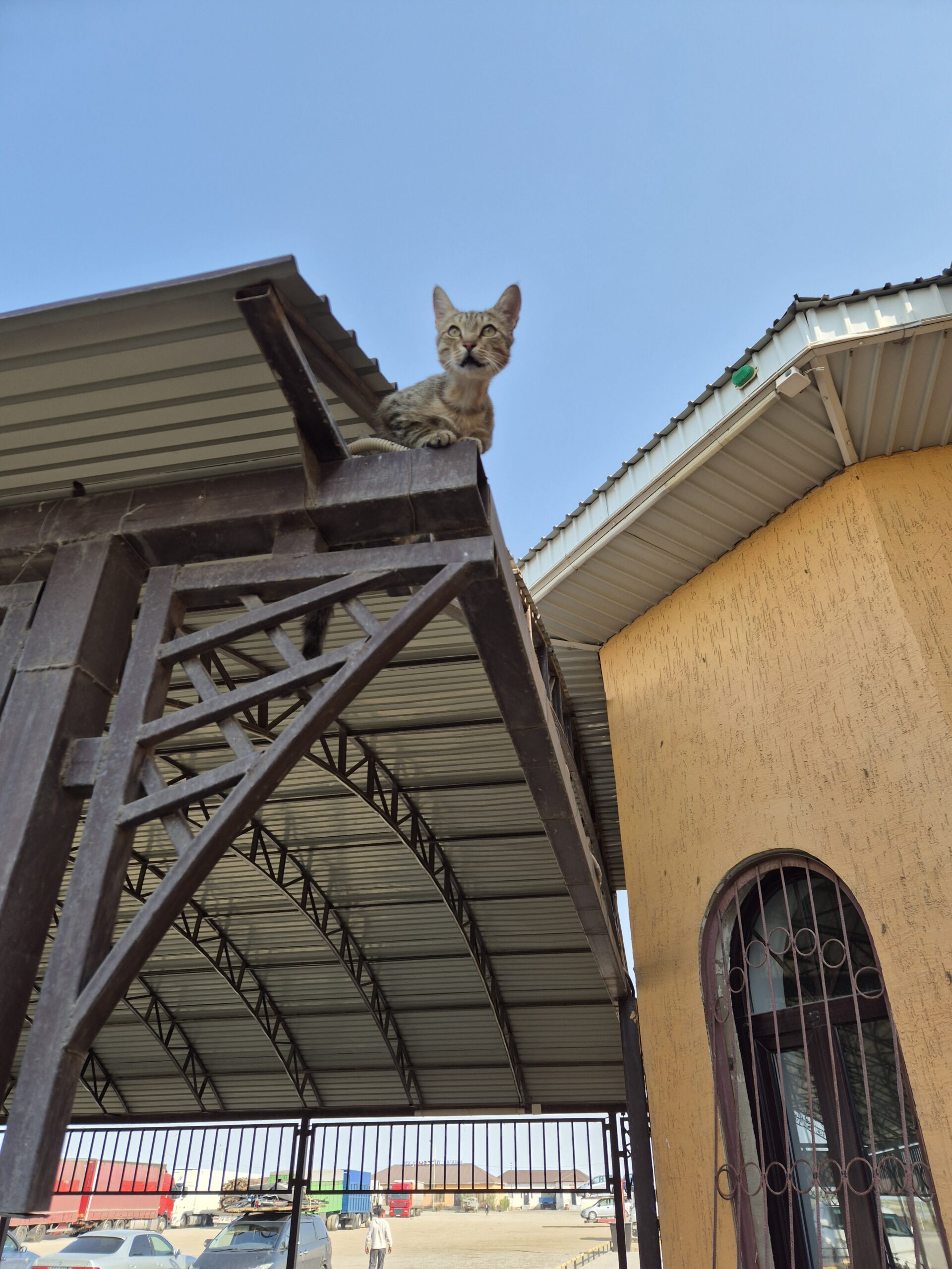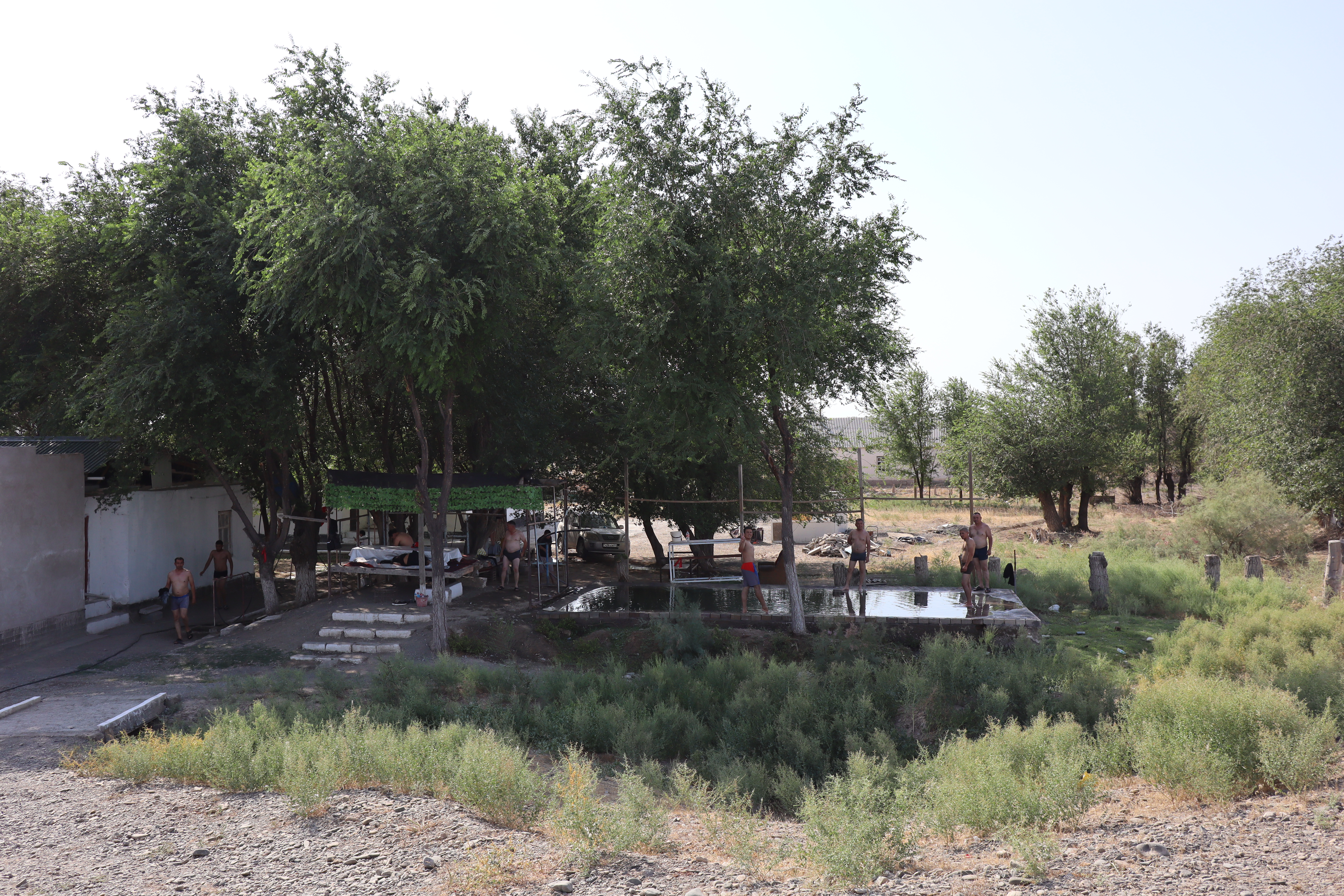 Wie erwartet bekam ich nur wenig Schlaf. Bereits um kurz vor sechs brannte die Sonne so heiß auf mein Zelt, dass ich es dort nicht mehr aushielt, das Zelt abbaute und Zuflucht unter dem schattigen Dach der Raststätte suchten musste, wo zwei Hunde eine Katze auf die Dachbalken gescheucht hatten und alle drei mich nun fraged anschauten, ob ich wohl ihr Problem lösen würde. Ohne einzugreifen setzte ich mich auf eine Bank im Schatten, trank Wasser aus einer gerade gekauften Flasche und wartete darauf, dass Ulan aufwachte. So startete ich recht müde in den 03.07.2025. Zum Frühstück gab es herzhaftes Schurpa, eine Suppe aus Lammfleisch und verschiedenen Gemüsesorten. Dann brachen wir wieder gen Süden auf, schließlich bewältigten sich die Kilometer nich von alleine. Während die Temperaturen außerhalb der Fahrerkabine immer weiter in die Höhe kletterten und schon bald über vierzig Grad Celsius erreichten, verfügte der Lastwagen glücklicherweise über eine funktionierende Klimaanlage und hielt uns einigermaßen kühl. Jedes mal wenn wir anhielten, um zu tanken, Wasser zu kaufen oder auf toilette zu gehen, war das Öffnen der Lastwagentür wie ein heißer Schlag ins Gesicht. Um so froher waren wir, gegen Mittag ein kleines Schwimmbecken im Grünen zu entdecken. Wie eine kleine Oase tauchte die Raststätte zu unserer Linken auf und wir zögerten nicht lange, hielten an und gesellten uns zu den anderen badenden Menschen, die das kühle und erfrischende Nass in dieser Hitze genossen. Schon bald war ich der soziale Knotenpunkt am Schwimmbeckenrand und musste meine Tauch- und Springfertigkeiten zum Besten geben, während alle versuchten mich nachzuahmen. Besonders der Seemansköpper fiel den meisten sehr schwer, da sich beim Sprung mit angelegten Händen am Körper, der natürliche Überlebensinstinkt den Kopf zu schützen einschaltet und man diesen Reflex schlecht abschalten kann. Das Wasser war so kalt, das ich tatsächlich kurzzeitig fror, doch wieder zurück im Lastwagen wünschte ich mich sehr schnell zurück ins kühle Nass, das wir schon sehr bald wieder weit hinter uns gelassen hatten. Wir passierten Qysylorda und Türkystan und gegen 20:30 Uhr auch Schymkent. Ich verabschiedete mich von Ulan und bedankte mich für die 1300 Kilometer, die er mich bis nach Shymkent mitgenommen hatte – was eine Distanz! Bis ins Zentrum von Schymkent waren es noch über fünfzehn Kilometer. Glücklicherweise wurde ich schnell mitgenommen und musste anschließend nur fünf Kilometer laufen. Es war schwül und heiß – grob immer noch 36 °C – und ich hatte großen Hunger. Nachdem ich meine Bleibe für die Nacht gefunden und mich einquatiert hatte, machte ich mich so schnell wie möglich auf die Suche nach etwas Leckerem und Essbaren. Ich kaufte Lebensmittel wie Reis, Wasser und eine saftige Melone. Zusätzlich entschied ich mich neben dem Einkauf auch für einen Schawarma vom Händler an der Straße, direkt auf die Hand. Gierig verschlang ich den Schawarma. Ein großer Fehler. Keine dreißig Minuten nach dem Verzehr begann es gewaltig in meinem Bauch zu rumoren. Ich hatte mir soeben meine nächste Lebensmittelvergiftung eingefangen.