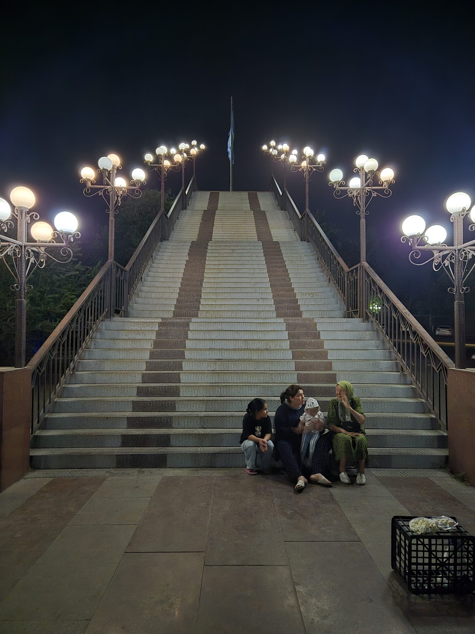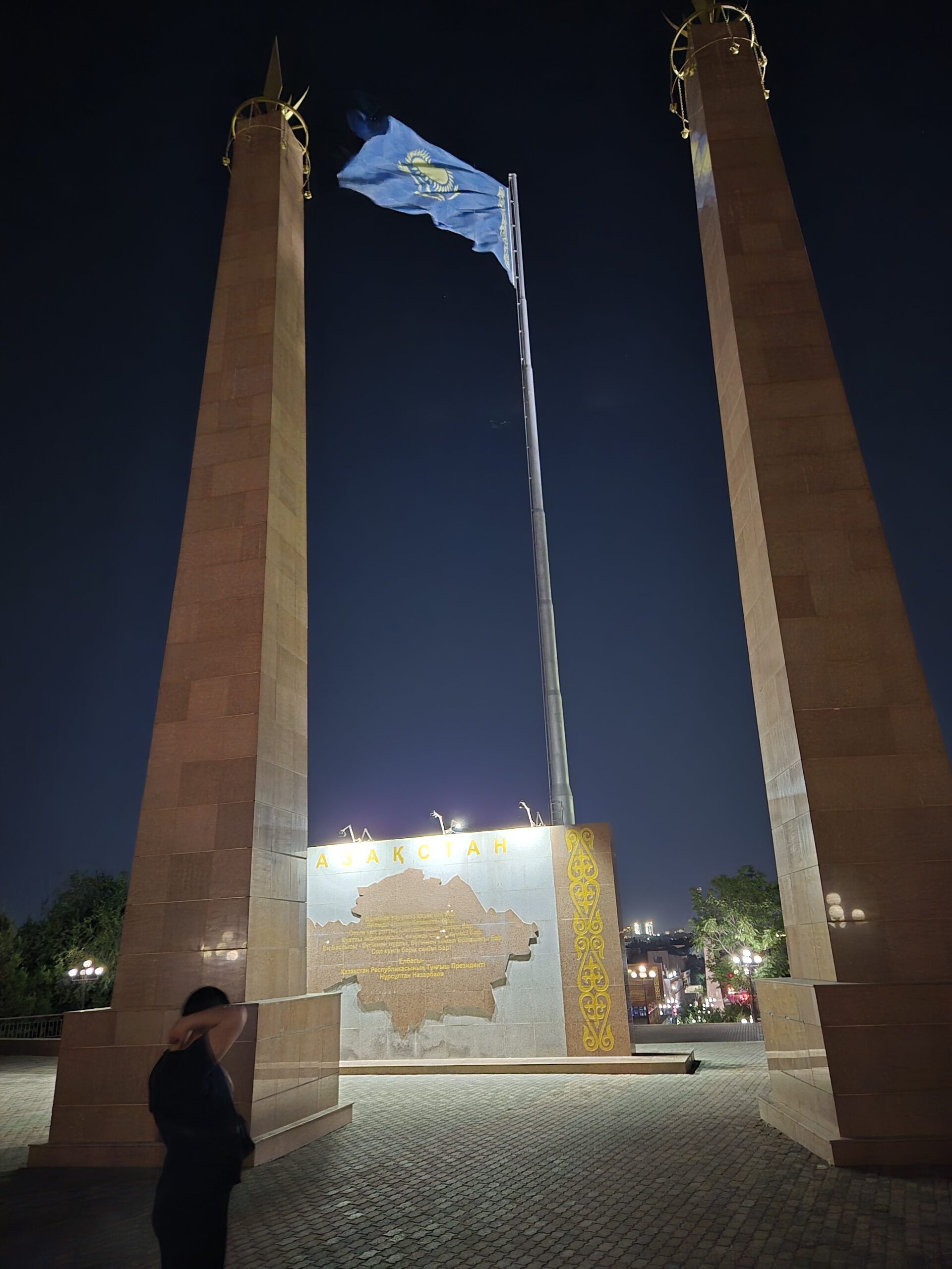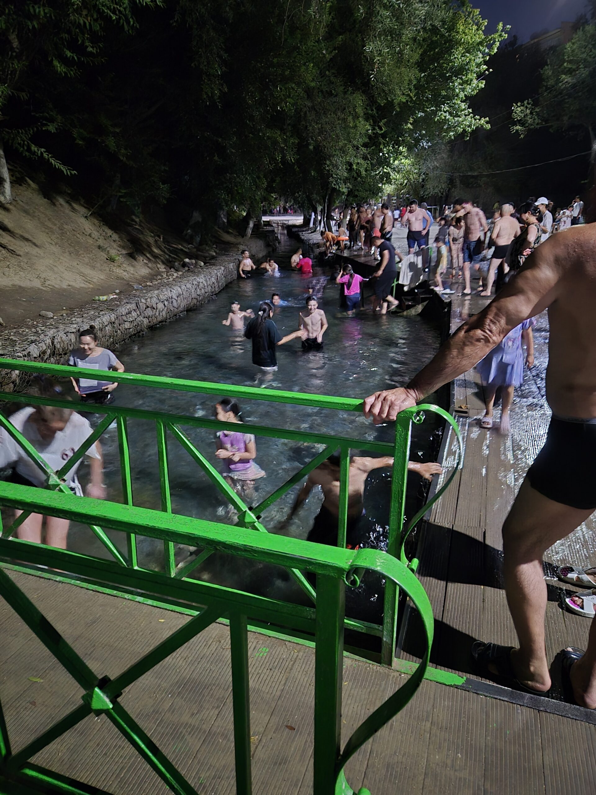 Am Mittag des 05.07.2025 ging es mir soweit so gut, dass ich mich mit Kyanish in der klimatissierten Einkaufsmeile von Schymkent auf ein kaltes Getränk treffen konnte. Ich hatte Kyanish über Couchsurfing kennen gelernt. Nachdem wir den Nachmittag bei Kyanish Zuhause im Kühlen totgeschlagen hatten und ich anschließend meine Sachen in ein teureres aber besser klimatisiertes Hostel gebracht hatte, zeigte er mir Schymkent bei Abenddämmerung und bei Nacht. Besonders die Frischwasserquelle in der Nähe des Unabhängigkeitsparks, an der die ganze Stadt zusammen zu kommen schien, war ein Highlight. Mit Kanistern und Flaschen beladen pilgerten die Einheimischen zur Wasserquelle mitten im grünen Park und füllten ihre Wasservorräte für die nächsten Tage auf. Keine zweihundert Meter weiter wurde im selben Strom dann bereits gebadet. Ein Gewimmel bei Nacht wie in einem Ameisenhaufen. Familien, Freunde und Bekannte kamen zusammen, um sich endlich von der Hitze zu befreien und den Schweiß des Tages abzuwaschen.