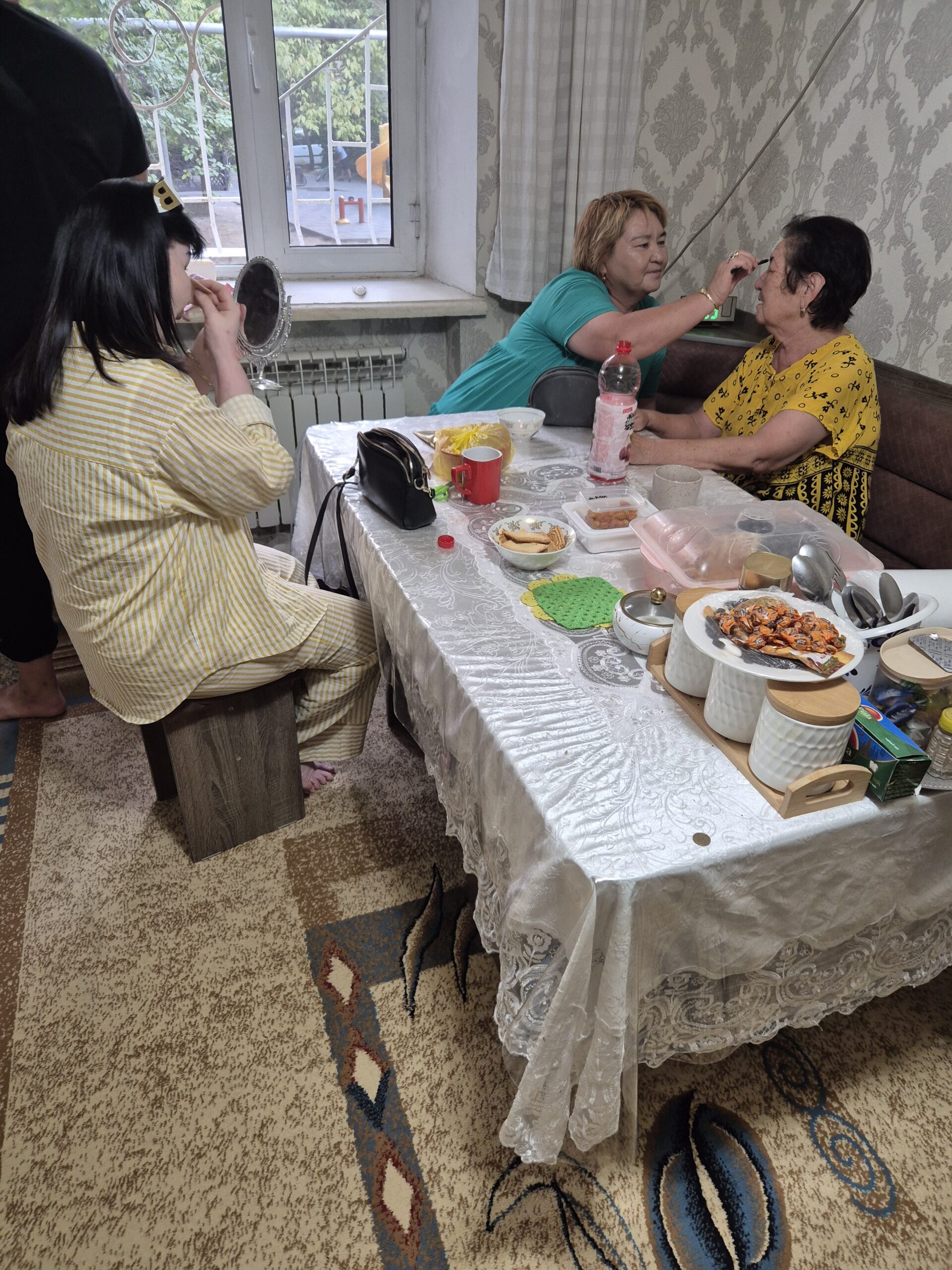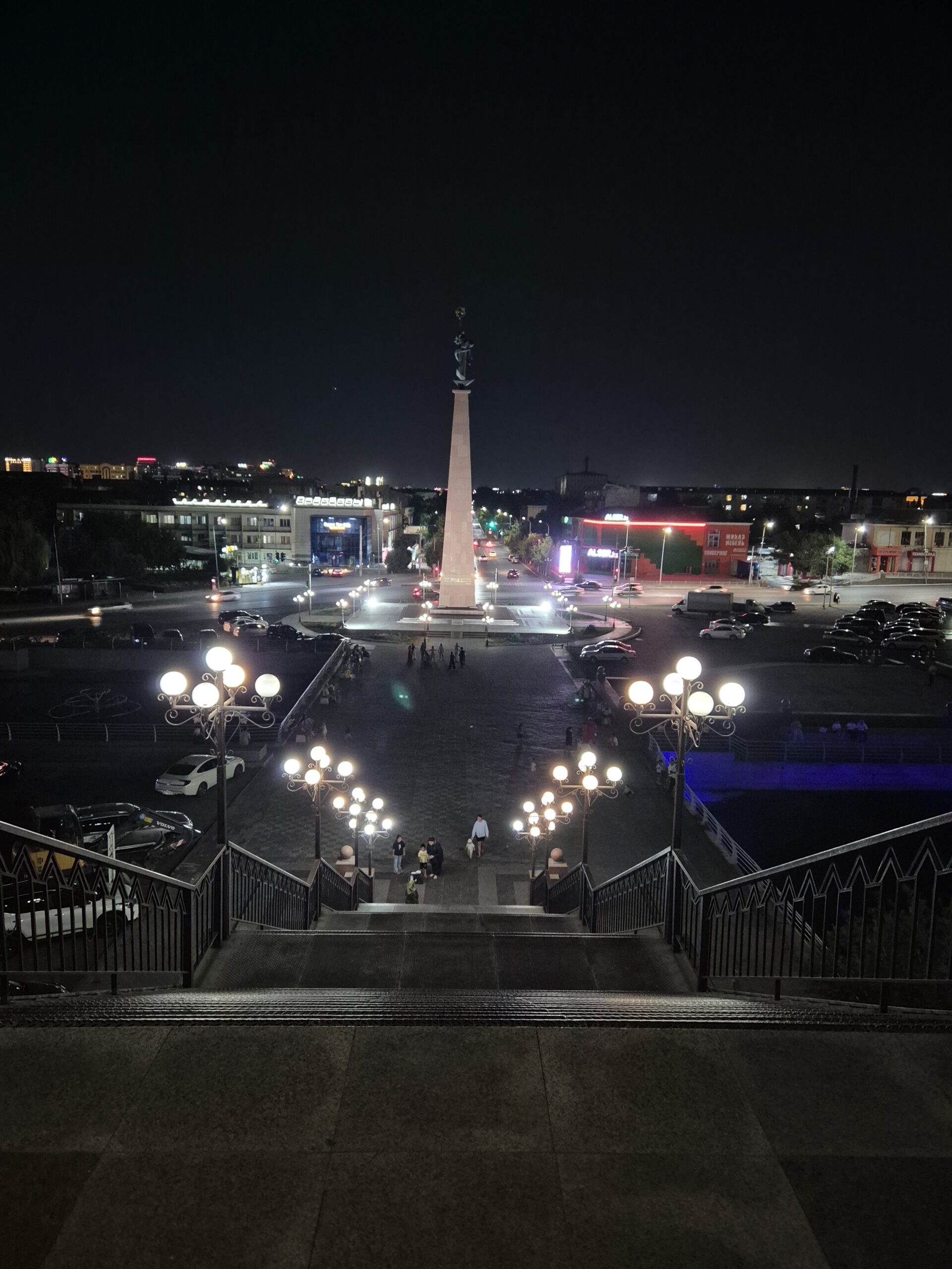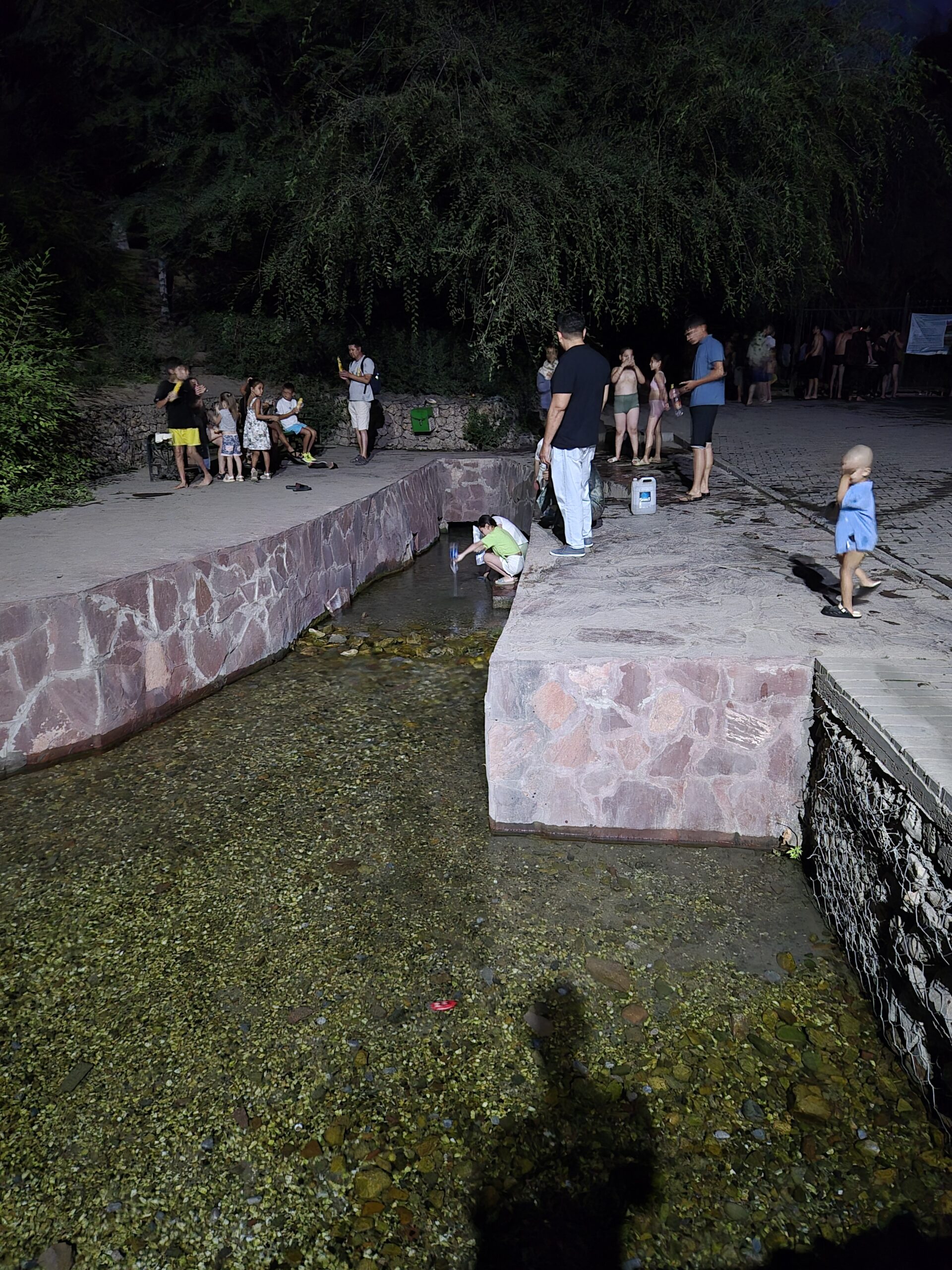 Am Mittag des 05.07.2025 ging es mir soweit so gut, dass ich mich mit Kyanish in der klimatissierten Einkaufsmeile von Schymkent auf ein kaltes Getränk treffen konnte. Ich hatte Kyanish über Couchsurfing kennen gelernt. Nachdem wir den Nachmittag bei Kyanish Zuhause im Kühlen totgeschlagen hatten und ich anschließend meine Sachen in ein teureres aber besser klimatisiertes Hostel gebracht hatte, zeigte er mir Schymkent bei Abenddämmerung und bei Nacht. Besonders die Frischwasserquelle in der Nähe des Unabhängigkeitsparks, an der die ganze Stadt zusammen zu kommen schien, war ein Highlight. Mit Kanistern und Flaschen beladen pilgerten die Einheimischen zur Wasserquelle mitten im grünen Park und füllten ihre Wasservorräte für die nächsten Tage auf. Keine zweihundert Meter weiter wurde im selben Strom dann bereits gebadet. Ein Gewimmel bei Nacht wie in einem Ameisenhaufen. Familien, Freunde und Bekannte kamen zusammen, um sich endlich von der Hitze zu befreien und den Schweiß des Tages abzuwaschen.