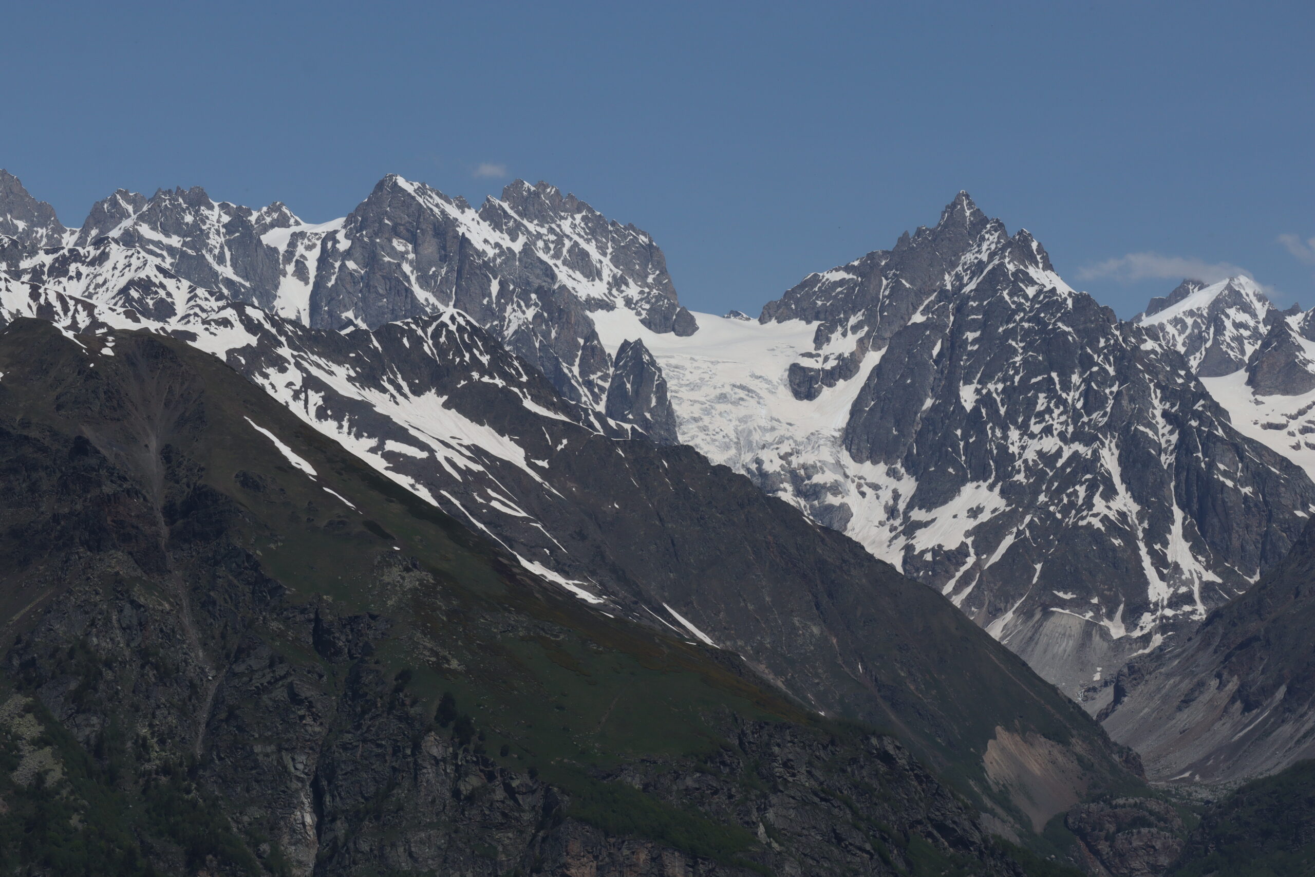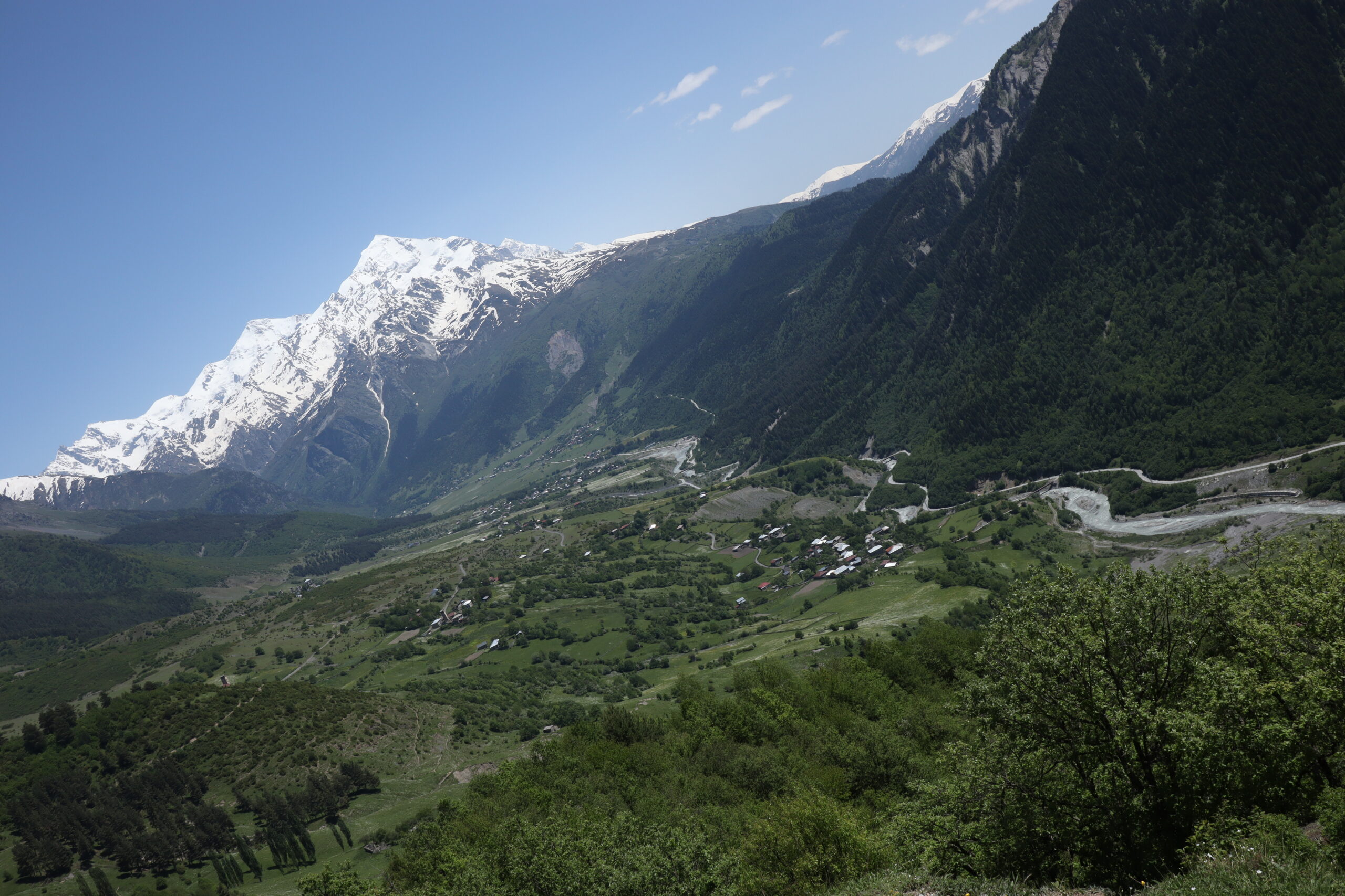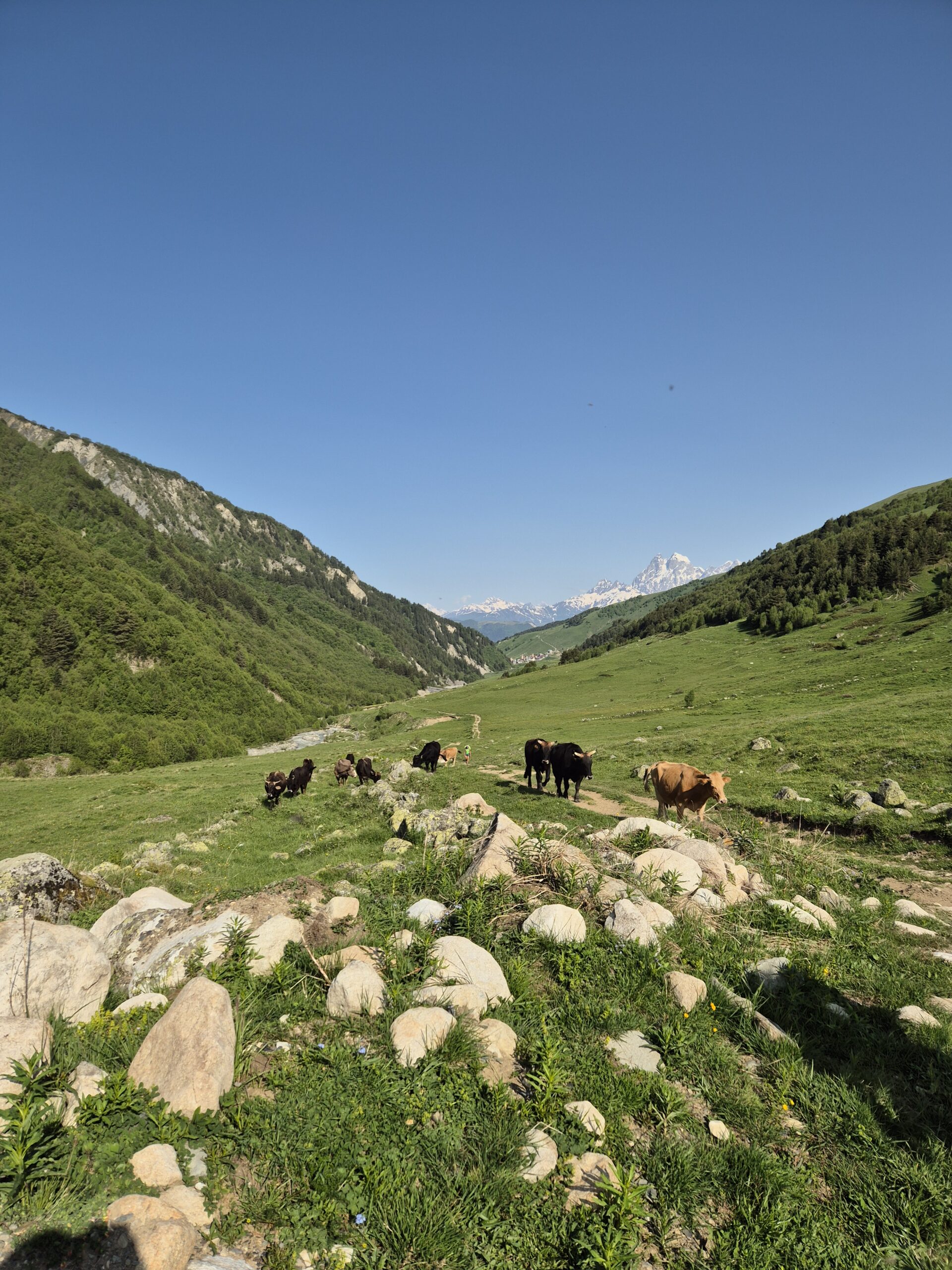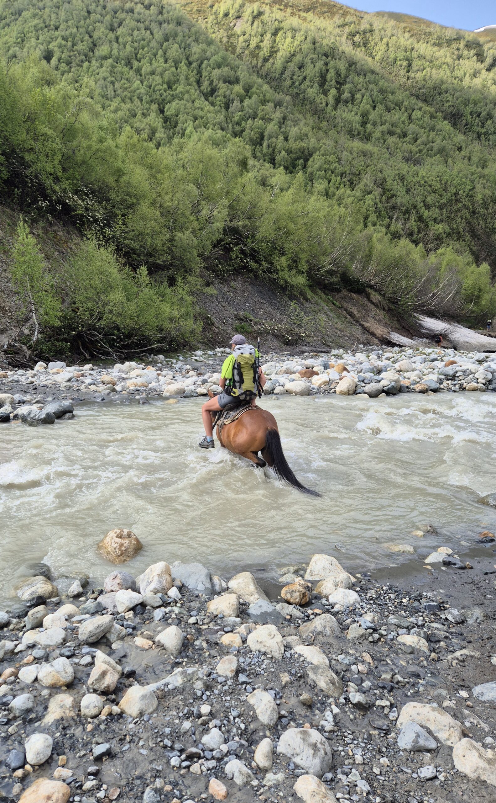 Bestmöglich regeneriert und nach einem ebenso reichhaltigen Frühstück wie Abendbrot, brachen wir am Morgen des 10.06.2025 zur dritten Etappe auf. Pünktlich um 8 Uhr wanderten wir los. Dieses mal allerdings schlängelte sich der Wanderweg zuerst lange leicht ansteigend durch das Tal, bevor er an einem reißenden Bergfluss endete, der überquert werden musste. Auf der Suche nach einer Möglichkeit den Fluss zu Fuß zu überqueren kraxelten wir zunächst eine Zeitlang das Flussbett flussaufwärts entlang. Doch Zeit war heute eine wertvolle Recource und so nahmen wir die Dienste der Lokalen Bevölkerung für 20 Lari in Anspruch und überquerten den stark stömenden Fluss auf dem Rücken eines Pferdes. Schaukelnd aber trocken gelangte jeder so ans andere Ufer. Selbst an der Stelle, an der die Lokals ihre Pferde den Fluss überqueren ließen, war der Fluss über einen Meter tief und die Pferde selbst hatten manchmal Schwierigkeiten den Fluss zu überqueren. Am Ende war ich einfach nur froh drüben zu sein. Die nächsten drei folgenden Kilometer bildeten den letzten großen Anstieg und insgesamt höchsten Punkt der Wandertour. Wie am gestrigen Tag gab Andrea das Tempo vor und Schritt für Schritt ging es den Hang hinauf. Ein fantastischer Ausblick auf Gletscher und umliegende Berge begleitete den Aufstieg.