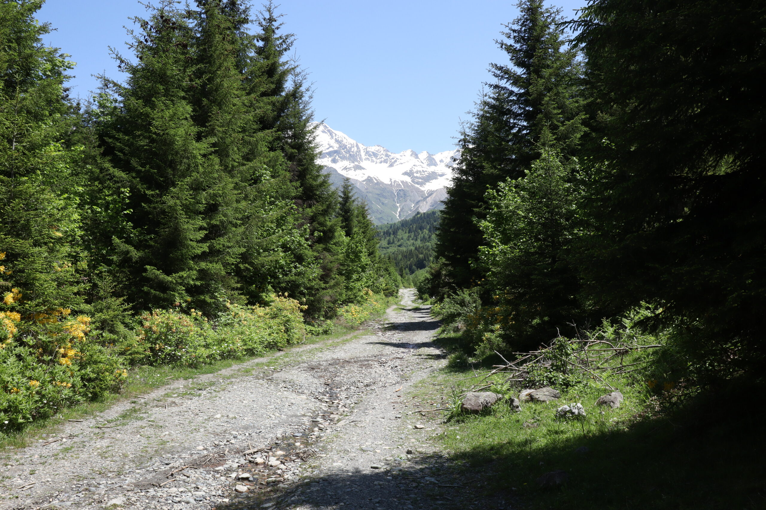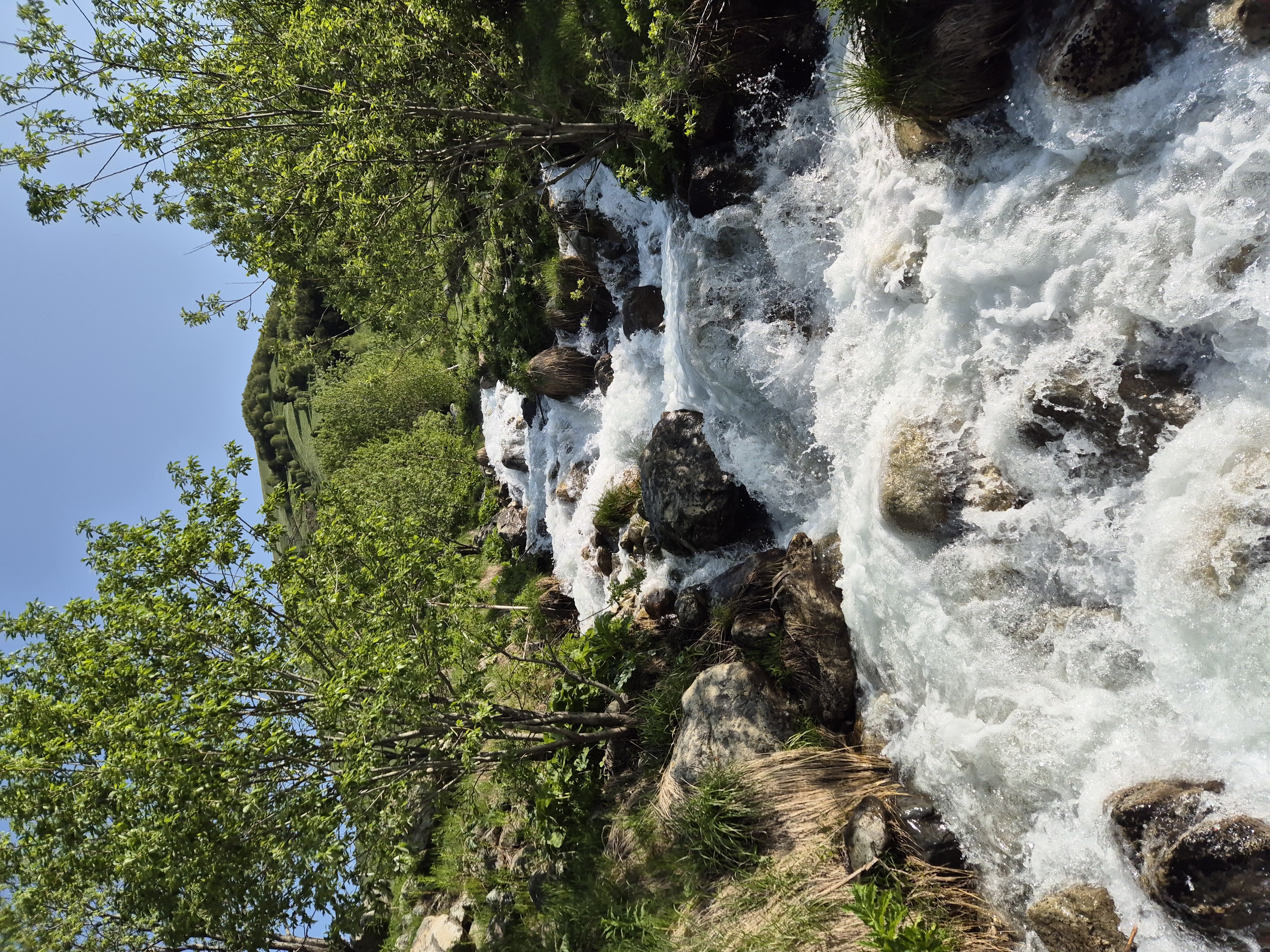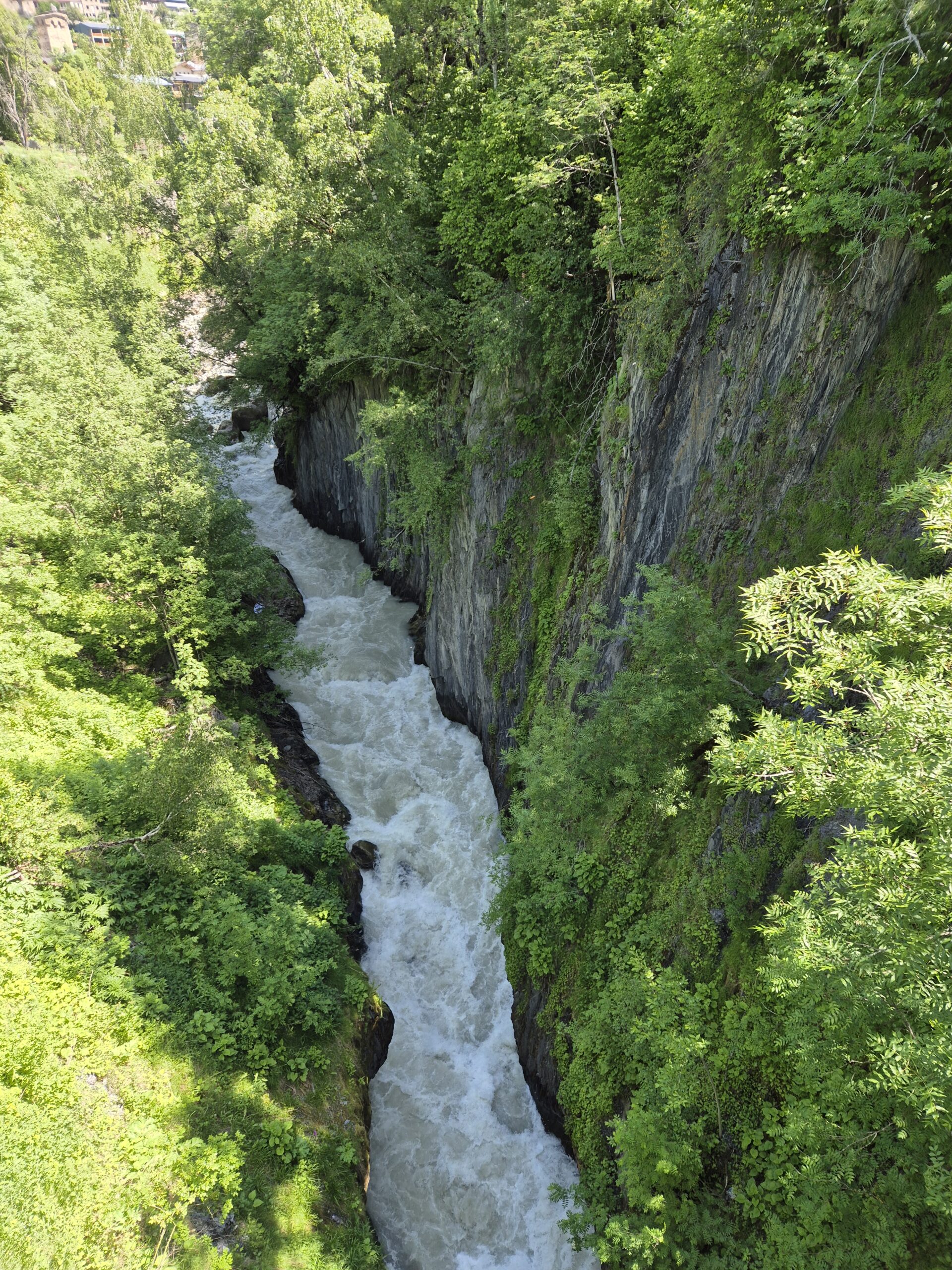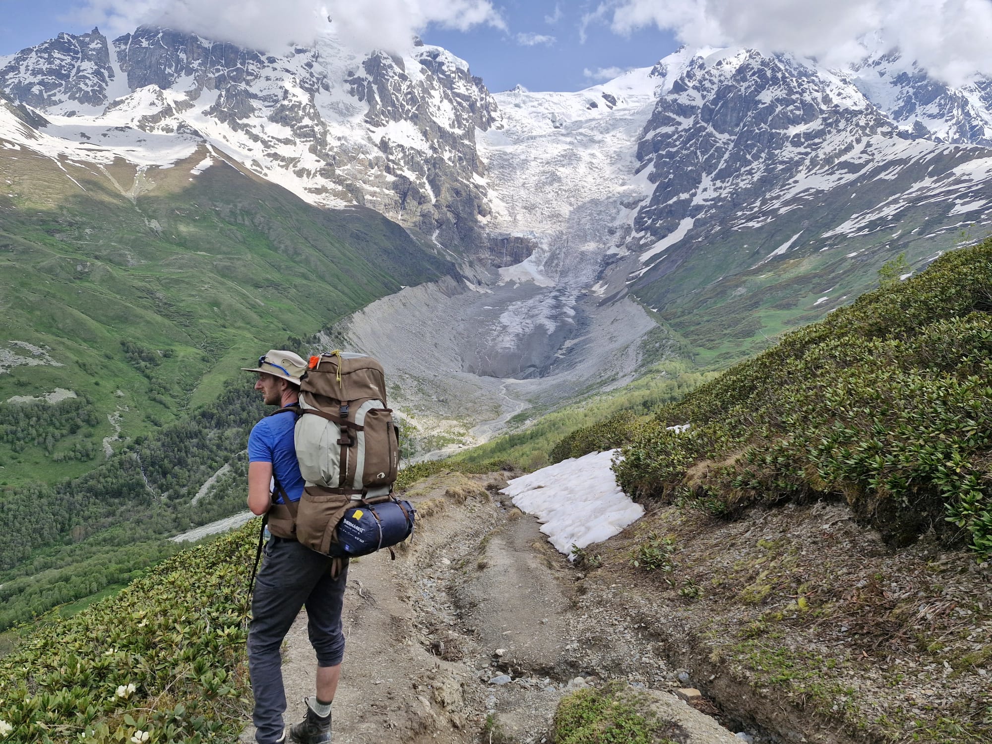Bestmöglich regeneriert und nach einem ebenso reichhaltigen Frühstück wie Abendbrot, brachen wir am Morgen des 10.06.2025 zur dritten Etappe auf. Pünktlich um 8 Uhr wanderten wir los. Dieses mal allerdings schlängelte sich der Wanderweg zuerst lange leicht ansteigend durch das Tal, bevor er an einem reißenden Bergfluss endete, der überquert werden musste. Auf der Suche nach einer Möglichkeit den Fluss zu Fuß zu überqueren kraxelten wir zunächst eine Zeitlang das Flussbett flussaufwärts entlang. Doch Zeit war heute eine wertvolle Recource und so nahmen wir die Dienste der Lokalen Bevölkerung für 20 Lari in Anspruch und überquerten den stark stömenden Fluss auf dem Rücken eines Pferdes. Schaukelnd aber trocken gelangte jeder so ans andere Ufer. Selbst an der Stelle, an der die Lokals ihre Pferde den Fluss überqueren ließen, war der Fluss über einen Meter tief und die Pferde selbst hatten manchmal Schwierigkeiten den Fluss zu überqueren. Am Ende war ich einfach nur froh drüben zu sein. Die nächsten drei folgenden Kilometer bildeten den letzten großen Anstieg und insgesamt höchsten Punkt der Wandertour. Wie am gestrigen Tag gab Andrea das Tempo vor und Schritt für Schritt ging es den Hang hinauf. Ein fantastischer Ausblick auf Gletscher und umliegende Berge begleitete den Aufstieg.
