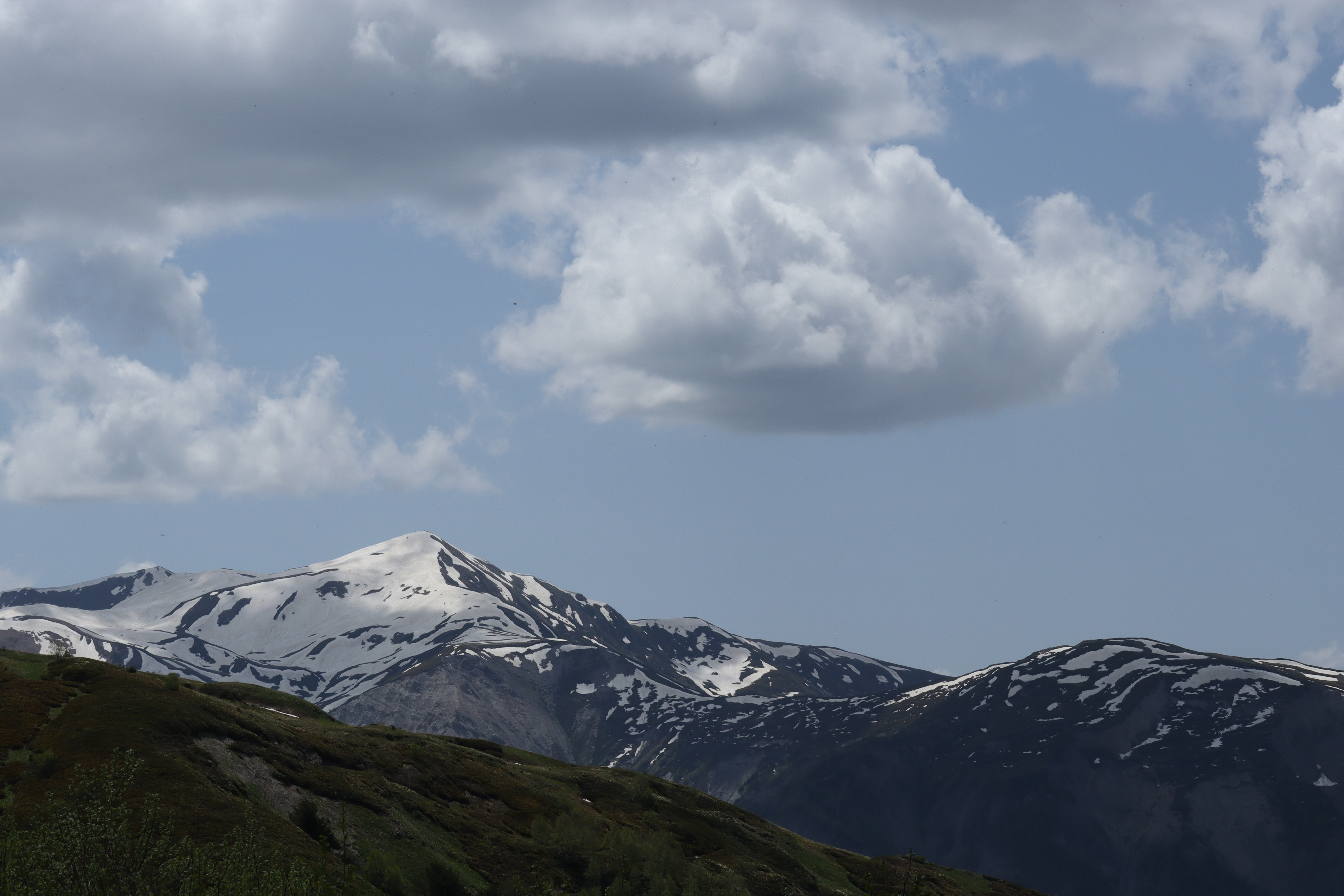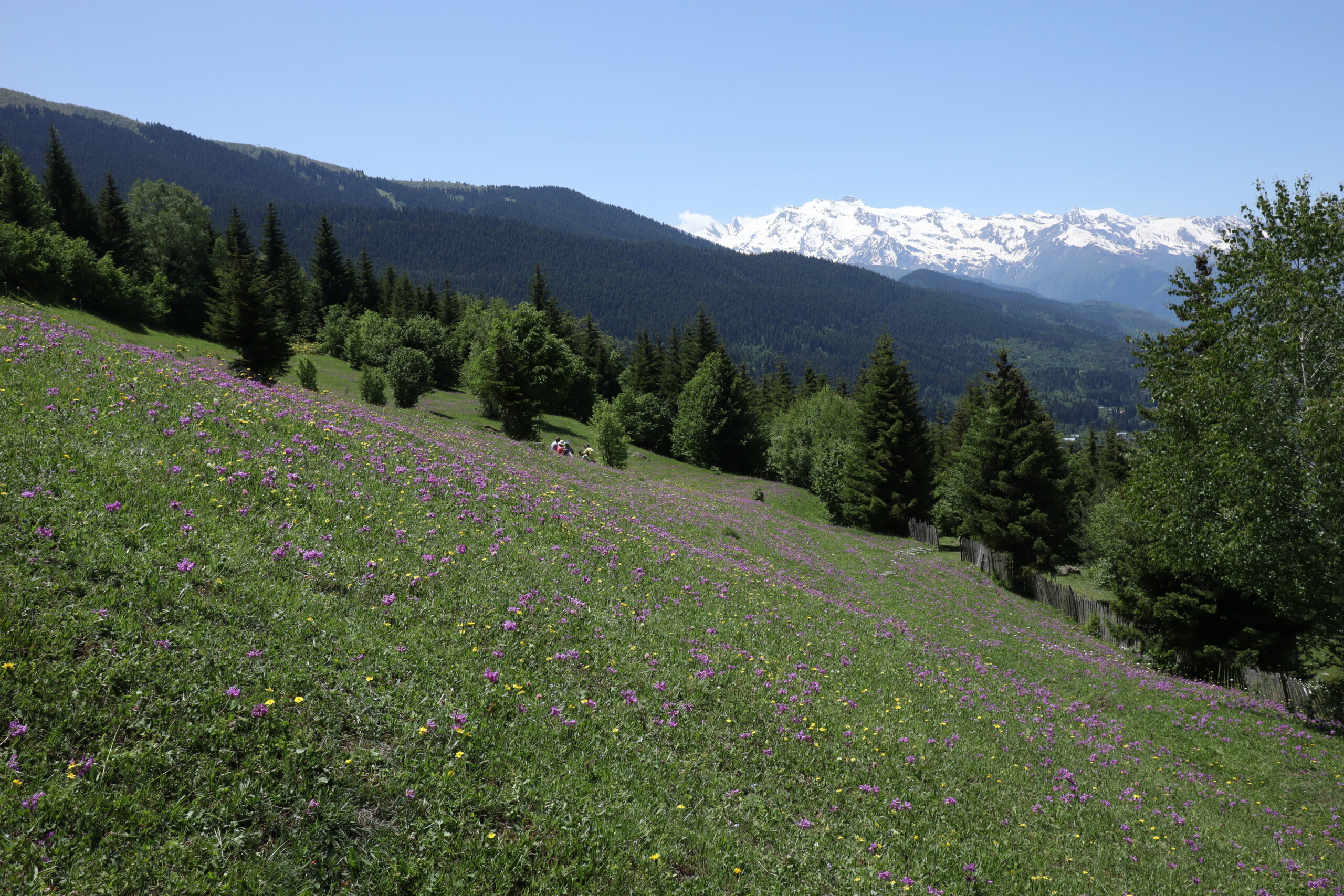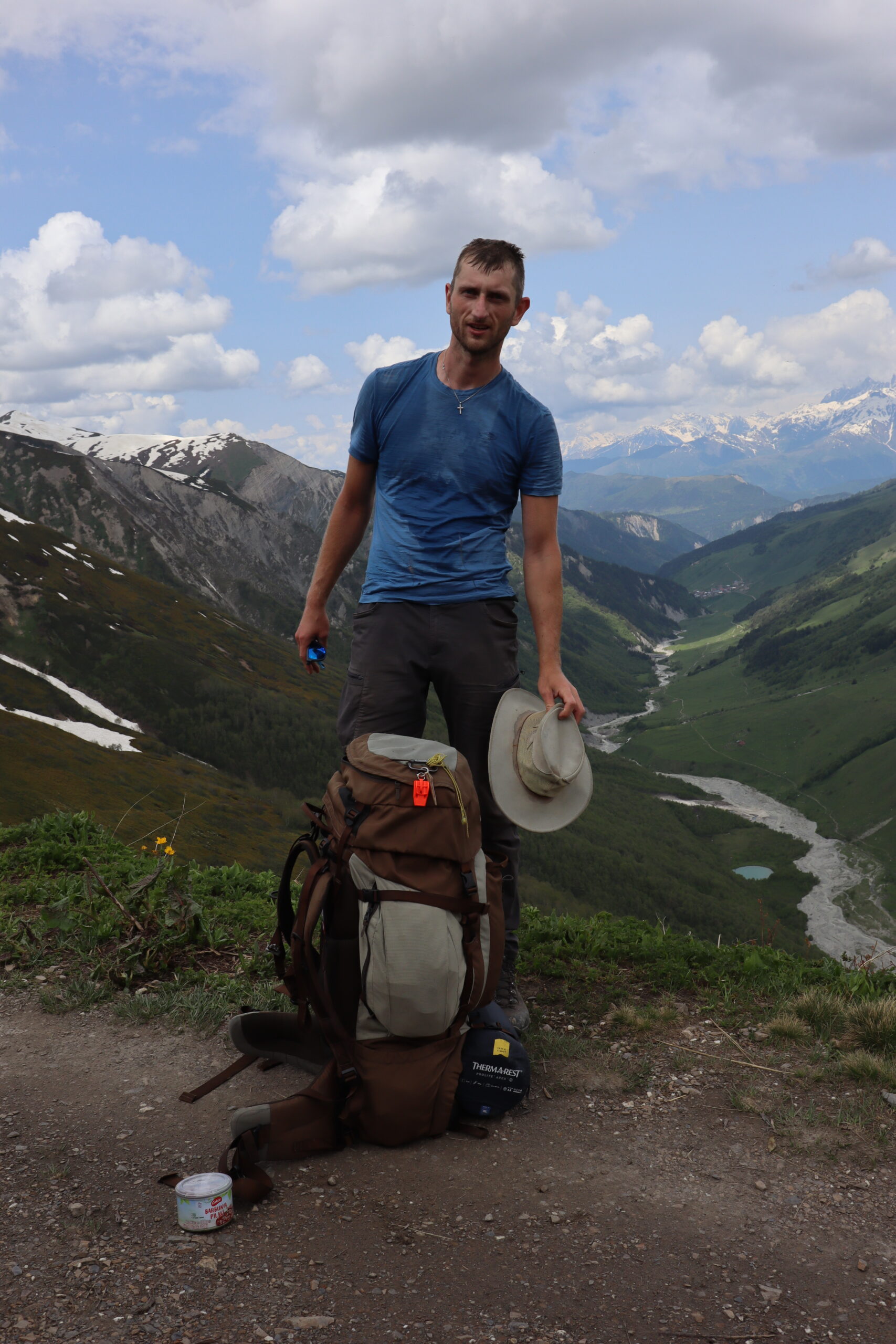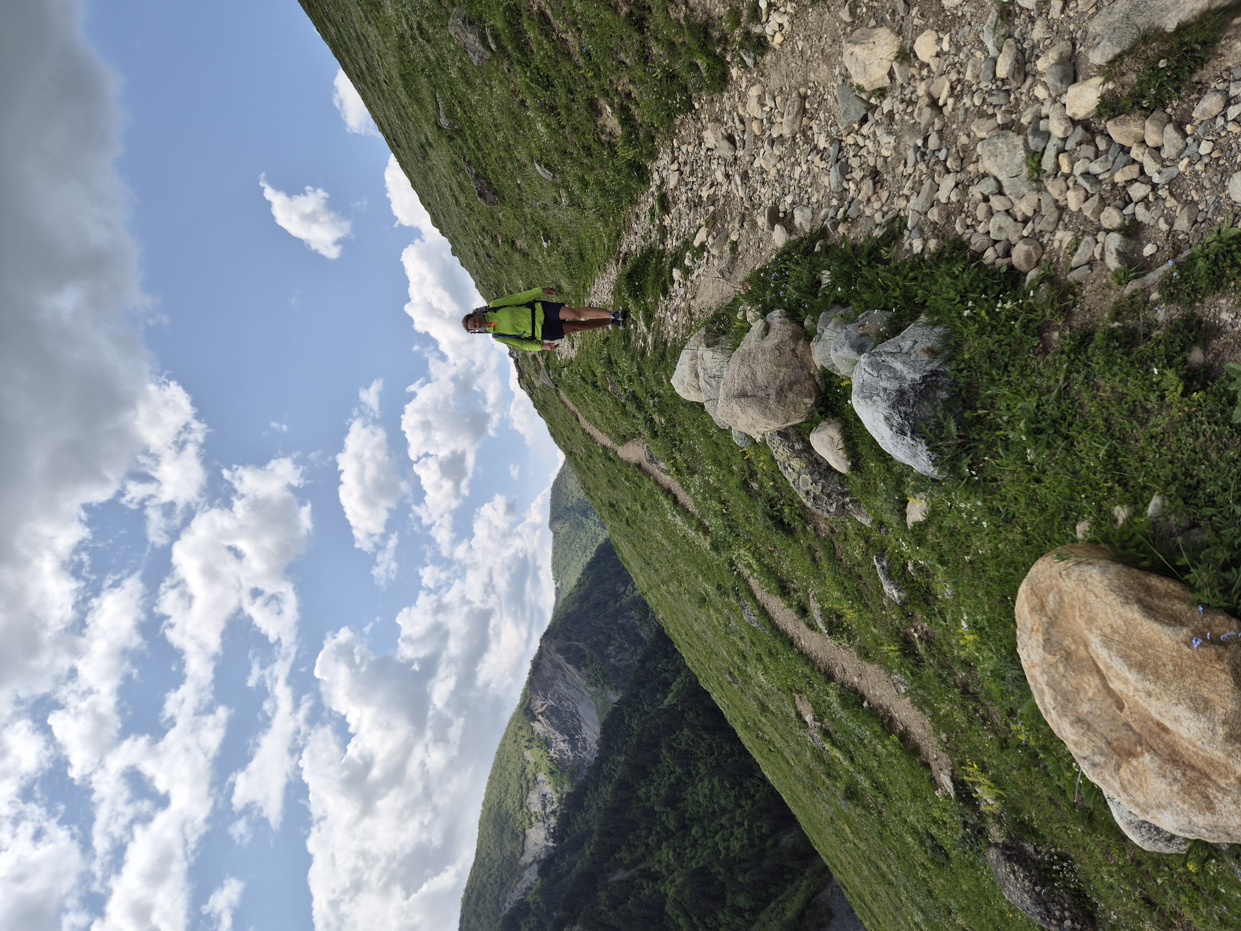 Um kurz nach 8 Uhr in der Früh machten wir uns am 09.06.2025 nach einem kurzen Morgensnack wieder auf den Weg. Der wohl schwerste Teil der Wanderung stand unmittelbar bevor. Knapp 1000 Höhenmeter wollten auf wenigen Kilometern überwunden werden, und das mit 20 Kilogramm Gepäck auf dem Rücken. Ganz zu Beginn übernahm ich die Führung und gab das Tempo vor, doch schnell bemerkte ich, dass Andrea in dieser Hinsicht erfahrener und sehr gut darin war, ein gutes und konstantes Tempo den Berg hinauf anzuschlagen. Schon bald wechselten wir die Position und ich kämpfte mich hinter ihr die Steigung hinauf. Den wackeligen Grad zwischen Regenerationsvermögen und Belastungvermögen des Körpers haltend, war ich schon bald wieder völlig in Schweiß getränkt. Schritt für Schritt, immer weiter den steilen Bergpfad hinauf … ! Wir legten nur kurze Stops ein, um einige Schlucke Wasser zu trinken, die auf den nächsten Metern direkt wieder ausgeschwitzt wurden und das Momentum nicht zu verlieren. Nach knapp zwei Stunden flachte das Gelände und der Pfad mit ihm endlich ein wenig ab. Wir passierten eine Berghütte, aus der laute Musik drang und wanderten in einem stetigen Tempo weiter den Berg hinauf, bis zum höchsten Punkt der heutigen Strecke. Es war geschafft. Am Berkkamm machten wir Rast und führten uns neue Energie zu. Als ich mein T-Shirt zum Trocknen in die Sonne legte, war es so nass, dass ich es zuerst auswringen musste. Den weiterführenden Teil des zweiten Trailtages ging es nun hauptsächlich seicht bergab. Entlang an bunten blühenden Feldern, Bächen die den Weg kreuzten und überquert werden wollten und anderen Wanderern, auf die man immer wieder mal stieß. Dank dem Tipp, doppelte Socken zu tragen plus ein präventives Blasenpflaster an jede Hacke zu kleben, waren meine Füße in einem guten Zustand, als wir am Nachmittag Adishi erreichten. Mein mitgeführter Proviant war so gut wie verbraucht und ich freute mich auf die Option eines reichhaltigen Abendessens, obwohl Andrea immer wieder großzügig ihren Proviant mit mir geteilt hatte. Wir wurden nicht enttäuscht.