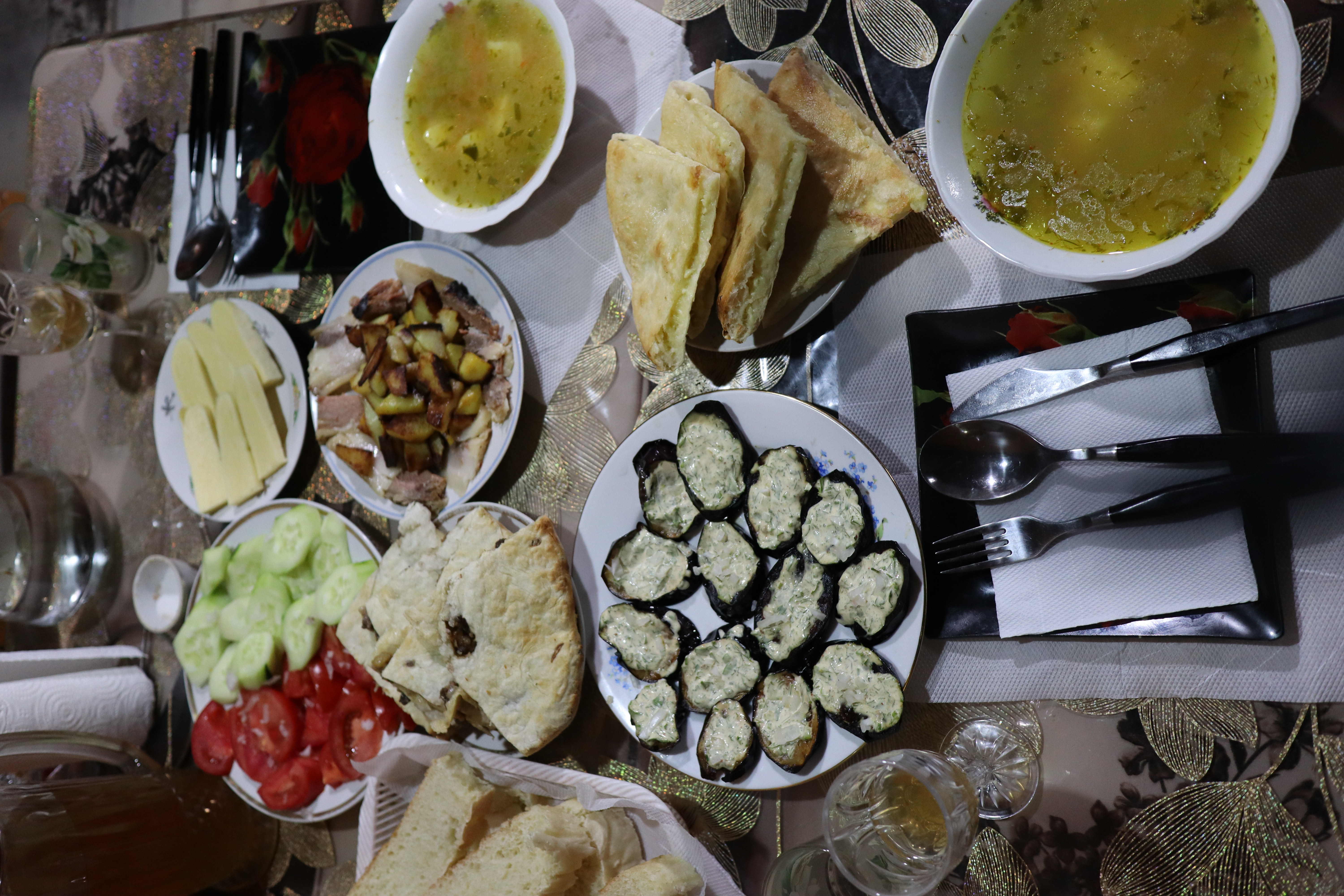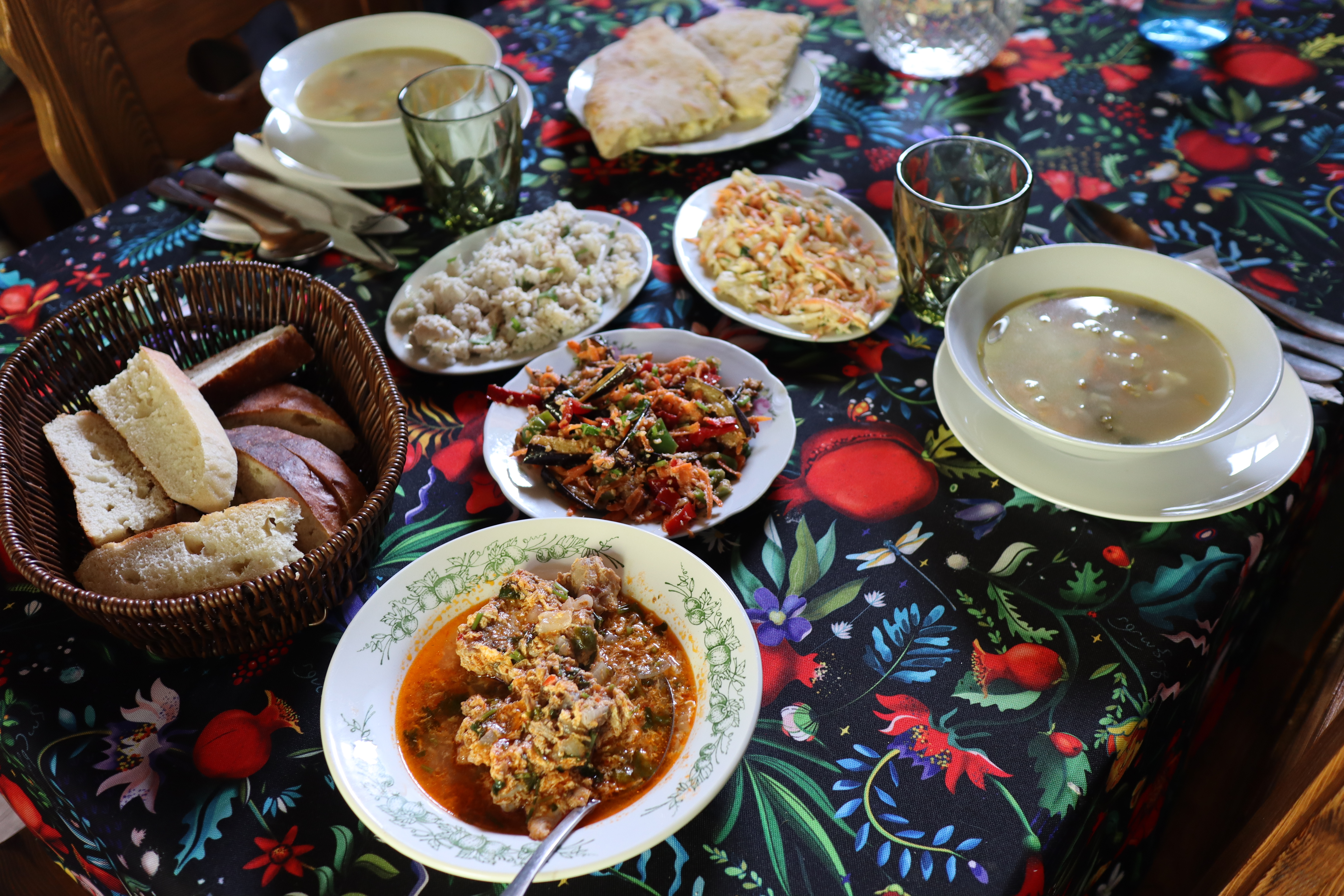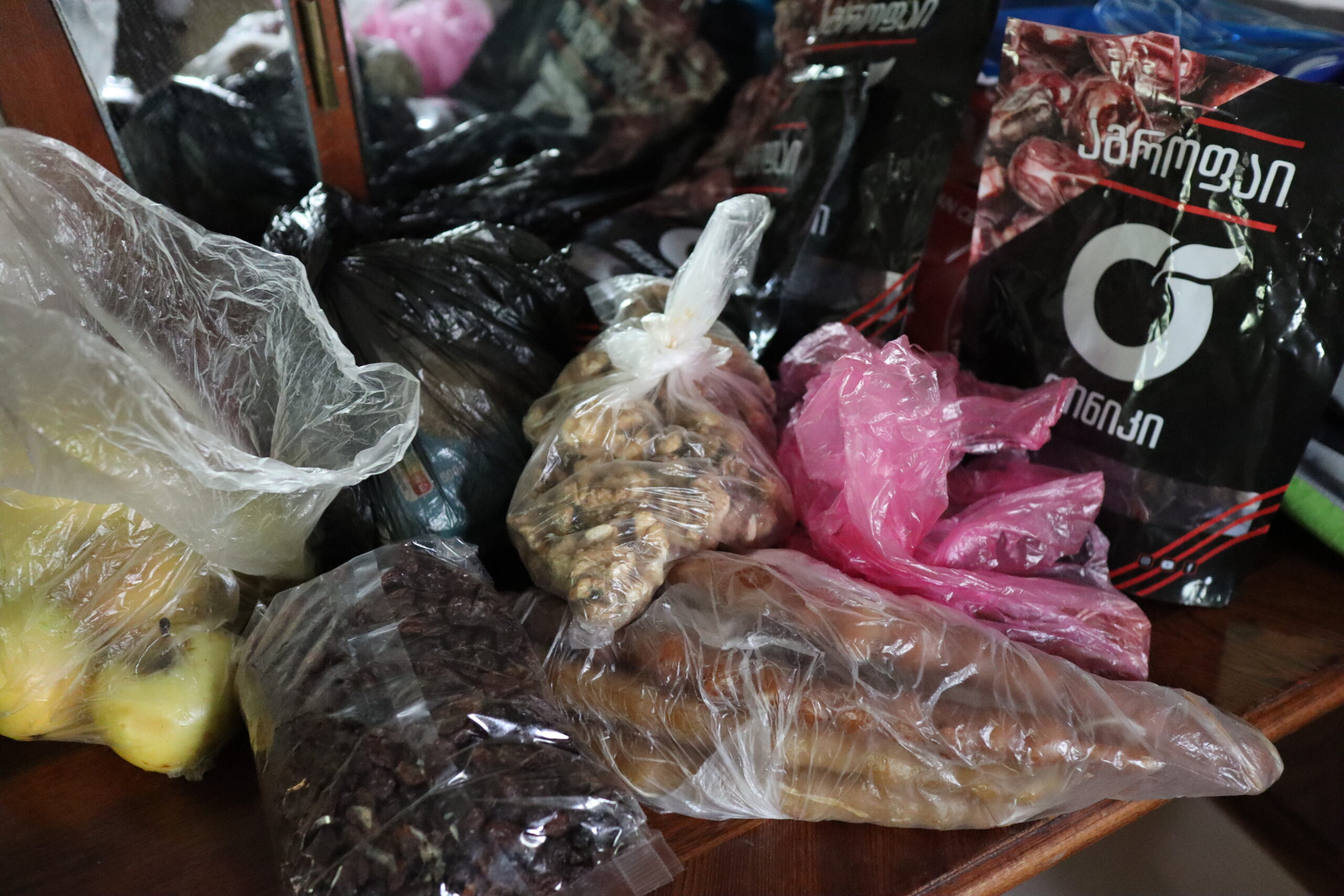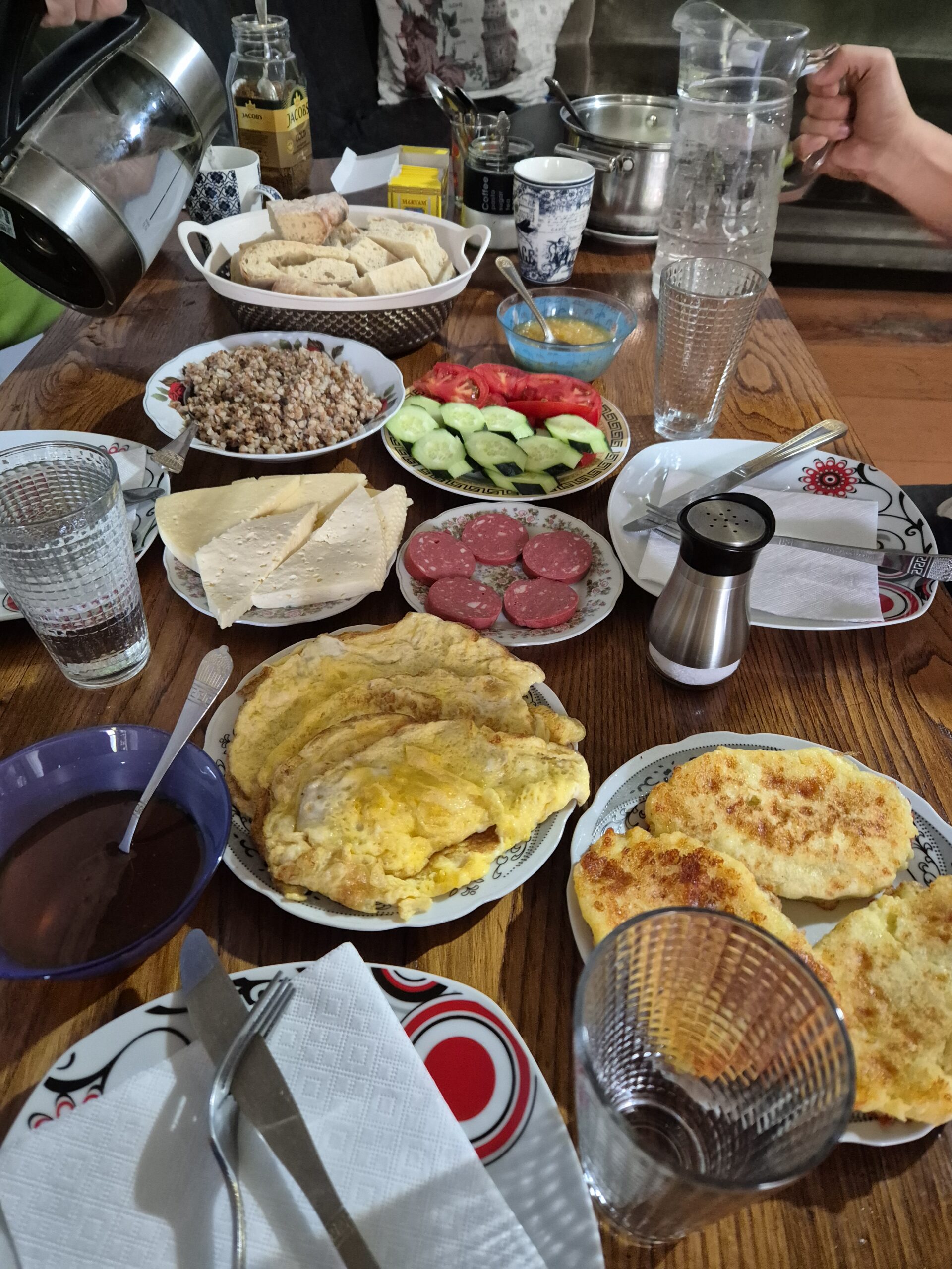 Als wir das erste mal zusammen rasteten und Andrea ihren mit Lebensmitteln und Powerfood gefüllten Rucksack vor mir ausbreitete, wurde mir das Ausmaß meiner planerischen Ignoranz bewusst. Andrea hatte Verpflegung für vier volle Tage dabei. Trockenfrüchte wie Datteln reihten sich an Walnüsse, Powermüsli und Energieriegel. Auch eine ganze Tüte Churchkhela waren Teil des Essensrepertoire. Bei Churchkhela handelt es sich um eine georgische Süßigkeit, eine Nusskette, die mit einem Fruchtsaft überzogen und dann getrocknet wird. Sehr Energiereich und äußerst gut geeignet für längere Wanderungen, um die physische Batterie wieder aufzuladen. Da konnte ich mit meinen Bohnen, Erdnüssen und Weißbrot nicht mithalten. Andrea forderte mich auf zuzugreifen, da sie sowieso zu viel Essen dabeihabe, sie hasse es zu hungern. Ich lehnte nicht ab und probierte eine Churchkhela-Nusskette. Auch erfuhr ich von ihr, dass es bis nach Ushguli keine wirkliche Möglichkeit gab Essen aufzustocken. Das war ein Problem, denn ich hatte kein Essen für vier Tage dabei. Allerdings hatte ich gehört, dass das Abendbrot und Frühstück in den abgelegenen Dörfern entlang des Trails reichhaltig und gut sei. Wenn man in einem dieser Gasthäuser übernachtete, konnte man für einen Aufpreis zur Übernachtung auch ein warmes Abendessen und ein Frühstück erhalten. Als wir am späten Nachmittag Chvabiani erreichten, war ich froh, die erste von vier Etappen hinter mich gebracht zu haben. Meine Füße taten weh und ich spürte einen leichten Muskelkater in den Beinen. Laut Komoot war die heutige Tour nur 14 Kilometer lang gewesen – es fühlte sich mehr an. Es war ein Unterschied ob man viele Höhenmeter auf einem steilen Wanderweg zu bestreiten hatte, oder an einer Straße einfach geradeaus gehen konnte. Ich musste mir eingestehen, dass das Herumtragen eines 20 Kilogramm Rucksacks, der für das Trampen ausgelegt war, eine semioptimale Idee darstellte, besonders wenn es viel hoch und runter ging. Dennoch war ich nun hier und ich hatte Hunger. Um unsere Energiereserven wieder aufzufrischen bezahlten wir 55 Lari für Unterkunft und Abendbrot. Ein durchaus deftiger Preis wie ich fand. Aber auch die Betreiber der wenigen Gasthäuser entlang des Wanderweges wussten um die Strapazen der Wanderung, ihren eigenen Wert und das viele Geld der meisten Touristen. Im Gegensatz zum Norden der Türkei herrschte hier auf einmal ein durchaus kapitalistisches Mindset vor, angetrieben durch die beträchtliche Anzahl an Touristen, die jedes Jahr aufs Neue die mehrtägige Wanderung von Mestia nach Ushguli auf sich nahmen. Irgendwie hatte ich heimlich erwartet, ähnlich wie in der Türkei, von Einheimischen eingeladen zu werden … Das Abendbrot war gut und reichhaltig. Während Andrea und ich die Teller leerputzten und nichts übrig ließen, wurden am Nachbartisch Brot und Khachapuri übrig gelassen. Wir warteten bis sich die deutsche Reisetruppe erhoben und die Küche verlassen hatte. Schnell nahm ich eine Servirte und wickelte das übrig gebliebene Essen ein und nahm es mit. Es würde mir als zusätzliche Wegnahrung dienen.