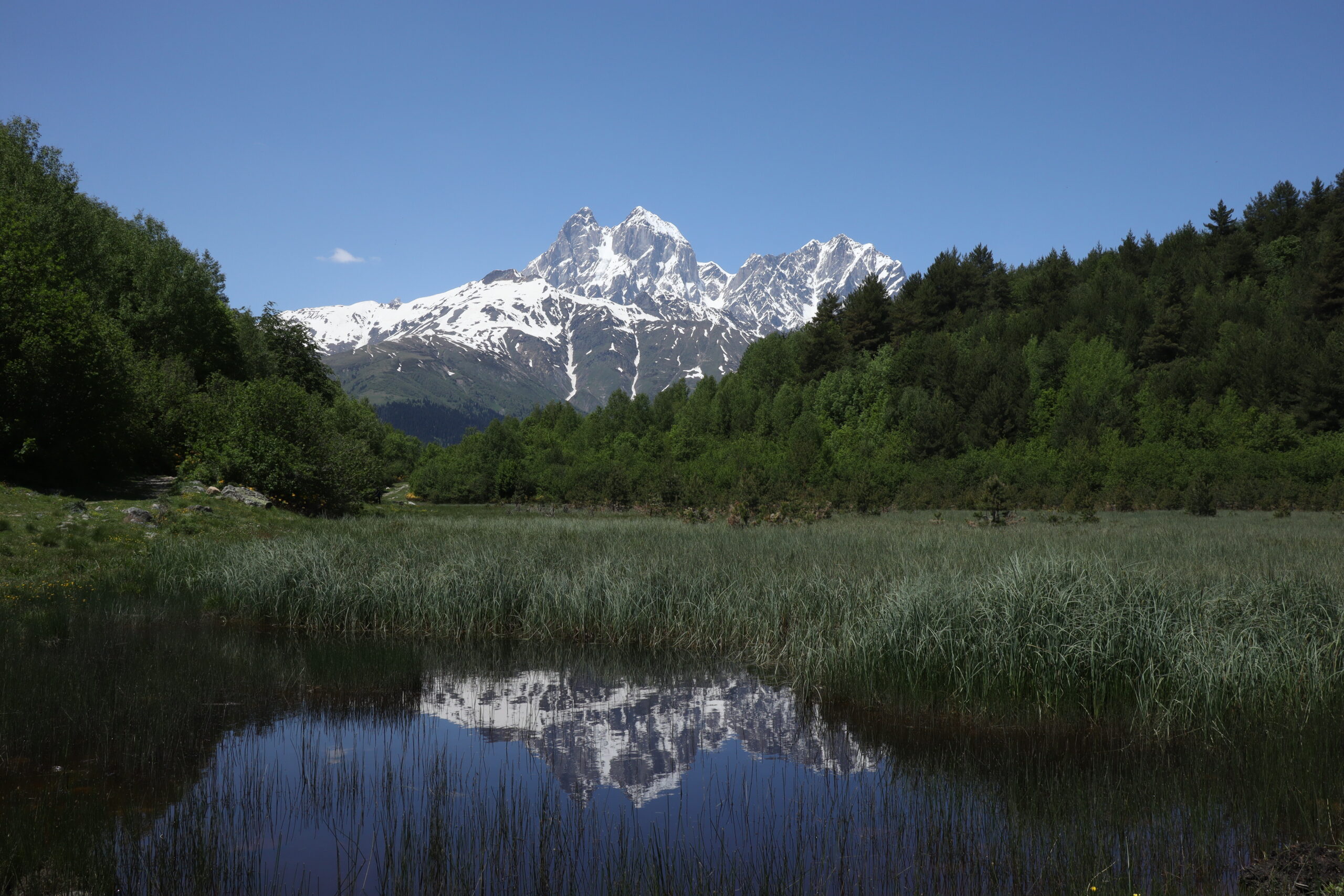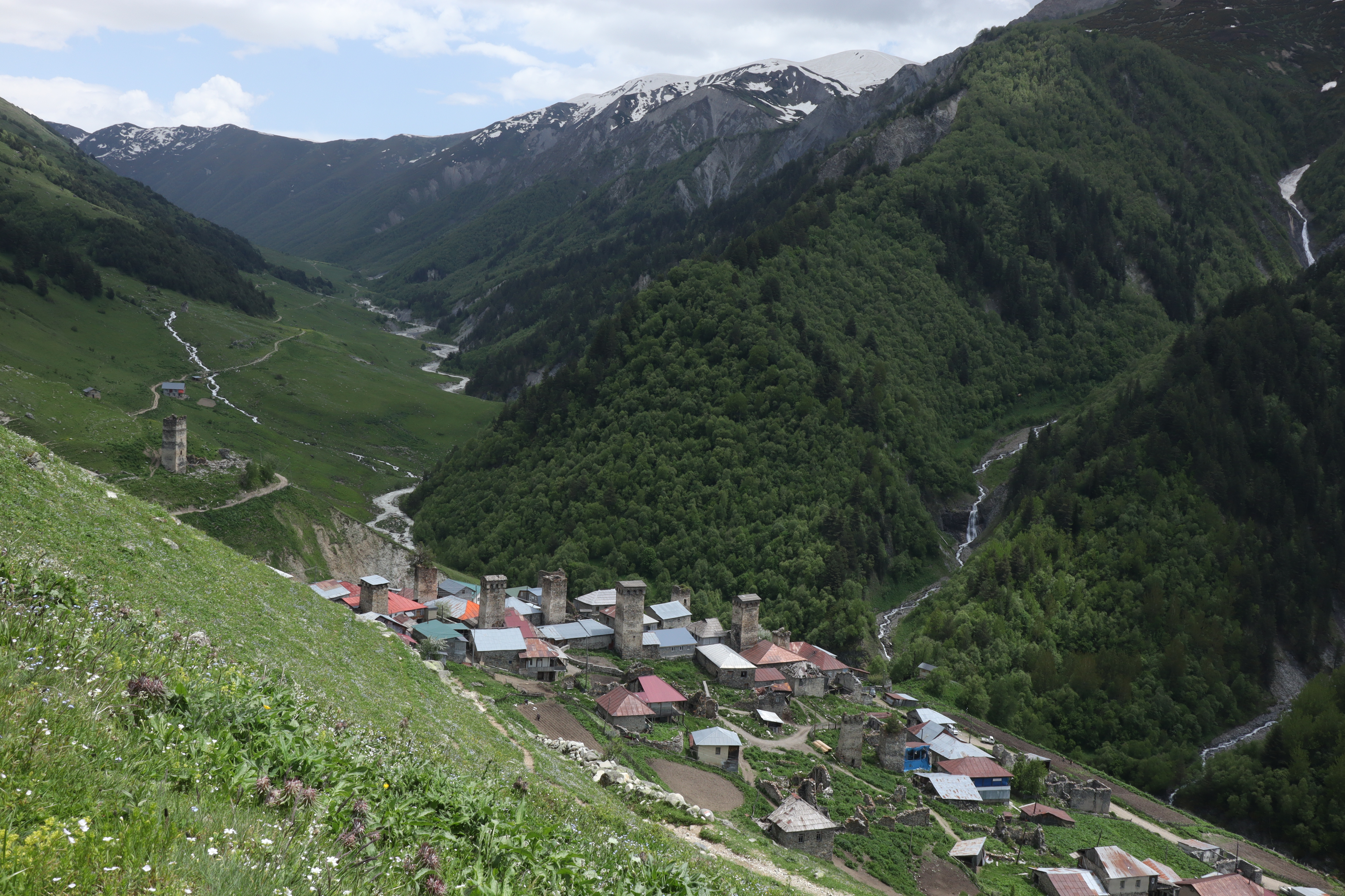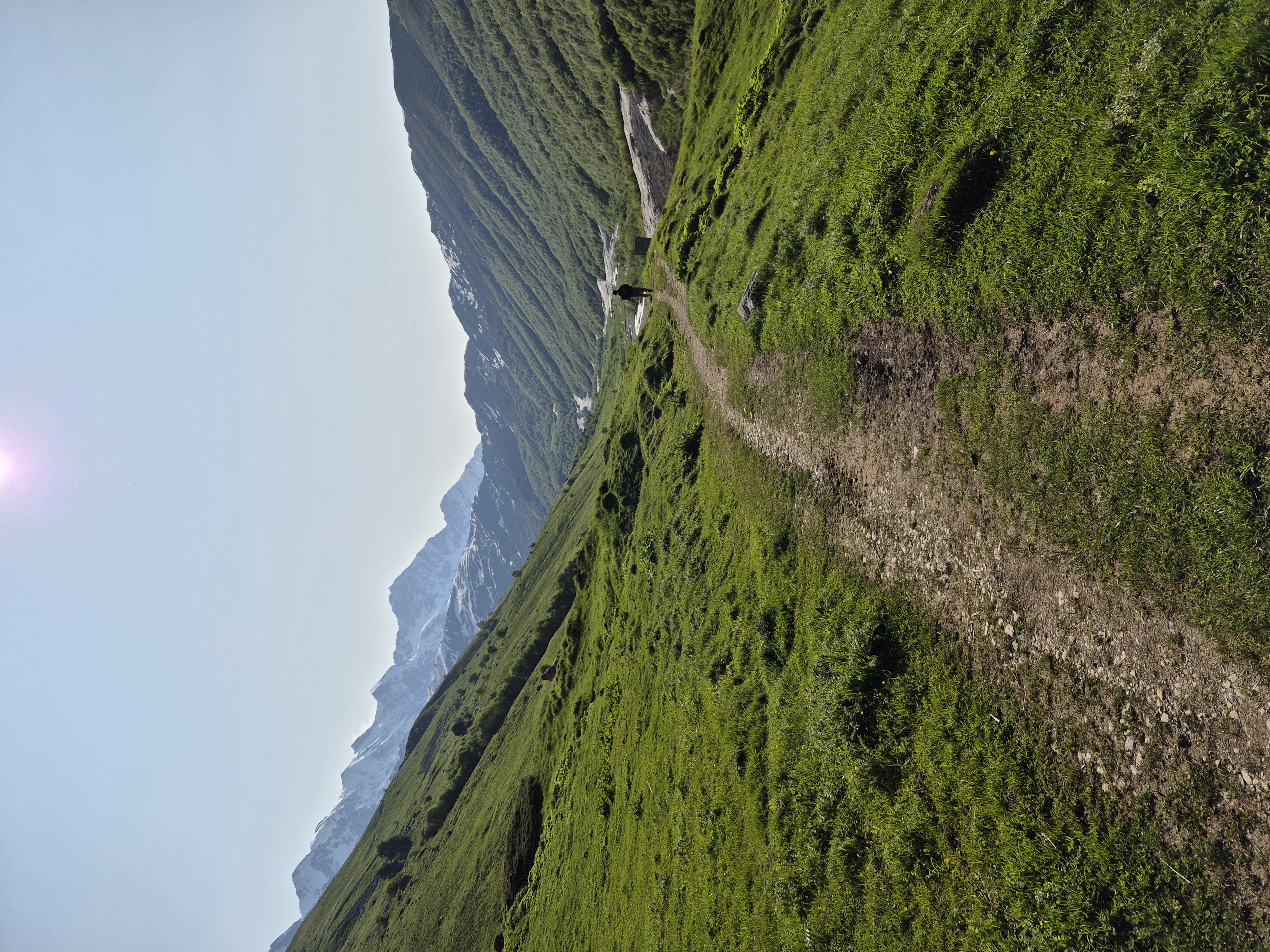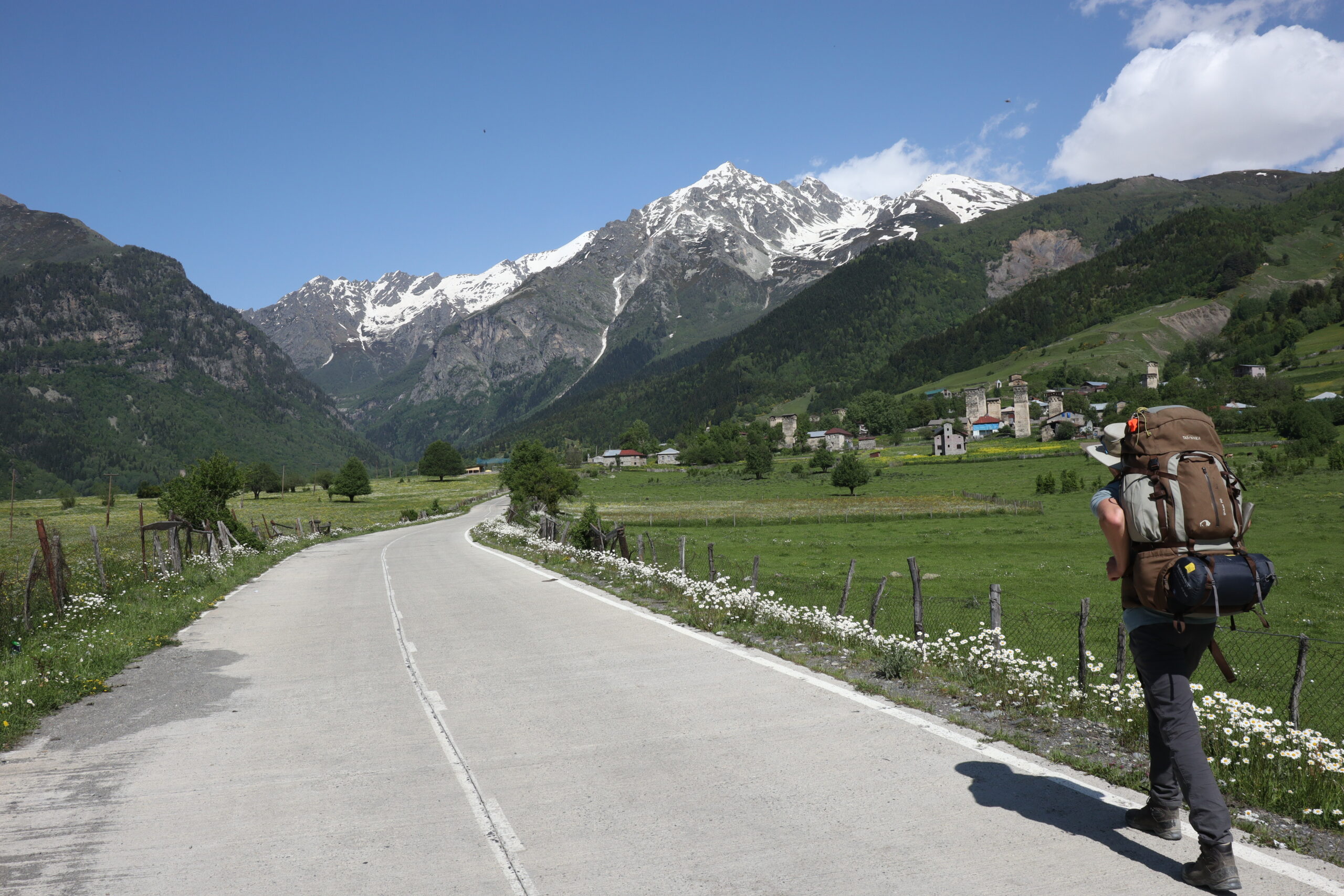 Je näher ich Mestia kam, desto häufiger hatte ich von der mehrtägigen Wanderung von Mestia nach Ushguli gehört. Während ich am Vortag noch ein wenig unentschieden gewesen war, hatte sich langsam aber sicher herauskristallisiert, dass ich großes Interesse an dieser mehrtägigen Wanderung hatte. Nachdem ich am 08.06.2025 aufgewacht war und etwas gefrühstückt hatte, packte ich Zielstrebig meinen Rucksack. Ich verabschiedete mich von Julia, die am gestrigen Tag bereits Pläne mit Gaja und den anderen am Lagerfeuer geschmiedet hatte und brach auf. Am Supermarkt im Stadtkern kaufte ich 4,5 Liter Wasser, wovon ich drei Liter im Rucksack verdstaute und eine 1,5 Literflasche in der Hand hielt. Auch ein paar Lebensmittel packte ich mit ein. Eine Dose gekochte Bohnen (400g), eine Packung Erdnüsse (500g) – die noch gut gefüllt war, noch aus Istanbul stammte und meine Notration darstellte – zwei Bananen und ein Weißbrot, sollten mich wohl schon durch den Tag bringen. Im nächsten Dorf konnte man seine Vorräte bestimmt aufstocken. Genau wie blauäugig ich Lebensmitteltechnisch und gewichtstechnisch für diesen Trail vorbereitet war, sollte ich am Nachmittag erfahren. Voller Vorfreude stapfte ich los. Ich fühlte mich gut und ich fühlte mich vorbereitet. Ich hatte noch 180 Lari im Portemonnaie und konnte bestimmt etwas in den Dörfern kaufen, durch die ich kommen sollte. Schließlich war dies hier der beliebteste Weitwanderweg Georgiens und wo es Touristen gab, gab es auch immer Geschäfte und eine Möglichkeit zum Essen. Mit diesen Gedanken im Kopf schaute ich auf mein vollgeladenes Handy und die Wanderroute, die vor mir lag. Den Trail hatte ich offline auf Komoot im Vorraus abgespeichert, so würde ich mich auch ohne Internet zurechtfinden können, sollte ich doch einmal falsch abbiegen oder die Orientierung verlieren. So begann die Wanderung, die ich geistig bereits in vier Teile gegliedert hatte, mitten im Zentrum Mestias. Zuerst wanderte ich aus Mestia hinaus in Richtung Nord-Osten auf einen Bergkamm zu, den es an diesem Tag zu überwinden galt. Während mein Wasser in der Hand dahinschmolz und ich von der Sonne von oben durchgebrutzelt wurde, war ich zuerst ganz alleine unterwegs. Nach einer Stunde umgab mich pure Wildnis. Die Idylle war jedoch nur von kurzer Dauer. Andere Wanderer tauchten vor mir auf. Ich passierte Asiaten und Westeuropäer. Als der Anstieg immer steiler wurde, wich die blühende Wiesenlandschaft mit ihrem guten, breiten, begehbaren Weg, einem schmalen, steinigen Wurzelpfad, den man mehr hinaufklettern musste, als das man den Pfad wandern konnte. Das erste mal auf dieser Wandertour wurde mir mein Rucksack auf dem Rücken so richtig schwer. Die ersten 500 Höhenmeter der insgesamt 2500 Höhenmeter auf dieser Tour hatte ich erfolgreich gemeistert. Auf dem Bergkamm legte ich eine kleine, wohlverdiente Rast ein. Während ich an einem stückchen Weißbrot knabberte, kam hinter mir eine braungebrannte, durchtrainierte Frau den Bergweg hinauf. Wir grüßten uns auf Englisch und ich erkannte am Aktzent, dass sie aus dem Deutschsprachigen Raum kommen musste. Und tatsächlich, als ich sie darauf ansprach, erwiederte sie, dass sie aus Österreich komme. Schnell kristallisierte sich heraus, dass Andrea in den letzten zehn Jahren extrem viel in der Weltgeschichte herumgekommen war. Mit Anfang dreißig hatte sie das Reisefieber angesteckt und besonders Wandertouren wie diese, stießen bei ihr auf erhöhtes Interesse. Es war das zweite Mal, dass sie exakt diese Wanderung von Mestia nach Ushguli zu meistern gedachte. Dementsprechend kannte sich Andrea bestens über die Wanderung und ihre Tücken aus und ich war froh darüber meine Wissenslücken stopfen zu können. Wir verstanden uns und liefen tatsächlich ein sehr ähnliches Tempo, sodass wir beschlossen, den Trail zusammen weiter zu wandern. Zu zweit war es immer sicherer, man konnte sich gegenseitig helfen und die Zeit leichter durch Gespräche vertreiben, was die physischen aber besonders die psychischen Belastungen weniger schwer wiegen ließ. Über den restlichen Tag wanderten wir bis nach Chvabiani und trafen auf dem Weg sowohl gleichgesinnte Wanderer, als auch Kühe, Ziegen und Schweine, die unseren Weg kreuzten. Jede Kurve überraschte mit einem neuen Panorama und nicht selten wurde der Fotoapparat gezückt.