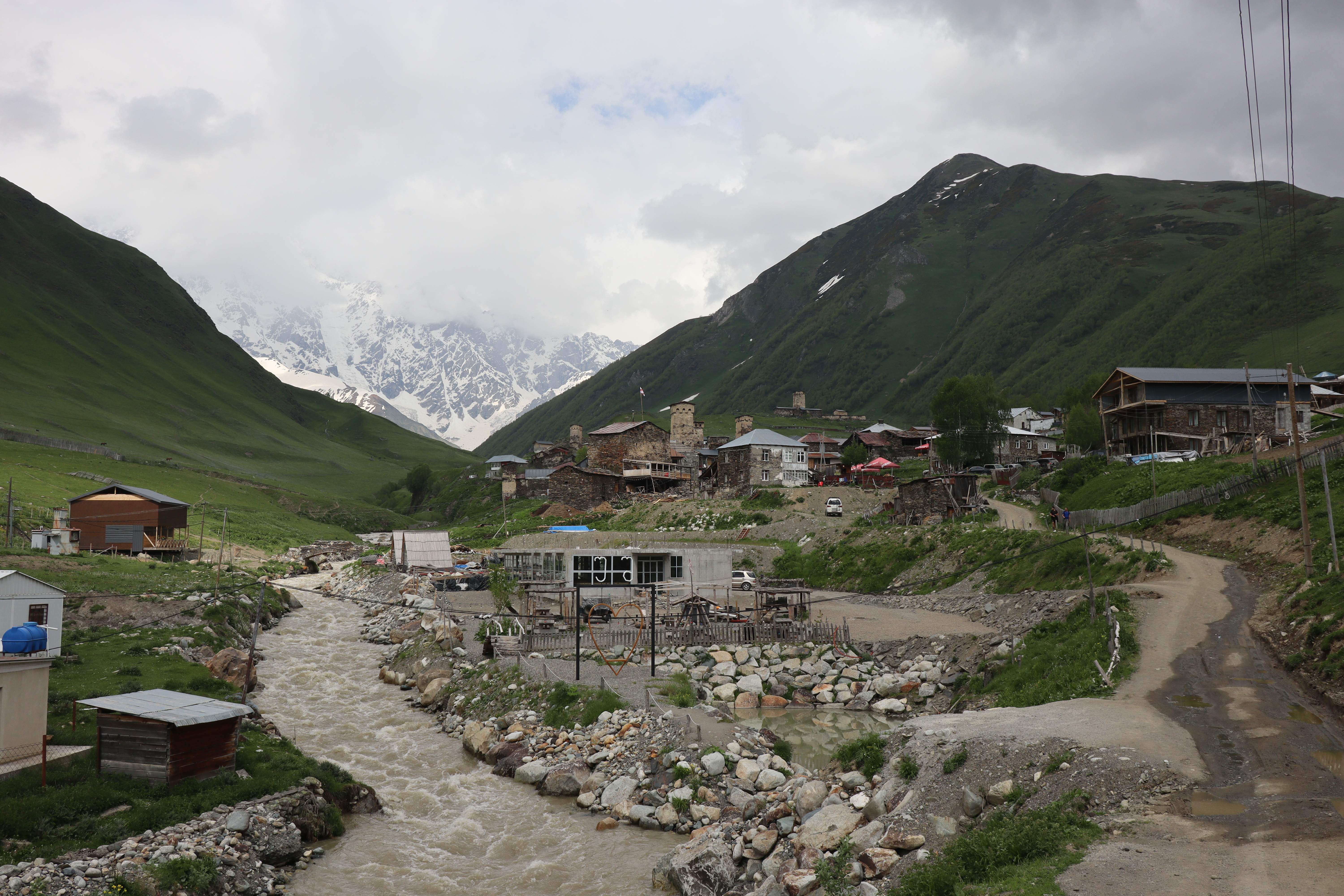Bei knapp 2800 Höhenmetern und einer zurückgelegten Strecke von ca. 32 Kilometern überquerten wir den Pass. Von dort an ging es dann wieder hinab ins Tal. Ein wenig zu übermütig endlich den höchsten Punkt der Wanderung hinter mich gebracht zu haben lief ich zügig den Bergpfad hinab. Doch bereits knapp eine Stunde später bezahlte ich den rasanten Abstieg mit einsetzendem Muskelkater und Ermüdungserscheinungen. Besonders meine beiden Oberschenkel waren betroffen. Doch auch eine Pause, um den Energiehaushalt wieder aufzufrischen, brachte nur kurzzeitige Erholung. Der Schaden war angerichtet. Über die nächsten 10 Kilometer vom Bergpass den Bergrücken entlang bis ins Tal verschlimmerte sich der Muskelkater. Einen 20 Kilogramm Reiserucksack mit sich herum zu schleppen zeigte Konsequenzen. Als wir das Dorf Lalkhori erreichten, war für mich klar, dass ich nicht wie am Morgen noch gedacht die restlichen 10 Kilometer bis nach Ushguli würde wandern können. Auch Andrea war der Idee, die letzten Kilometer einfach zu trampen, nicht abgeneigt. Sie war den Weg bereits drei Jahre zuvor gegangen und der Meinung, dass der Weg von hier an sowieso nicht mehr so schön sei. Kurzerhand streckten wir den Daumen raus und das erste Auto hielt und nahm uns direkt mit bis nach Ushguli, welch glückliche Fügung. In Ushguli angekommen, entfaltete der Muskelkater seine volle Wirkung. Weit würde ich nicht mehr laufen können. Ich besaß noch genau 50 Lari, diese gab ich gerne für eine Unterkunft und eine äußerst robuste Abendmalzeit. Während der Nachmittag sich dem Ende zuneigte, begann es heftig zu regnen. Vereinzelt hatte es während des Abstiegs getröpfelt, aber jetzt brach der Regen in Bindfäden begleitet von schwerem Donnergrollen nur so hervor. Ich war wirklich, wirklich froh, dass der Tag sich so gefügt hatte. Fröstelnd und dick eingepackt stand ich am Fenster und beobachtete das Schauspiel. Freiwillig kamen die Kühe und Pferde die hohen, gräsernen Berge hinunter zurück ins Dorf gelaufen, um Schutz vor dem Regen zu suchen. Die Türme Ushgulies verschwanden fast im Regen, der reißende Fluss vor der Haustür tobte und schäumte und ein leckerer Essensgeruch begann mir aus der Küche entgegen zu strömen. Ich setzte mich mit zum Feuer, wärmte mich und beobachtete unsere Gastgeber beim Essenkochen.